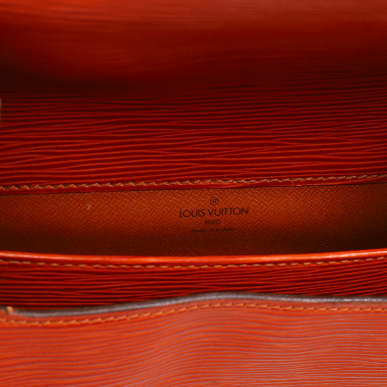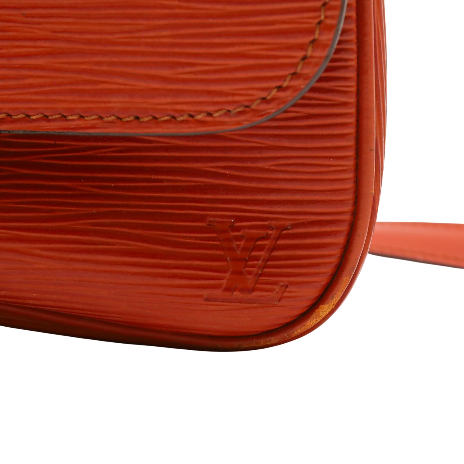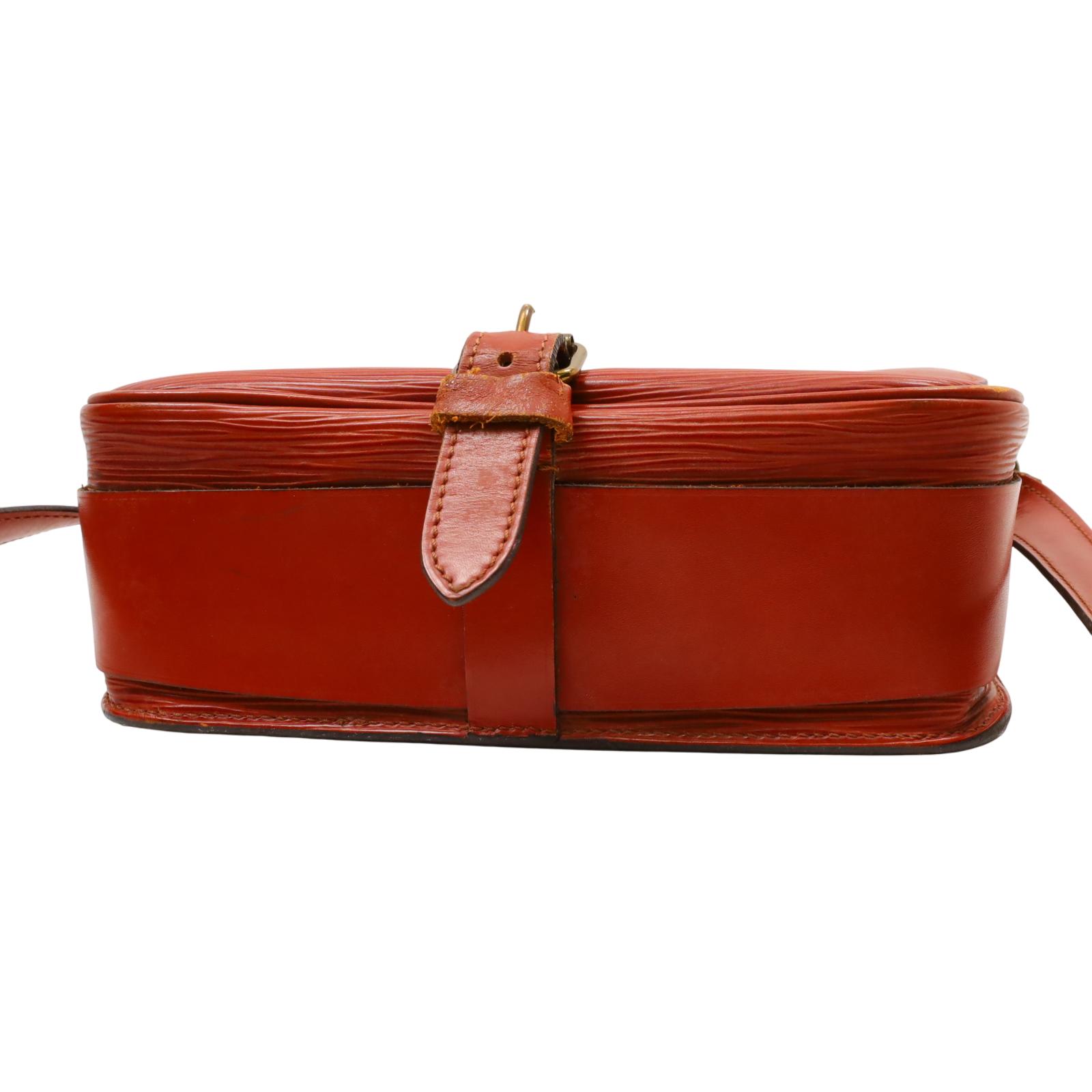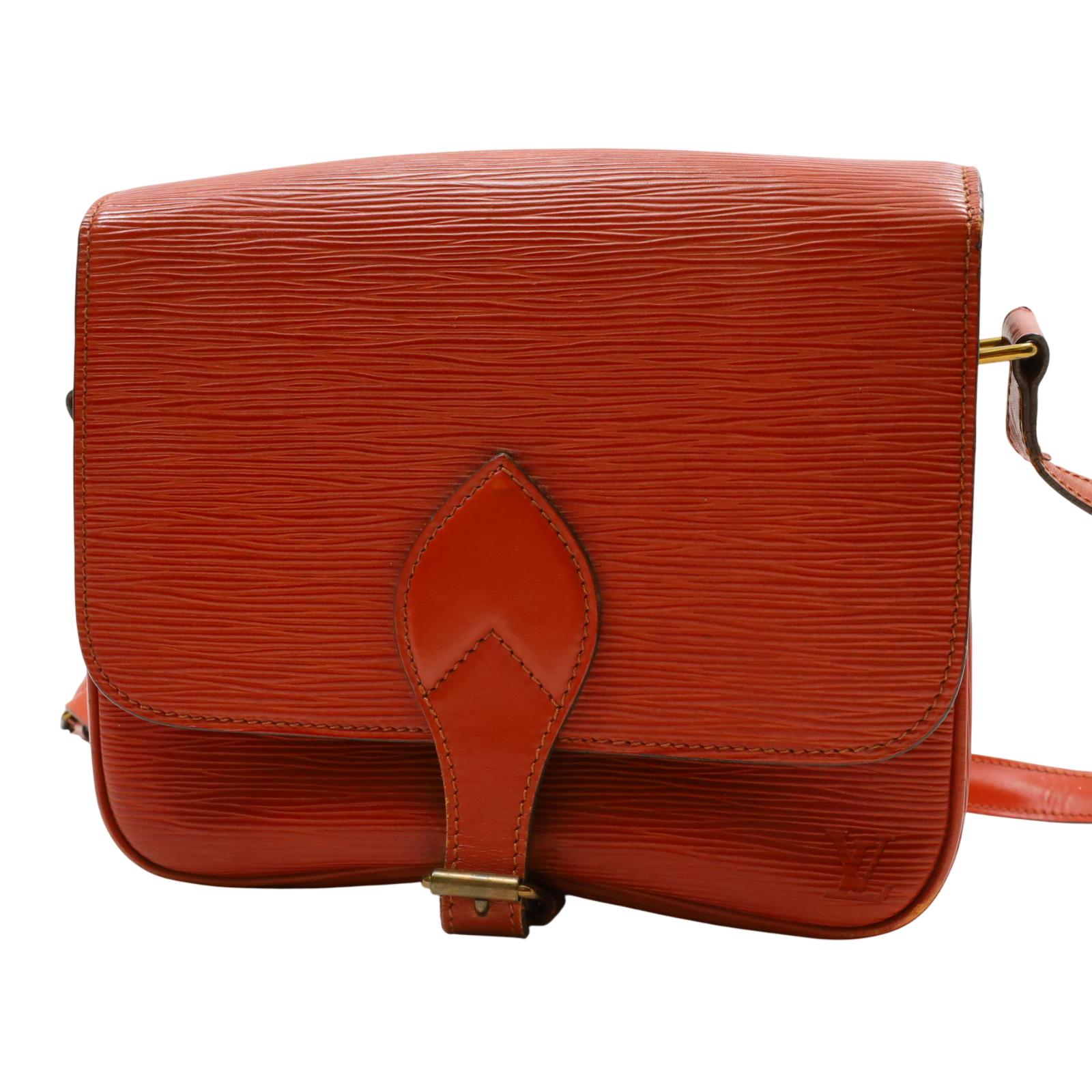 A structured shoulder bag made from textured golden brown Epi leather. It features a long adjustable shoulder strap, a front flap with a leather strap closure, and brass hardware. The interior is lined with brown cross-grain leather and includes a partitioned compartment with a patch pocket for organization. With its compact shape and classic materials, this bag offers a timeless and understated design suitable for daily wear. Approximate dimensions are 9 inches in length, 3 inches in width, and 7 inches in height, with a 19-inch strap drop.