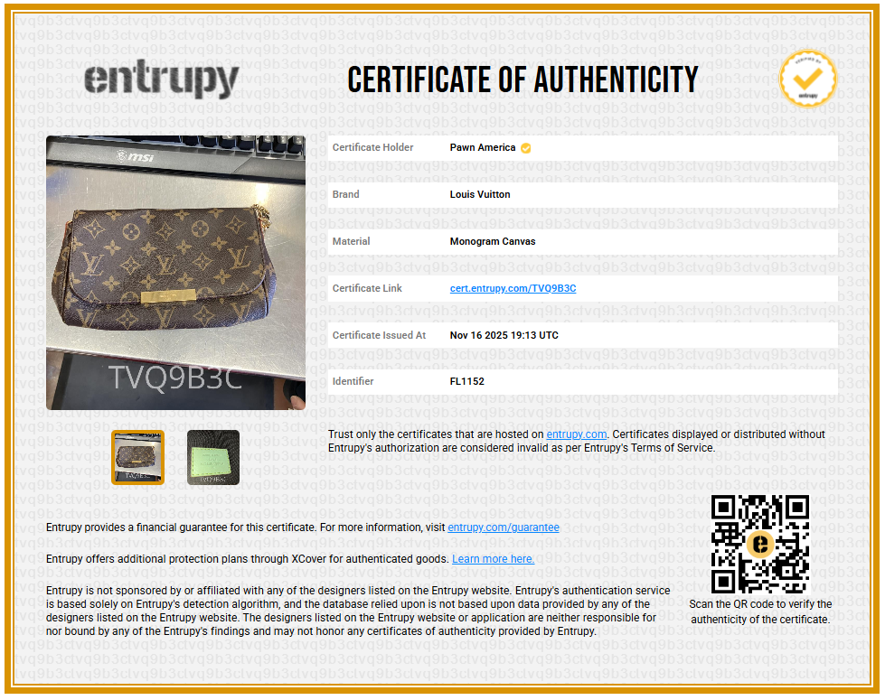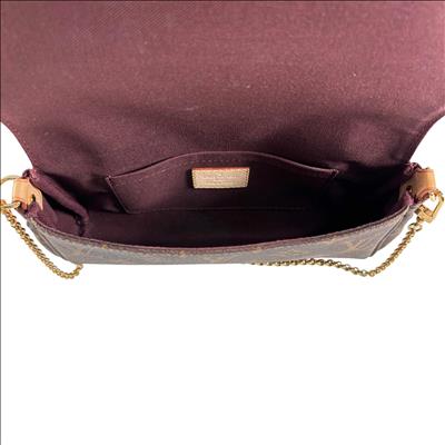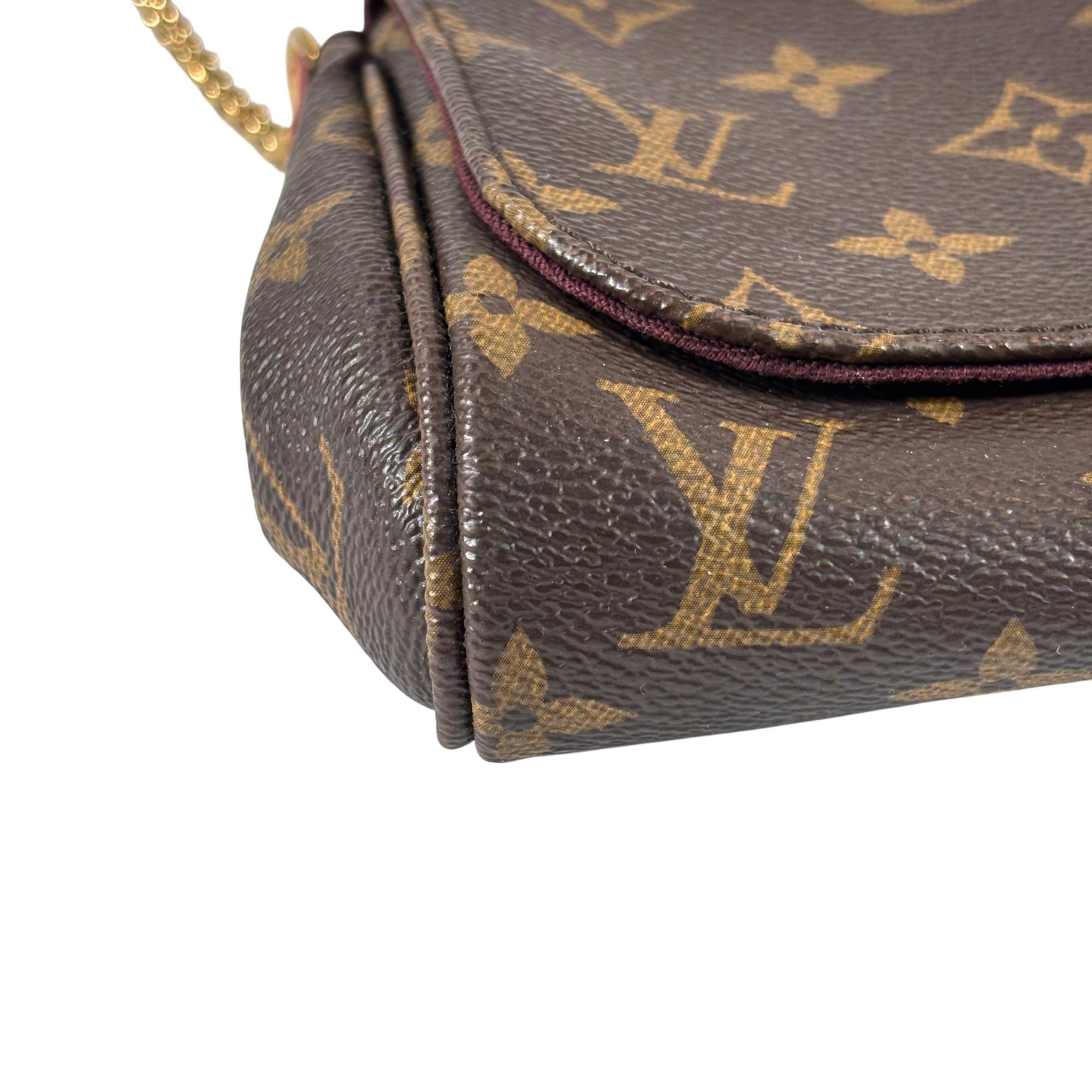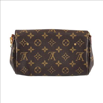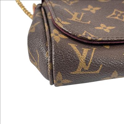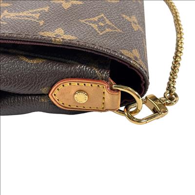The Louis Vuitton Favorite MM shoulder bag features the iconic monogram coated canvas in a compact, elegant silhouette suited for everyday or evening use. Designed with a slim profile, it offers a polished look while remaining lightweight and easy to carry. Measures approximately 8 by 4 by 1.5 inches.