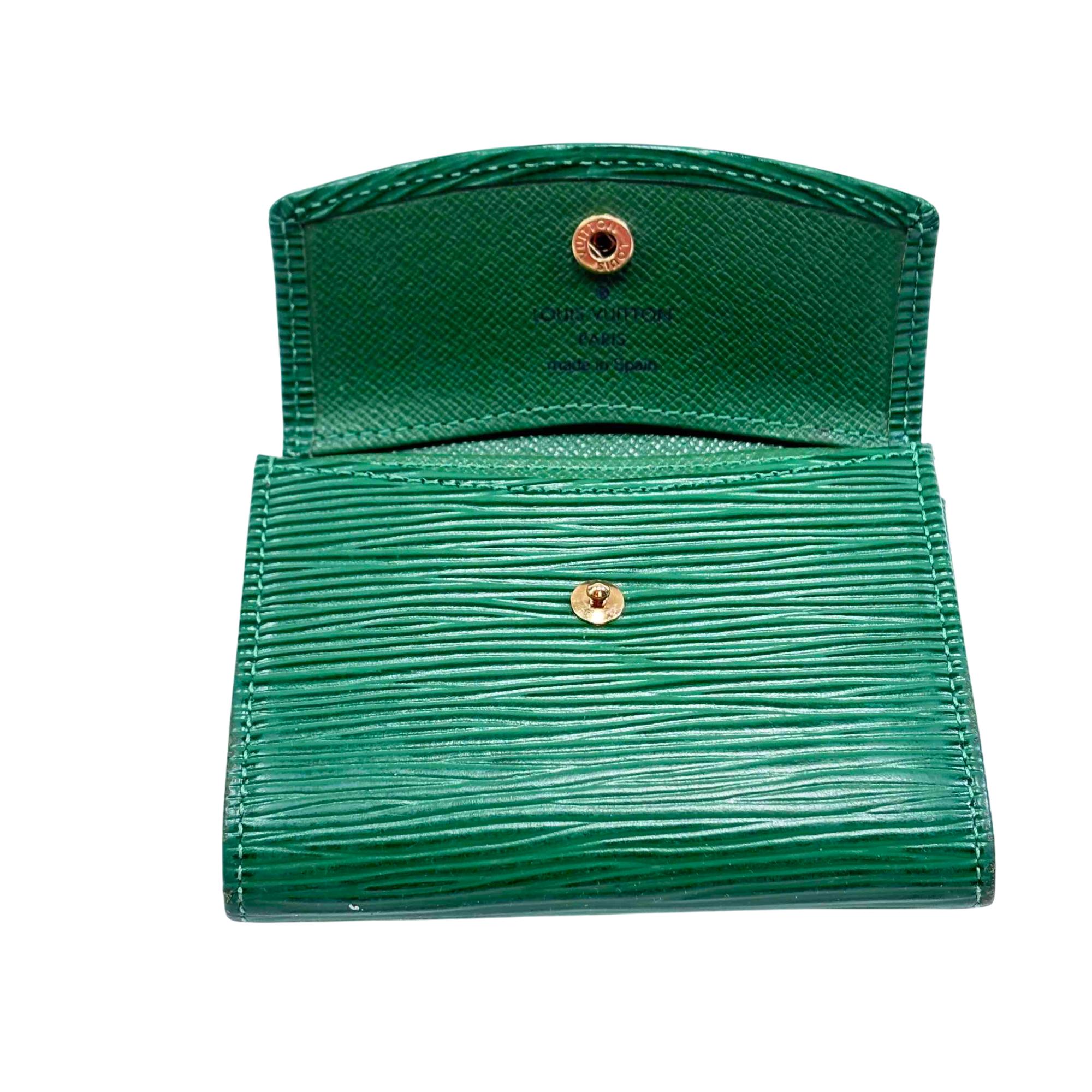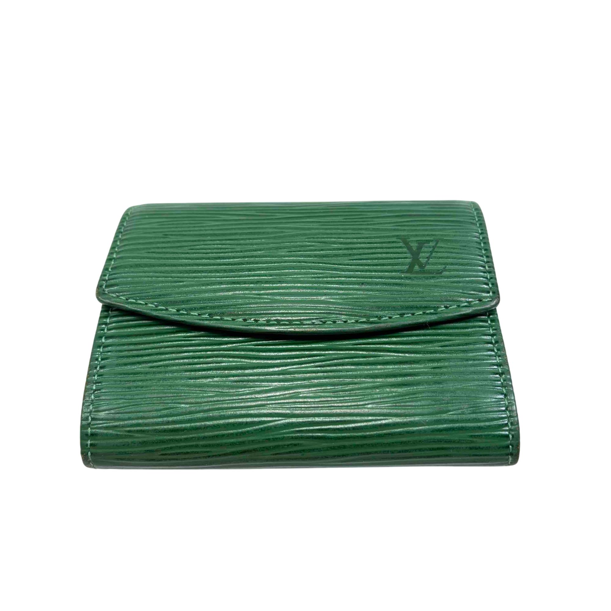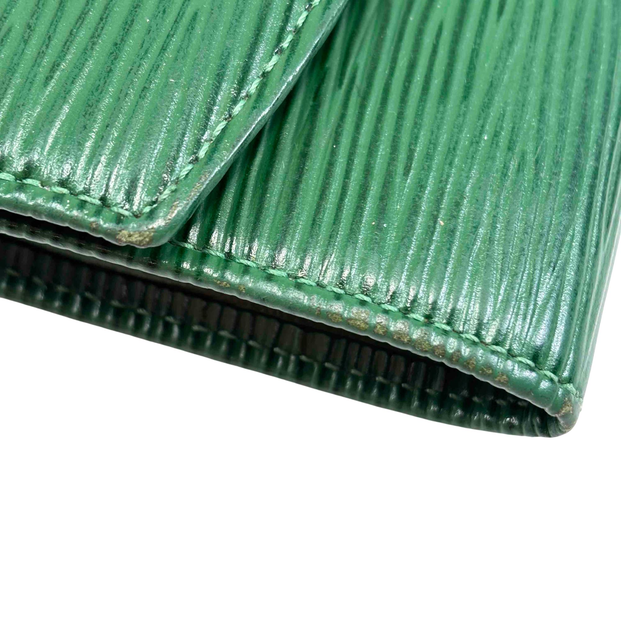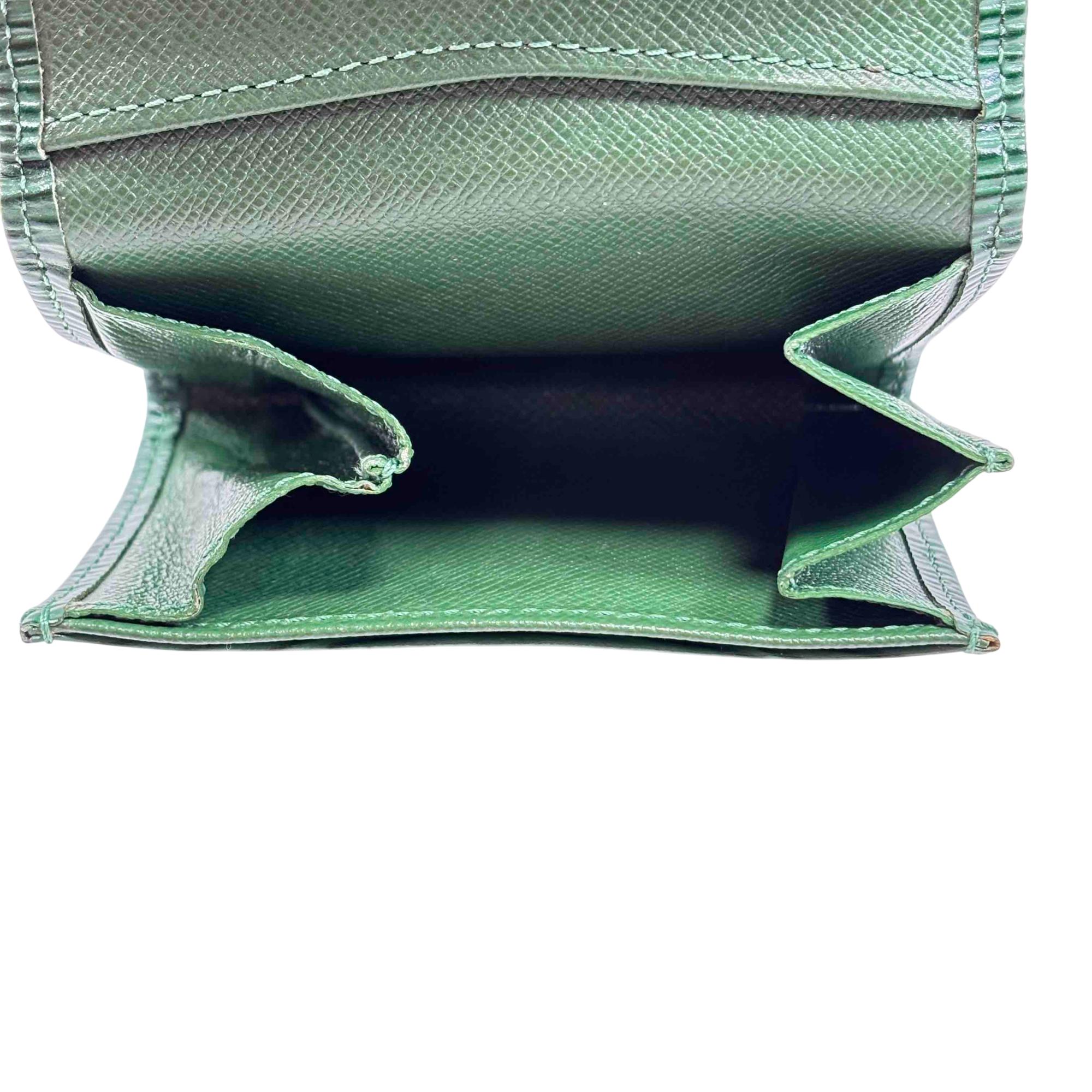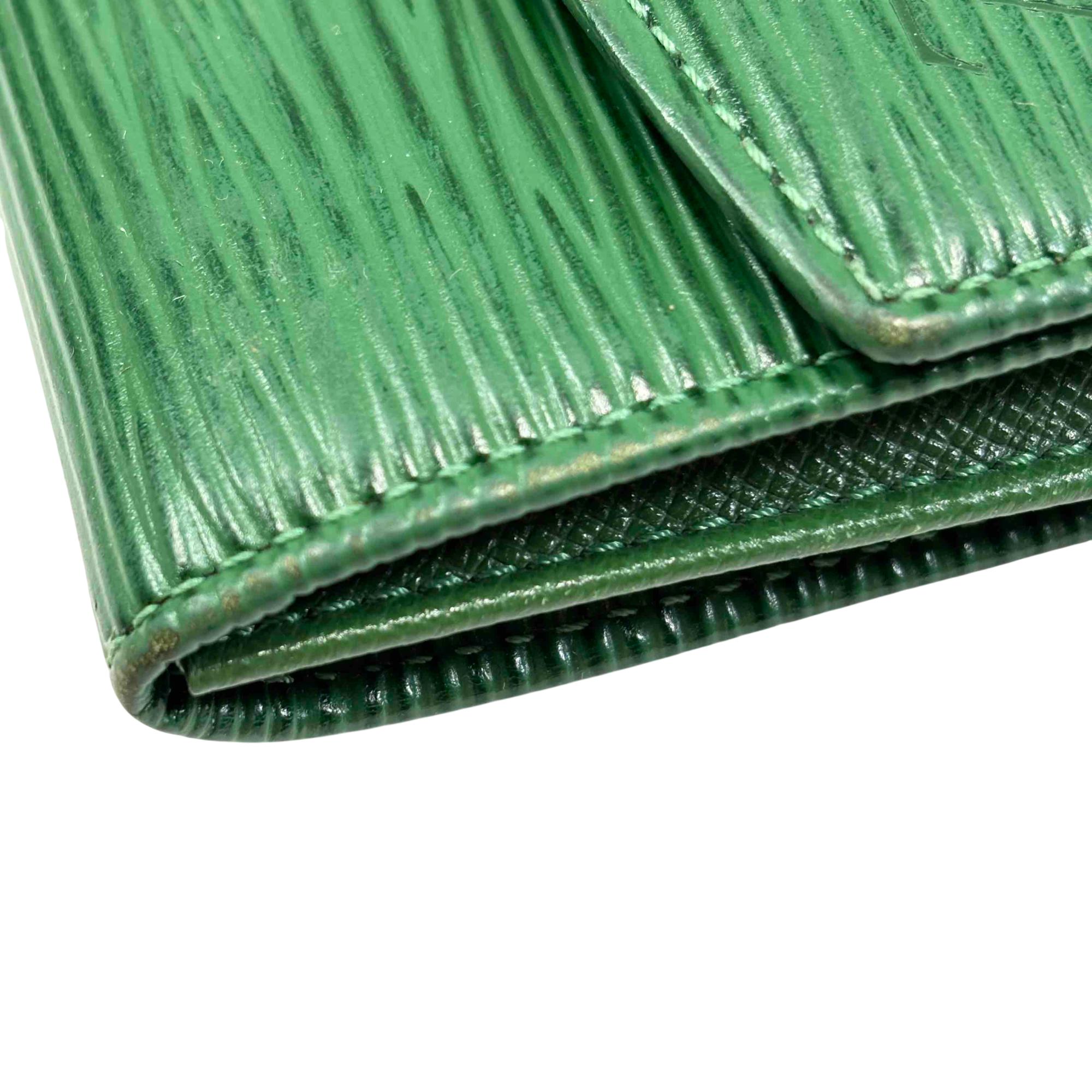 Elevate your style with this exquisite Louis Vuitton Green Epi Leather Wallet. Featuring the iconic logo and adorned with a striking gold button, this luxurious piece offers elegance and functionality, perfect for fashion enthusiasts who appreciate refined accessories.