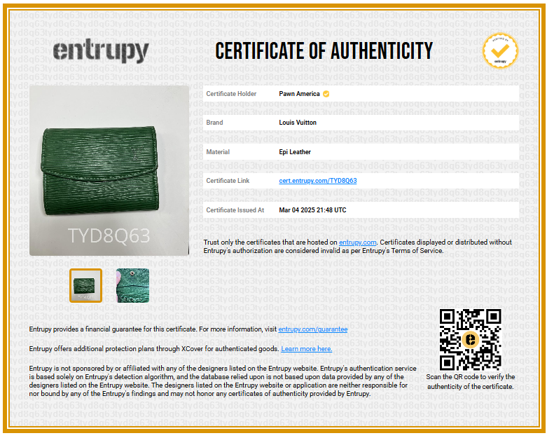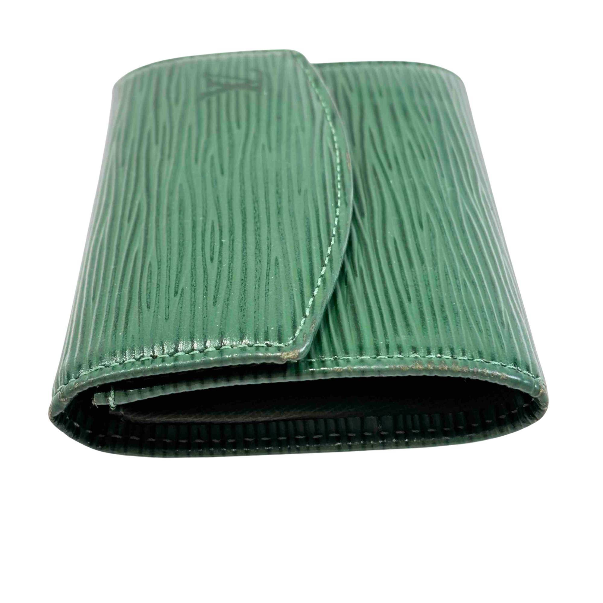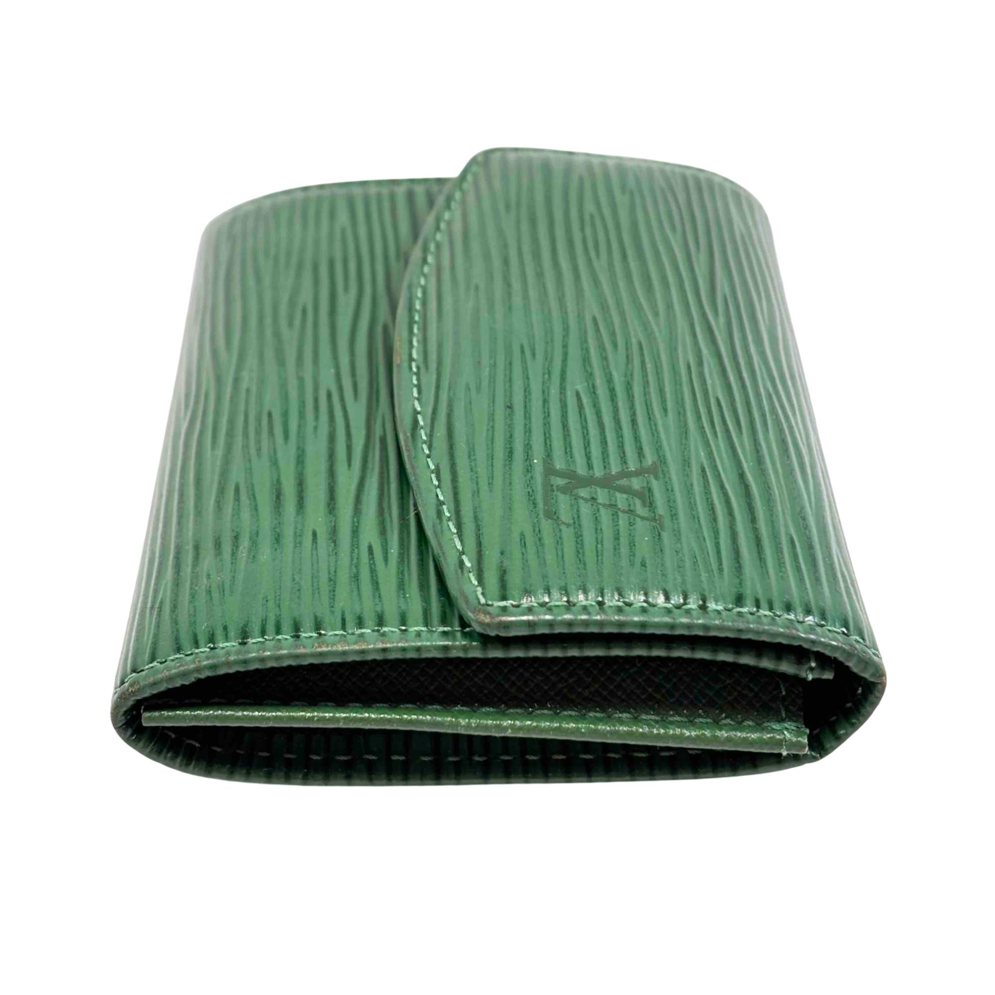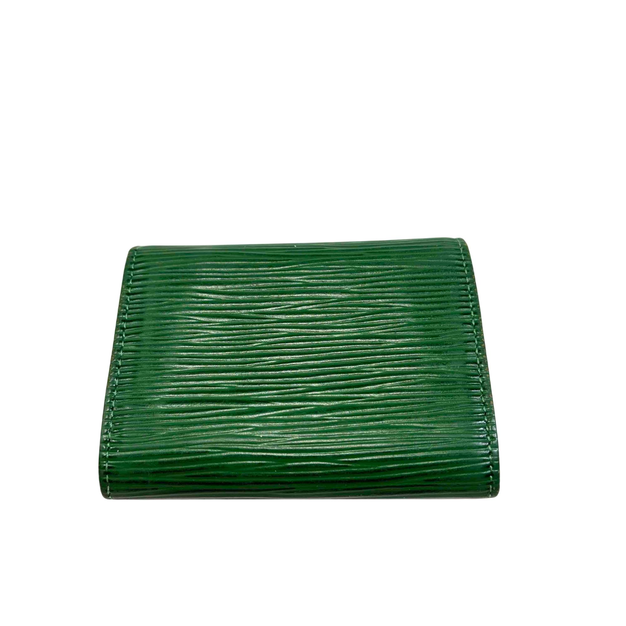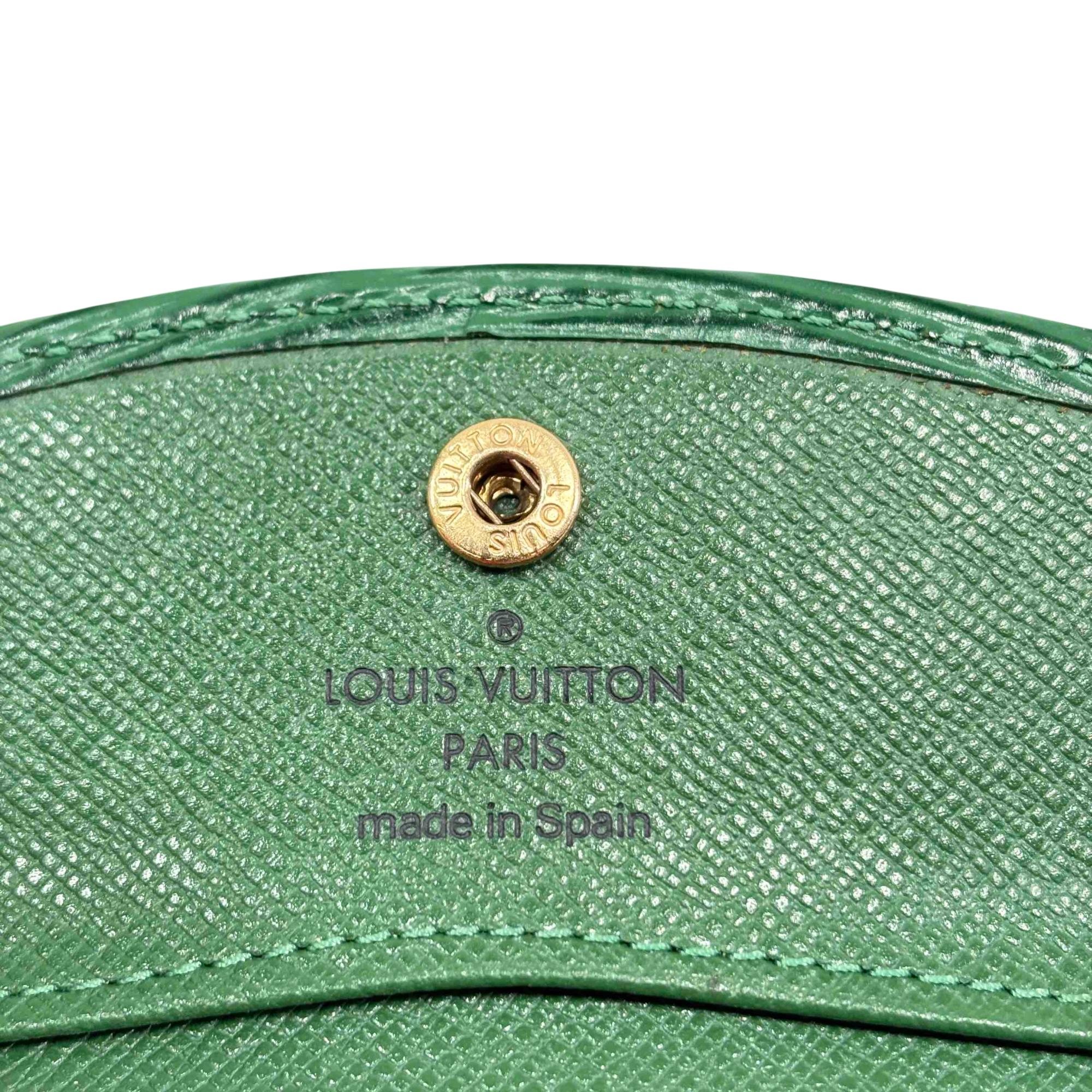 Elevate your style with this exquisite Louis Vuitton Green Epi Leather Wallet. Featuring the iconic logo and adorned with a striking gold button, this luxurious piece offers elegance and functionality, perfect for fashion enthusiasts who appreciate refined accessories.