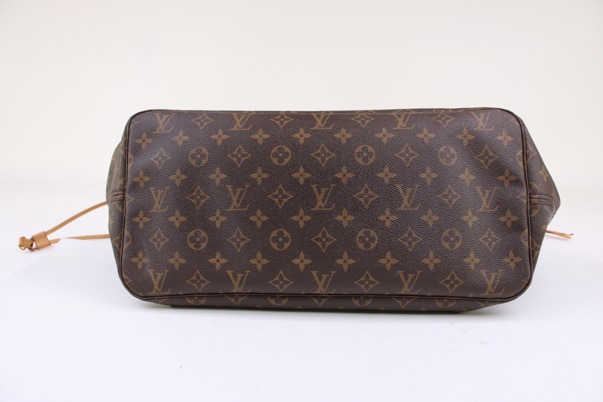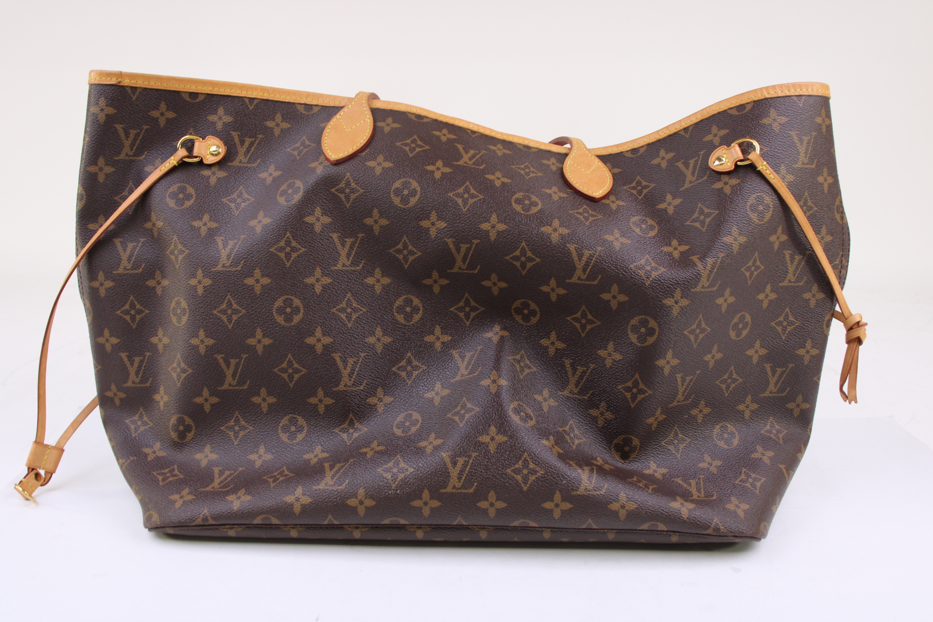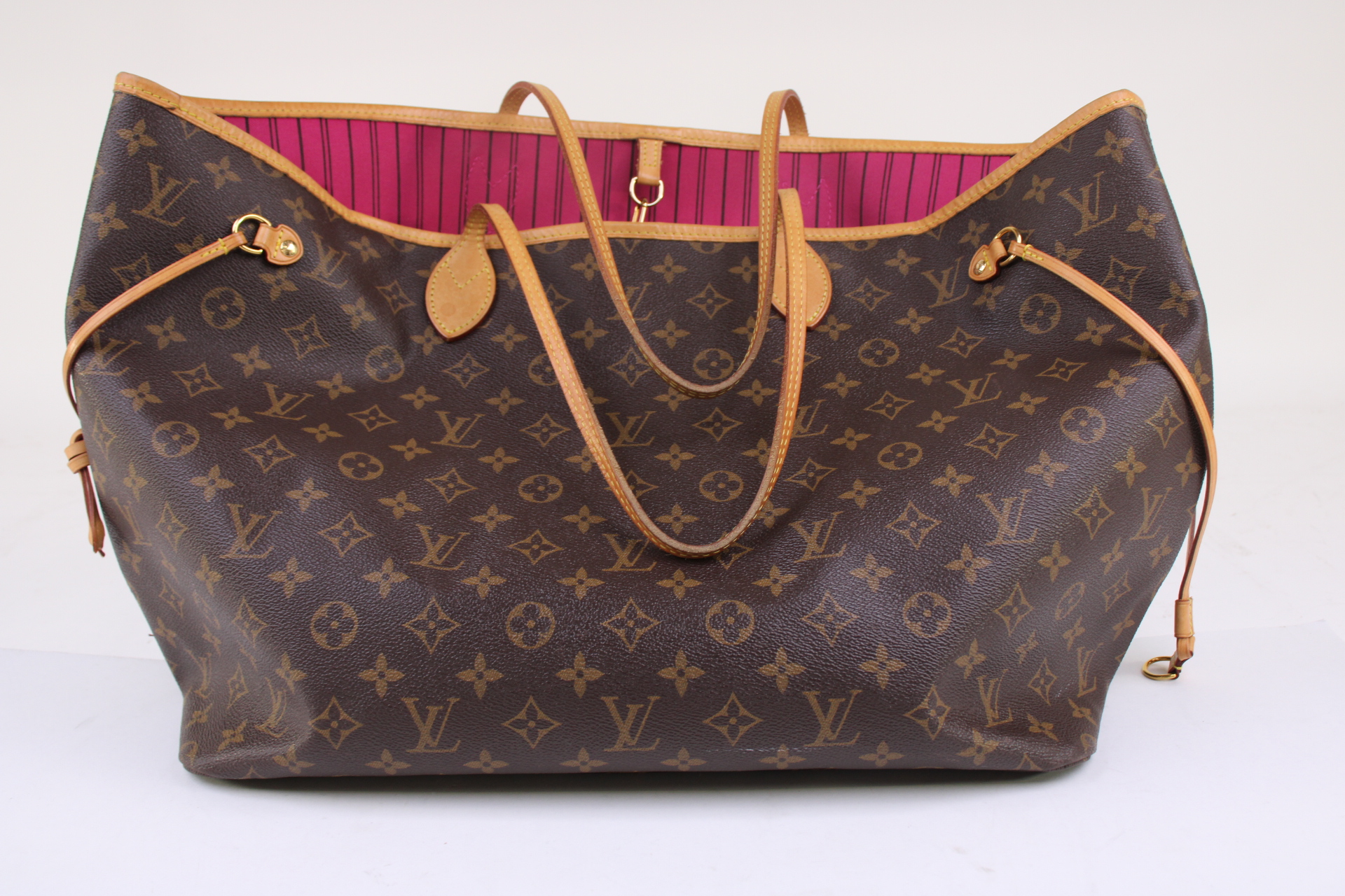 The Neverfull GM tote unites timeless design with heritage details. Made from supple Monogram canvas with natural cowhide trim, it is ultra-roomy but never bulky, with side laces that cinch for a sleek allure or loosen for a more casual look. Slim, comfortable handles slip easily over the shoulder or arm. Lined in colorful textile, it features a removable pouch which can serve as a clutch or an extra pocket.