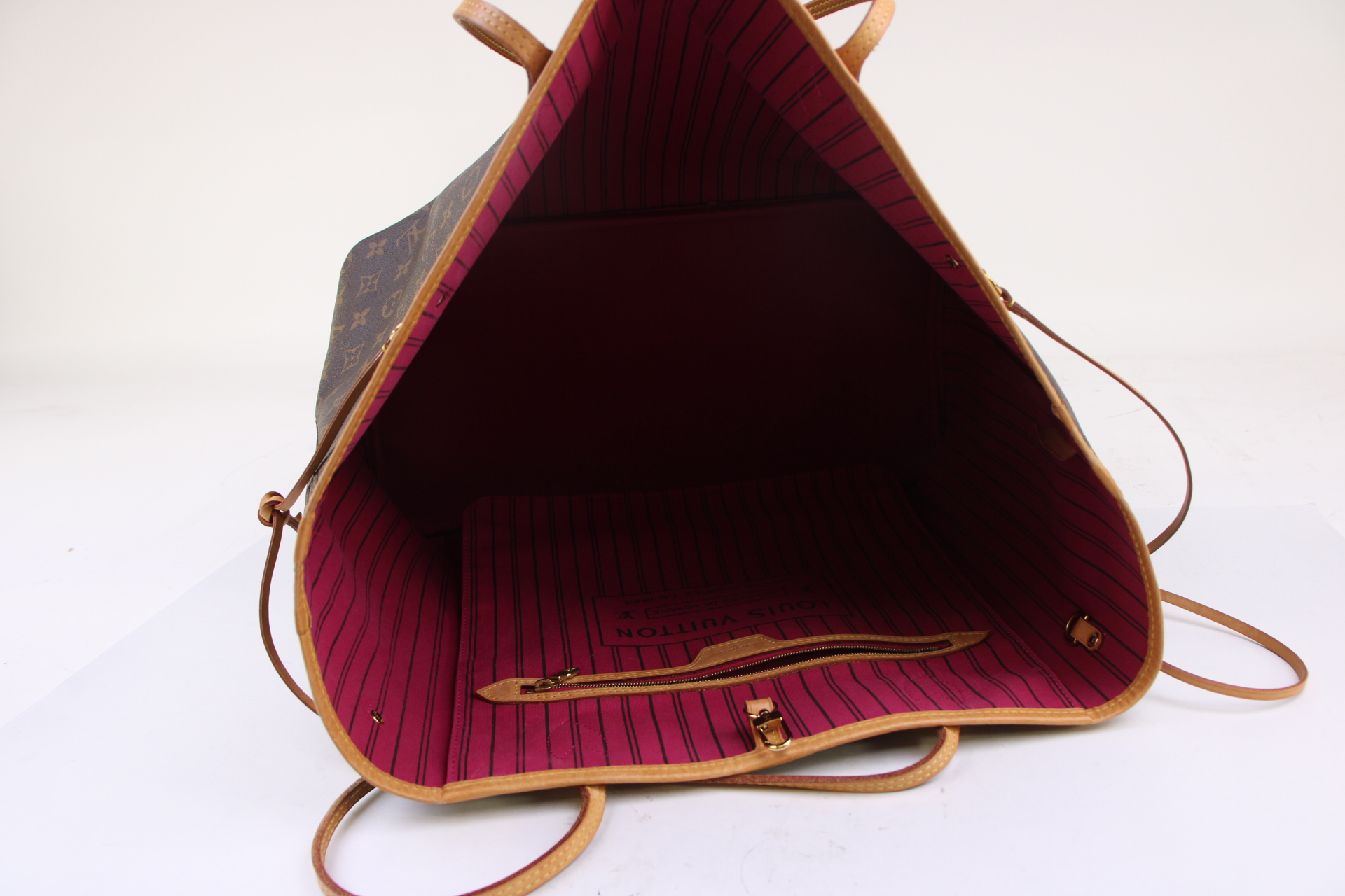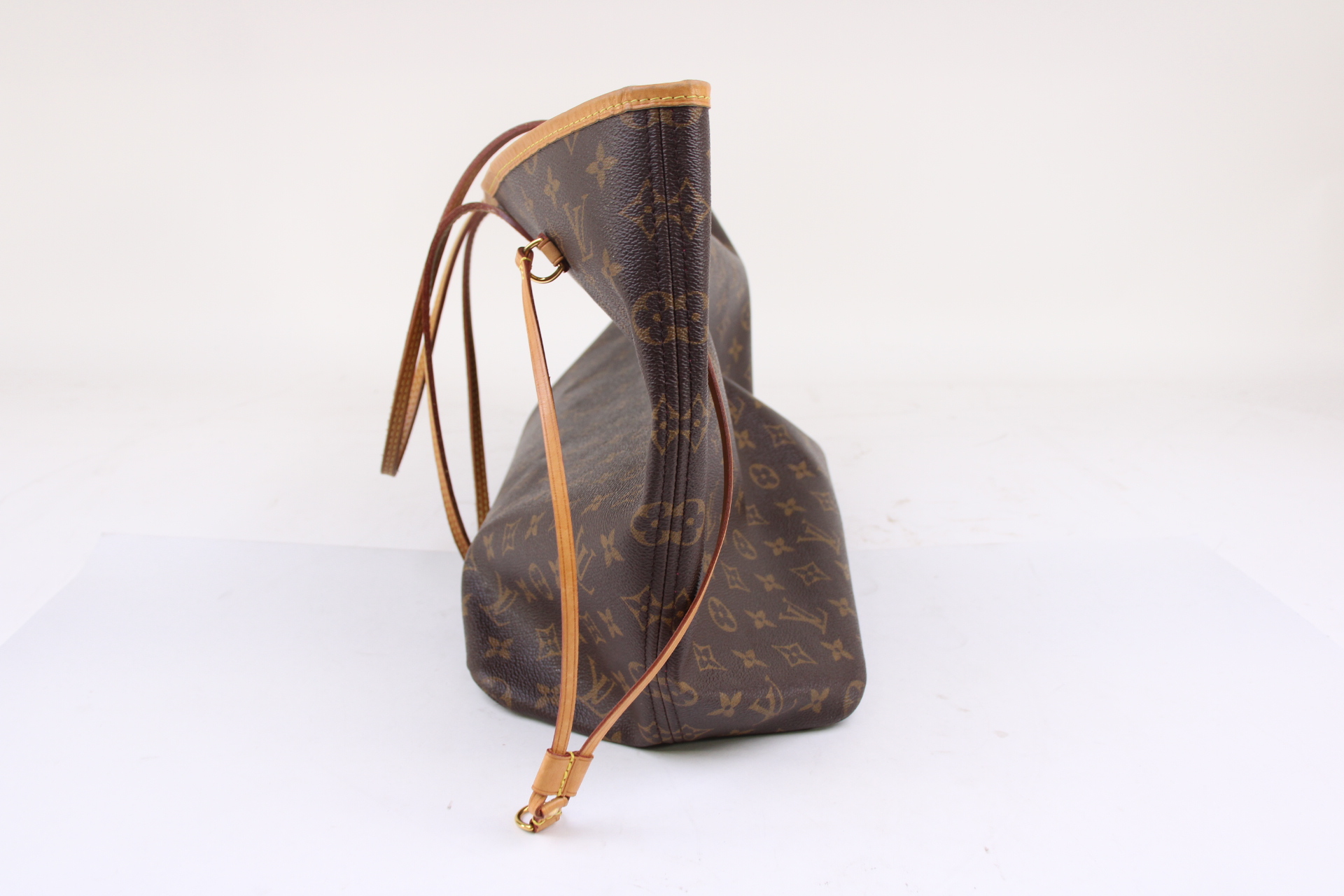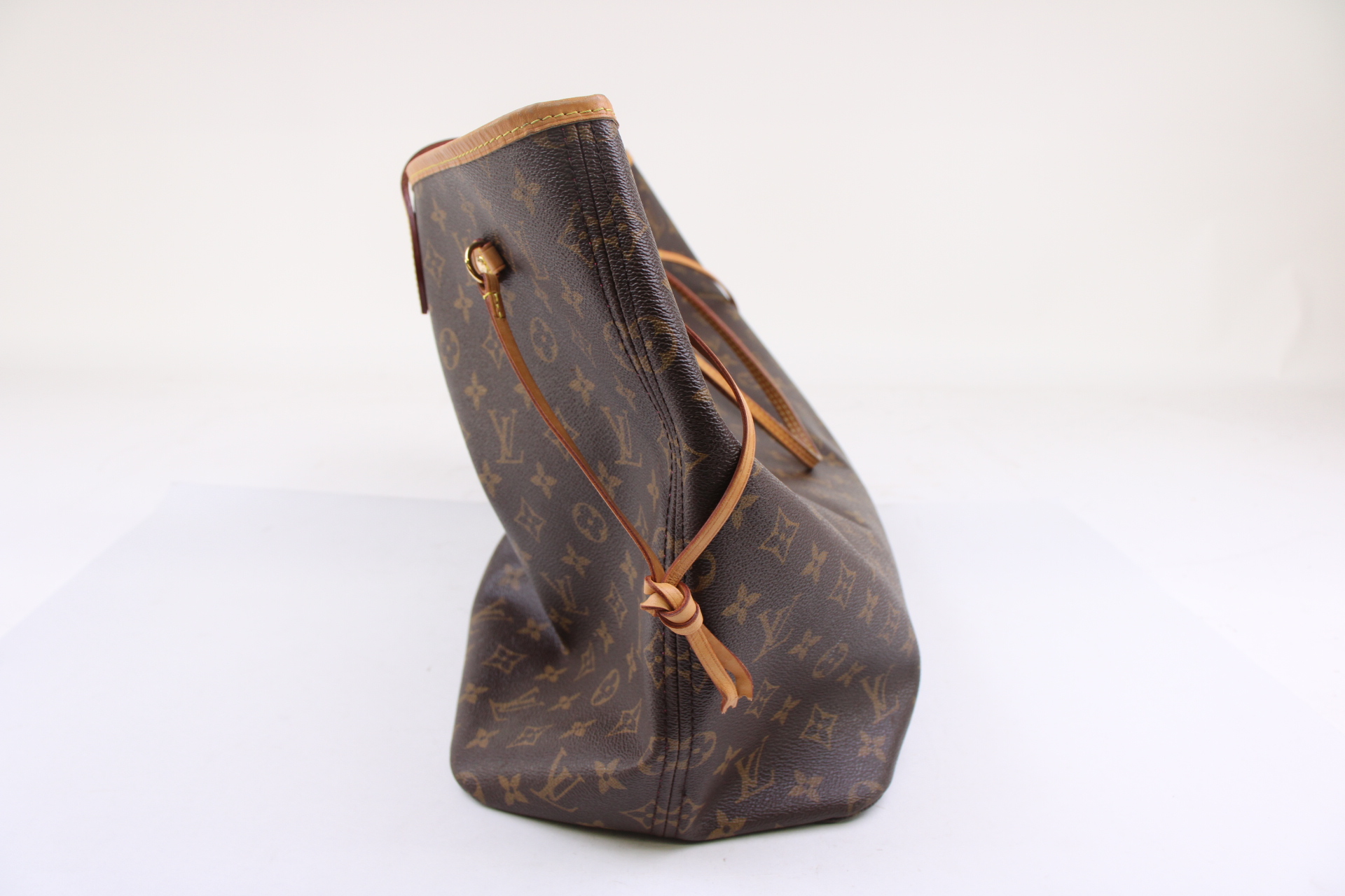 The Neverfull GM tote unites timeless design with heritage details. Made from supple Monogram canvas with natural cowhide trim, it is ultra-roomy but never bulky, with side laces that cinch for a sleek allure or loosen for a more casual look. Slim, comfortable handles slip easily over the shoulder or arm. Lined in colorful textile, it features a removable pouch which can serve as a clutch or an extra pocket.