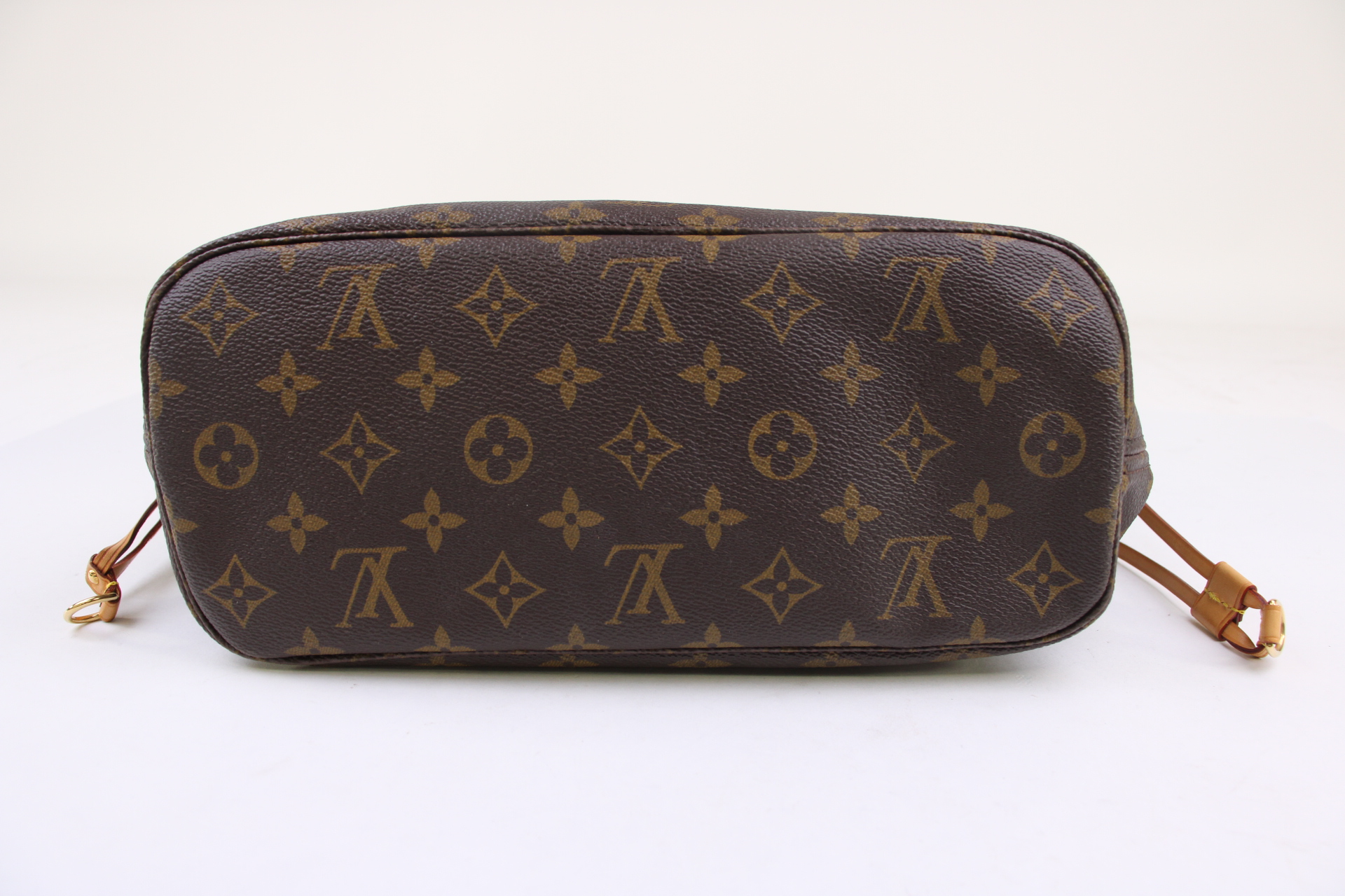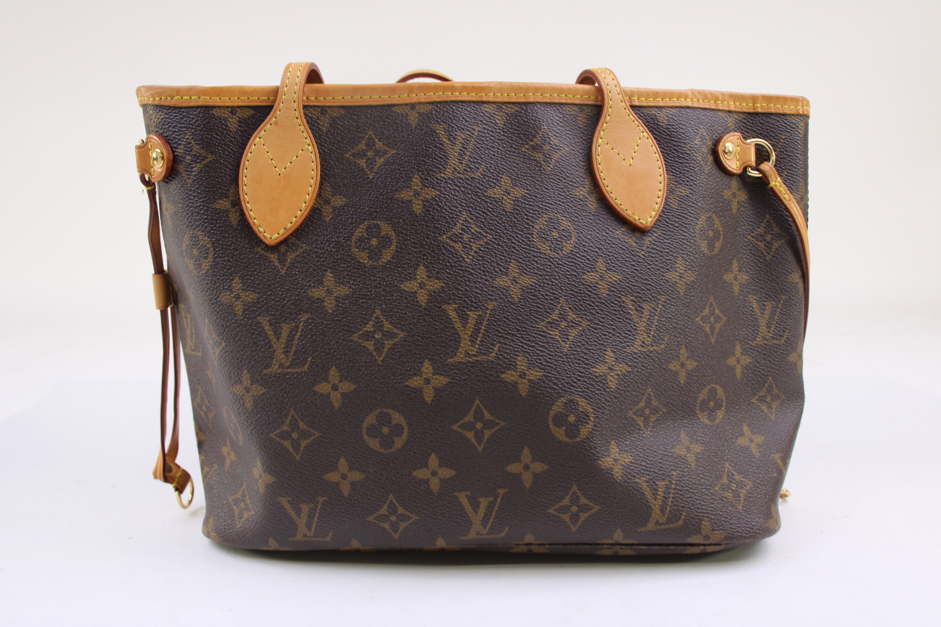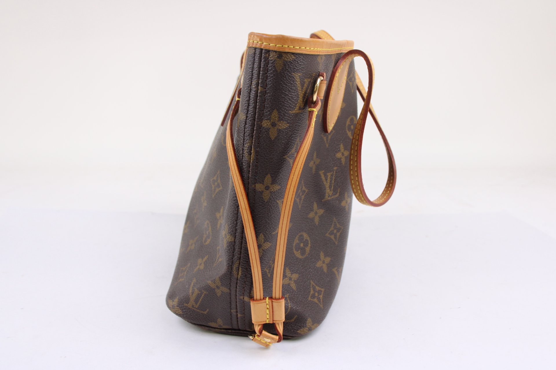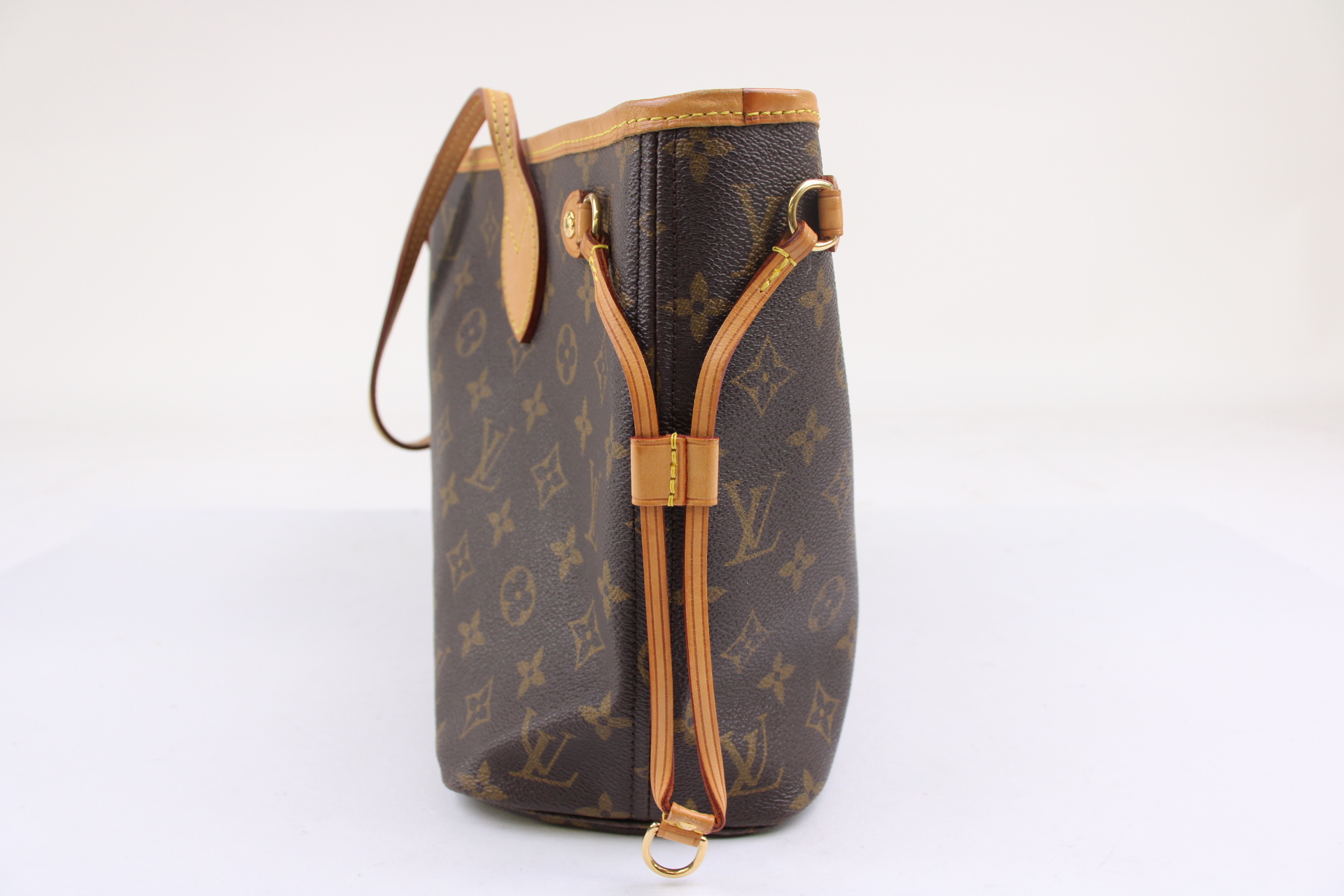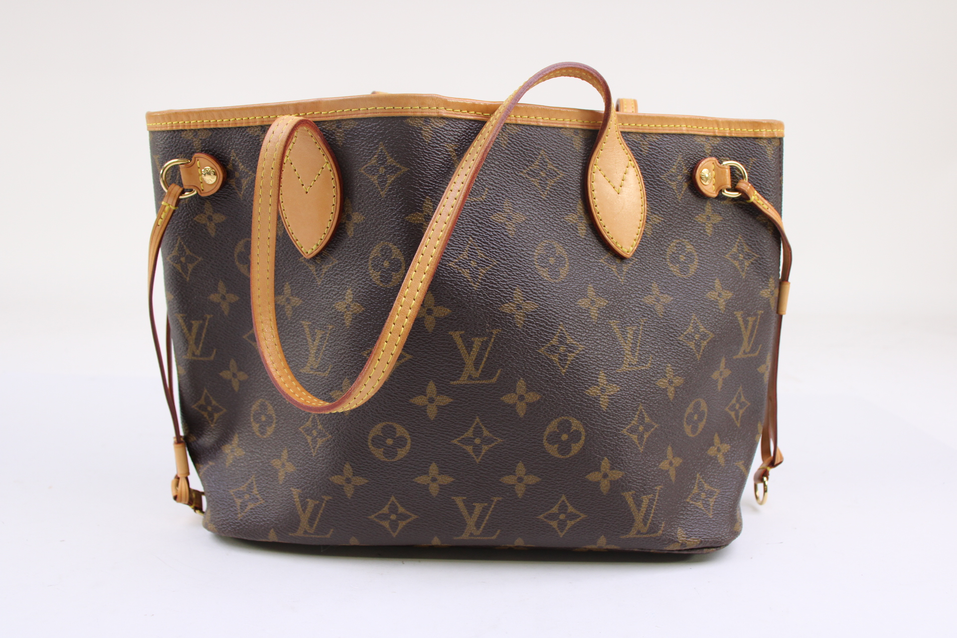 The Neverfull PM tote pairs timeless design with heritage details. Crafted from Monogram coated canvas with natural cowhide trim, it is capacious yet not bulky, with side laces that cinch for a sleek allure or loosen for a casual look. Slim, comfortable handles slip easily over the shoulder or arm.