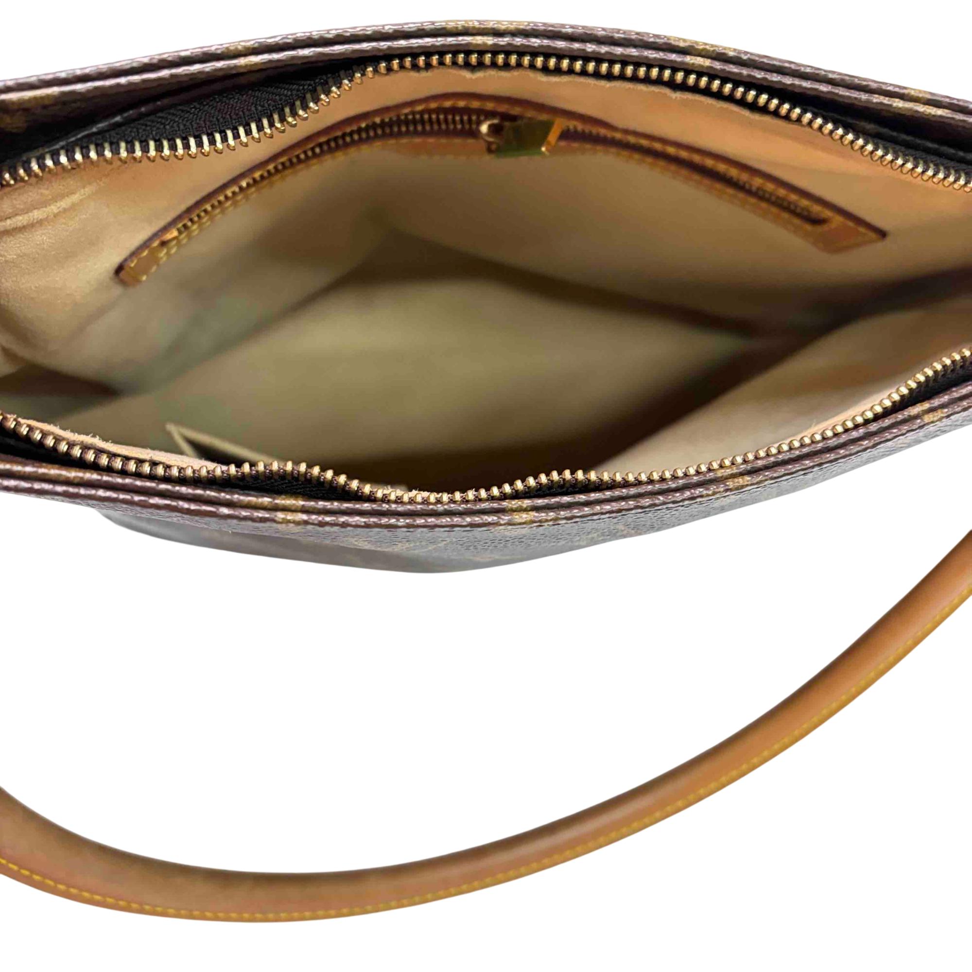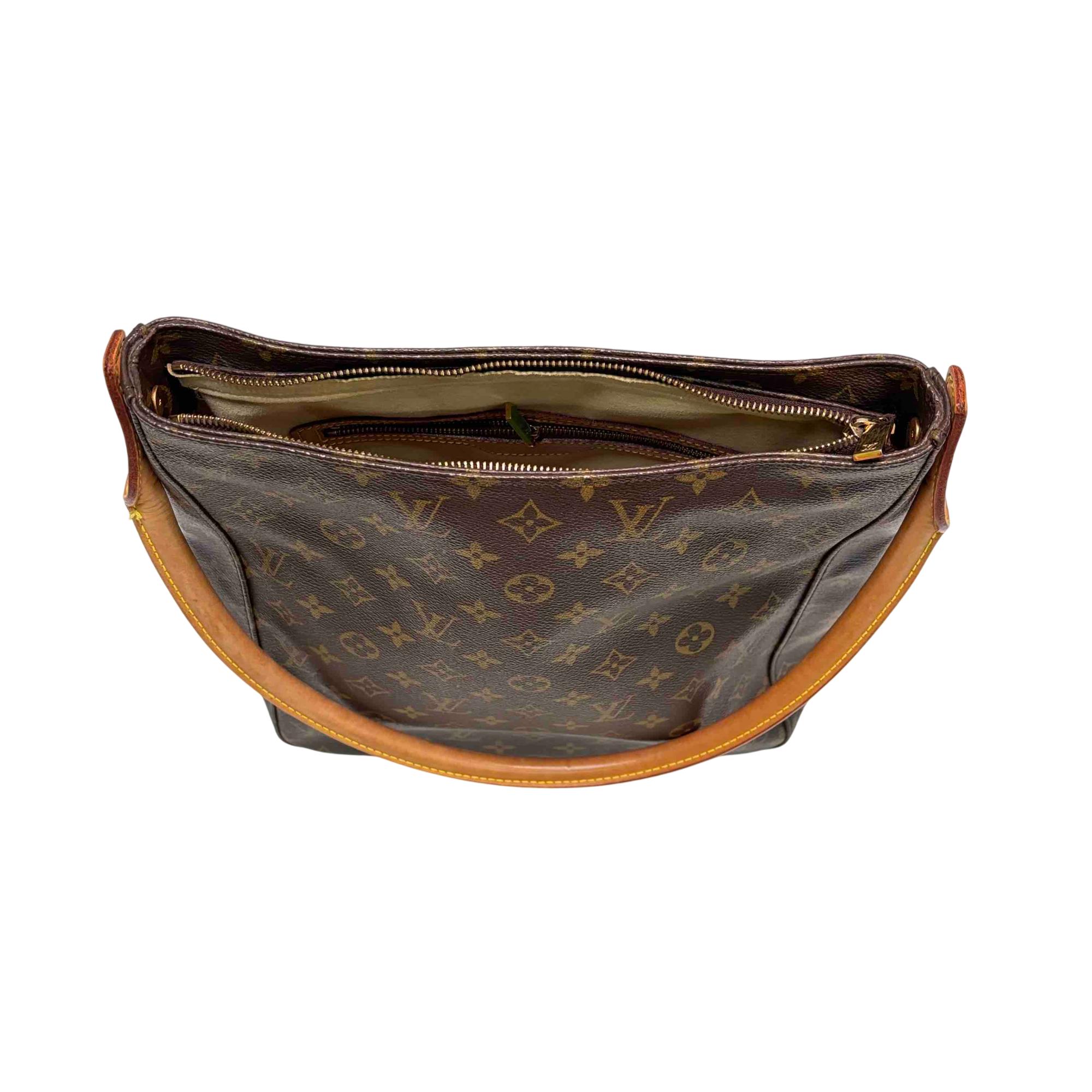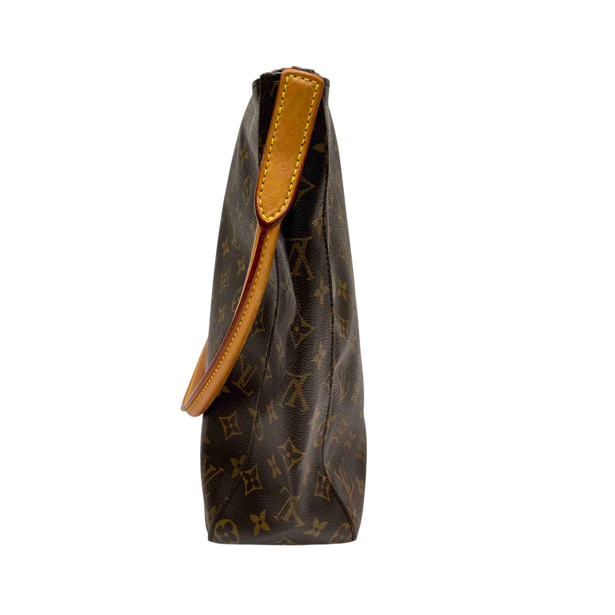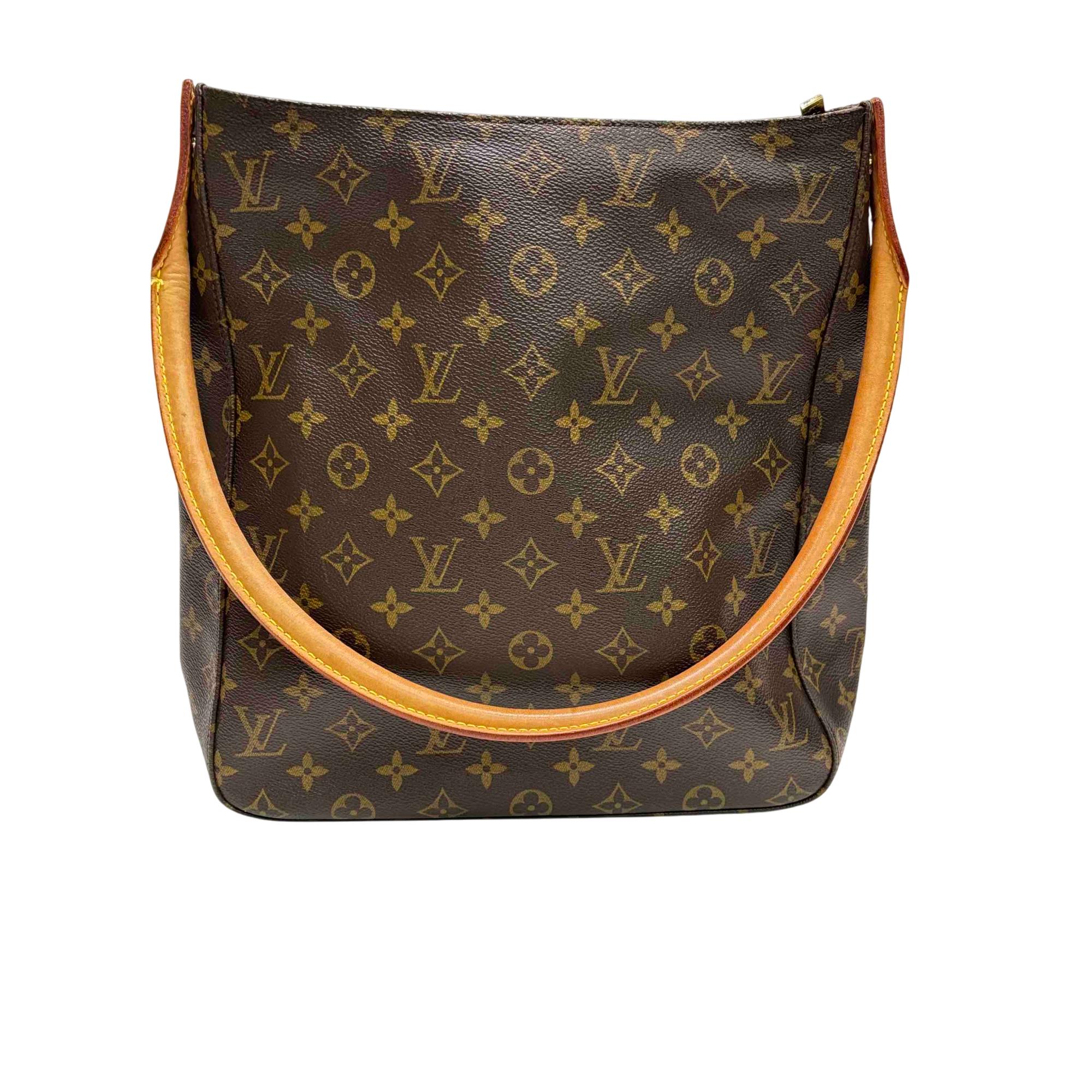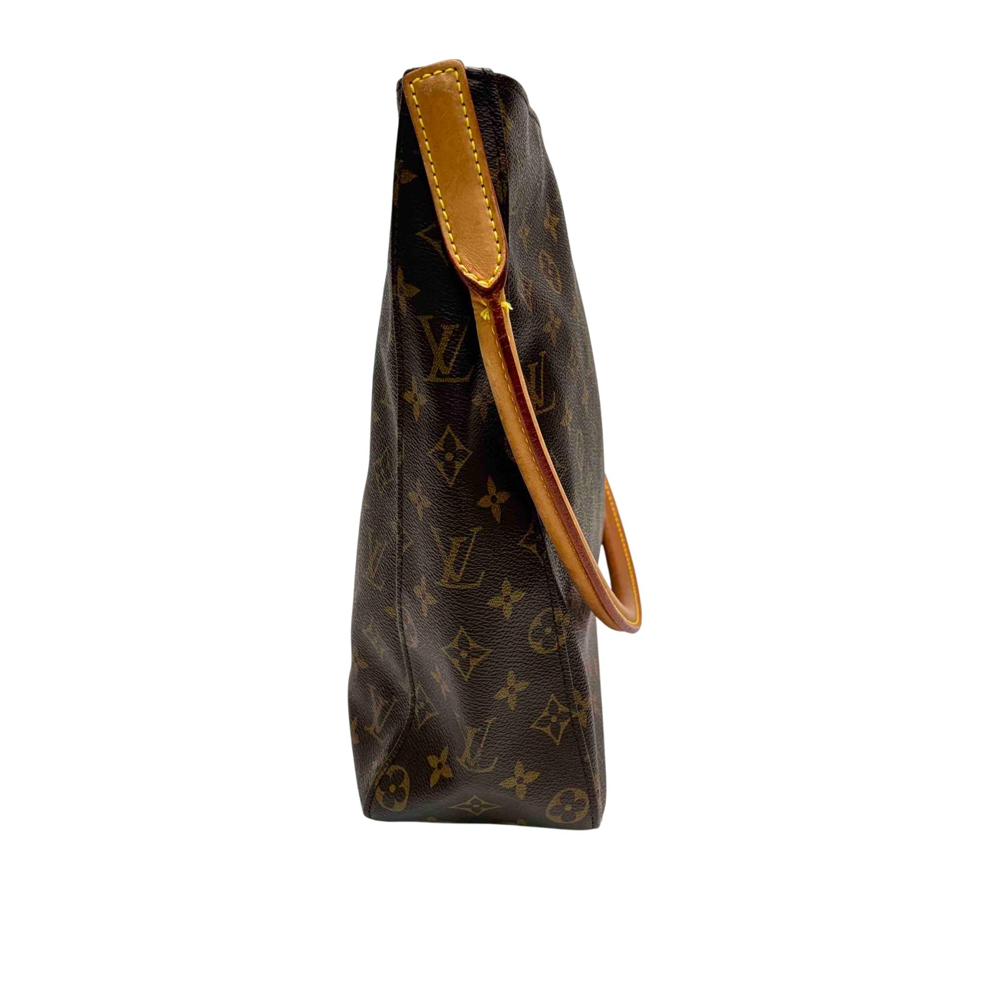 Louis Vuitton Monogram Looping GM Shoulder Bag M51145 features a classic brown and tan monogram canvas with a structured silhouette and distinctive looping leather strap. Crafted with premium leather and durable canvas, this shoulder bag offers timeless elegance and versatile style for everyday use. Its sophisticated design complements both casual and formal outfits, making it a must-have fashion accessory.