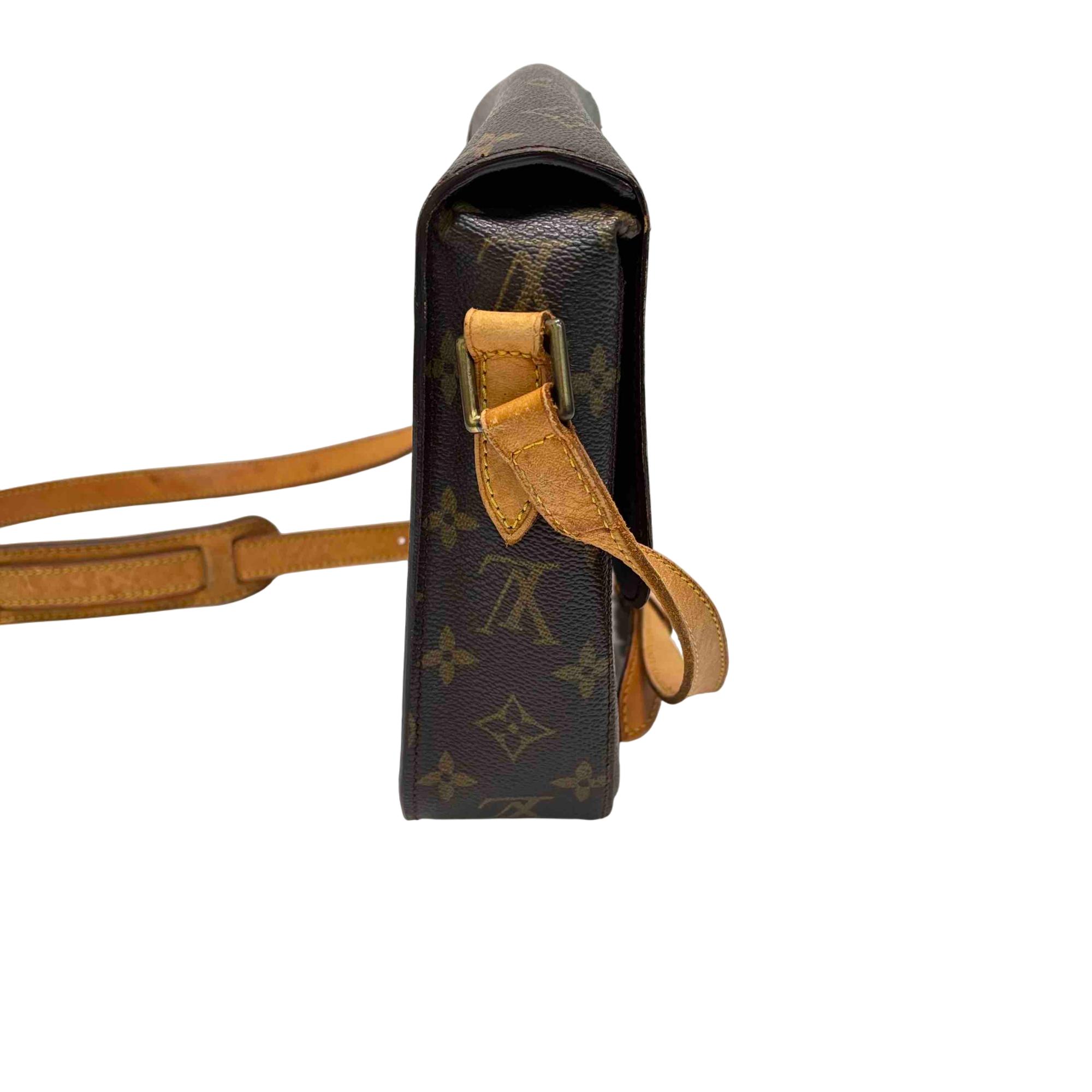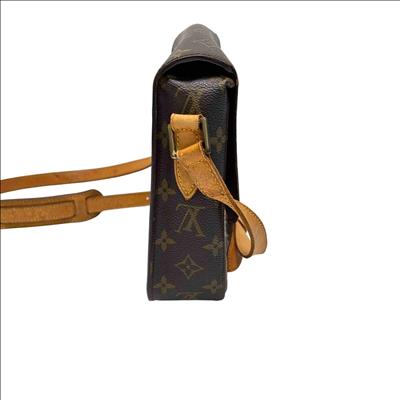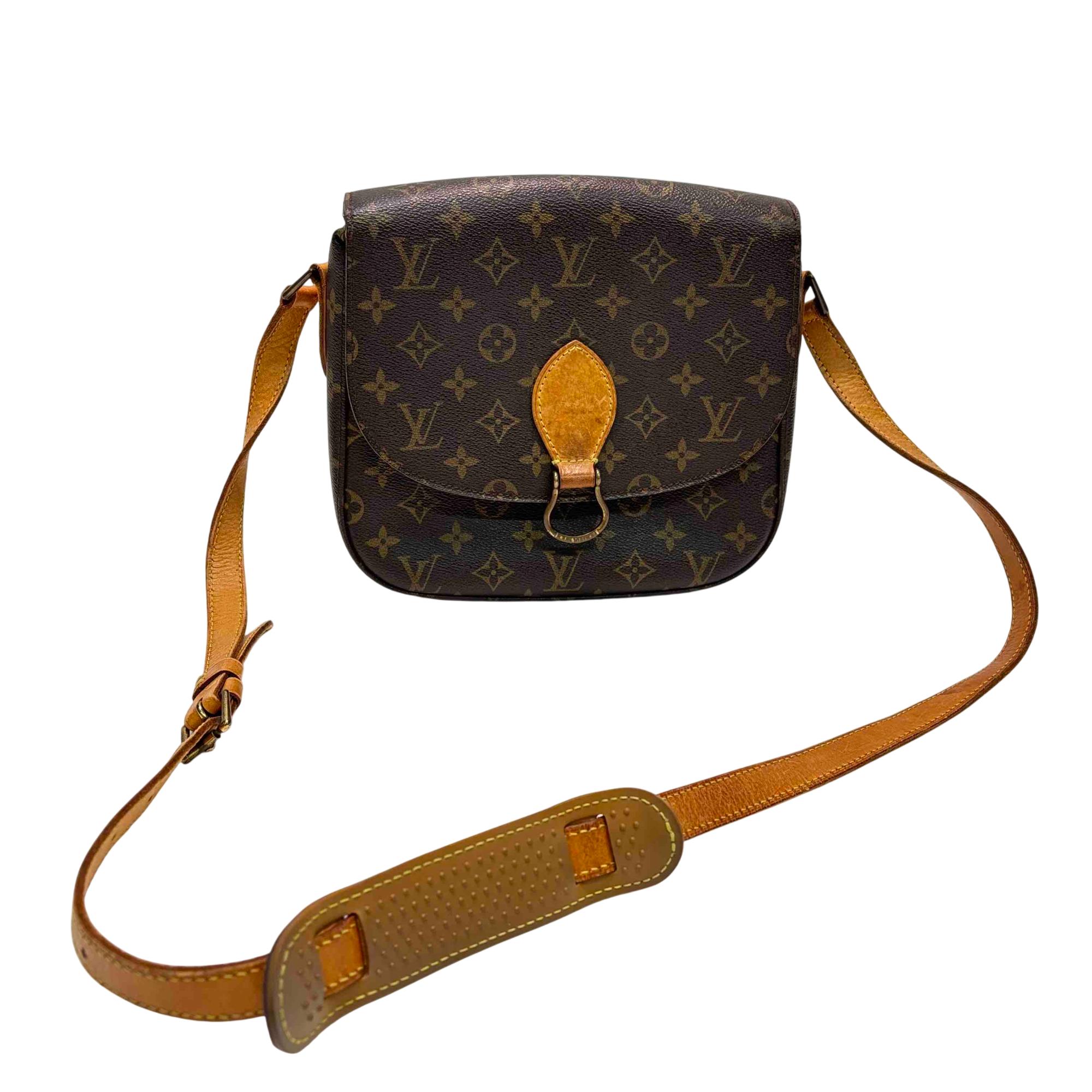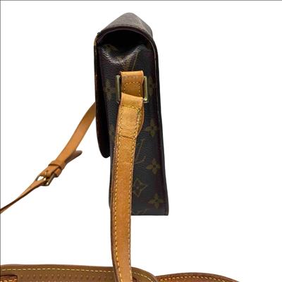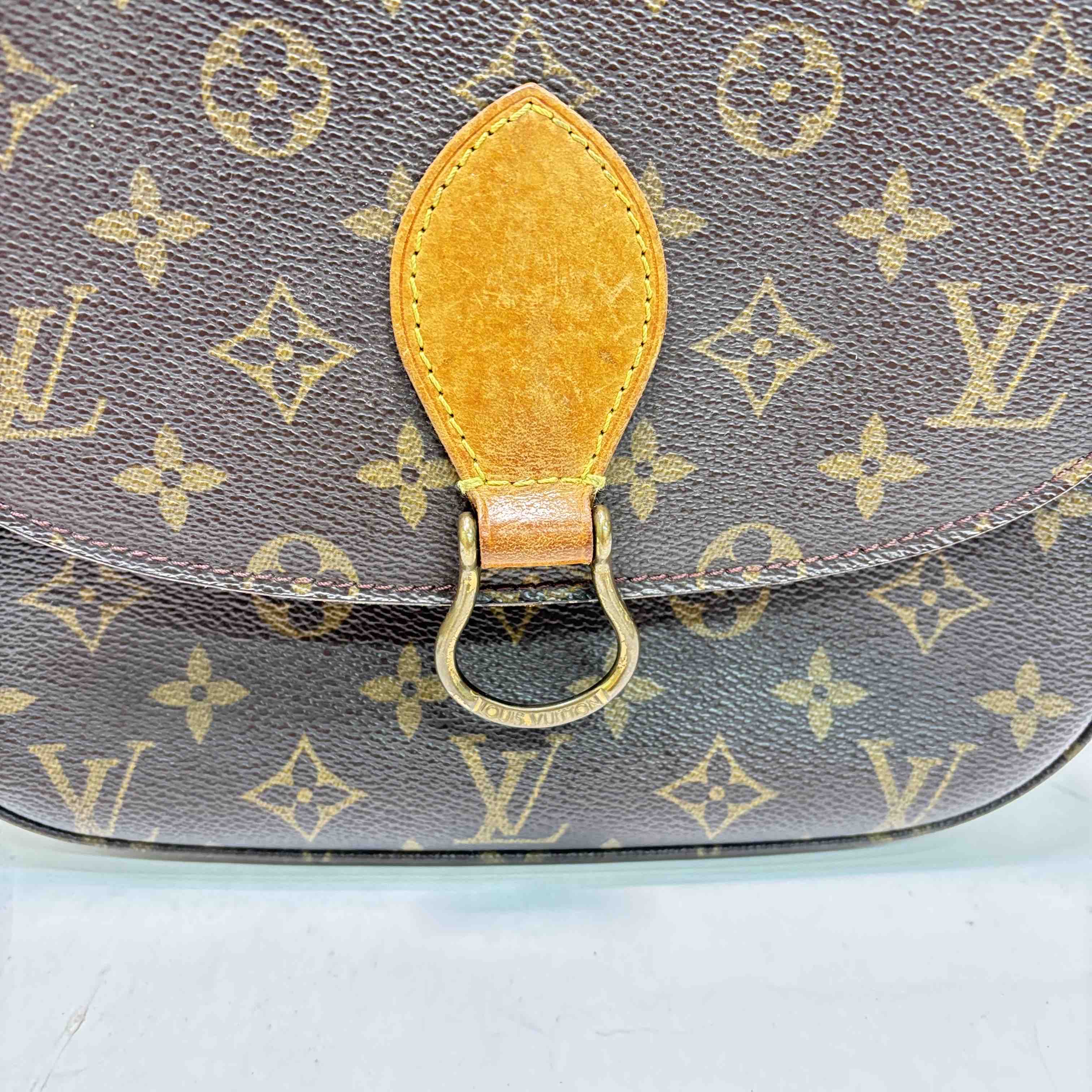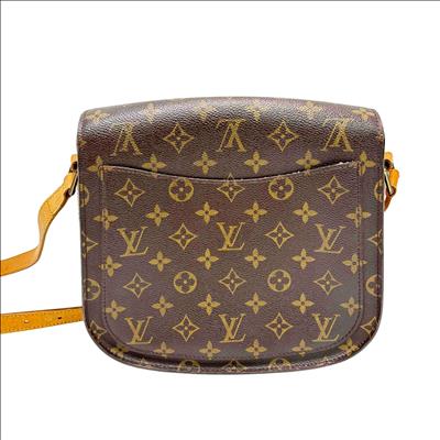 The Louis Vuitton Monogram Saint Cloud GM Shoulder Bag M51242 features the brands iconic monogram canvas with rich brown leather trim and contrasting yellow stitching. This vintage-style messenger bag is designed with a sturdy leather strap and a secure buckle closure, making it a stylish and functional accessory for everyday use. Its spacious interior and classic design embody timeless luxury and craftsmanship.