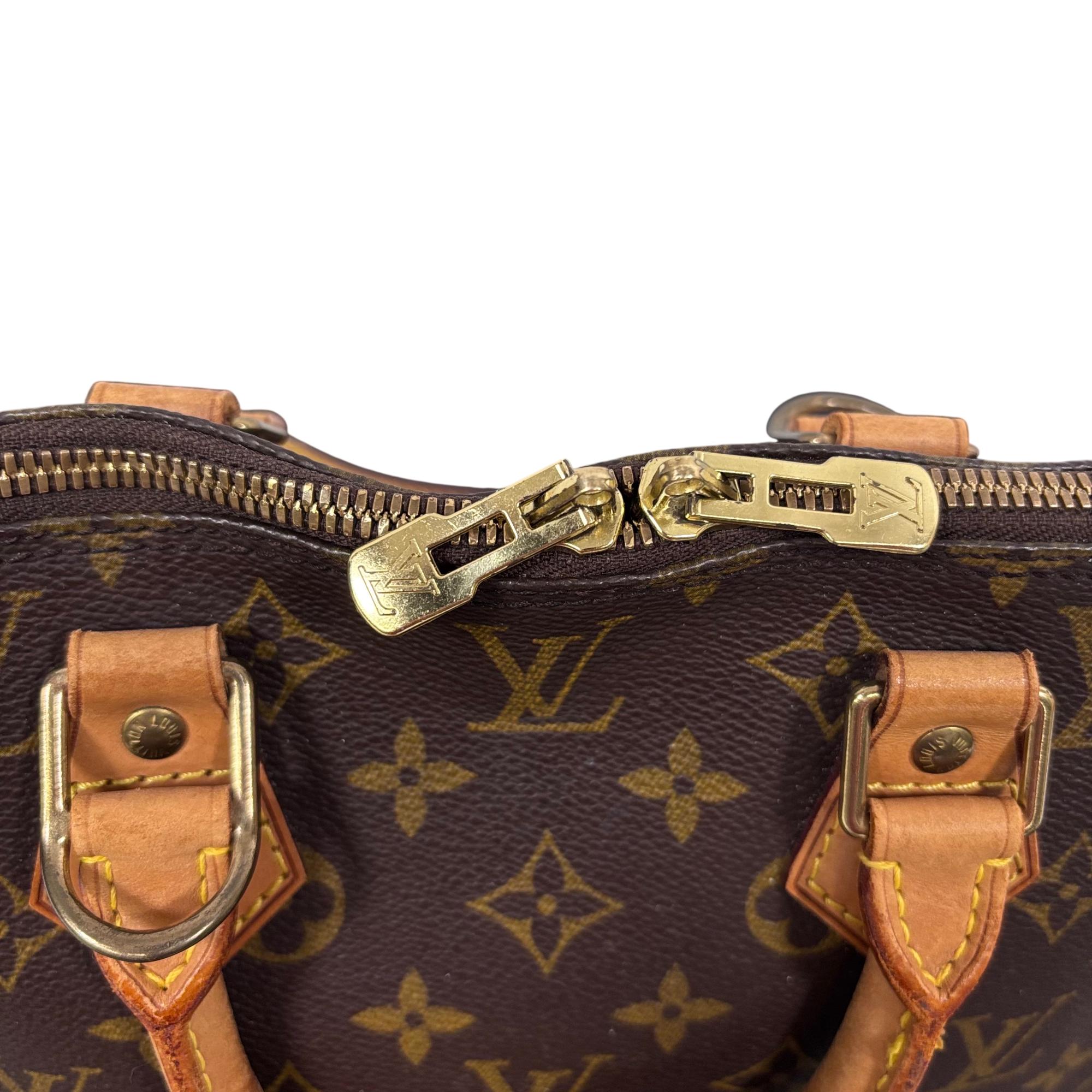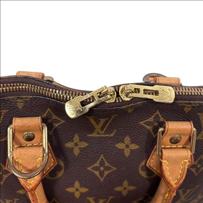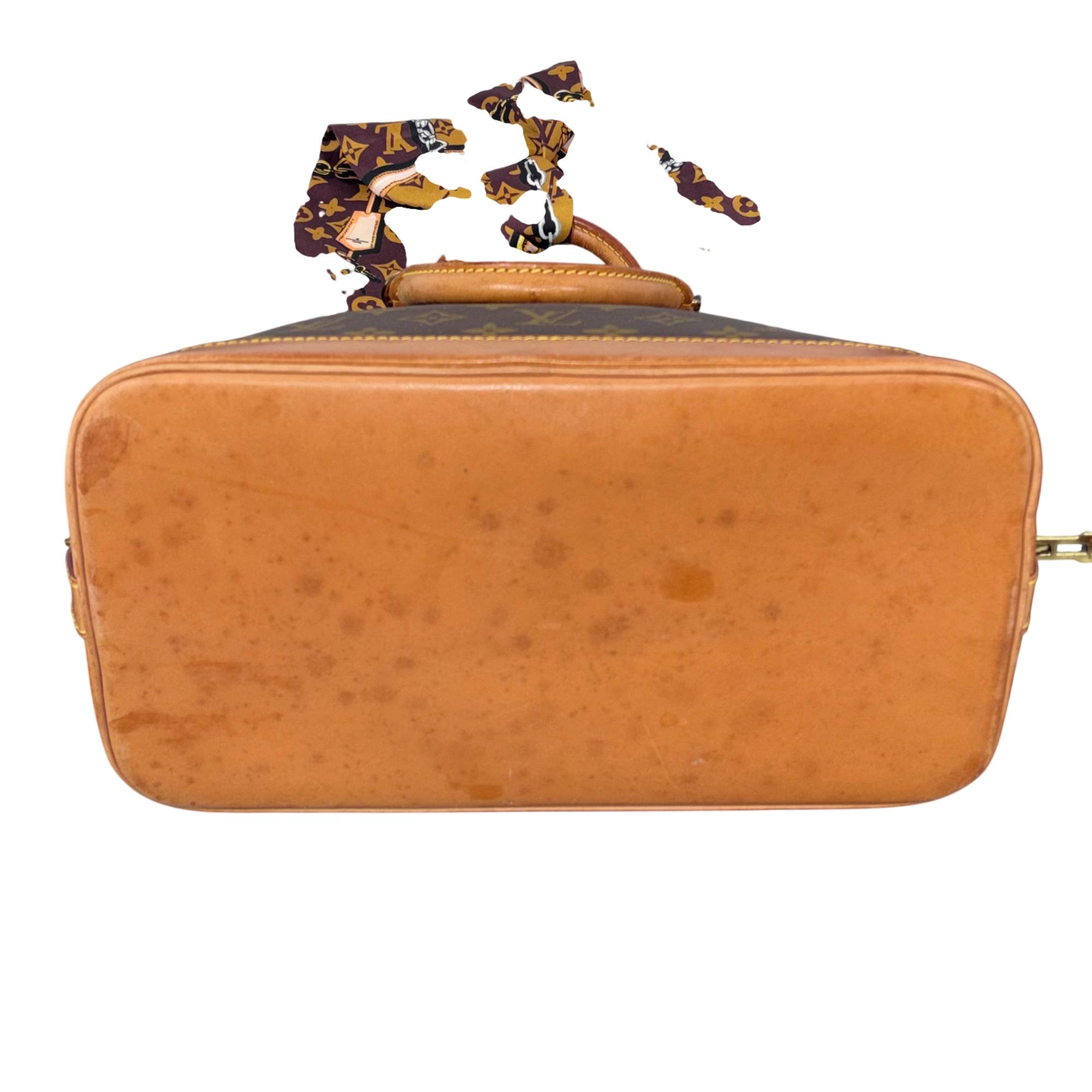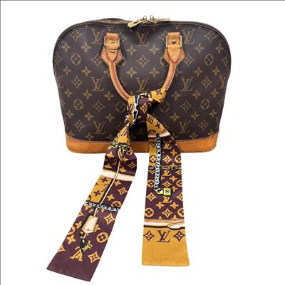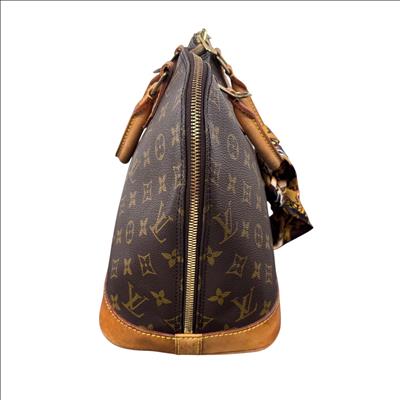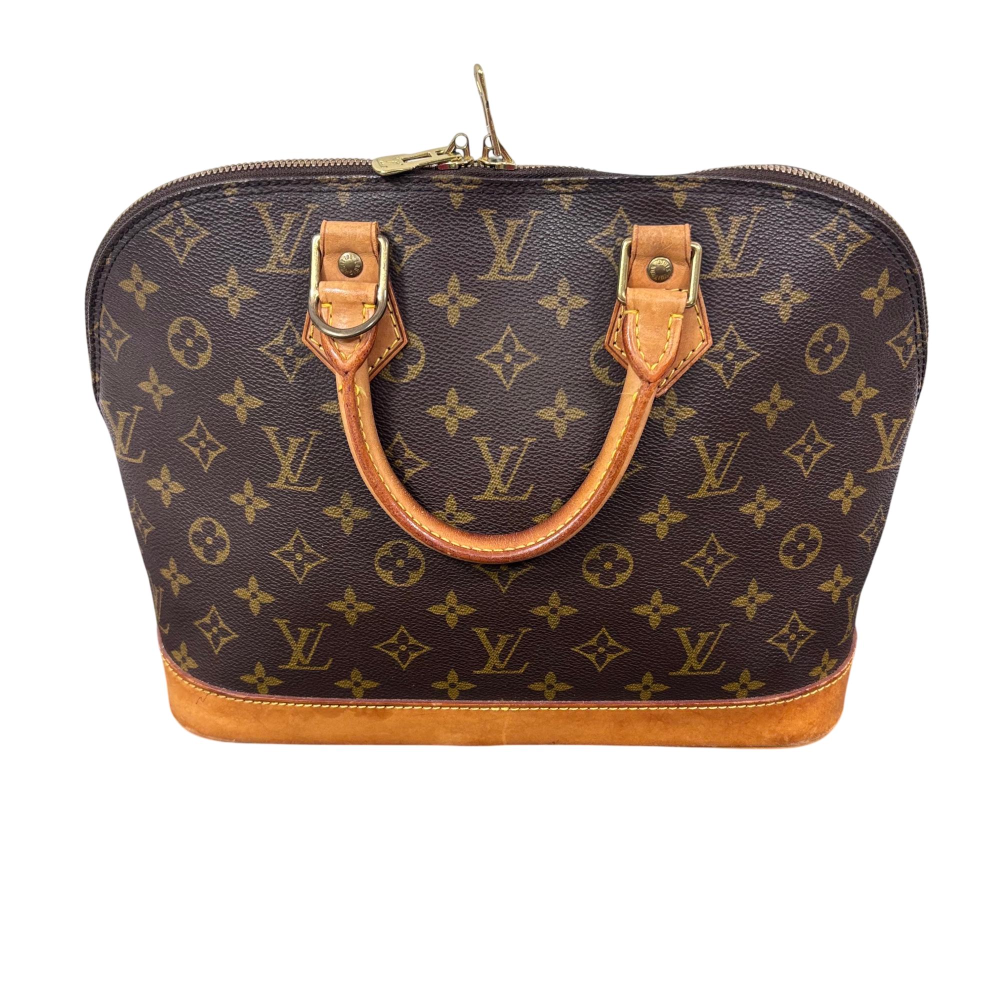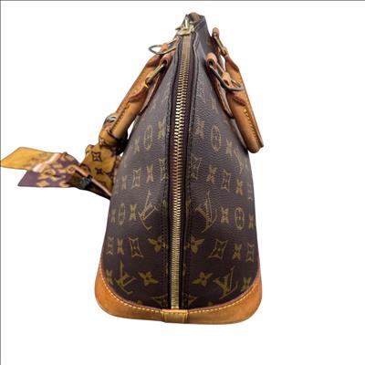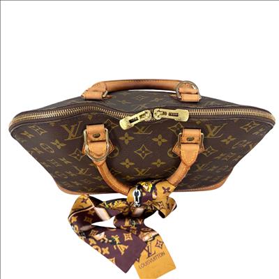 Louis Vuitton Monogram Alma PM Handbag M51130 features the iconic monogram canvas with elegant brown leather handles and gold-tone hardware. This structured and compact handbag is detailed with a sturdy double zipper closure, leather straps, and a distinctive bow accent, showcasing sophisticated craftsmanship perfect for everyday use or special occasions.