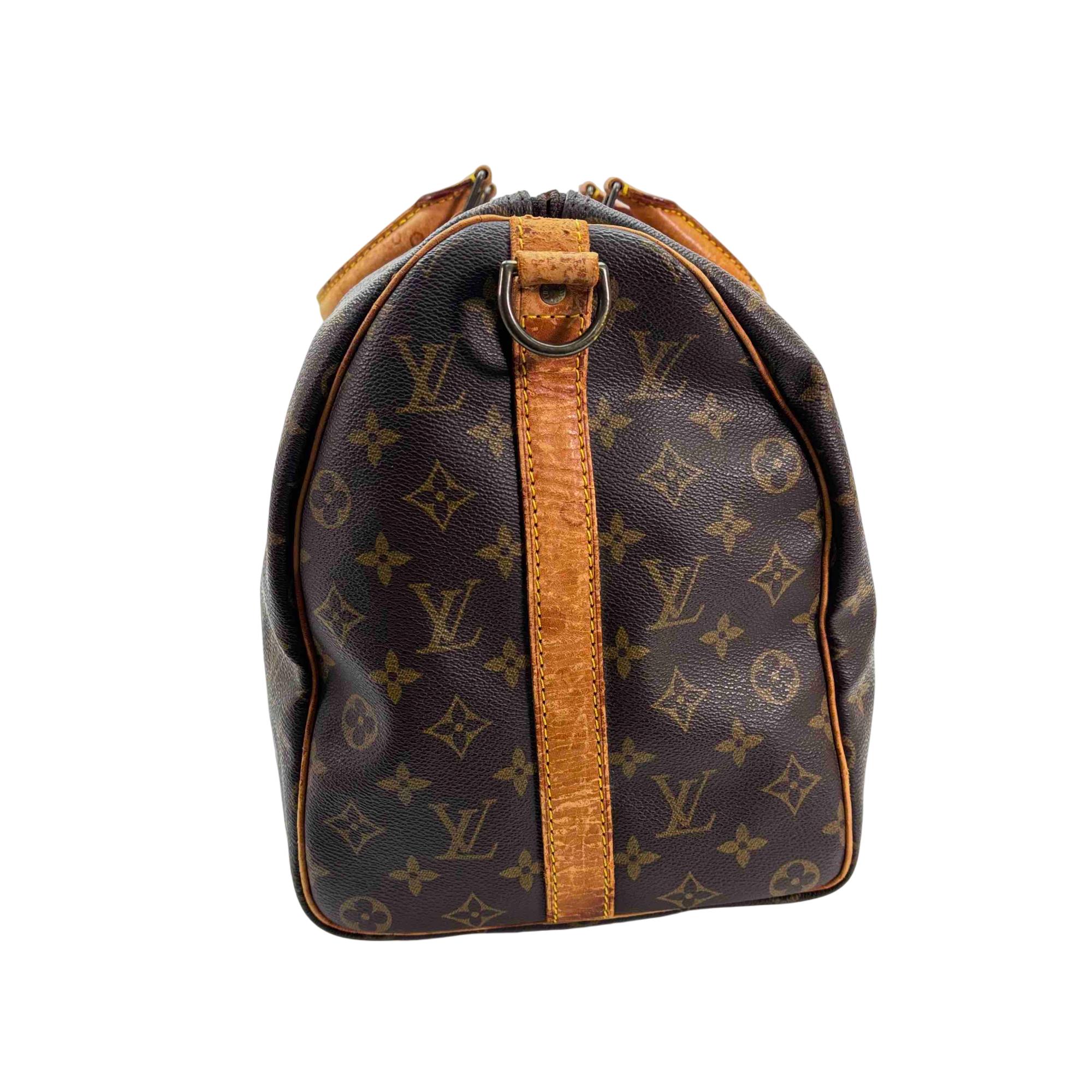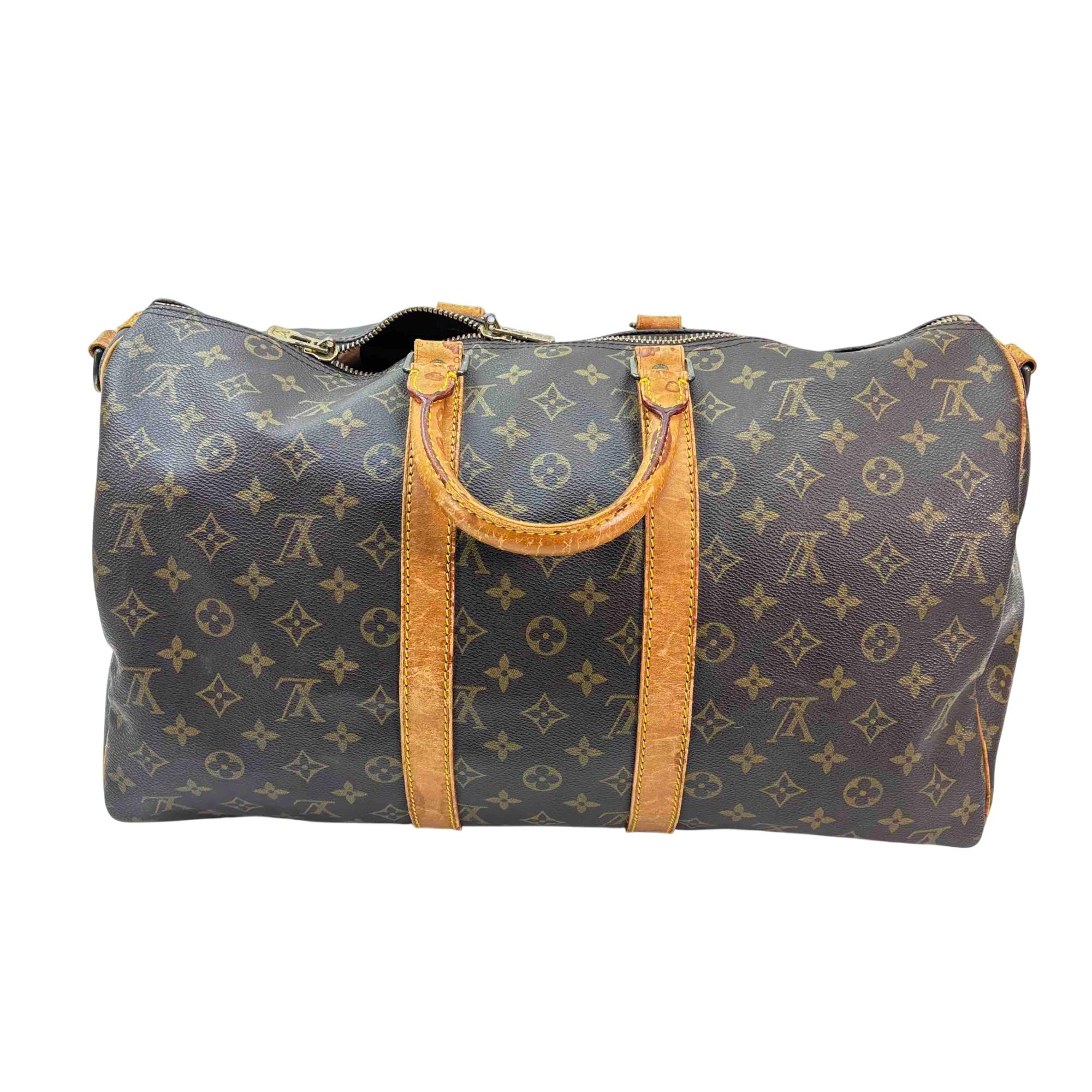 Introducing the timeless Louis Vuitton Keepall 45 Monogram Canvas Duffle Bag, the perfect travel companion for those with a taste for luxury and style. Crafted from the iconic brown and tan monogram canvas, this versatile and spacious bag is ideal for both short getaways and the gym. With durable leather trim and sturdy handles, it exemplifies Louis Vuittons unmatched craftsmanship and elegance. Elevate your accessory collection with this classic piece.