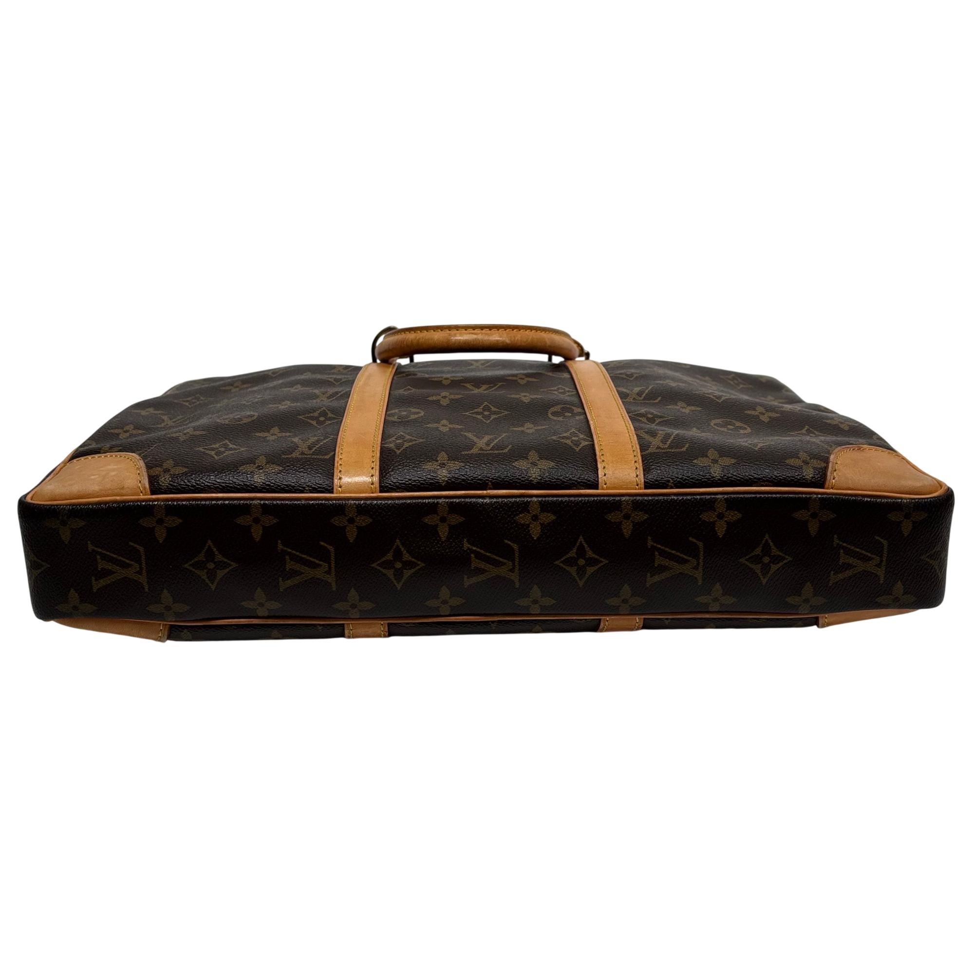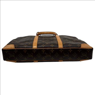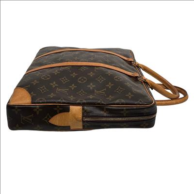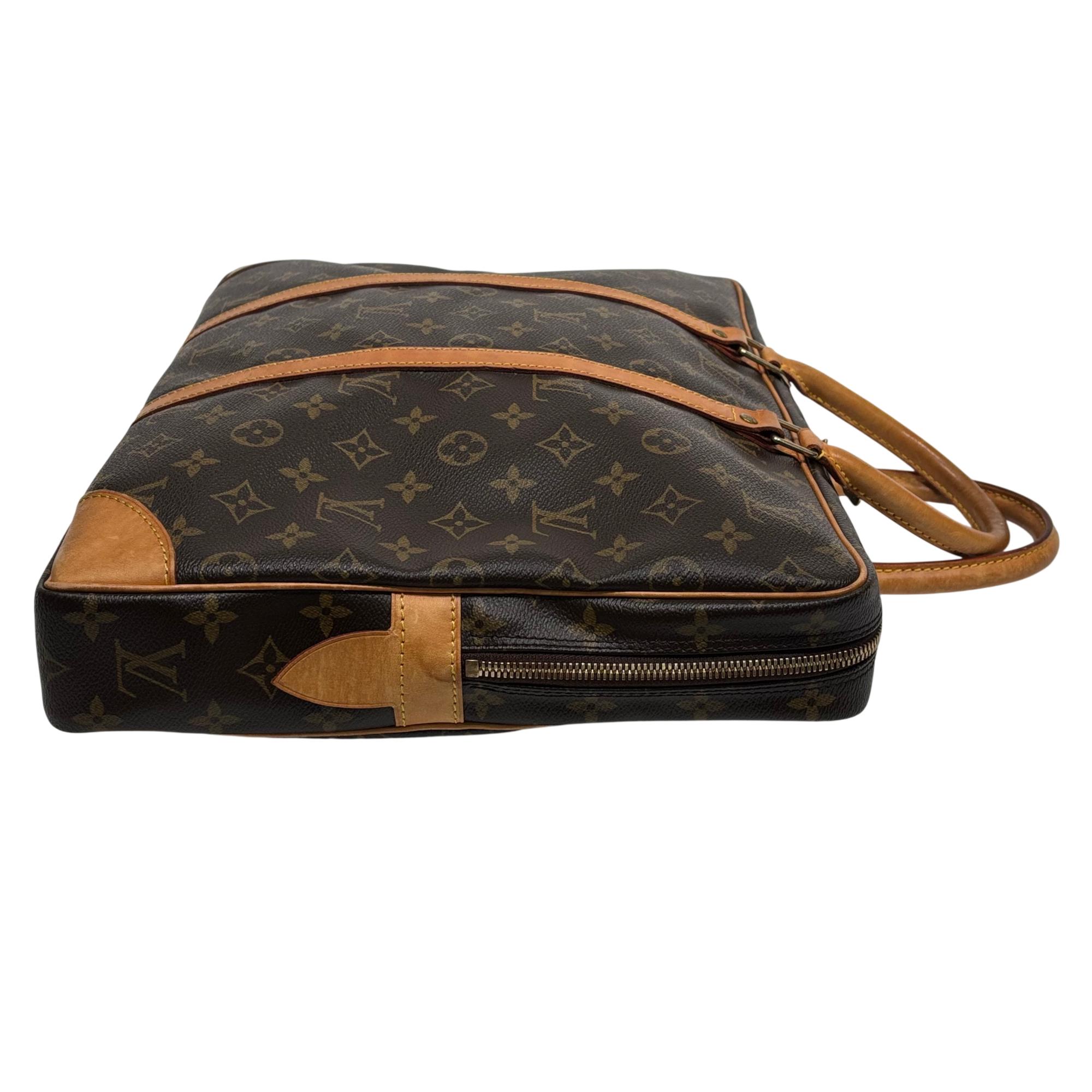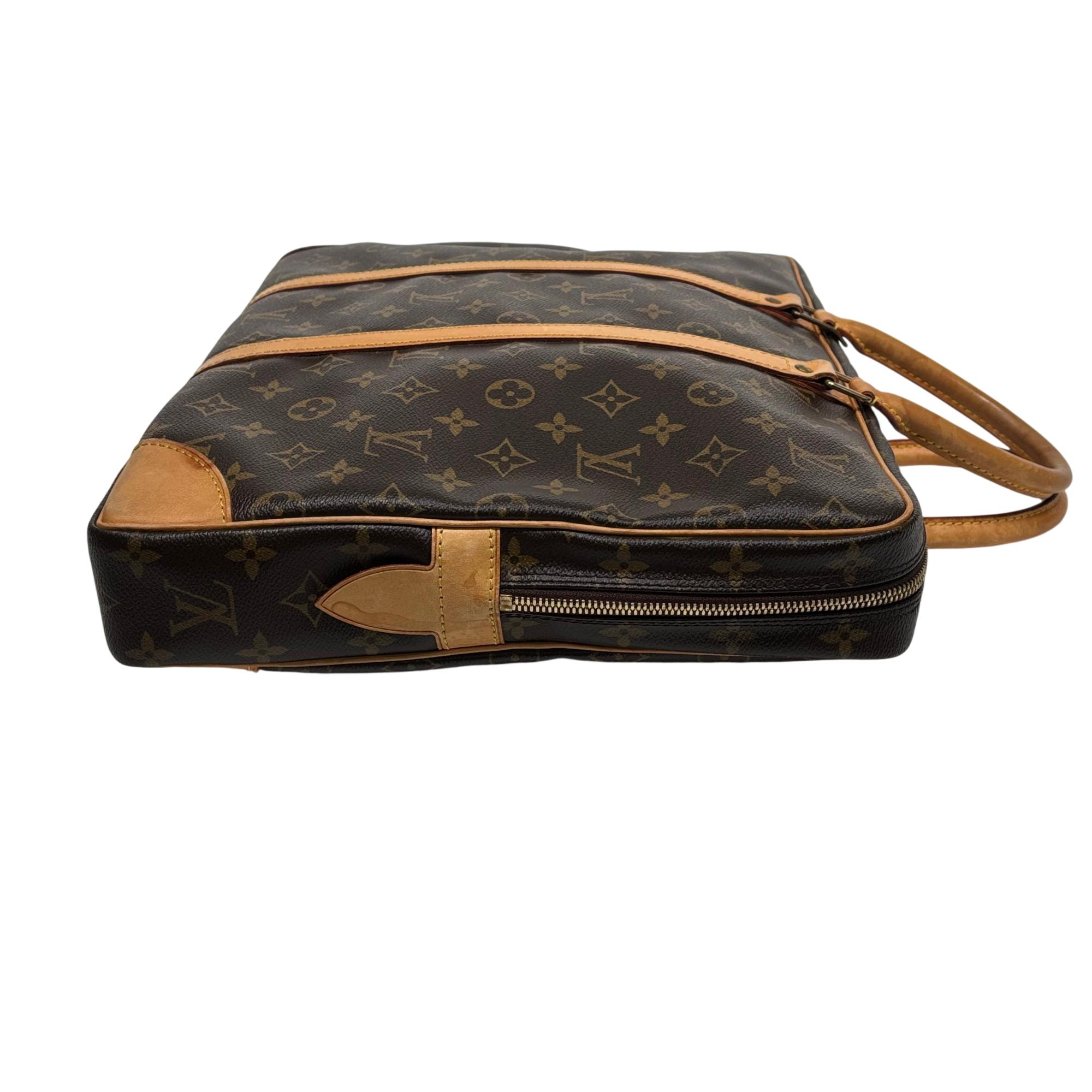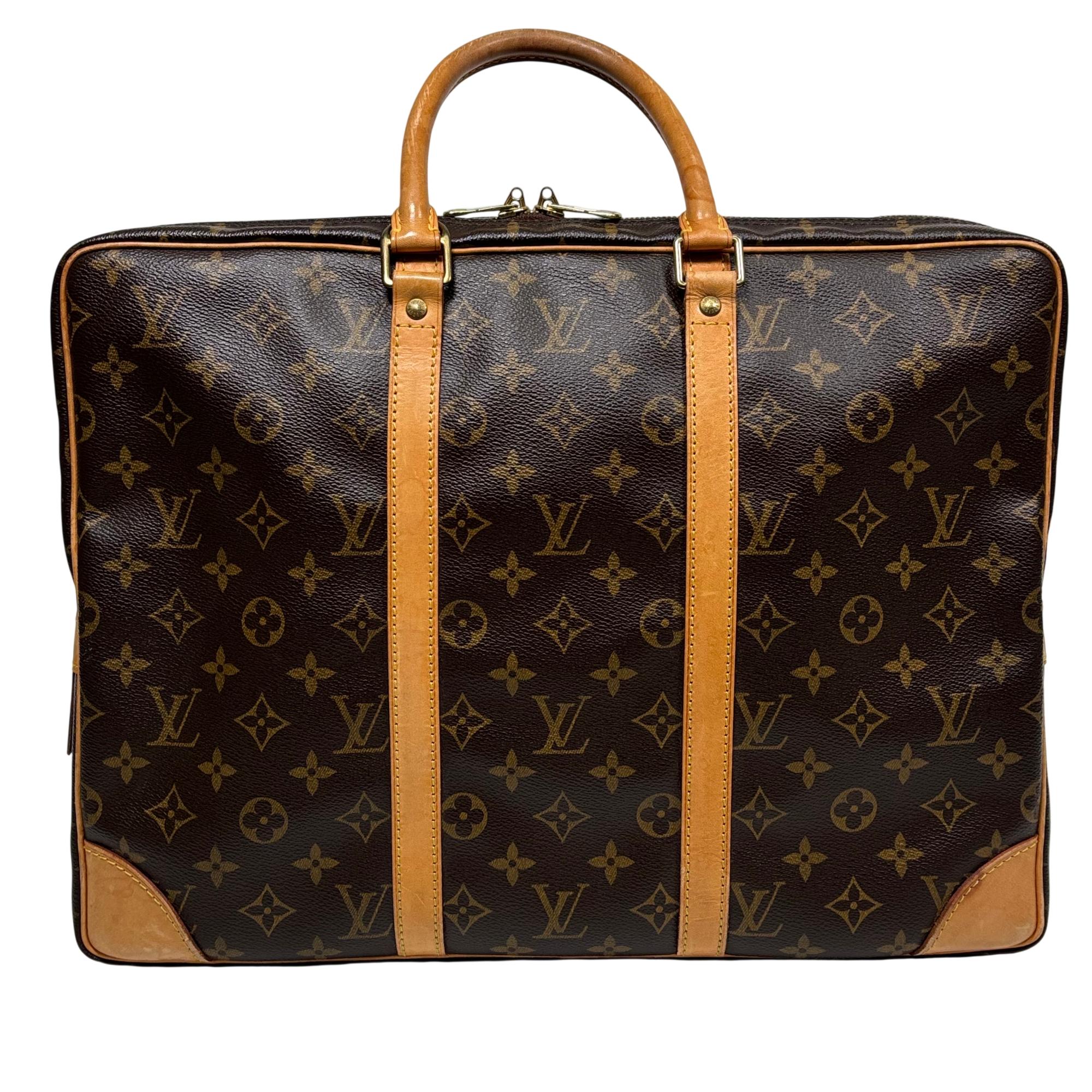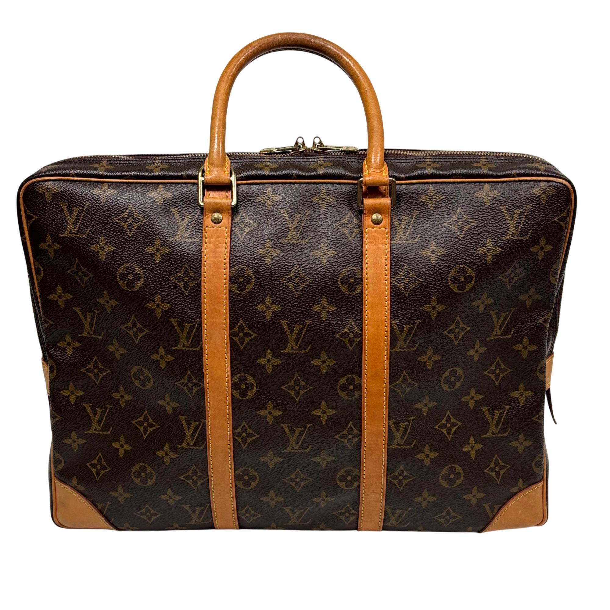 Louis Vuitton Monogram Canvas Porte-Documents Voyage Briefcase features the iconic monogram canvas with signature brown and tan leather accents, combining elegance with practical design. This refined leather briefcase is crafted for both style and functionality, showcasing detailed stitching, sturdy handles, and a classic silhouette ideal for professional use and travel.