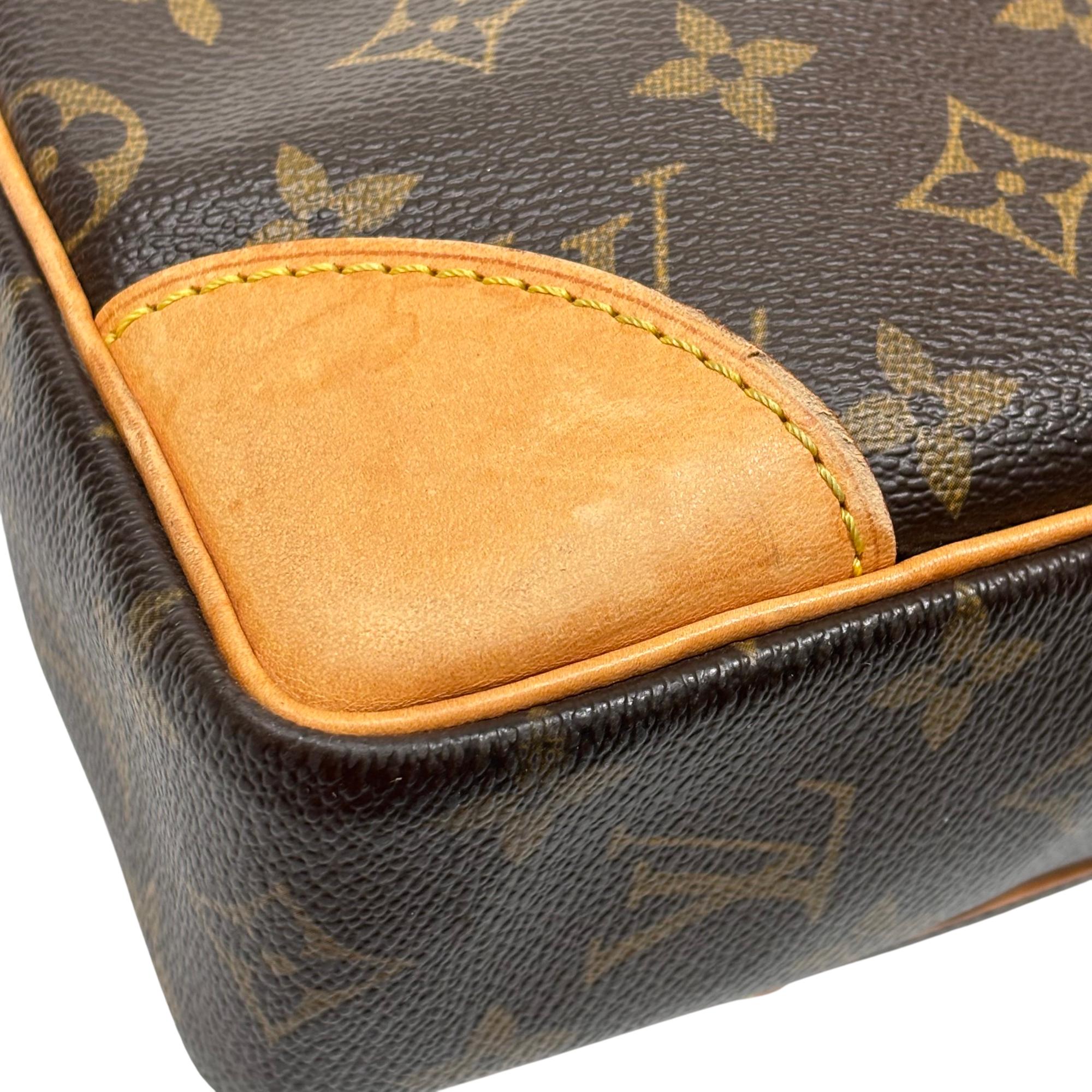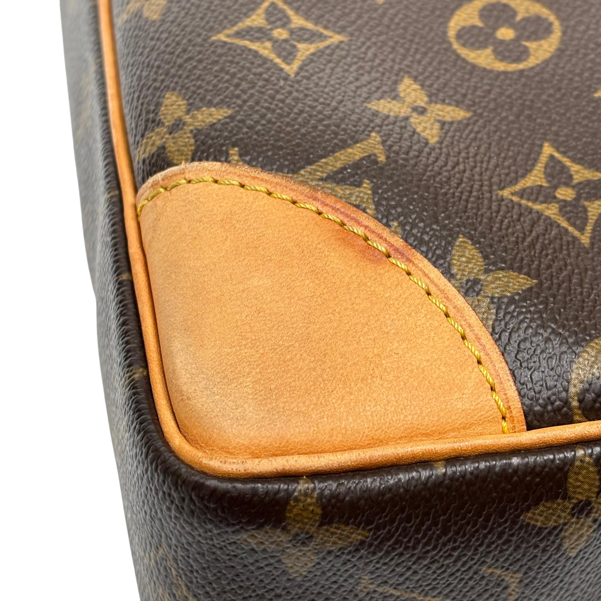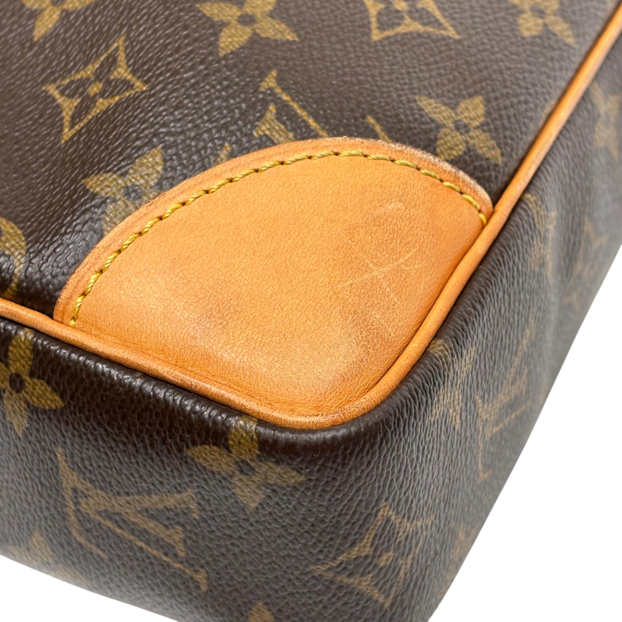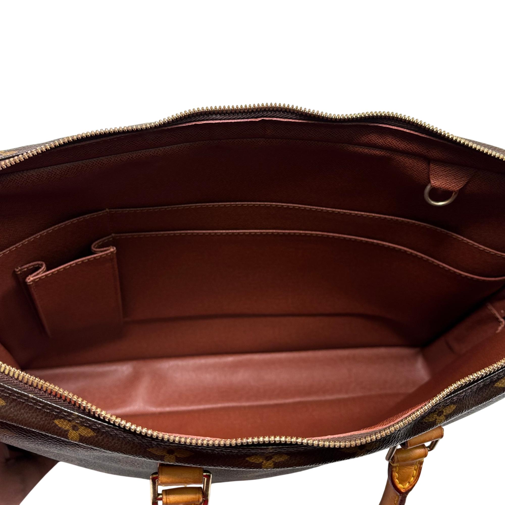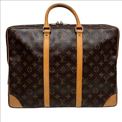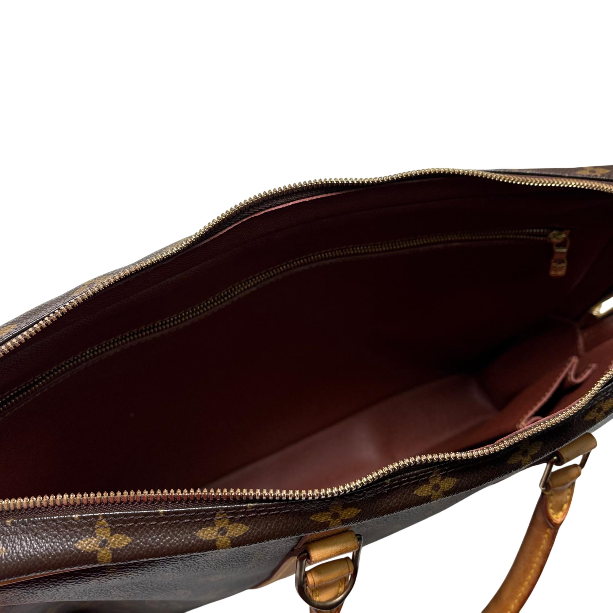 Louis Vuitton Monogram Canvas Porte-Documents Voyage Briefcase features the iconic monogram canvas with signature brown and tan leather accents, combining elegance with practical design. This refined leather briefcase is crafted for both style and functionality, showcasing detailed stitching, sturdy handles, and a classic silhouette ideal for professional use and travel.