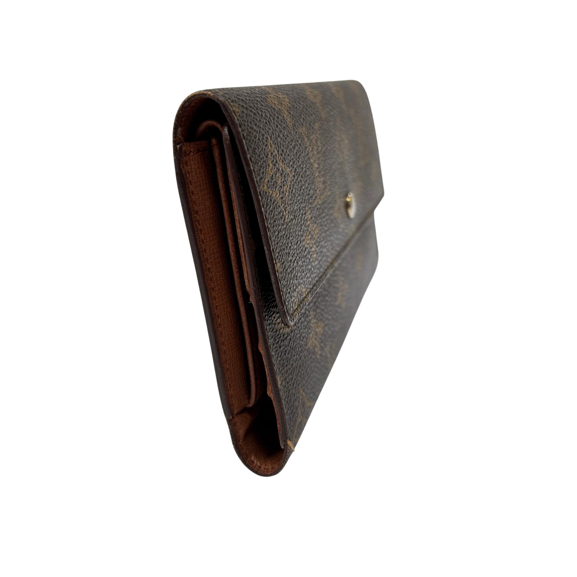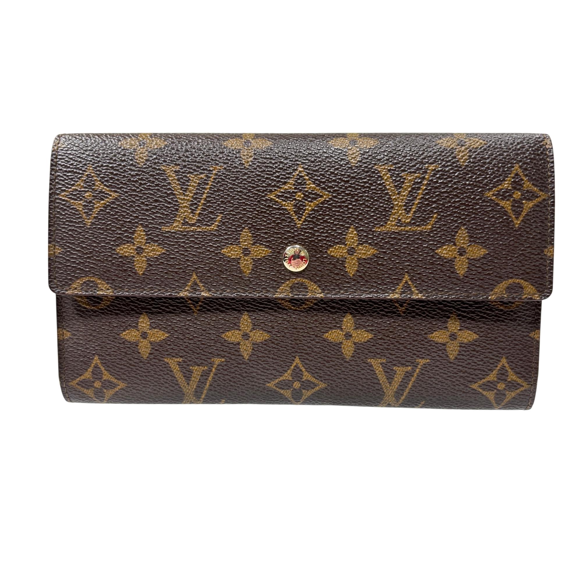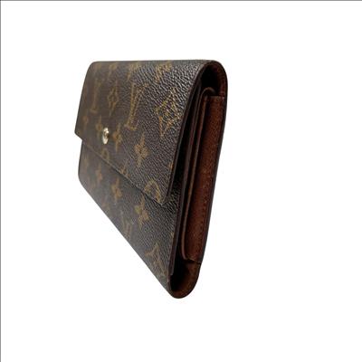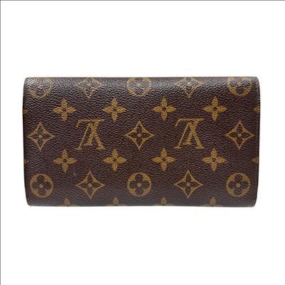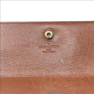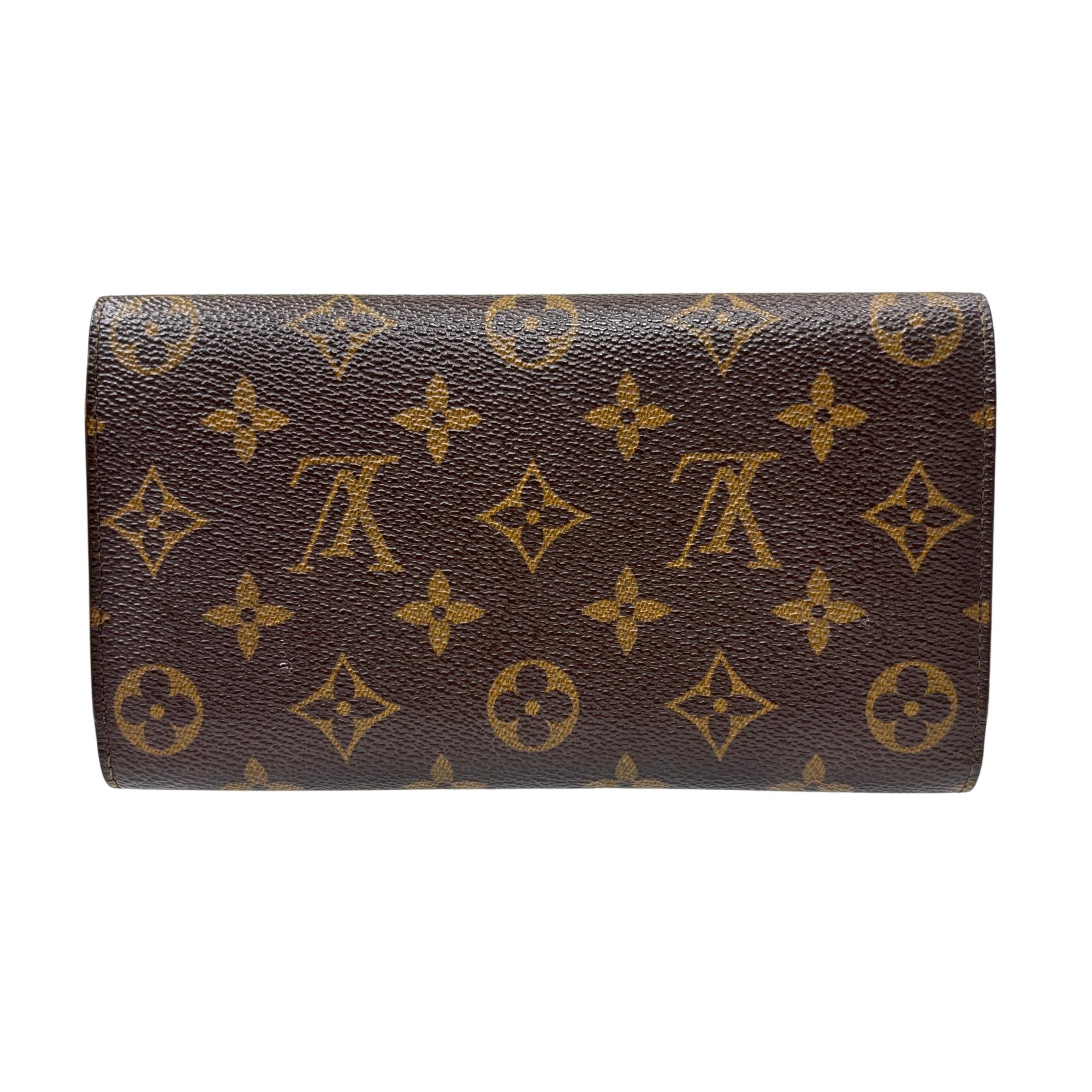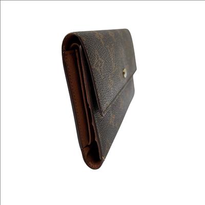 Louis Vuitton Monogram Canvas Sarah Wallet (Portefeuille Sarah) - Brown, Trifold, Gold Button Closure features a classic brown canvas design accented with iconic monogram patterns and a luxurious gold button closure. This trifold wallet offers a sophisticated leather texture with meticulous craftsmanship, providing a stylish and practical accessory for organizing essentials.