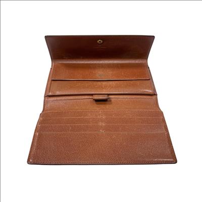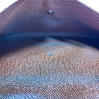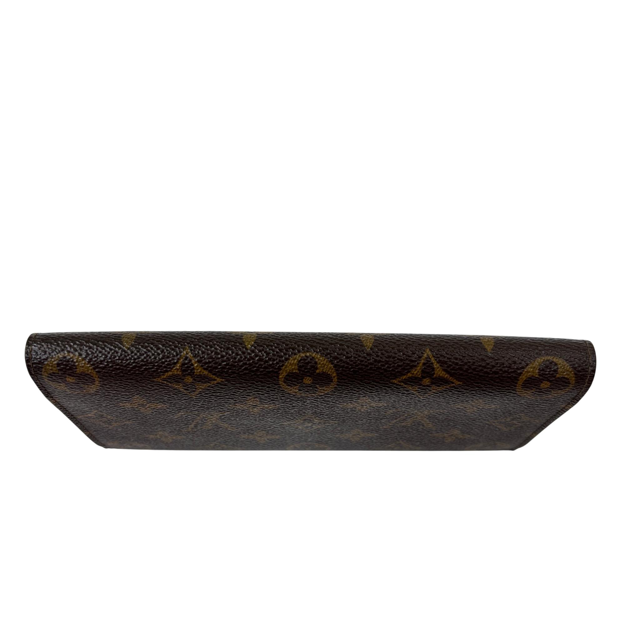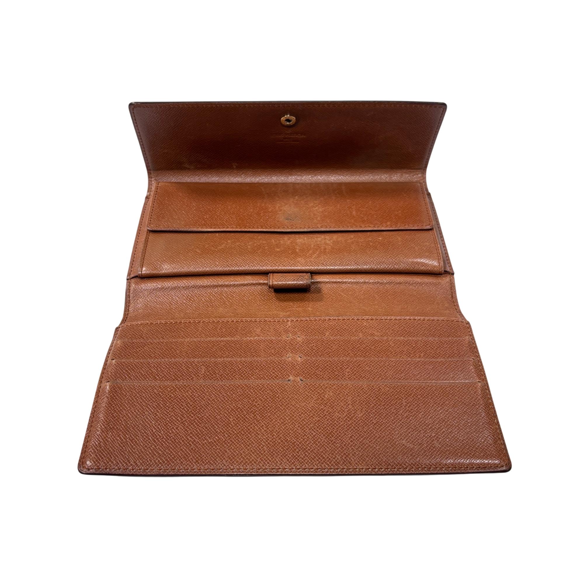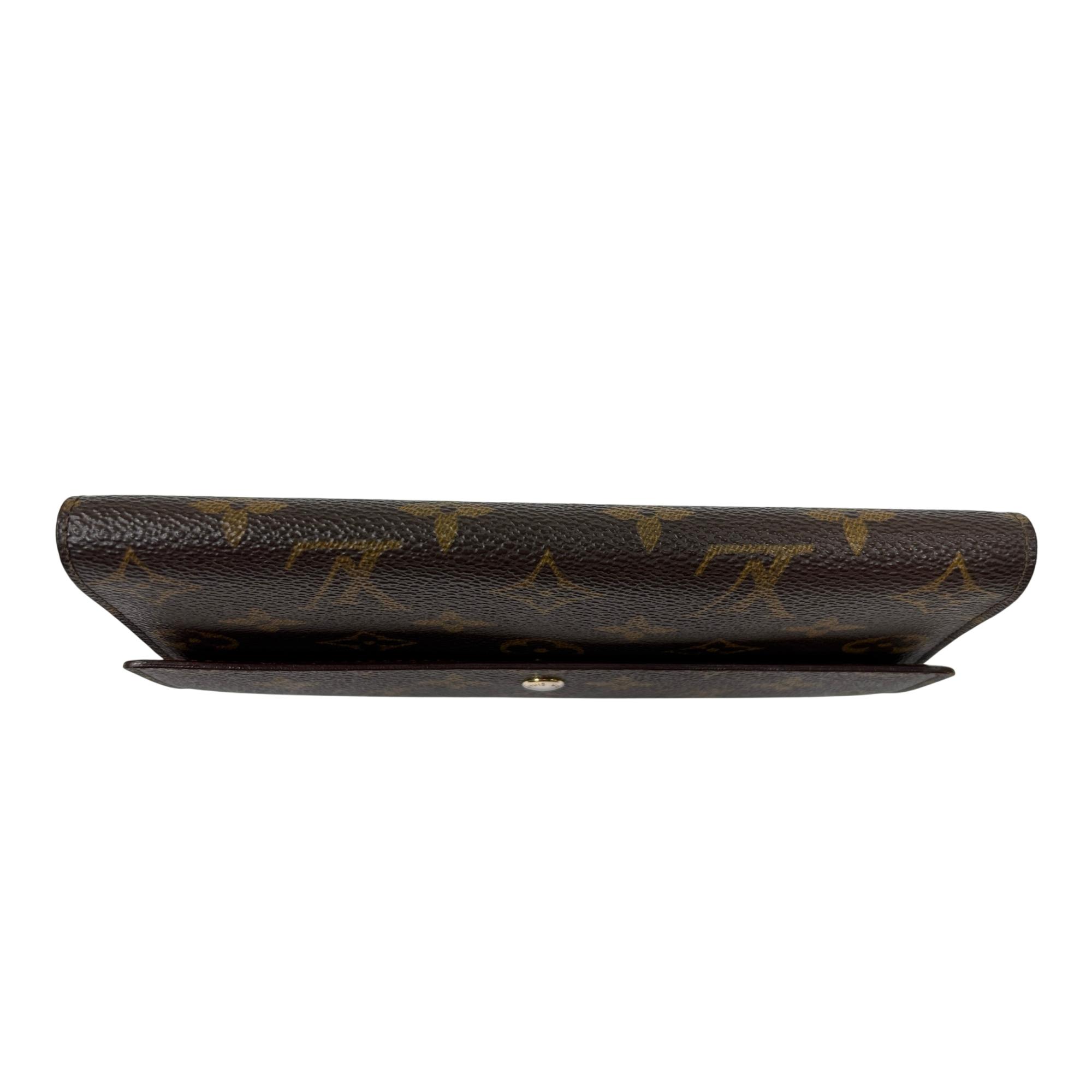 Louis Vuitton Monogram Canvas Sarah Wallet (Portefeuille Sarah) - Brown, Trifold, Gold Button Closure features a classic brown canvas design accented with iconic monogram patterns and a luxurious gold button closure. This trifold wallet offers a sophisticated leather texture with meticulous craftsmanship, providing a stylish and practical accessory for organizing essentials.