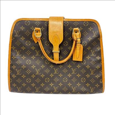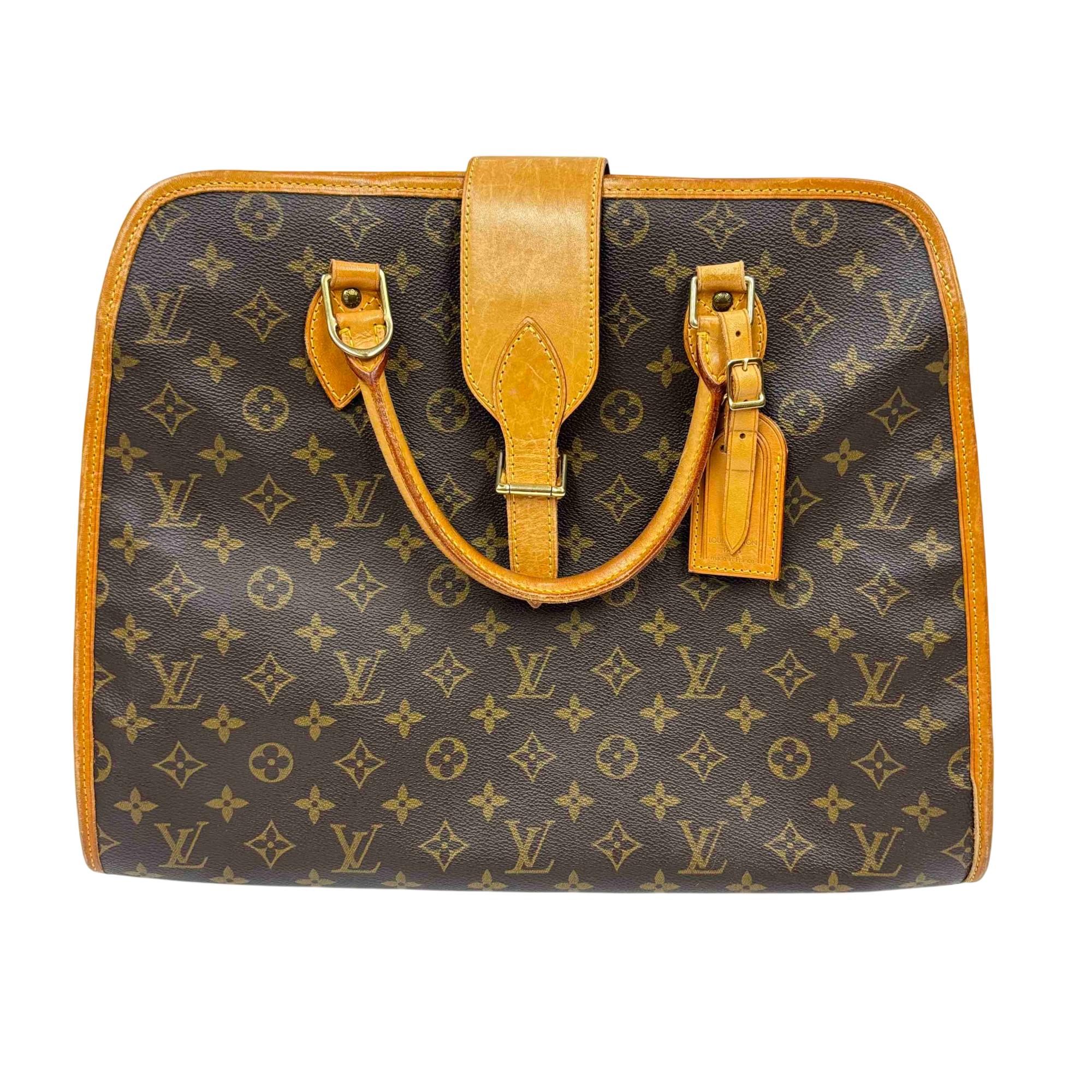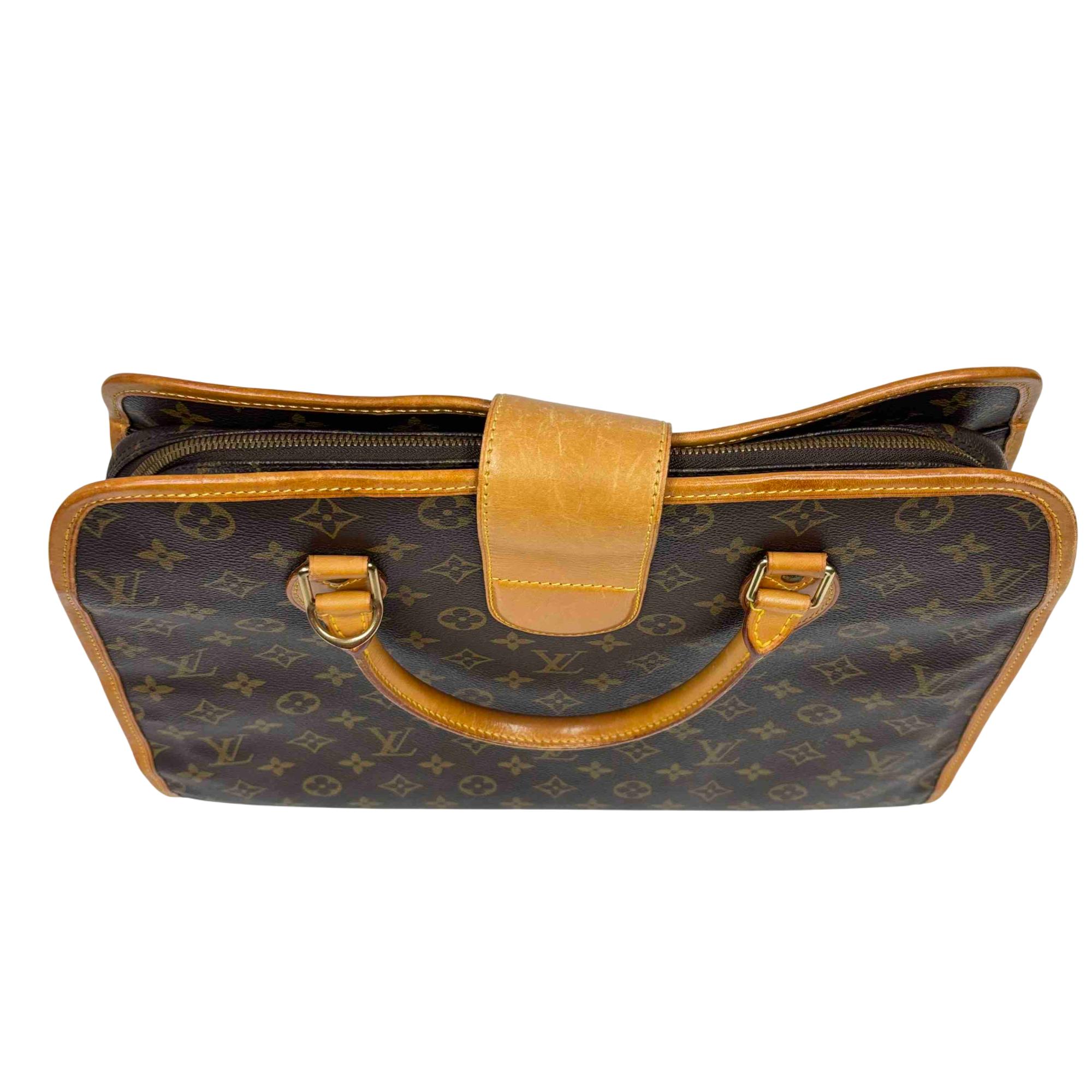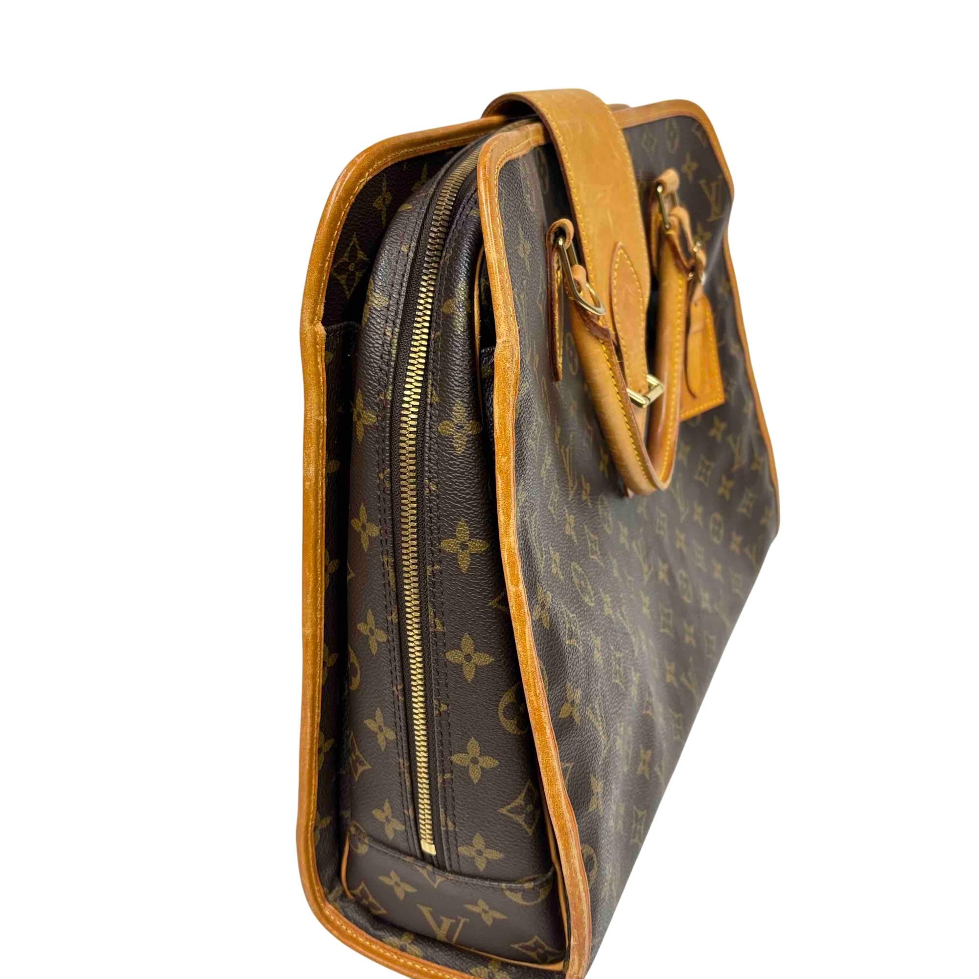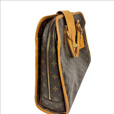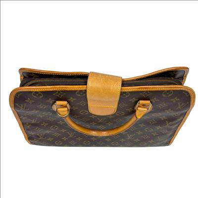 The Louis Vuitton Monogram Rivoli Briefcase Handbag is crafted from signature monogram canvas with natural leather trim, featuring a spacious interior designed to accommodate business essentials. This elegant and functional briefcase includes secure zipper closures and an adjustable leather shoulder strap, combining classic style with practical design for professional use.
