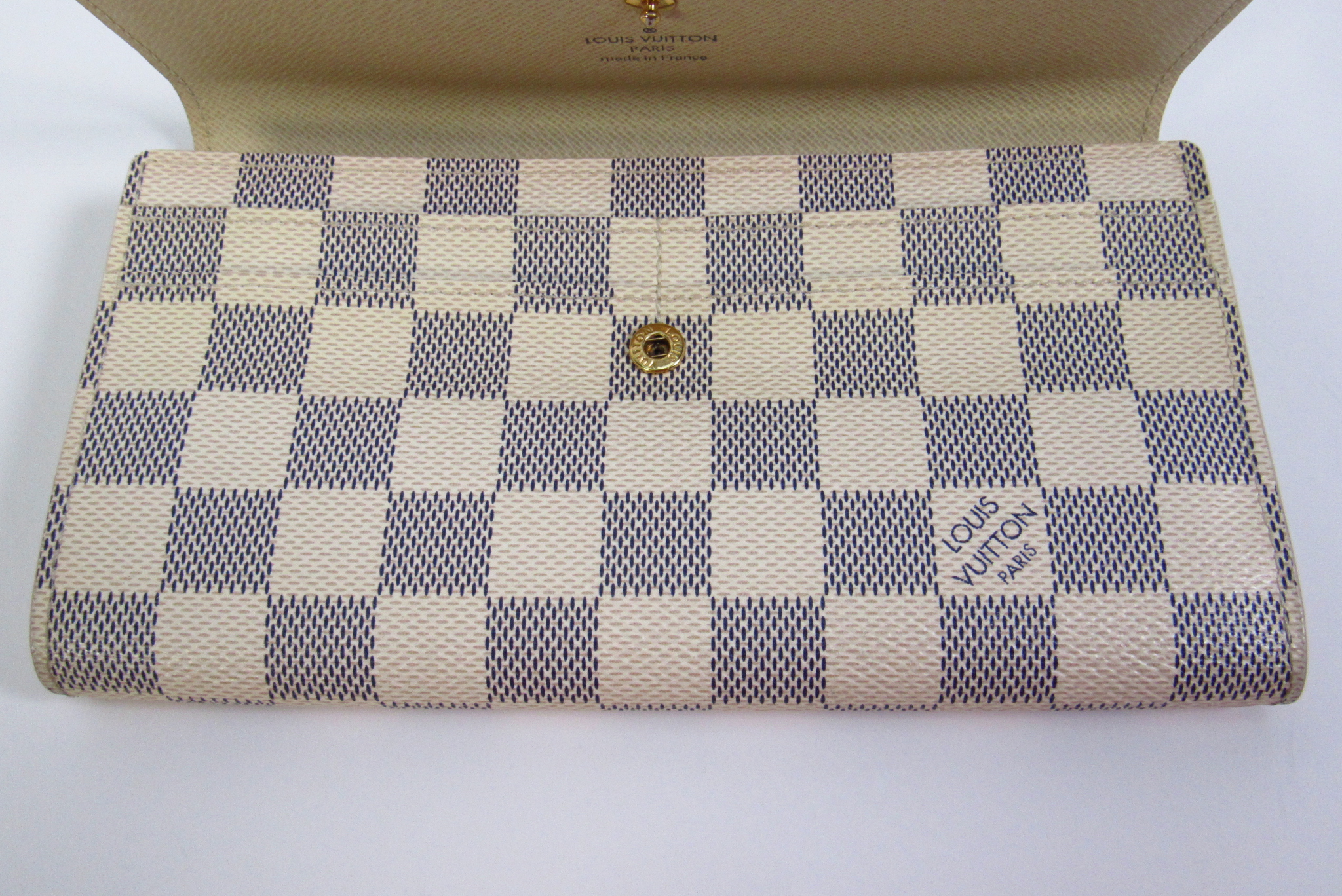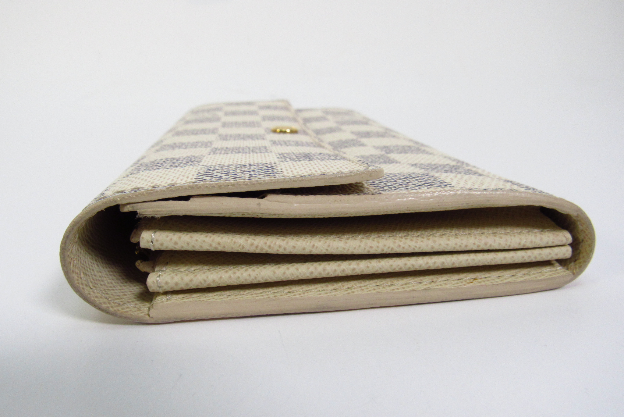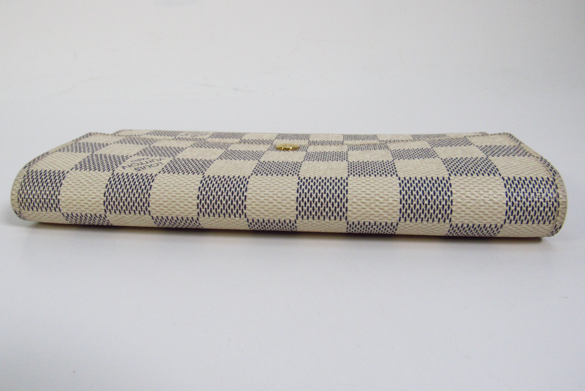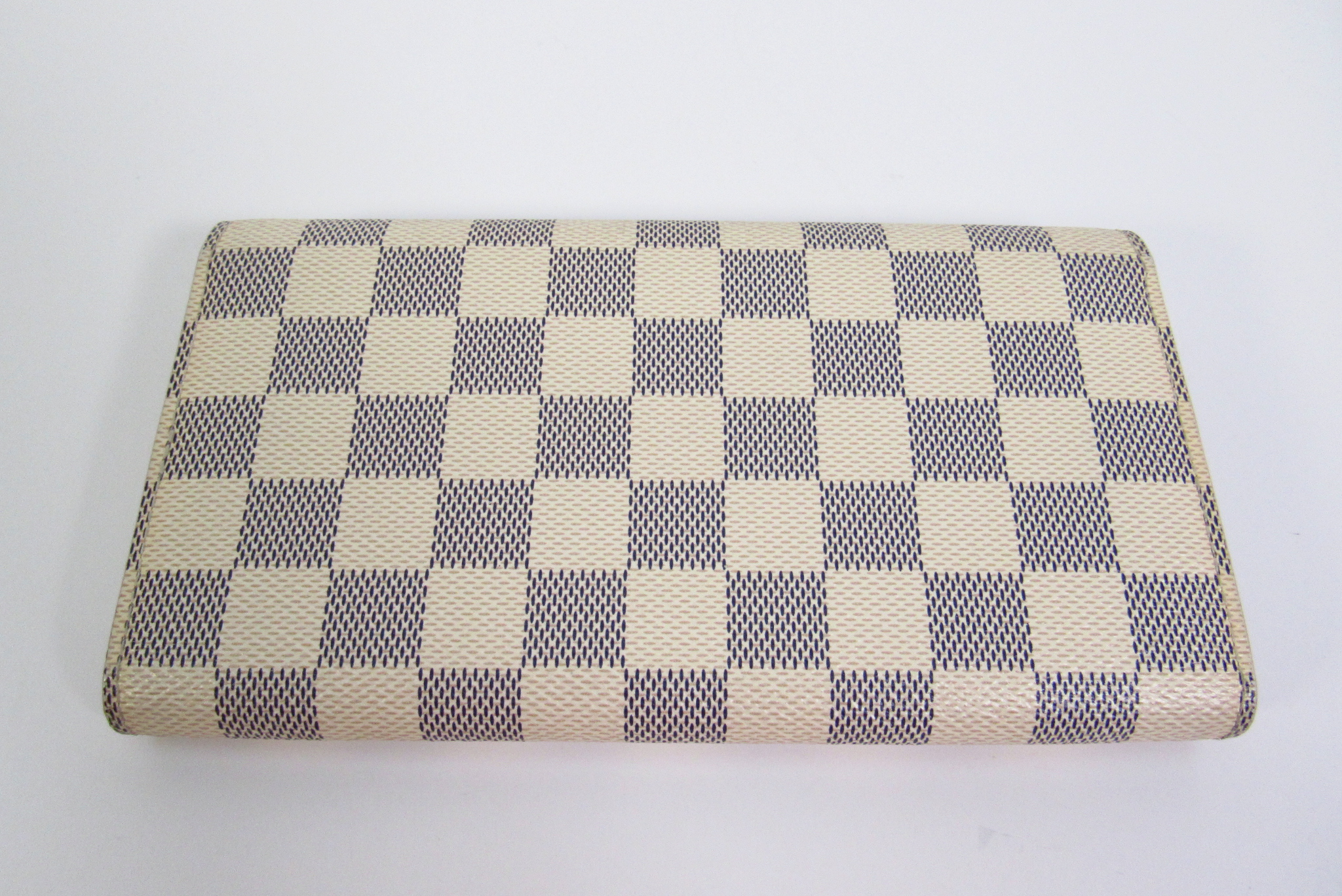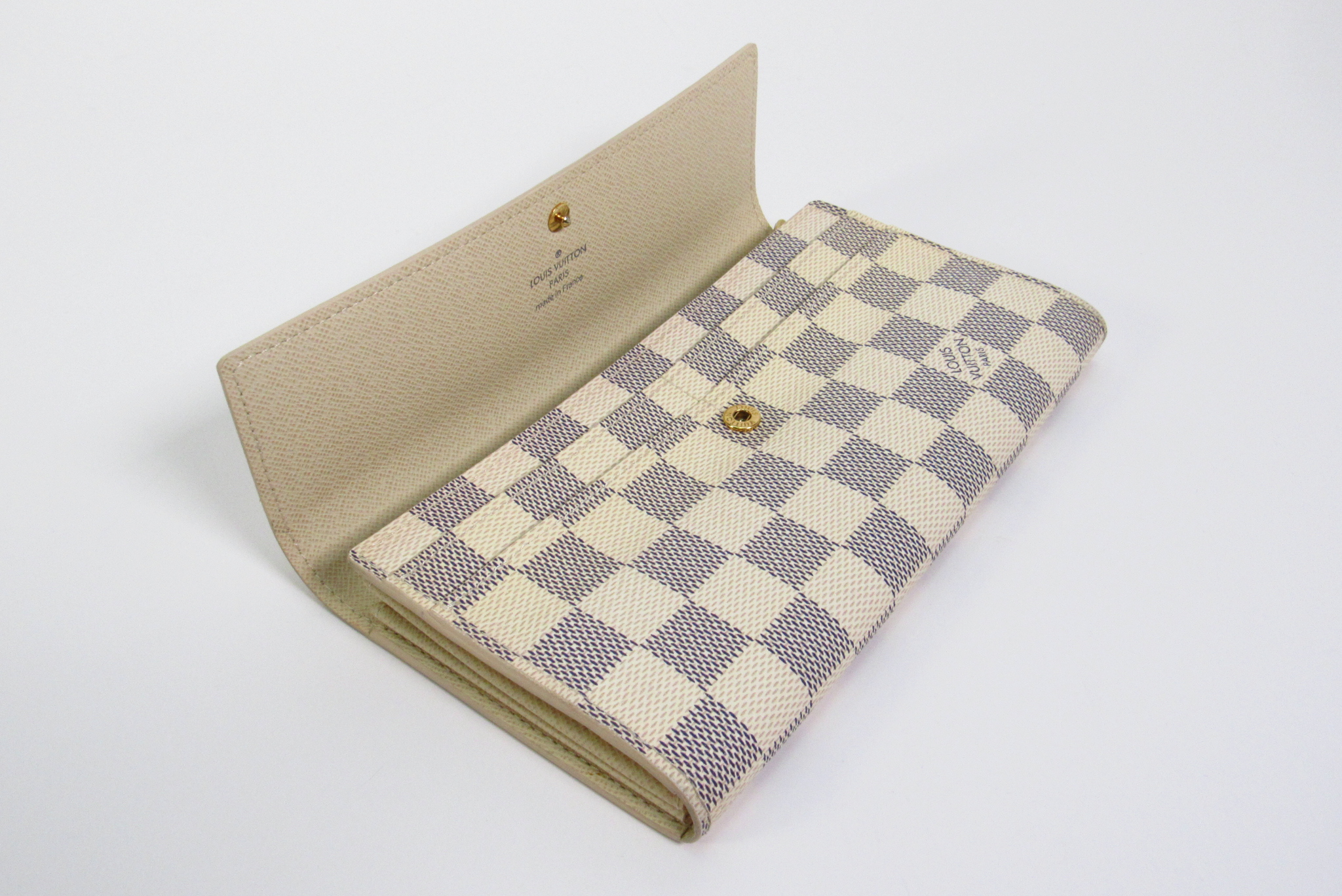 Damier Azur canvas brings a fresh look to Louis Vuitton's Sarah wallet, a timeless model with a simple, elegant exterior and a well-organized interior. Its envelope-style flap, which is secured with a gold-tone press-stud, opens to reveal two large compartments, multiple card slots and a zipped coin pocket.