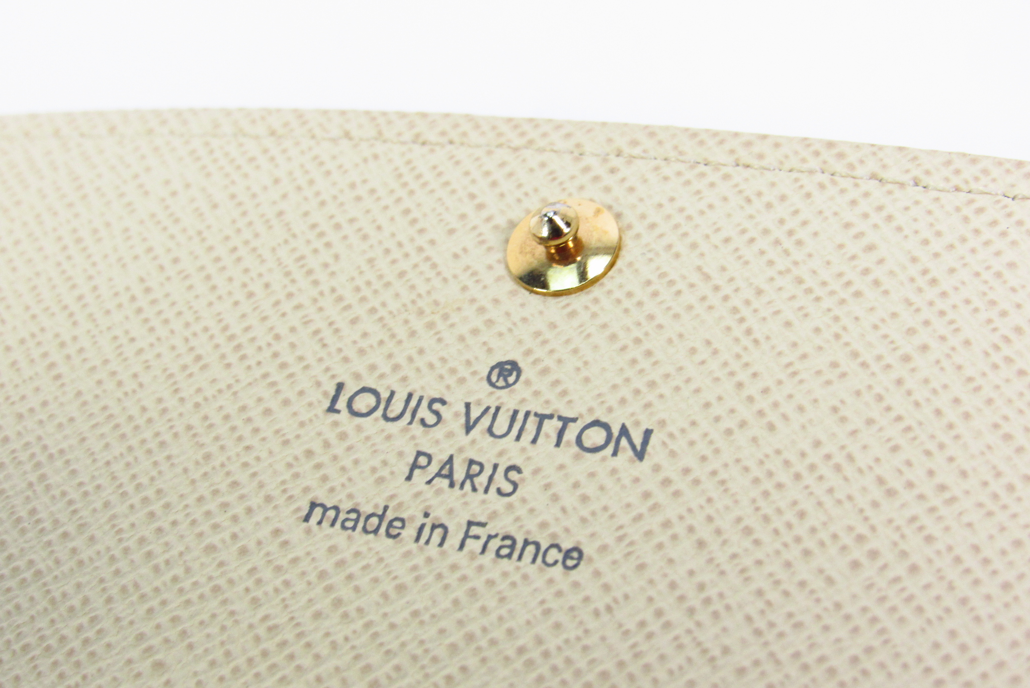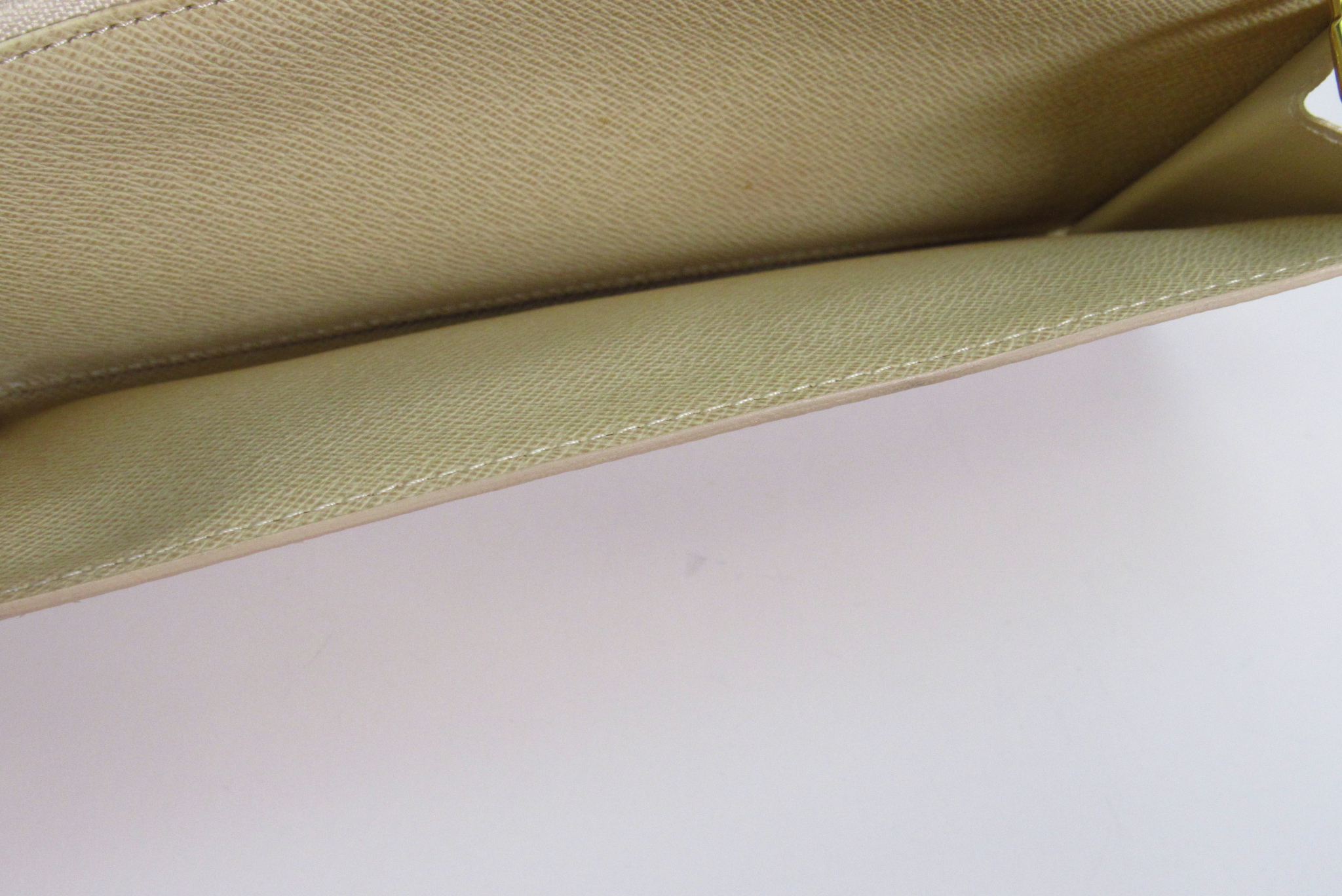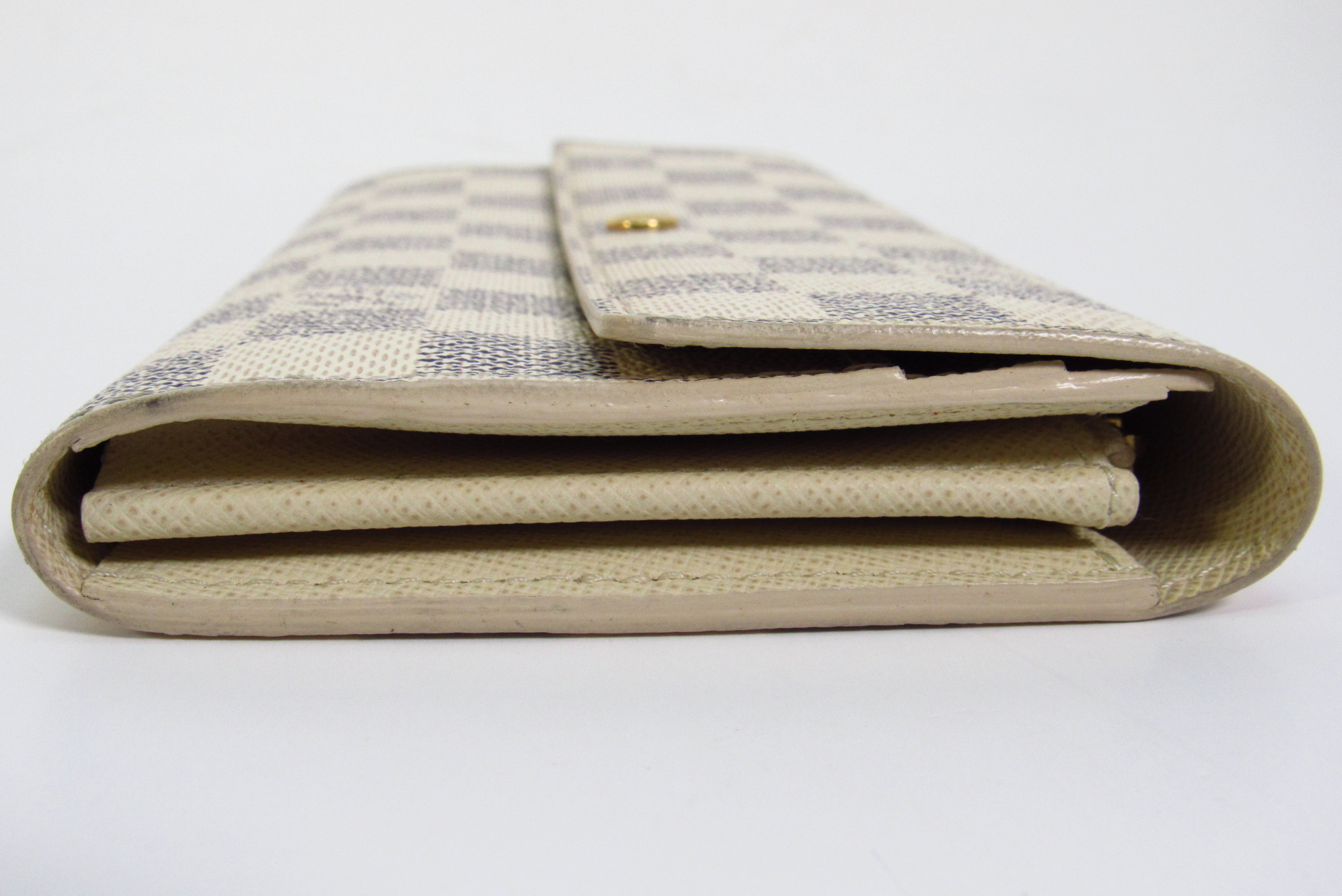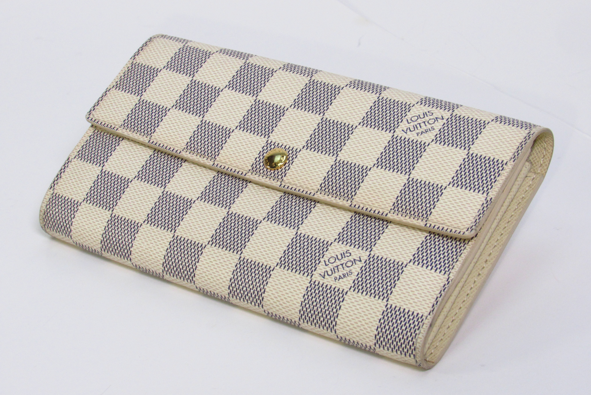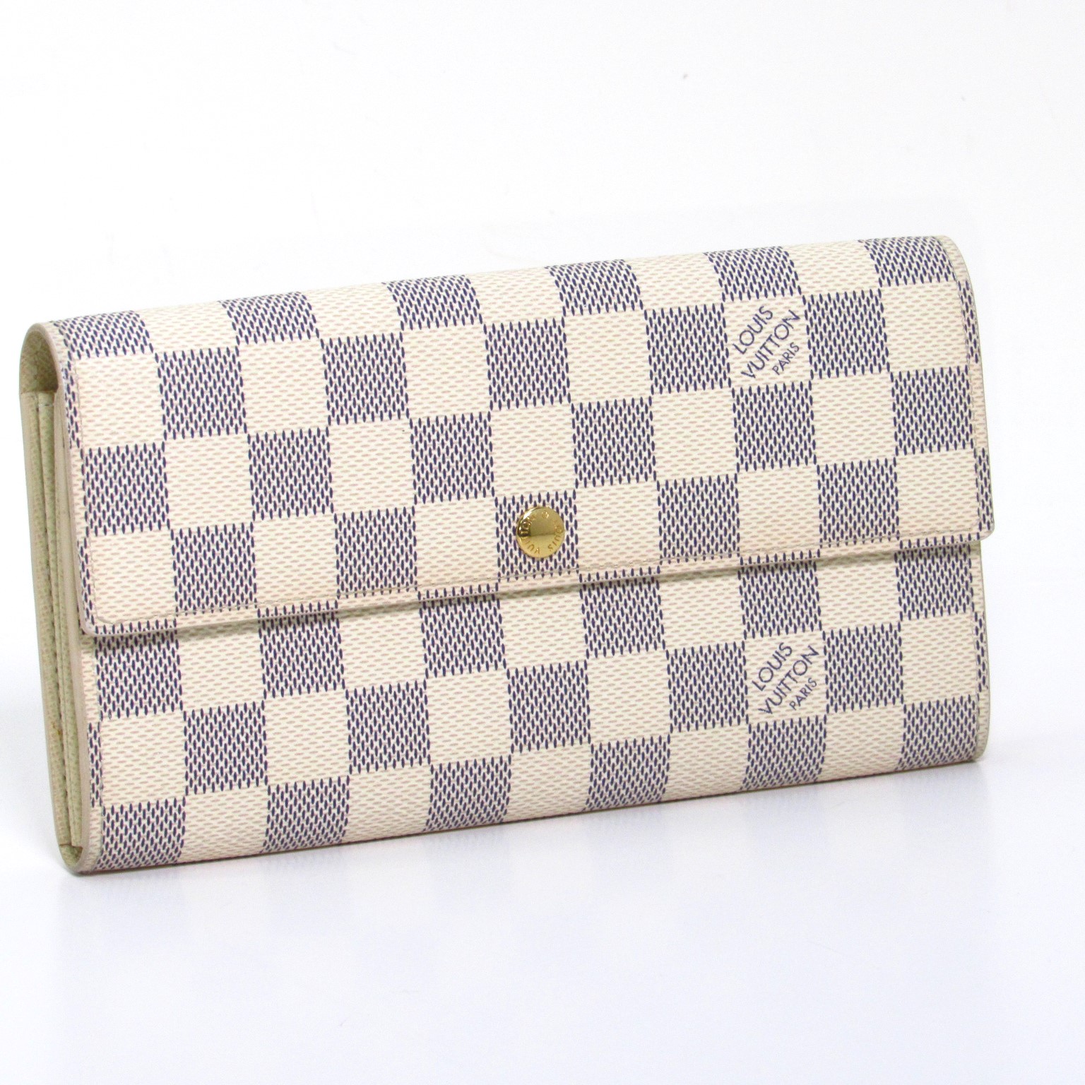 Damier Azur canvas brings a fresh look to Louis Vuitton's Sarah wallet, a timeless model with a simple, elegant exterior and a well-organized interior. Its envelope-style flap, which is secured with a gold-tone press-stud, opens to reveal two large compartments, multiple card slots and a zipped coin pocket.