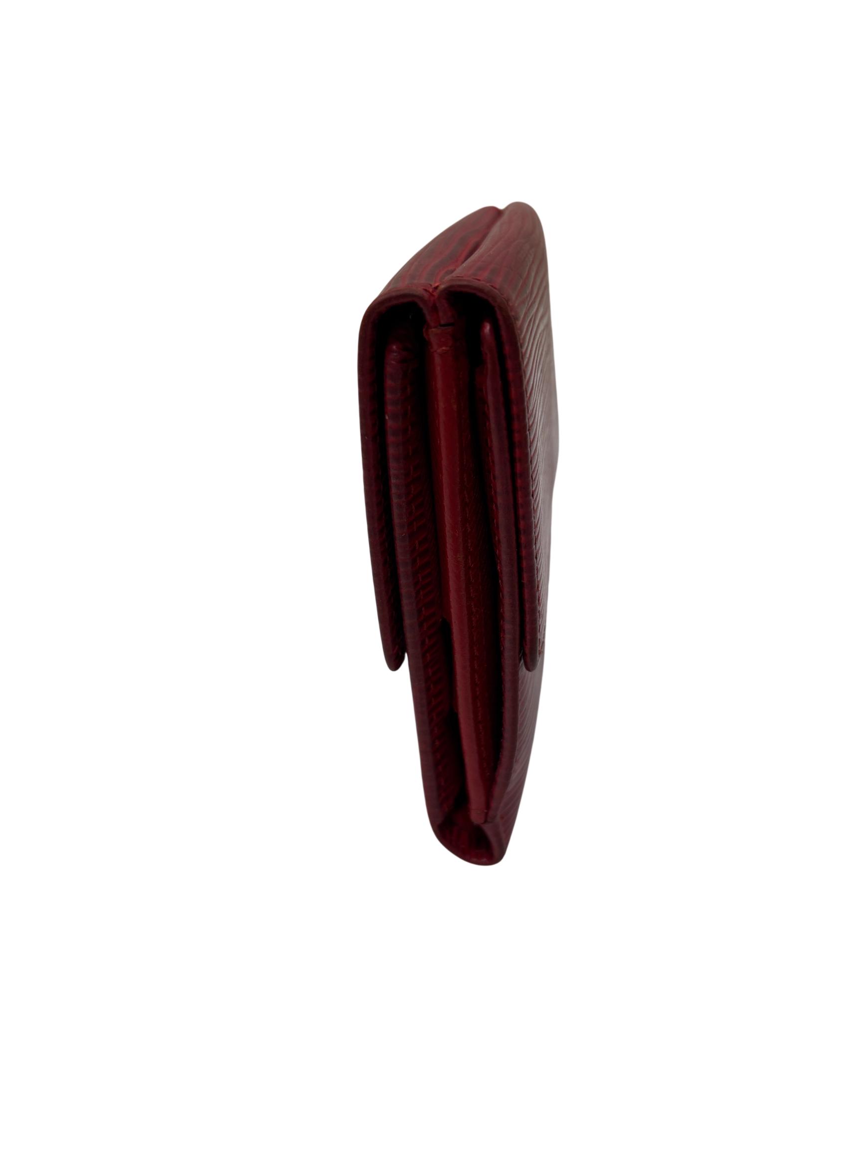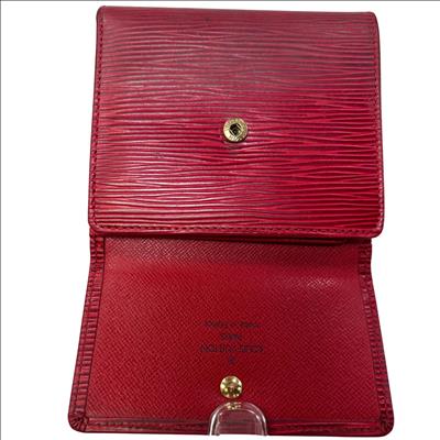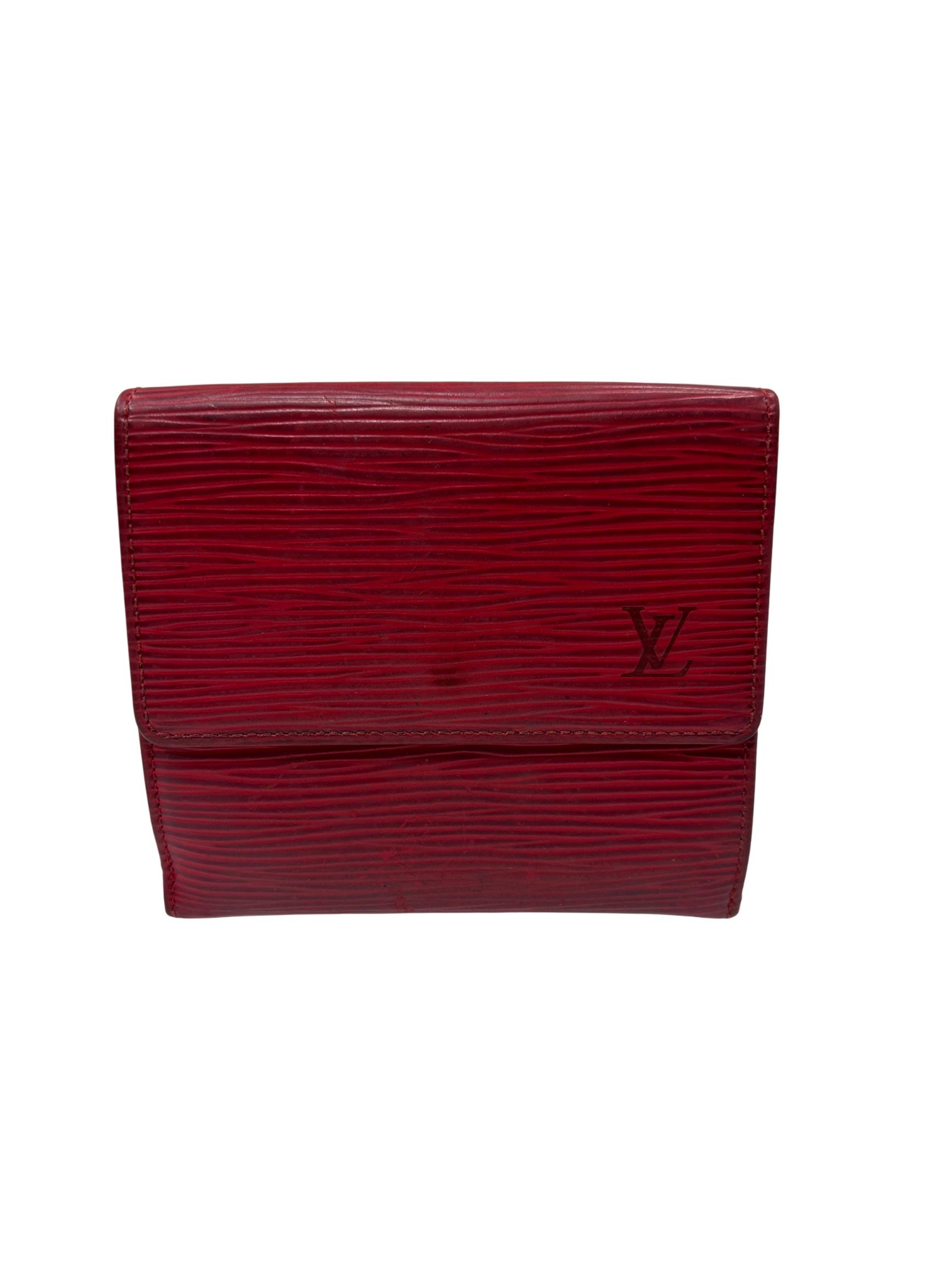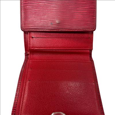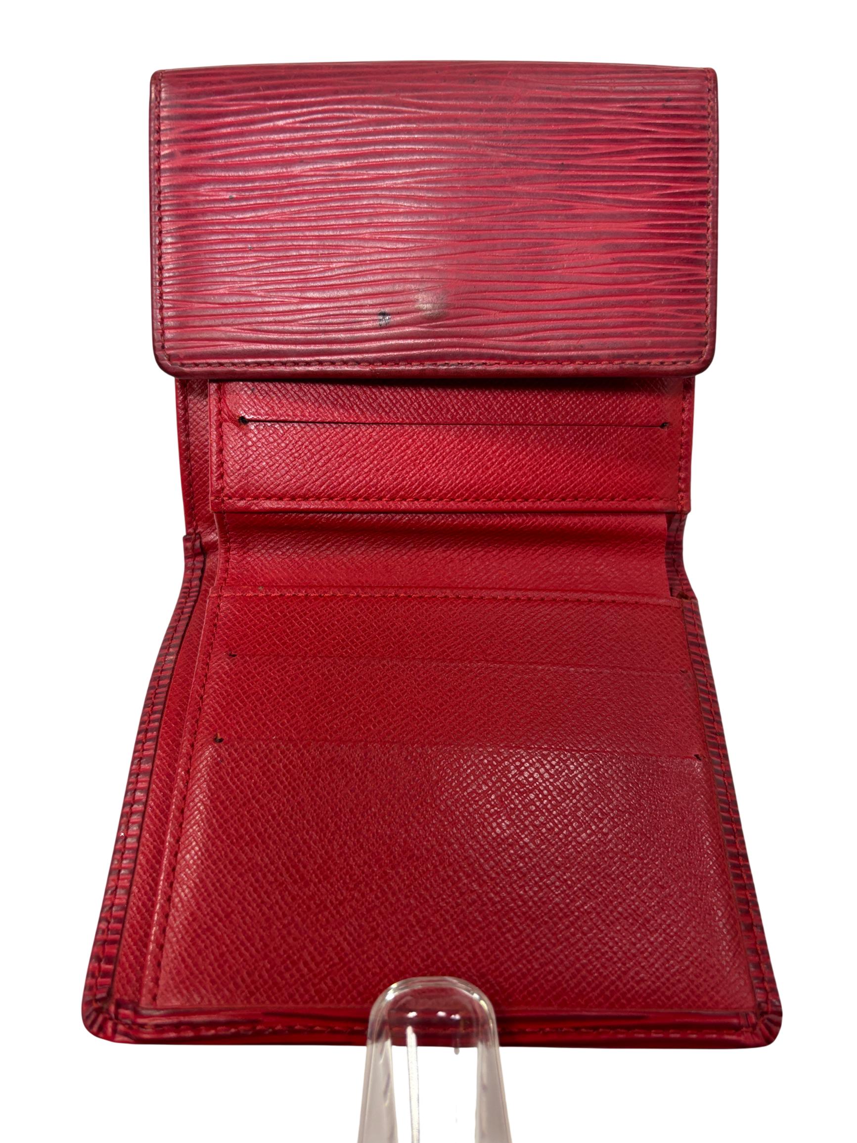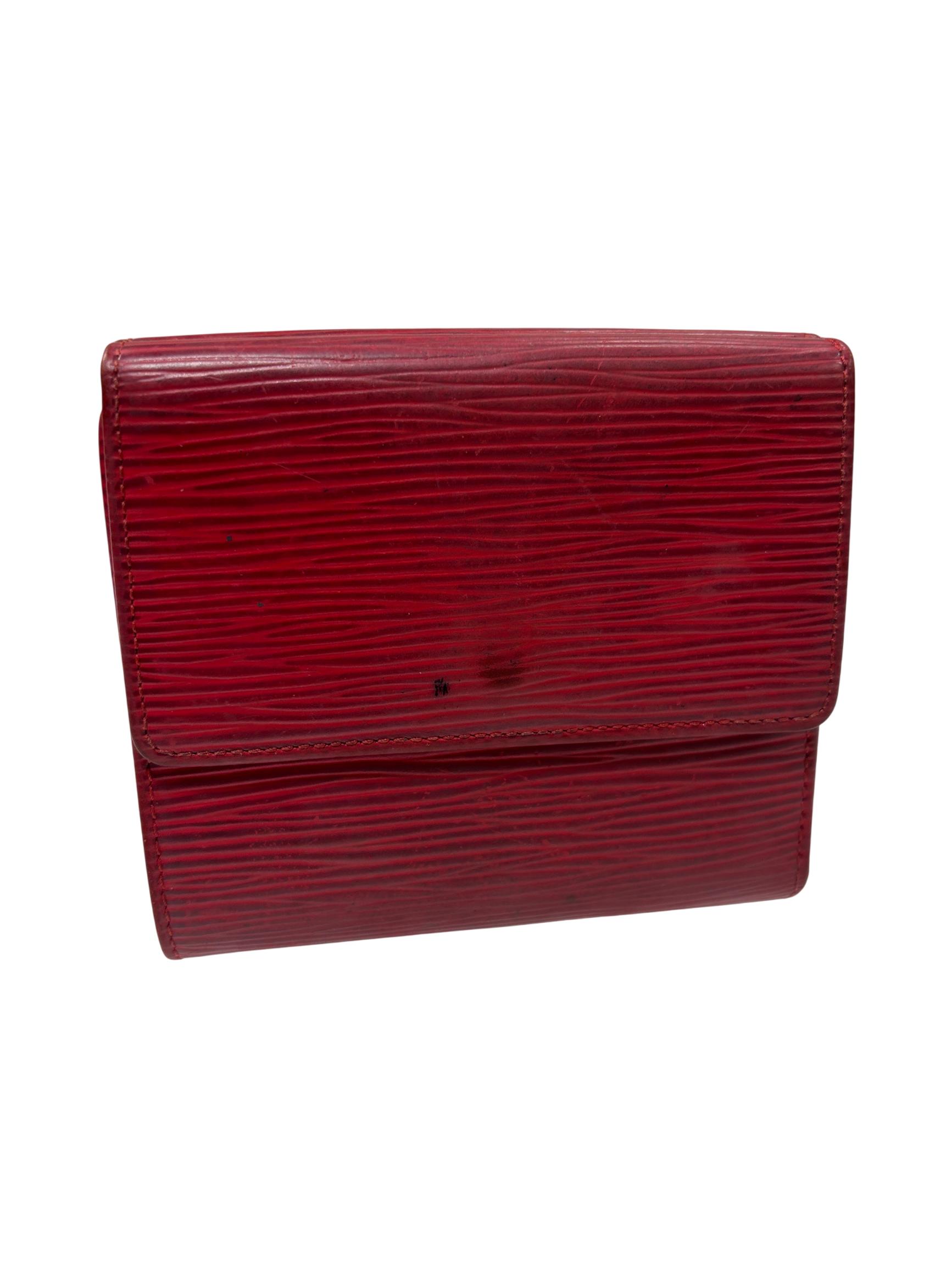 Louis Vuitton Red Epi Leather Trifold Wallet features a vibrant red color crafted from durable Epi leather known for its distinctive textured pattern and resilience. This elegant wallet offers a compact design combining style and practicality, making it an ideal accessory for organizing essentials while enhancing a sophisticated look.