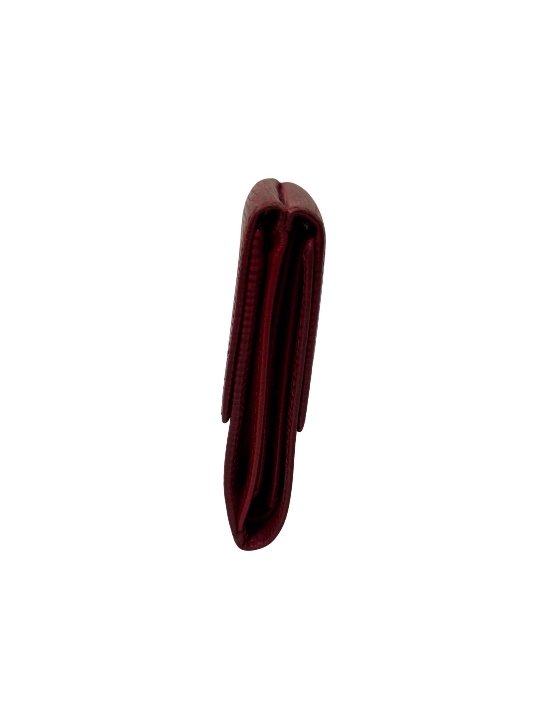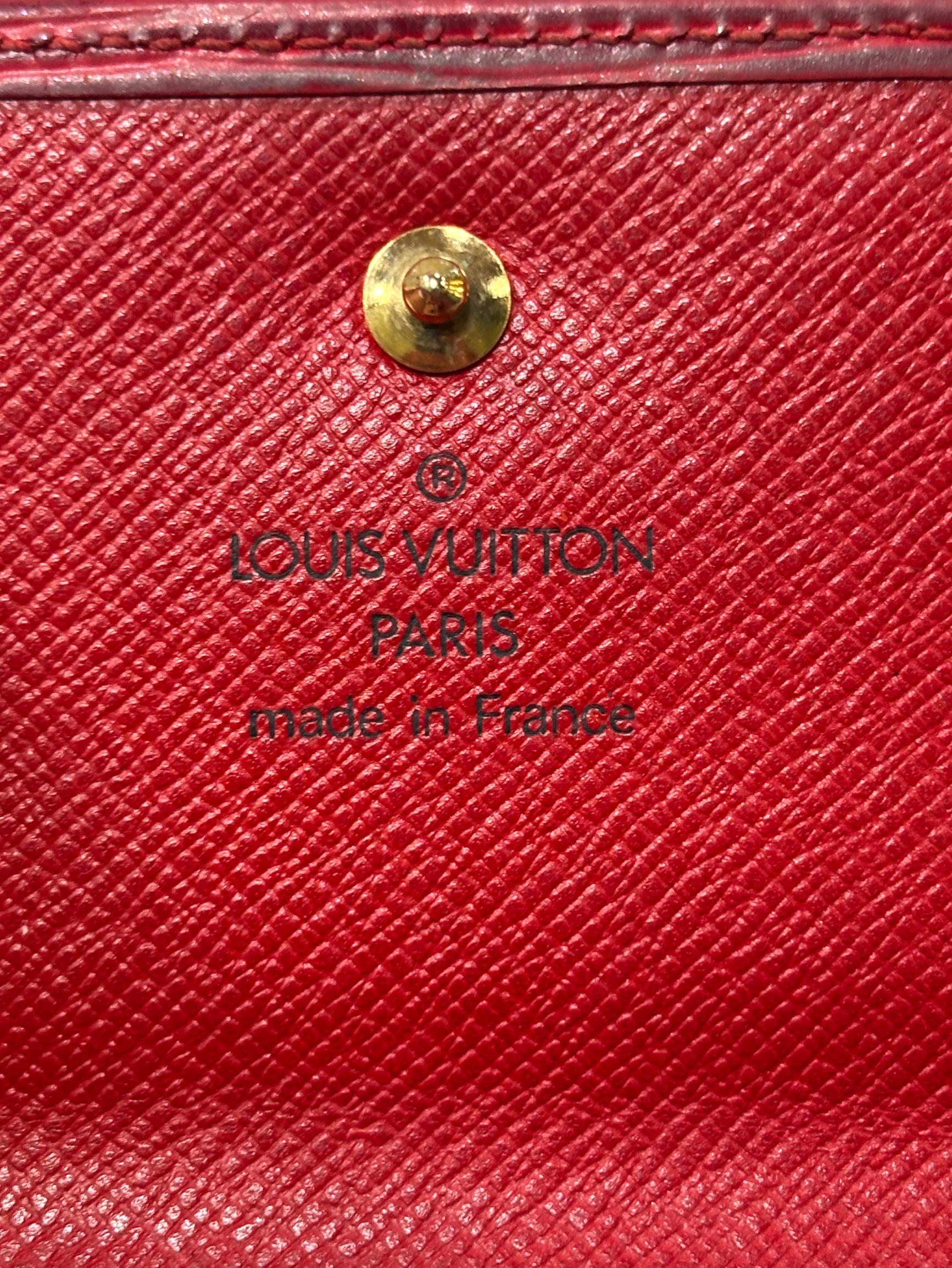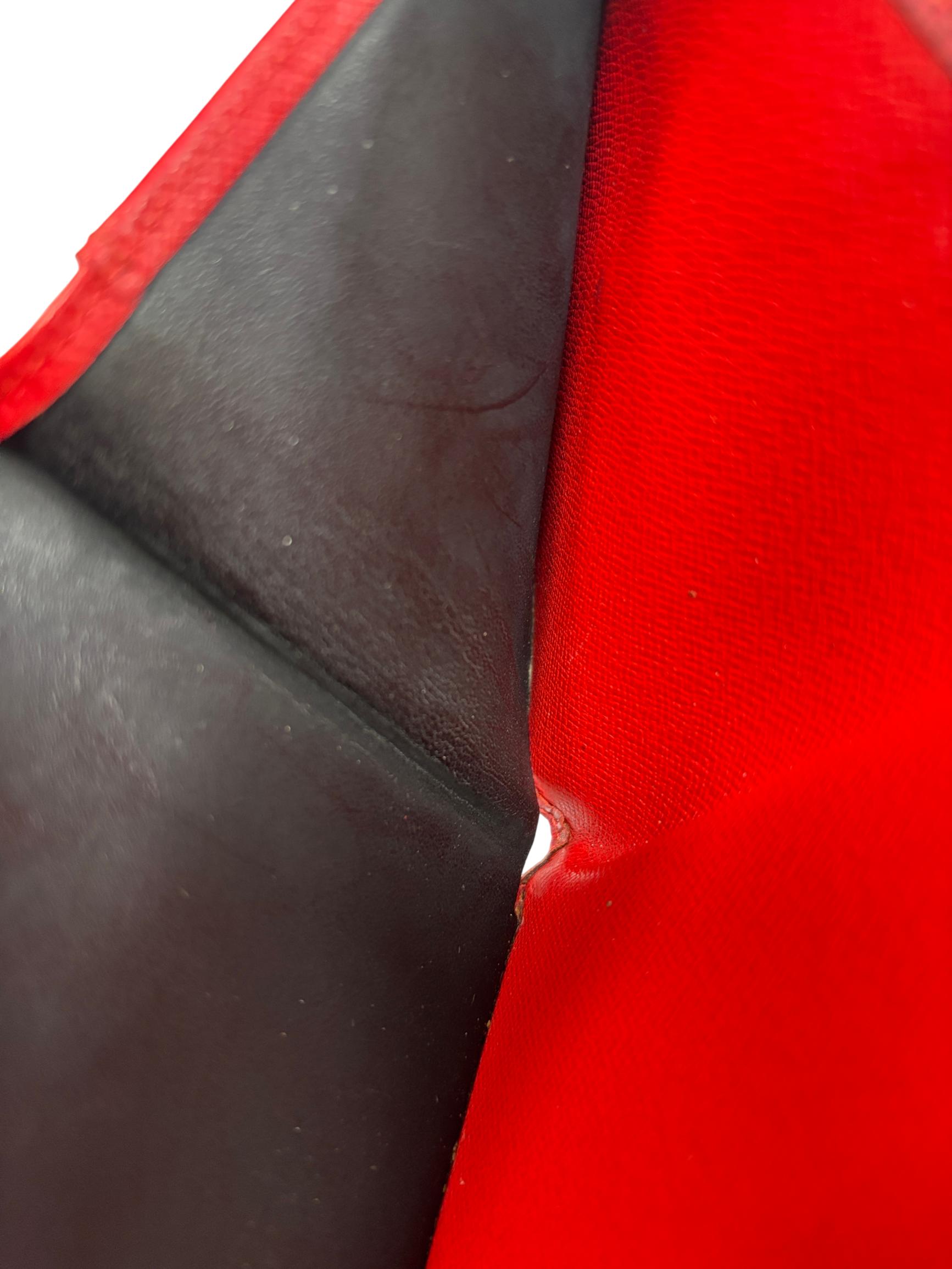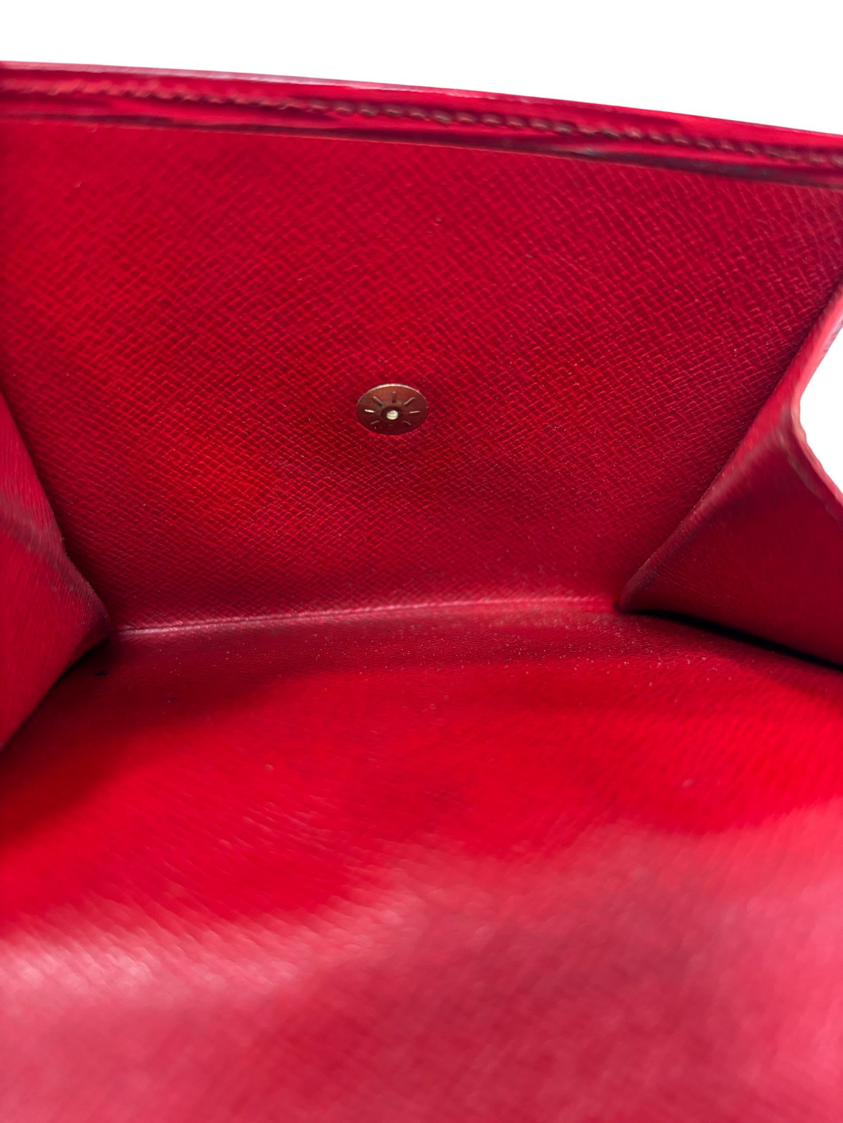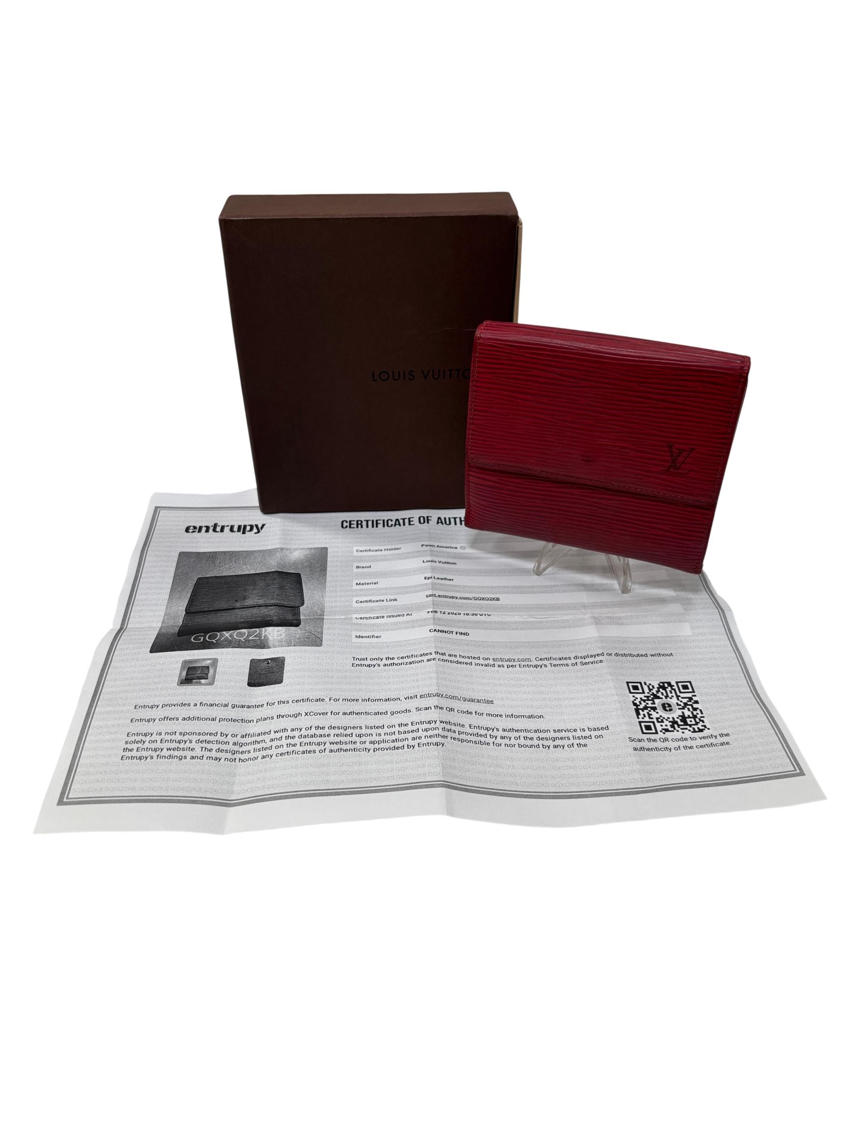 Louis Vuitton Red Epi Leather Trifold Wallet features a vibrant red color crafted from durable Epi leather known for its distinctive textured pattern and resilience. This elegant wallet offers a compact design combining style and practicality, making it an ideal accessory for organizing essentials while enhancing a sophisticated look.
