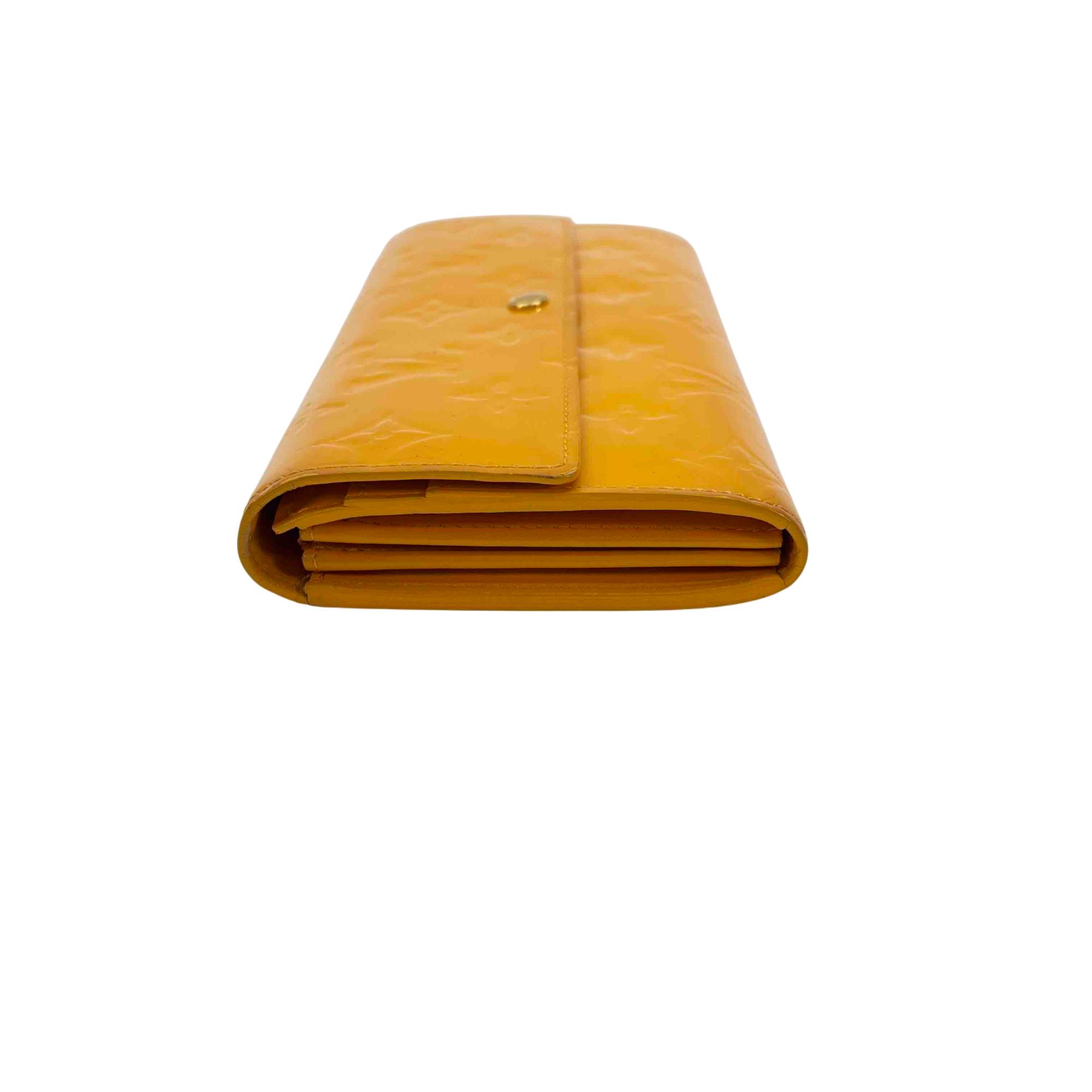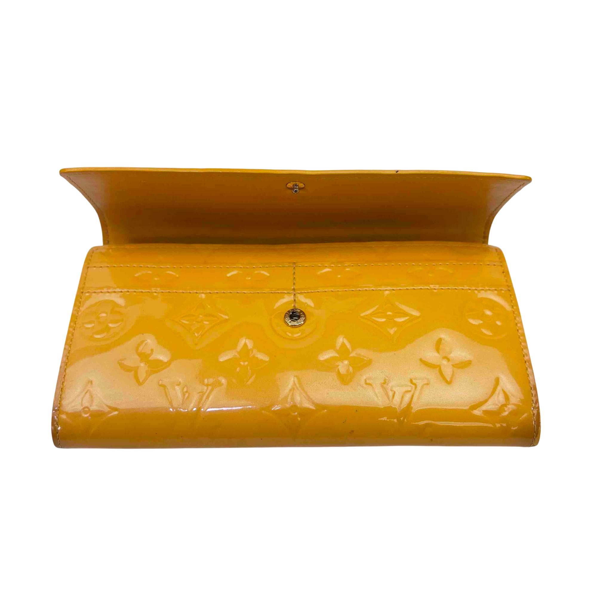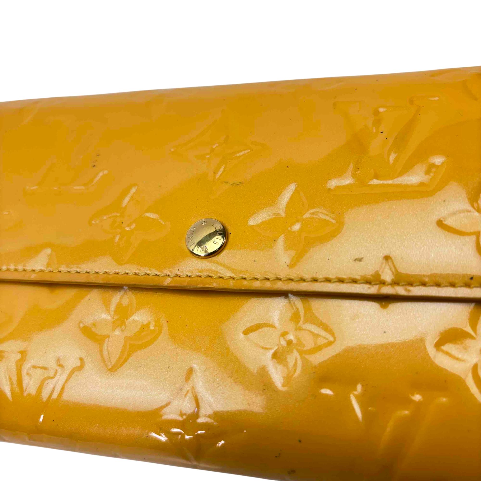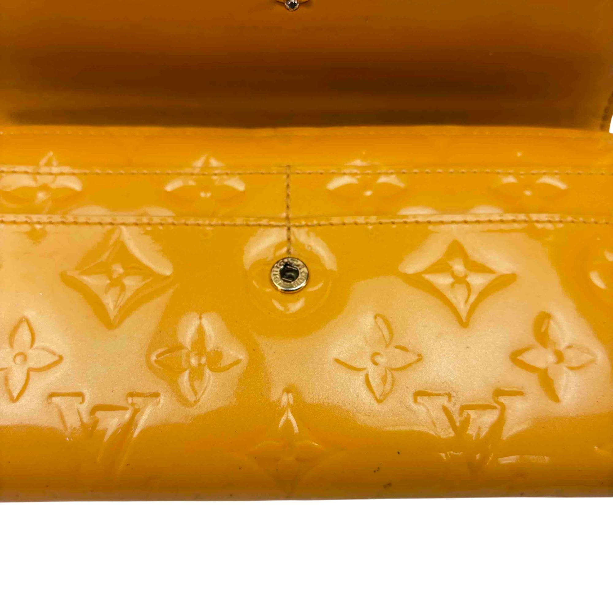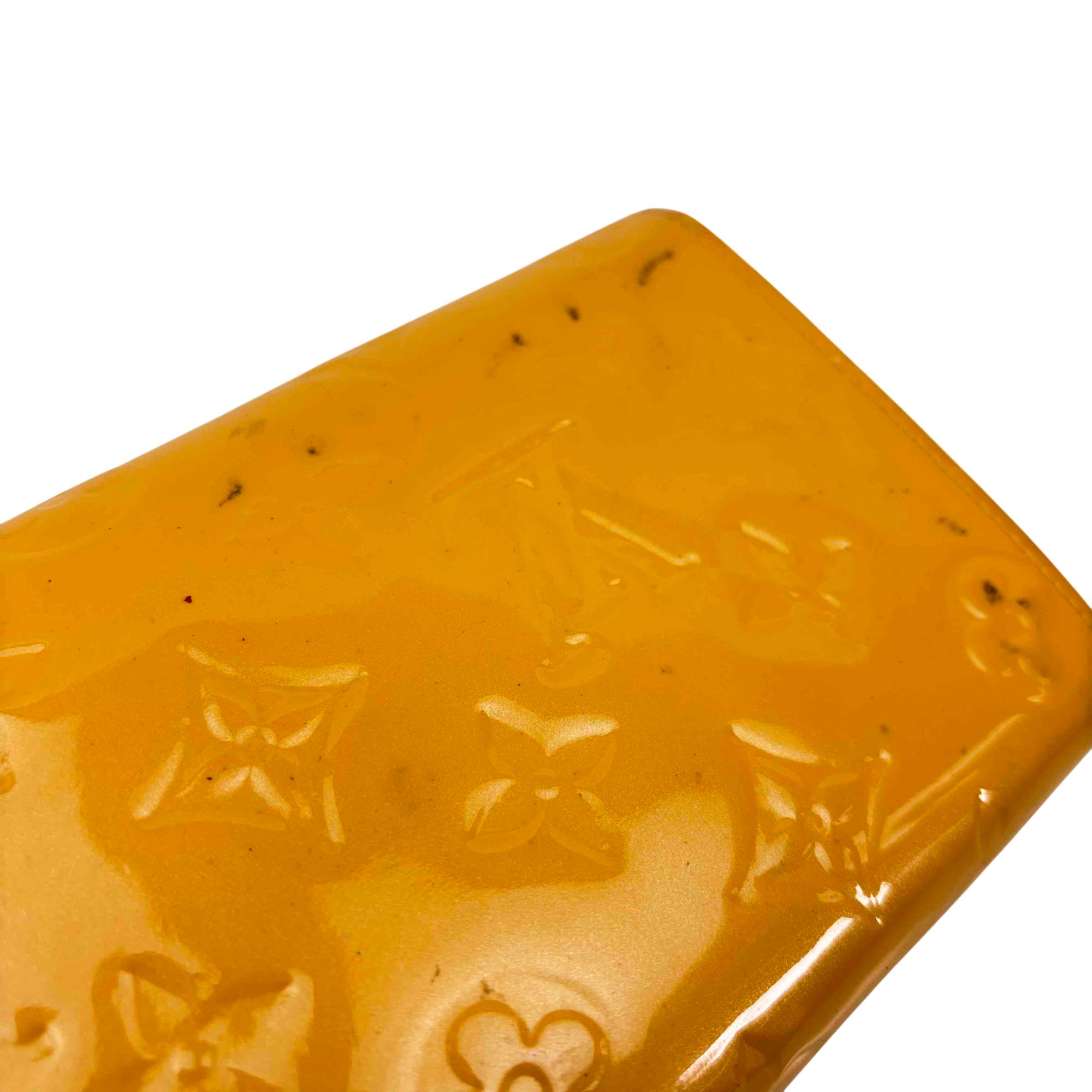Elevate your accessory game with this stunning Louis Vuitton Epi yellow wallet. Crafted from luxurious Vernis leather, this elegant wallet features a chic button closure and sophisticated design, making it the perfect combination of style and functionality. Whether youre dressing up for a night out or just running errands, this piece will add a touch of luxury to any outfit.