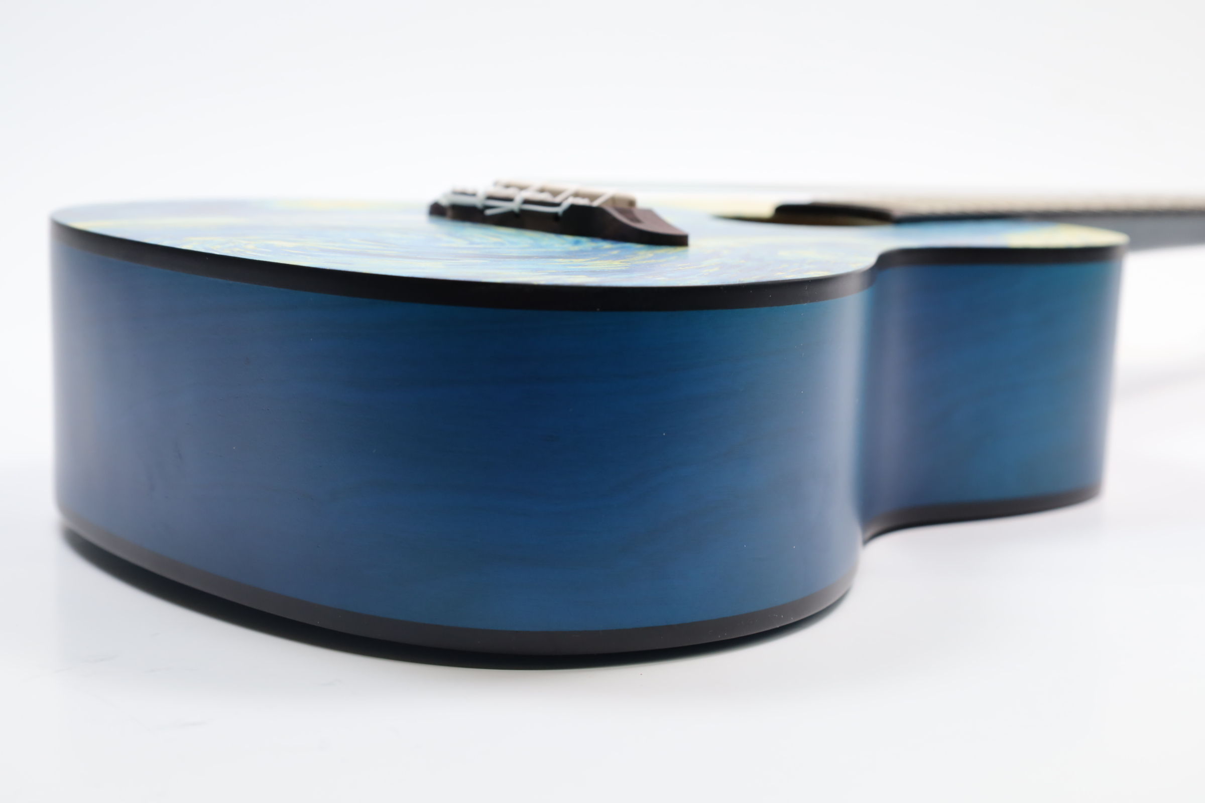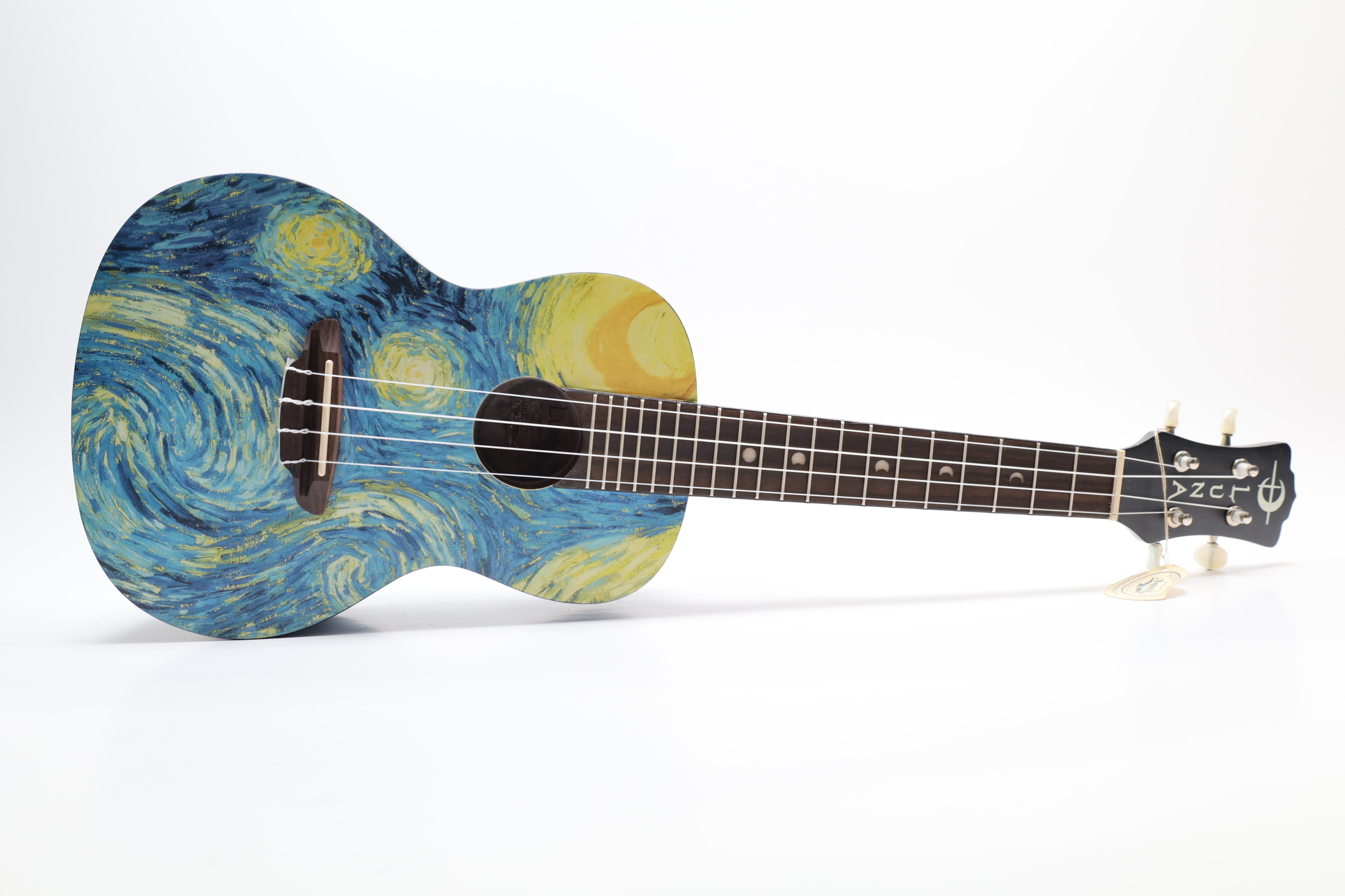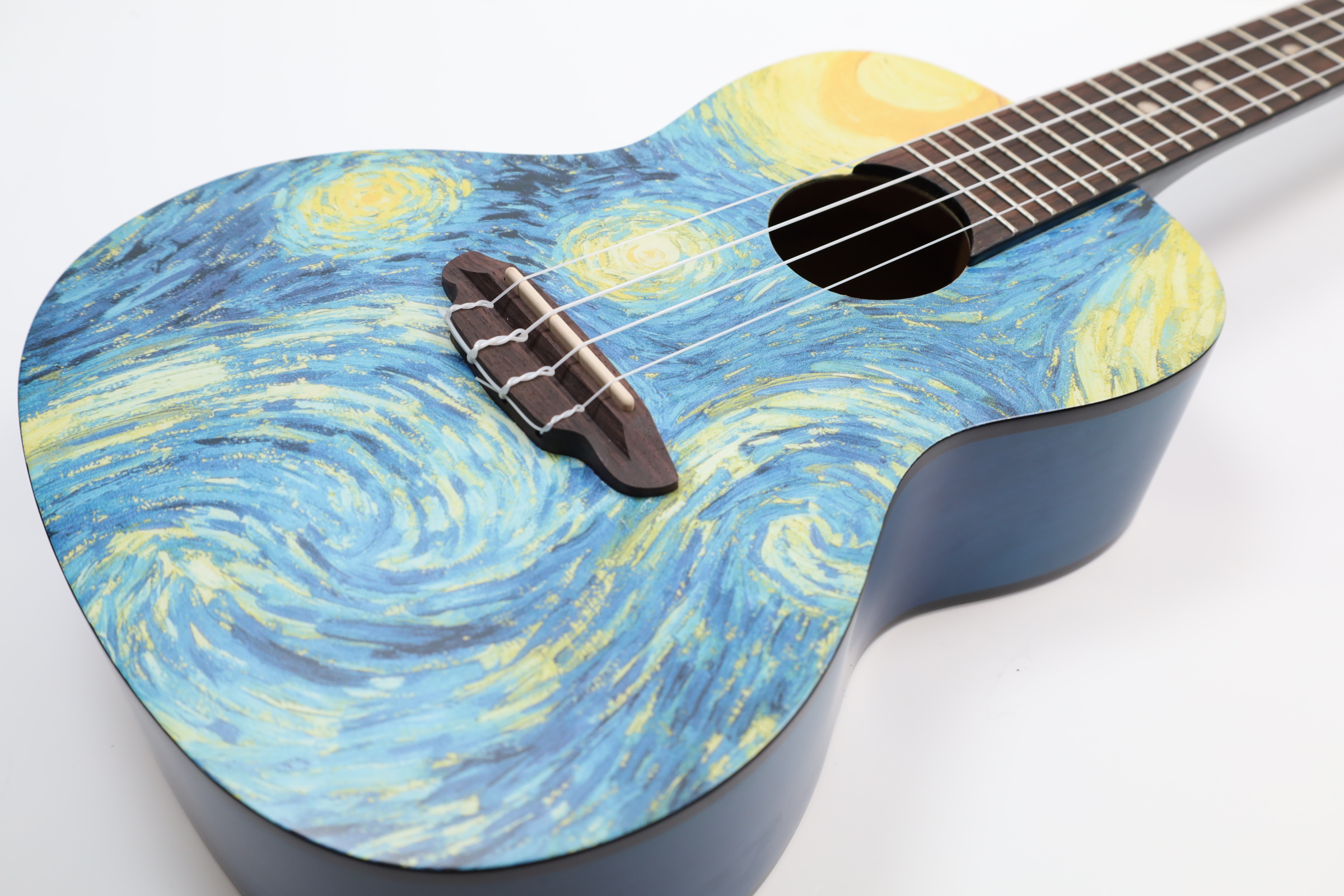 The "Uke Starry Night Concert" ukulele from Luna Guitars is a beautifully handcrafted instrument made from select eastern mahogany, known for its quality construction, sound, and stunning design. Inspired by Vincent van Gogh's "Starry Night" painting, this ukulele encourages players to embrace creativity in their music. The concert body, coupled with a maple top and mahogany body, allows the ukulele to produce a clear, resonant sound, making it an ideal choice for a variety of settings, from impromptu gigs to songwriting sessions.