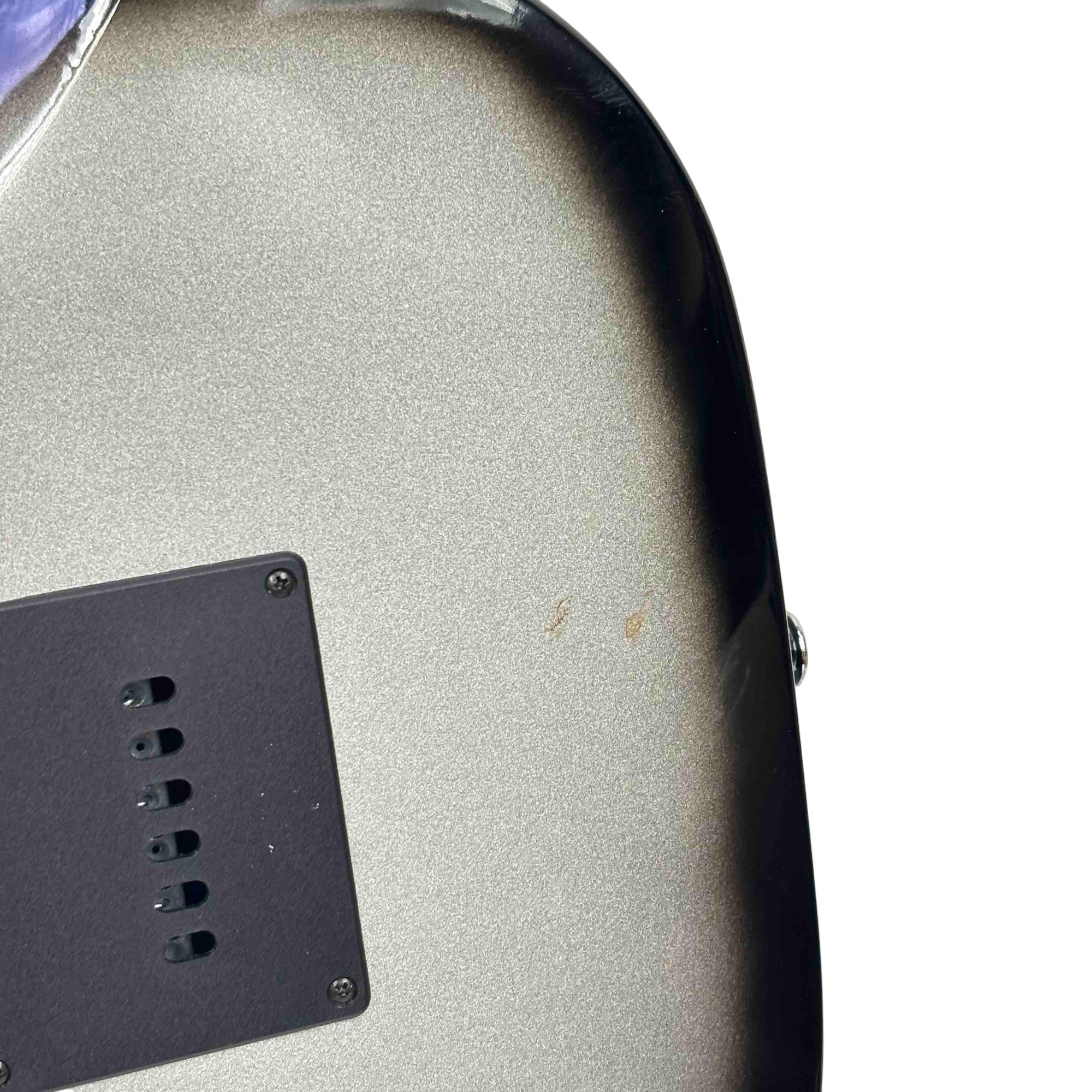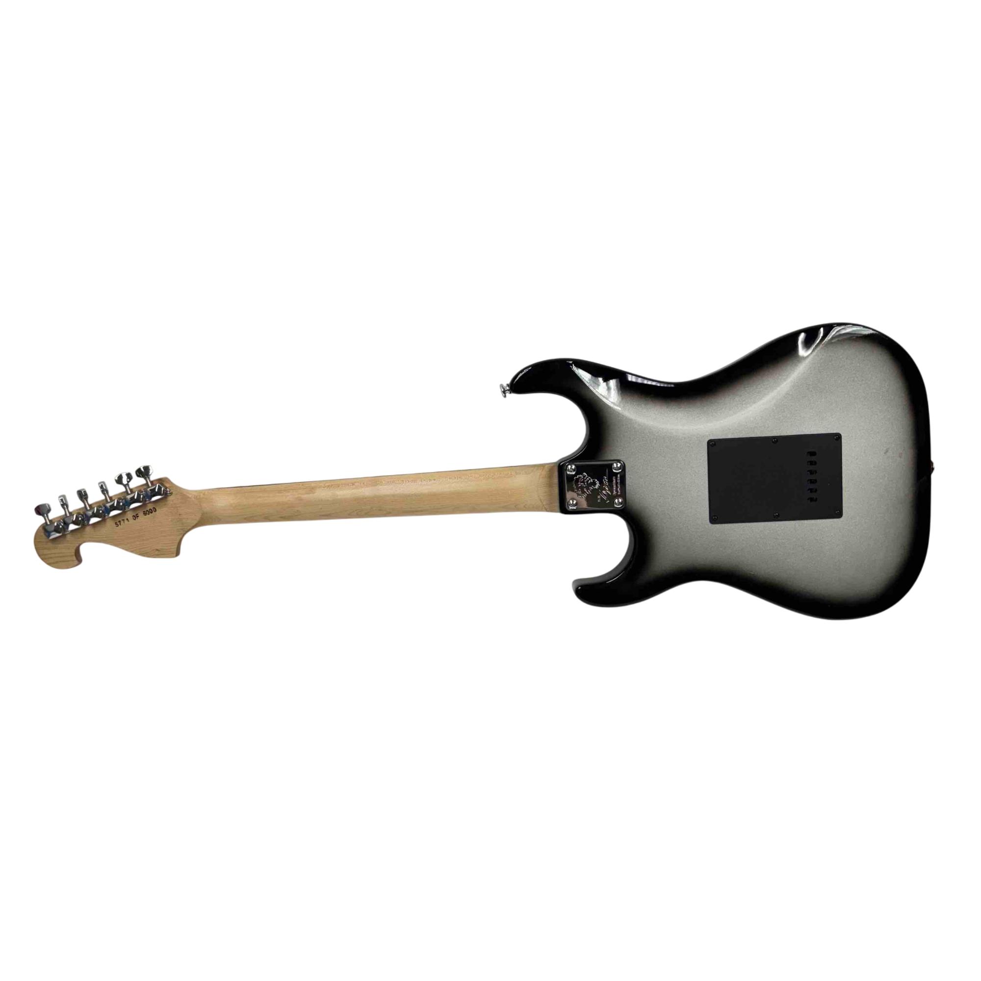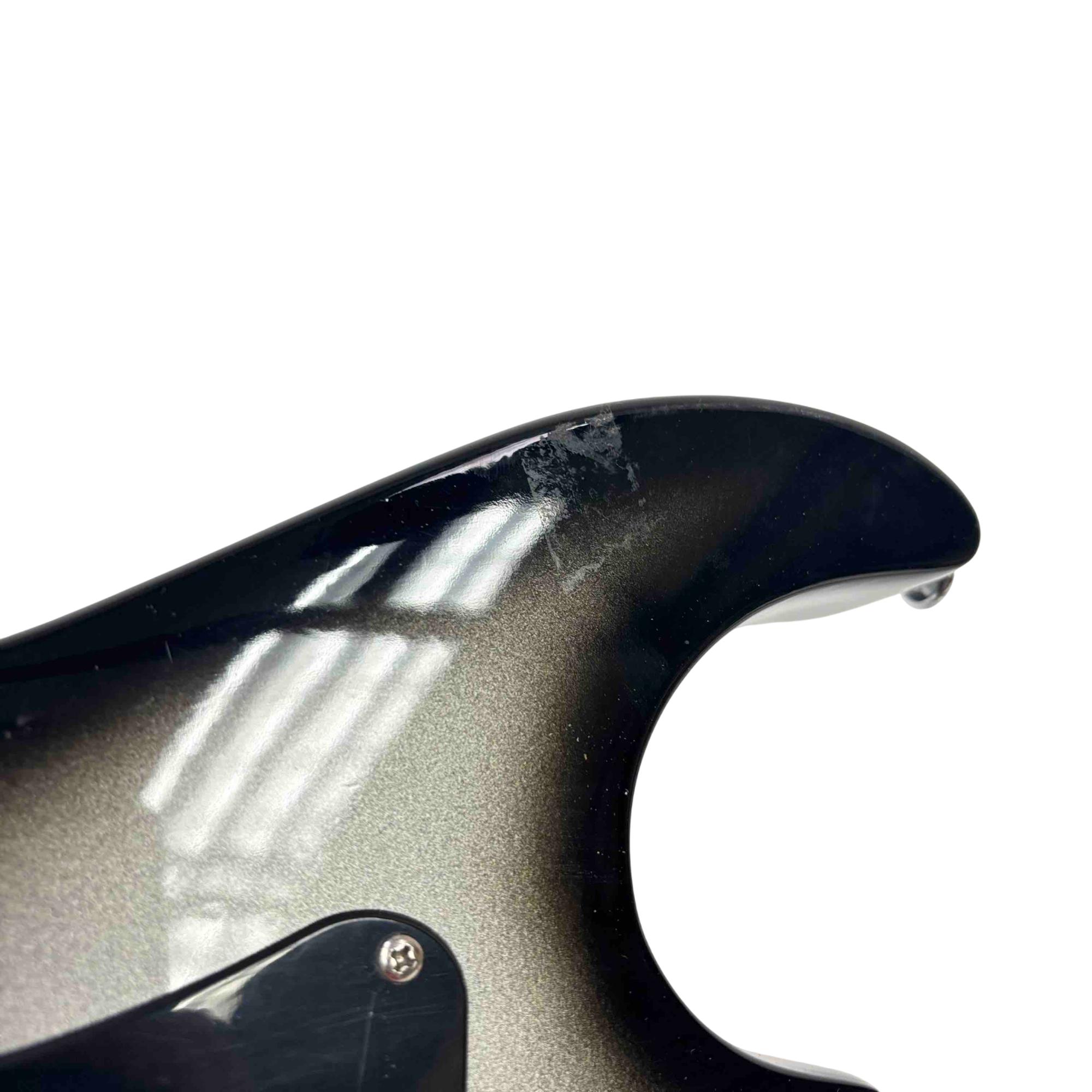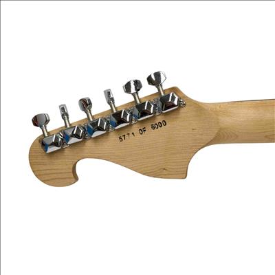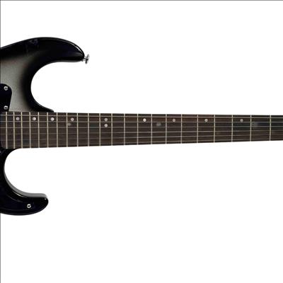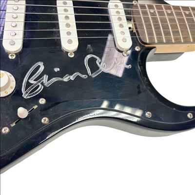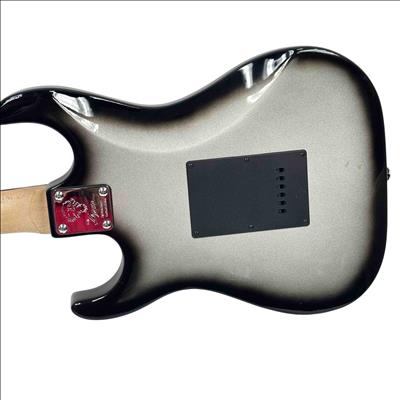 The Lyon by Washburn Stratocaster Style Electric Guitar, Brian Bell Weezer Autograph Edition, features a sleek black and silver finish that highlights its modern design and craftsmanship. This electric guitar is tailored for musicians seeking a versatile string instrument with a distinctive look and professional-grade quality. It combines classic Stratocaster style with unique aesthetic touches inspired by the signature edition.