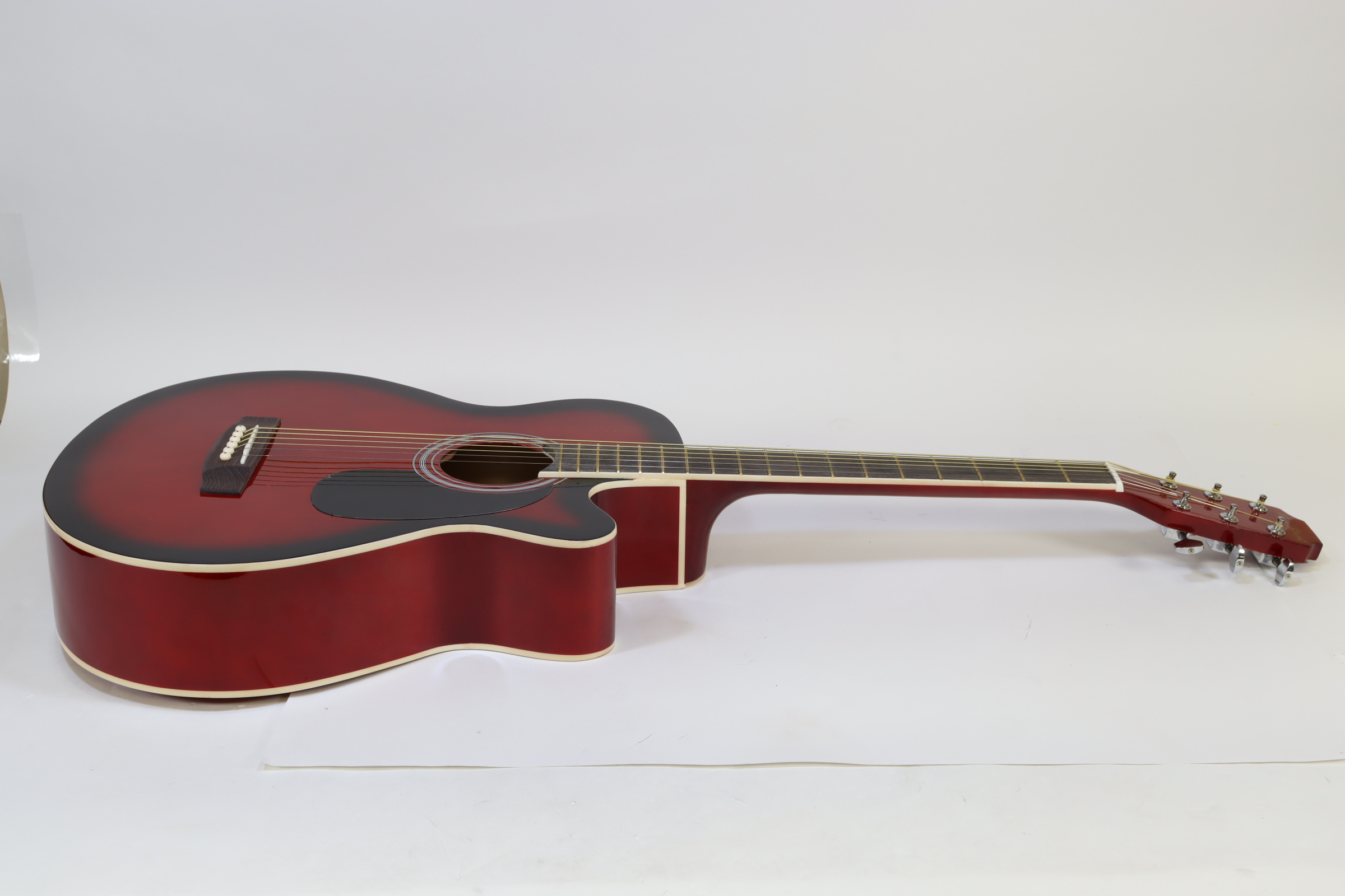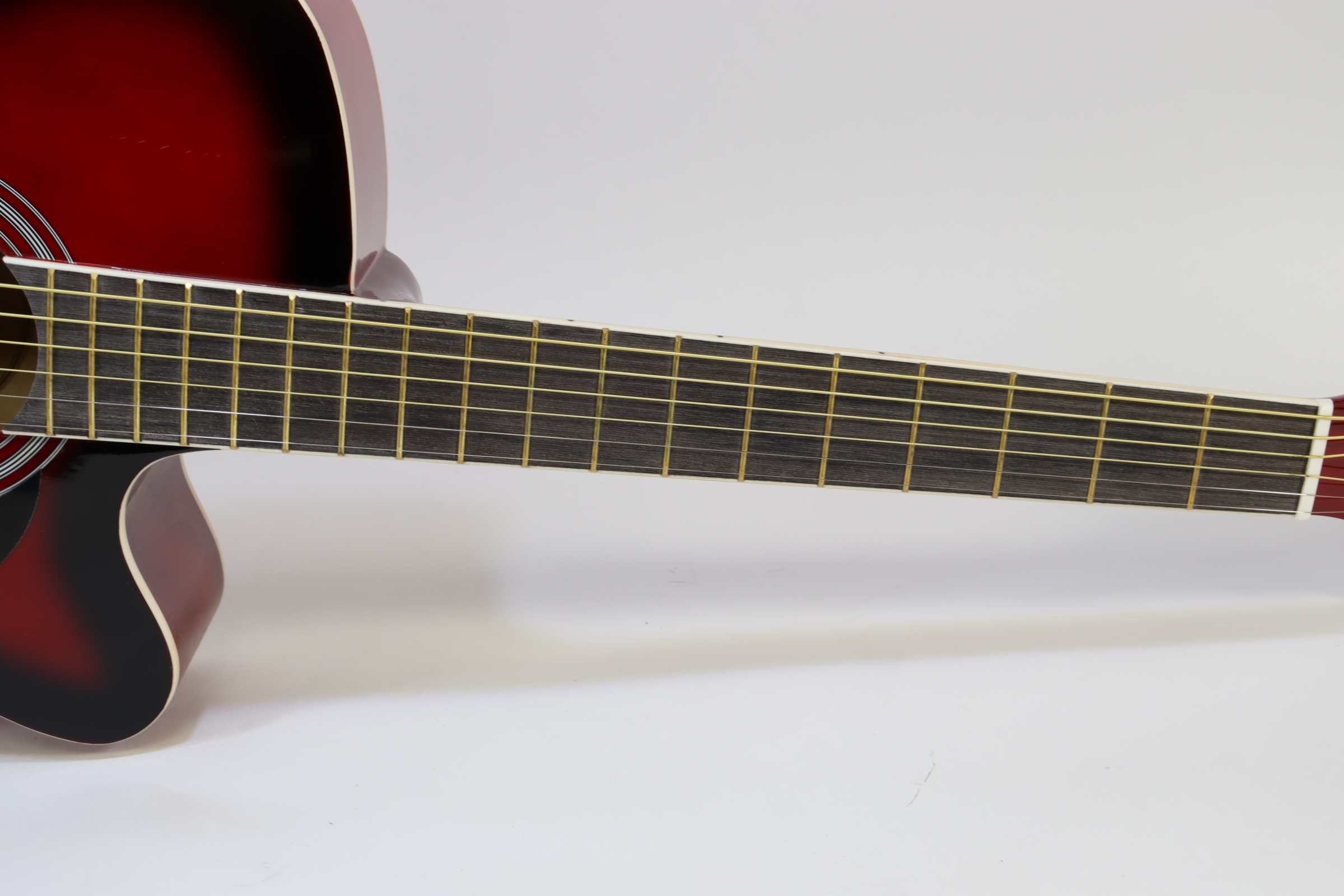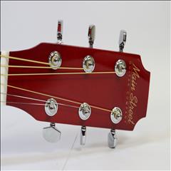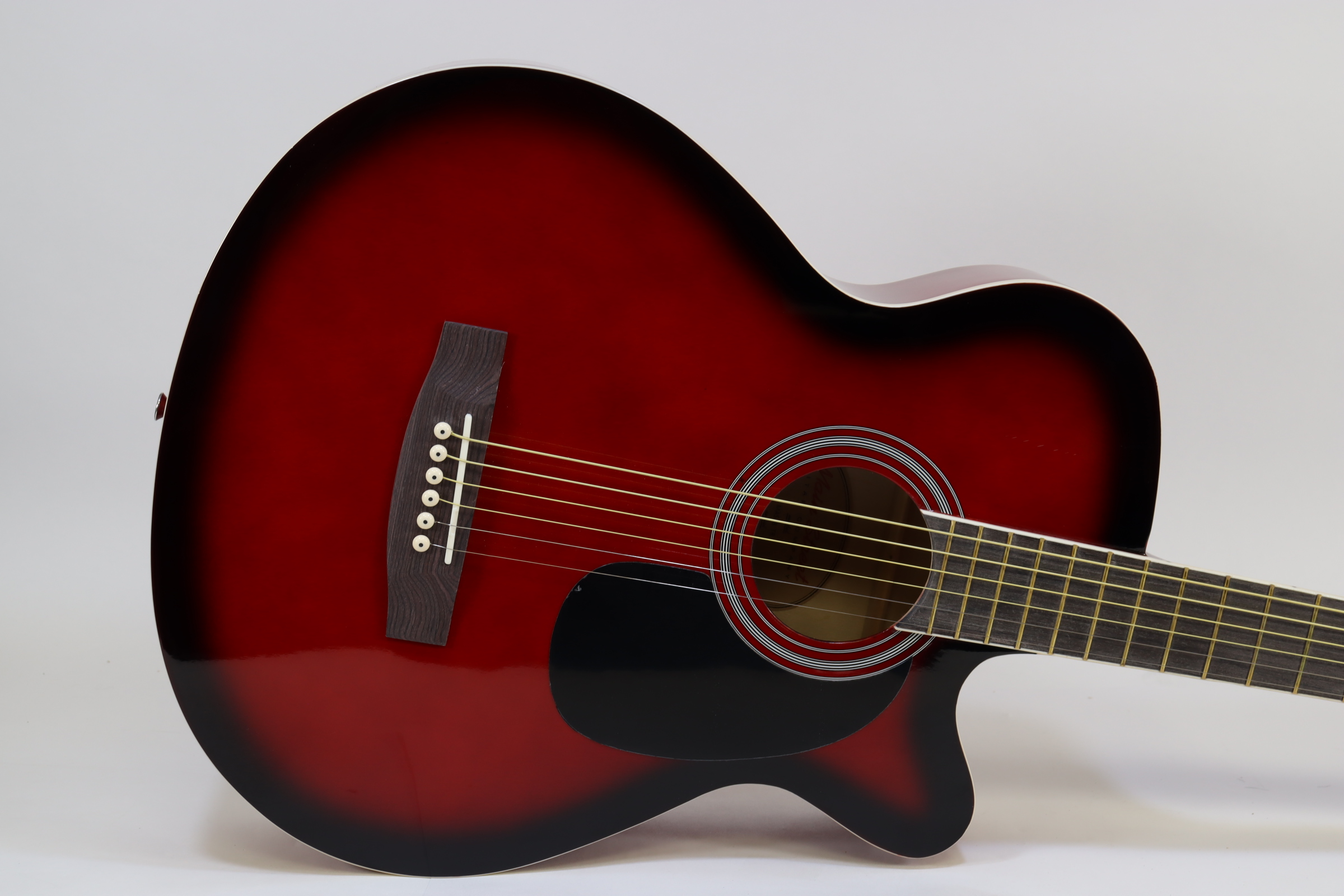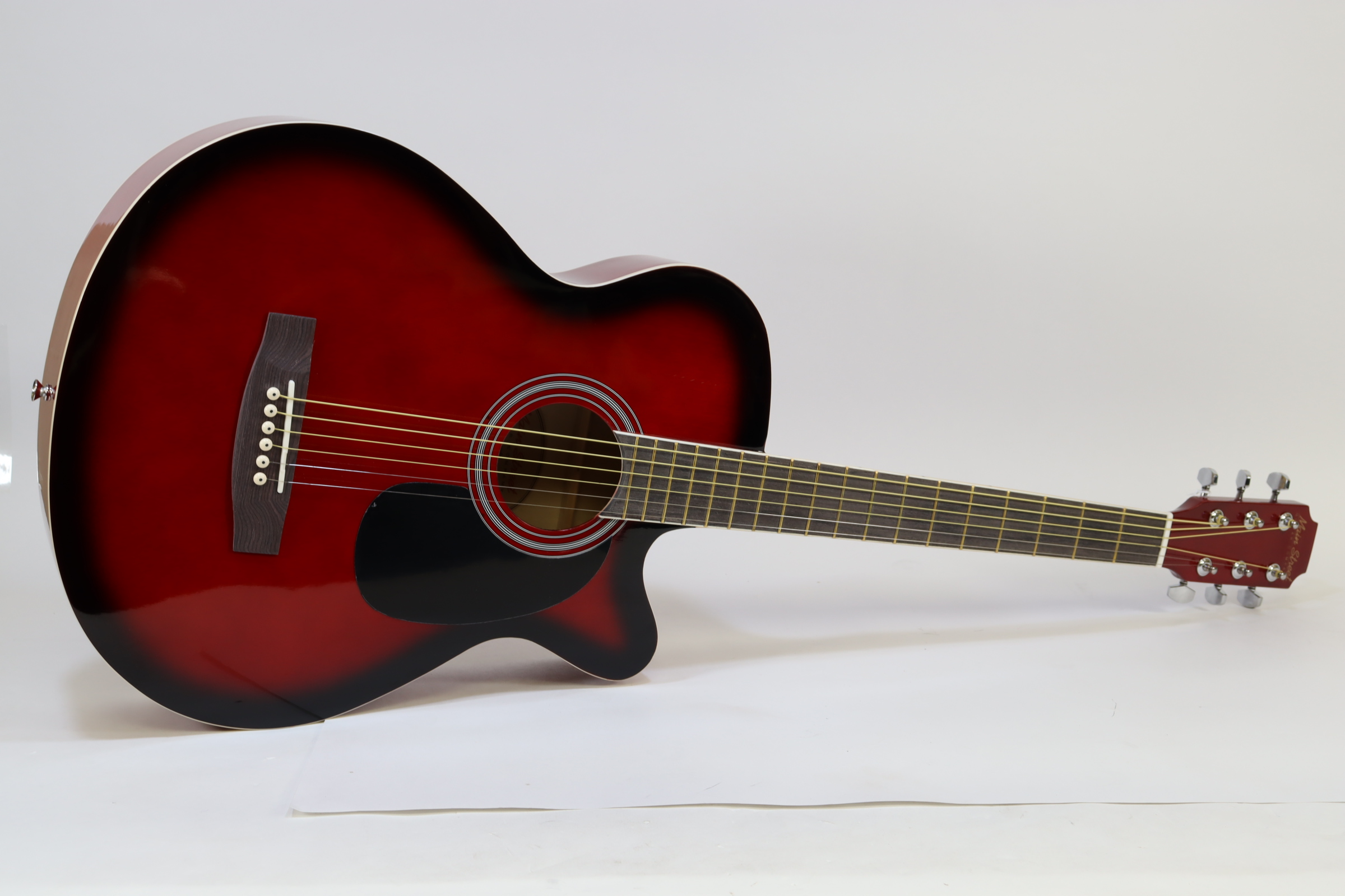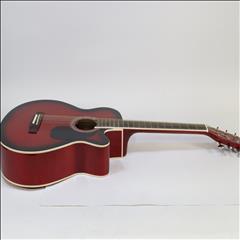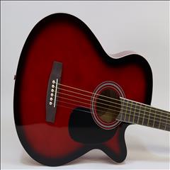 The MAS38SB, from the MAS38 Series Main Street Acoustic Guitars, features a 38-Inch, standard size body with a cutaway design for easier playing. This concert size makes for a better fit with younger or smaller-framed players than the jumbo dreadnoughts. It has a transparent red finish, linden top, back, and sides, catalpa neck with non-adjustable truss rod, steel strings and a dark-stained maple fingerboard and bridge. It also features 3:1 ratio plank-style tuners with chrome tuning keys, 18 frets and cream body and fingerboard binding. The overall size measures 37.75” L x 14.13” W x 4” D with the neck joining to the body at the 12th fret.