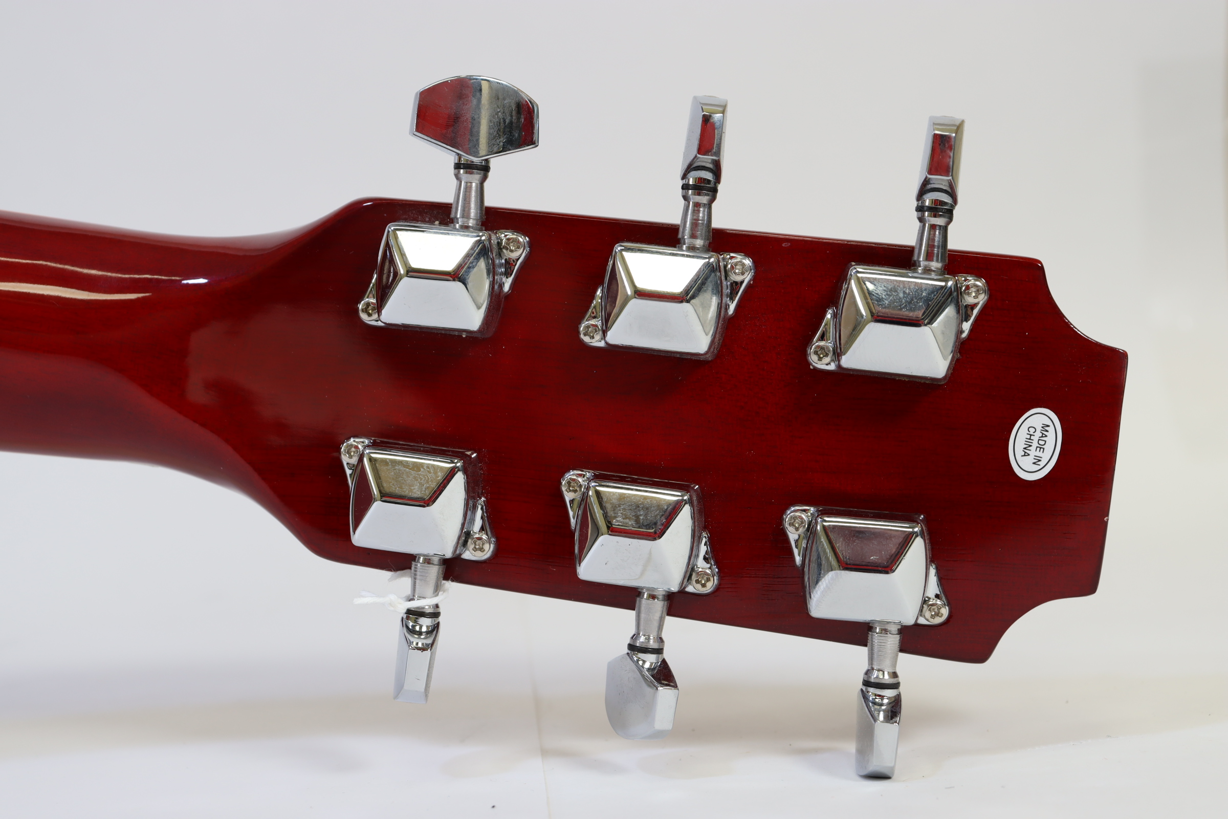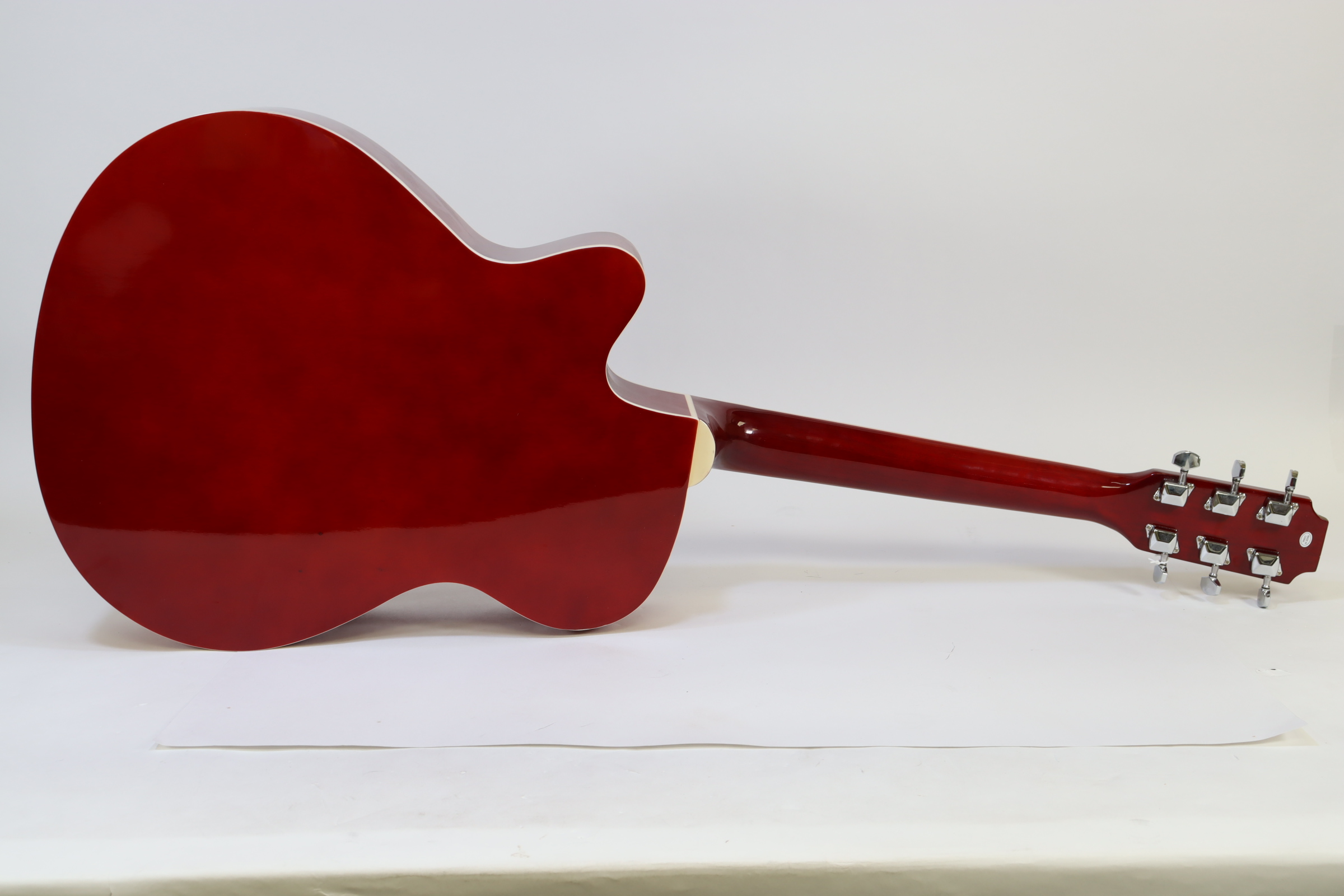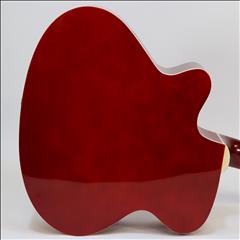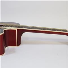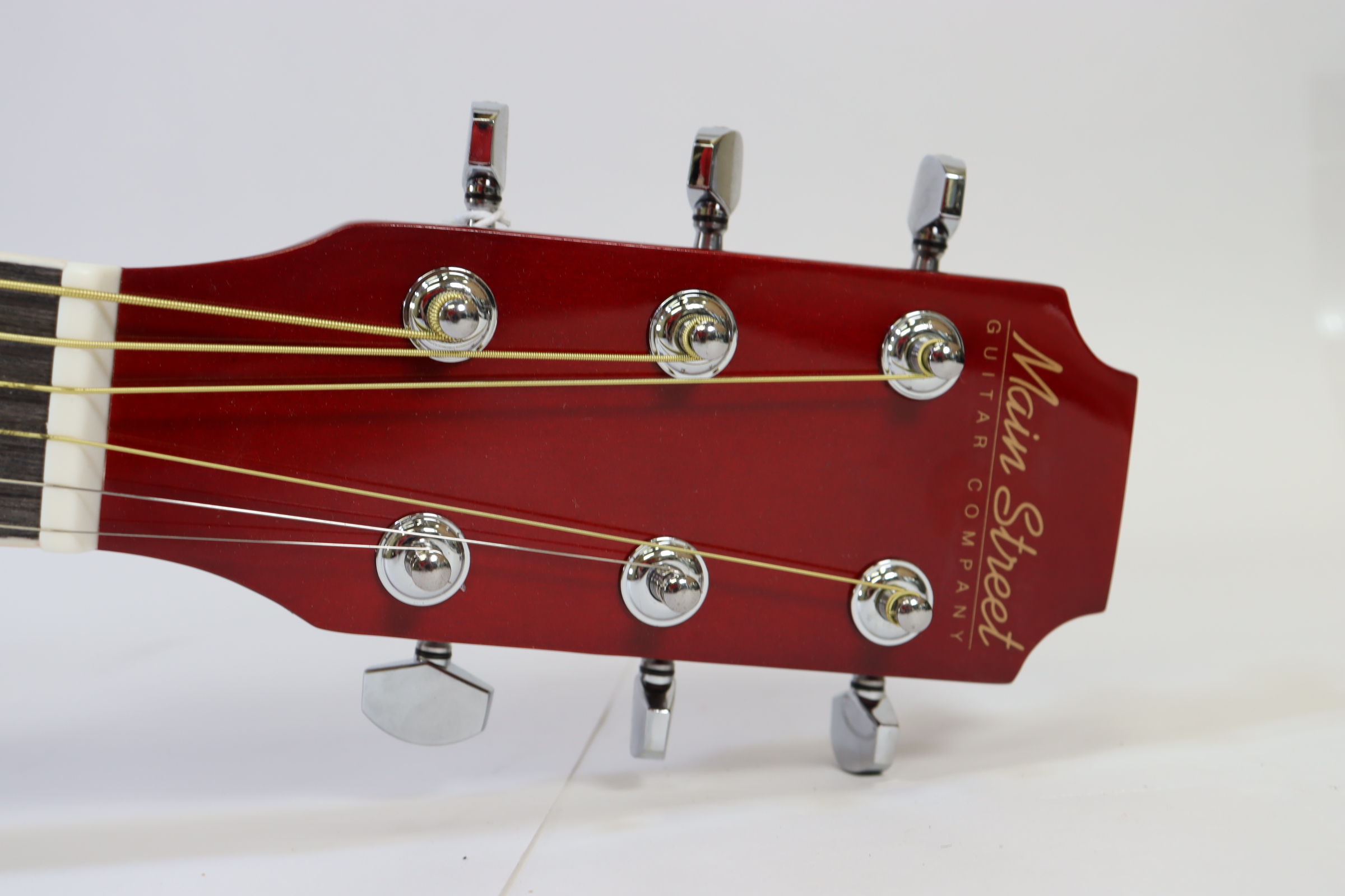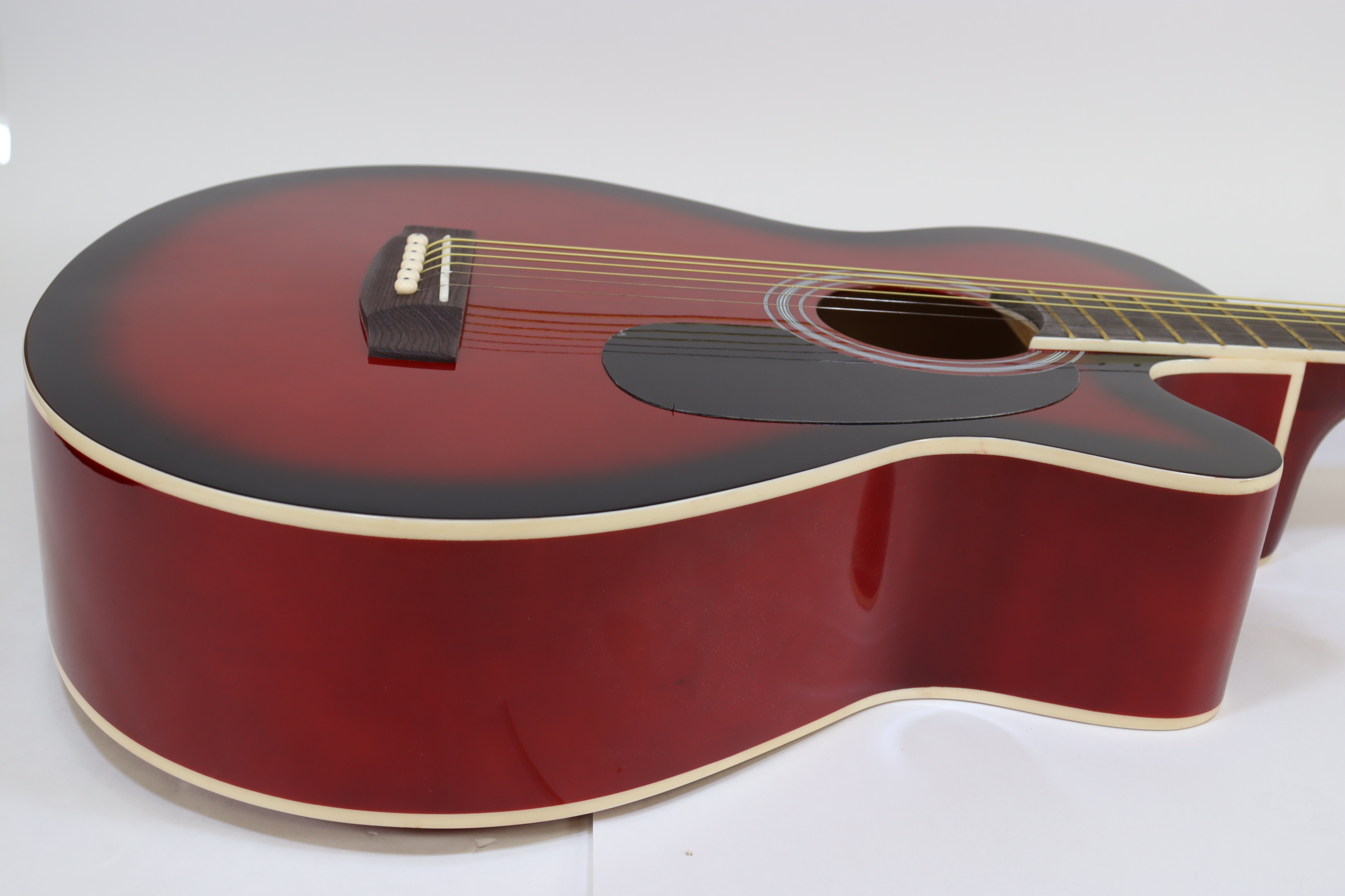 The MAS38SB, from the MAS38 Series Main Street Acoustic Guitars, features a 38-Inch, standard size body with a cutaway design for easier playing. This concert size makes for a better fit with younger or smaller-framed players than the jumbo dreadnoughts. It has a transparent red finish, linden top, back, and sides, catalpa neck with non-adjustable truss rod, steel strings and a dark-stained maple fingerboard and bridge. It also features 3:1 ratio plank-style tuners with chrome tuning keys, 18 frets and cream body and fingerboard binding. The overall size measures 37.75” L x 14.13” W x 4” D with the neck joining to the body at the 12th fret.