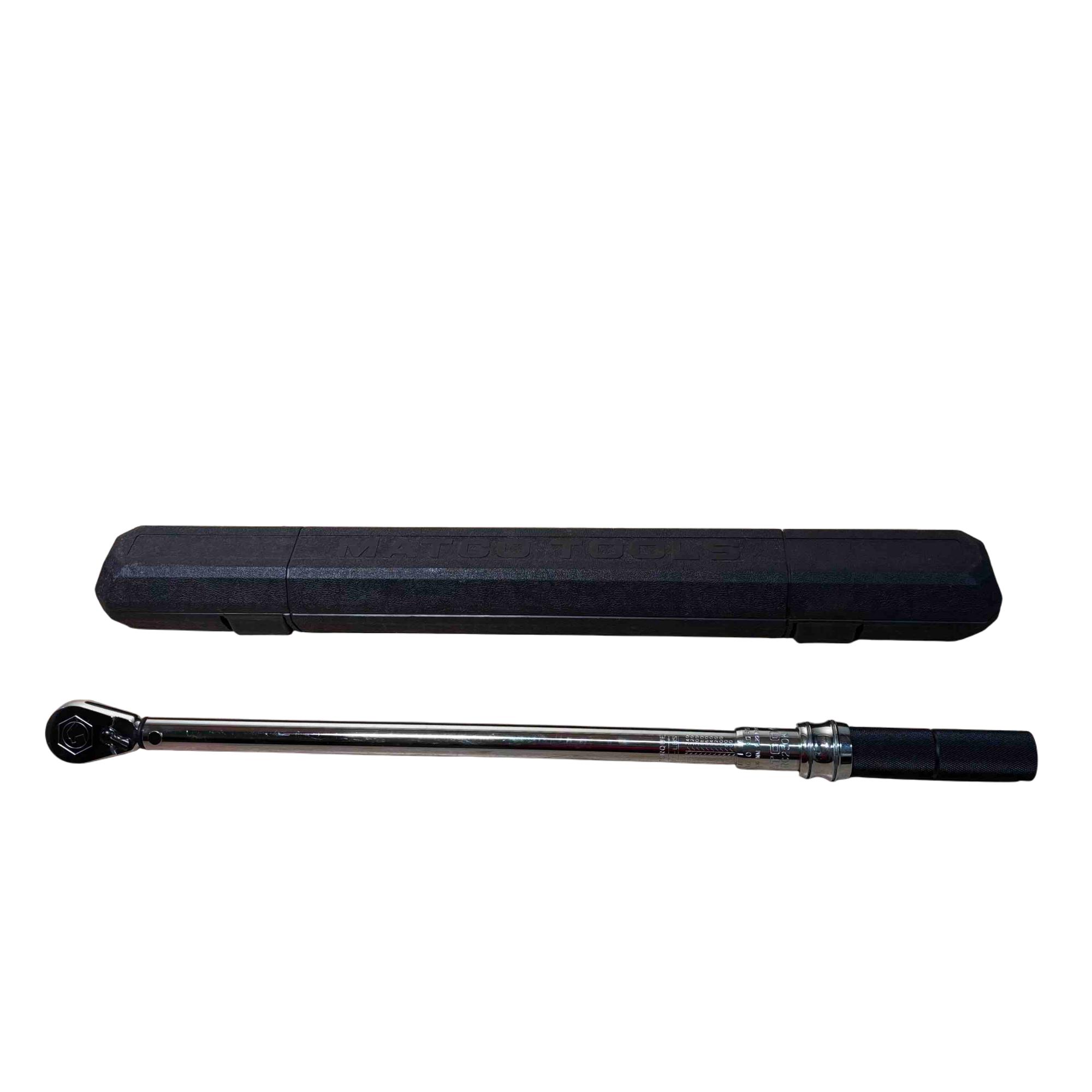 Matco Tools TRC250K 1/2" Drive Fixed 50-250 FT-LBS Torque Wrench is a precision hand tool designed for accurate torque application in automotive and mechanical tasks. Featuring a durable black and silver finish with a sturdy handle, this torque wrench offers reliable performance with adjustable settings ranging from 50 to 250 foot-pounds. It is engineered for ease of use and long-term durability, making it ideal for professional technicians and DIY enthusiasts alike.