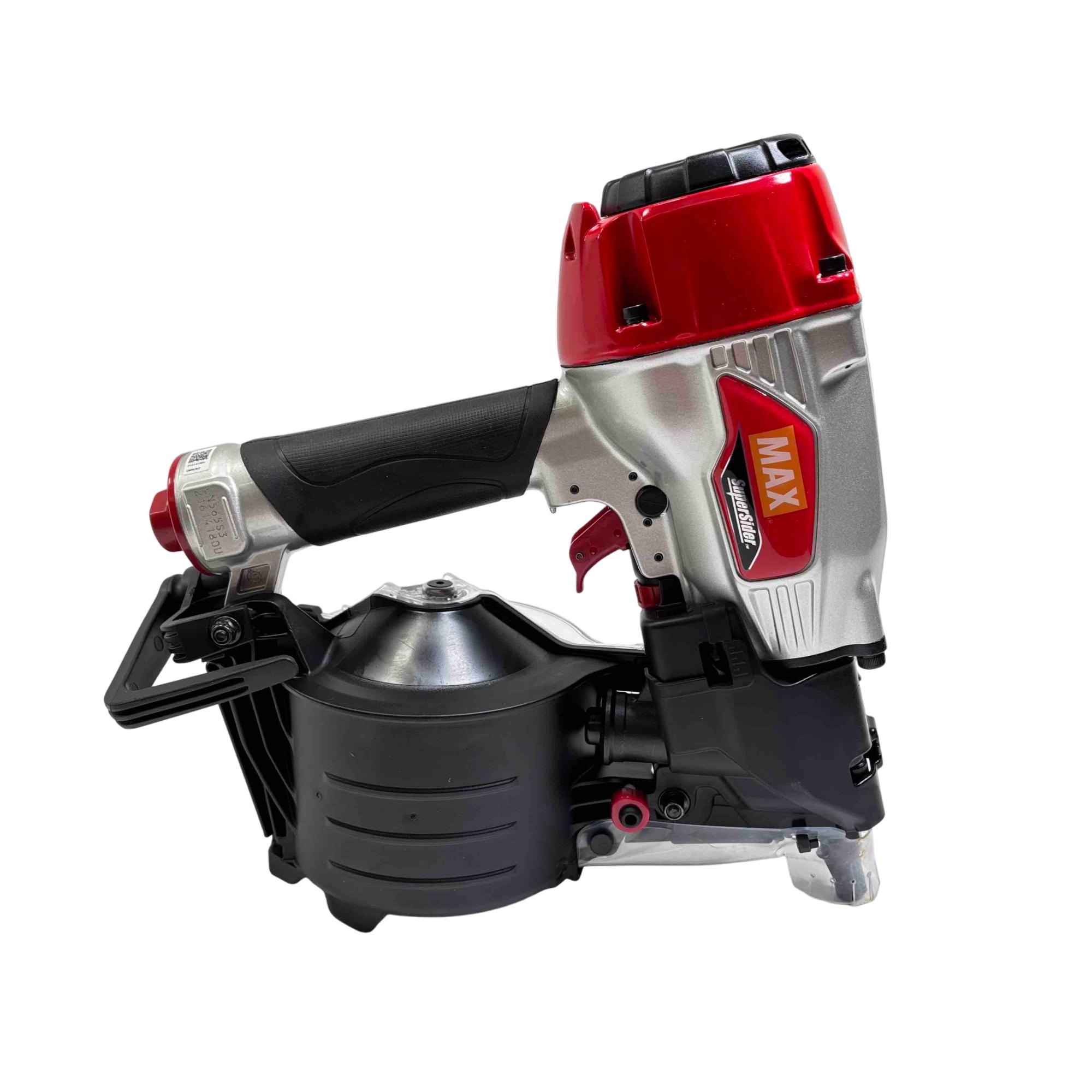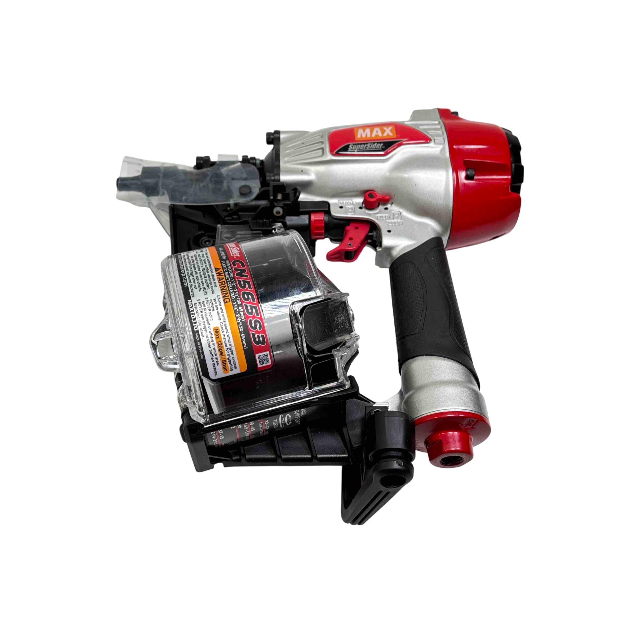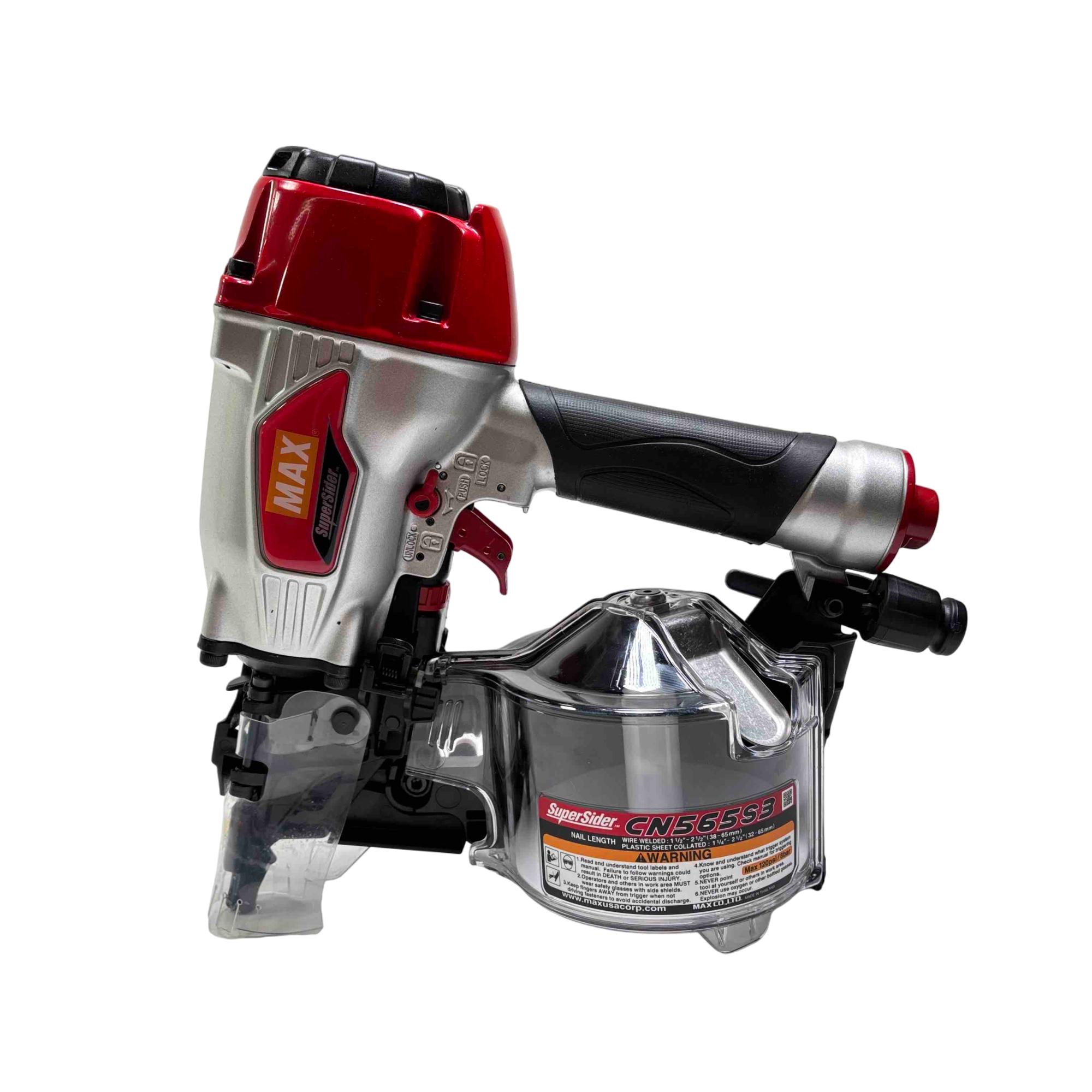 The MAX SuperSider CN565S3 is a heavy-duty pneumatic coil nail gun designed for professional construction and siding work. With its ergonomic handle, durable red and silver housing, and compatibility with both wire welded and plastic sheet collated nails (1"–2-1/2"), this tool ensures fast and efficient performance on any job site. Ideal for contractors or serious DIYers seeking reliability and precision, the CN565S3 also features advanced safety mechanisms and easy maintenance for everyday use.