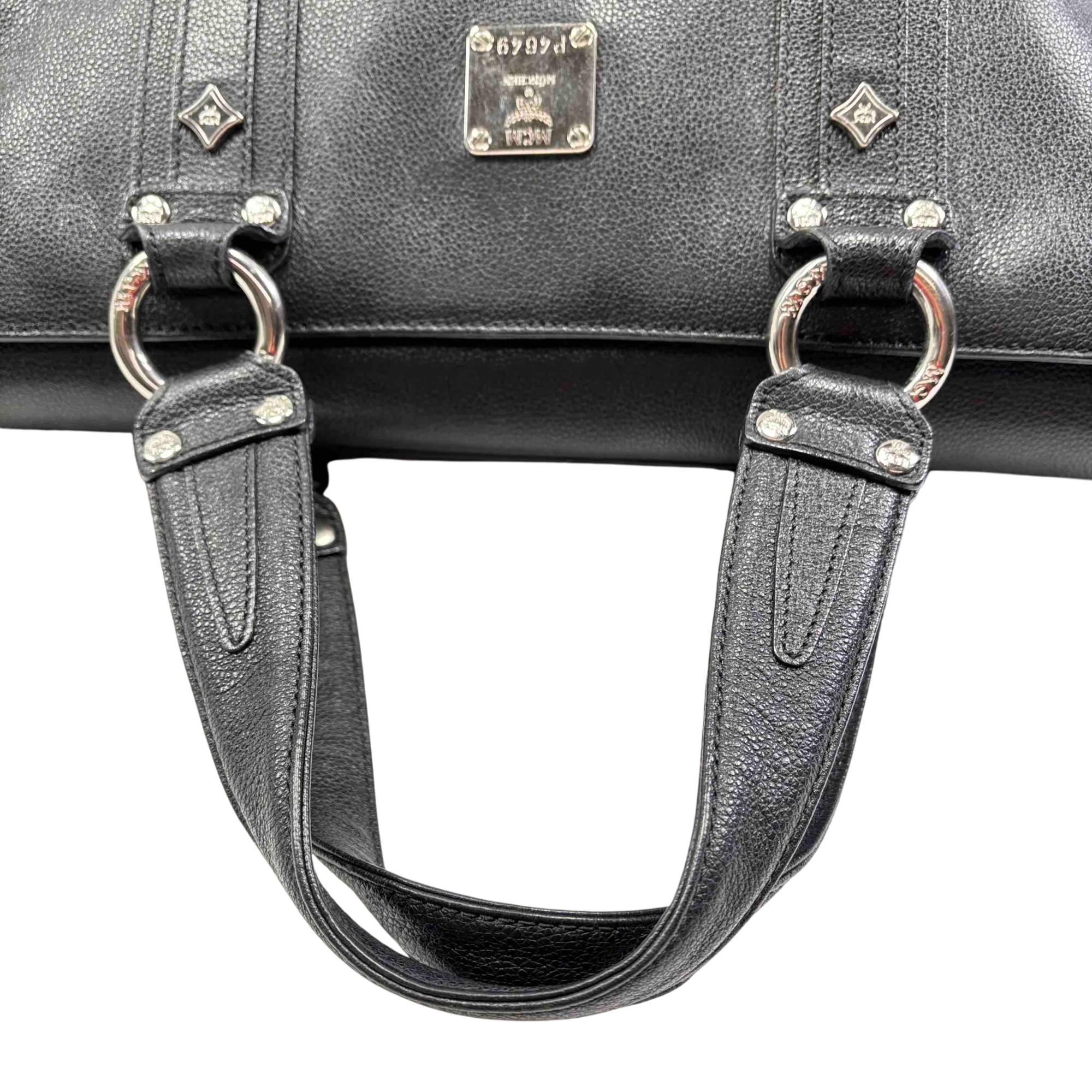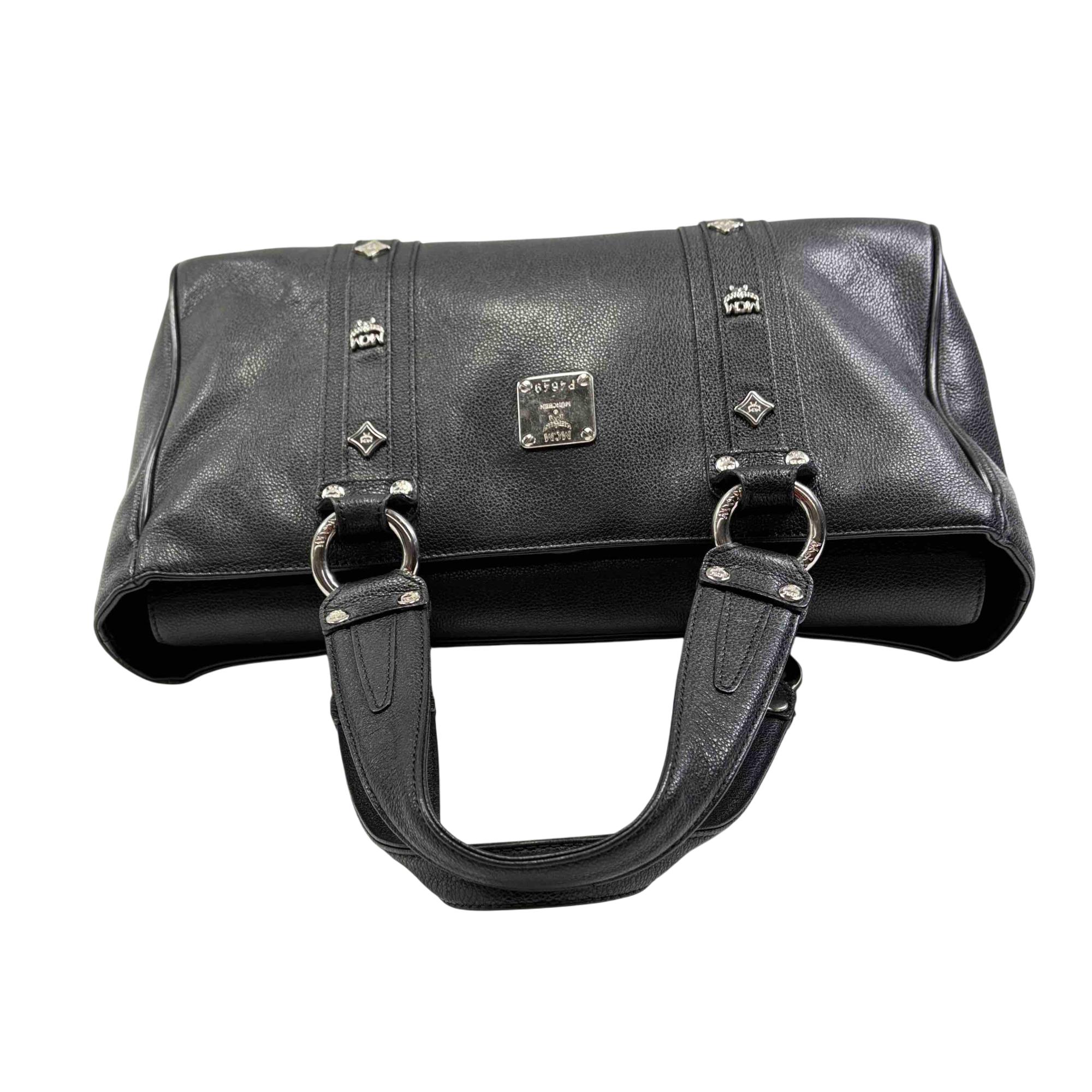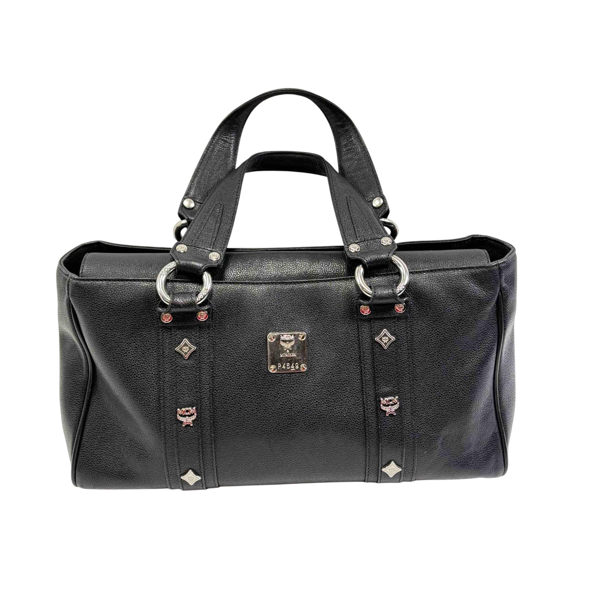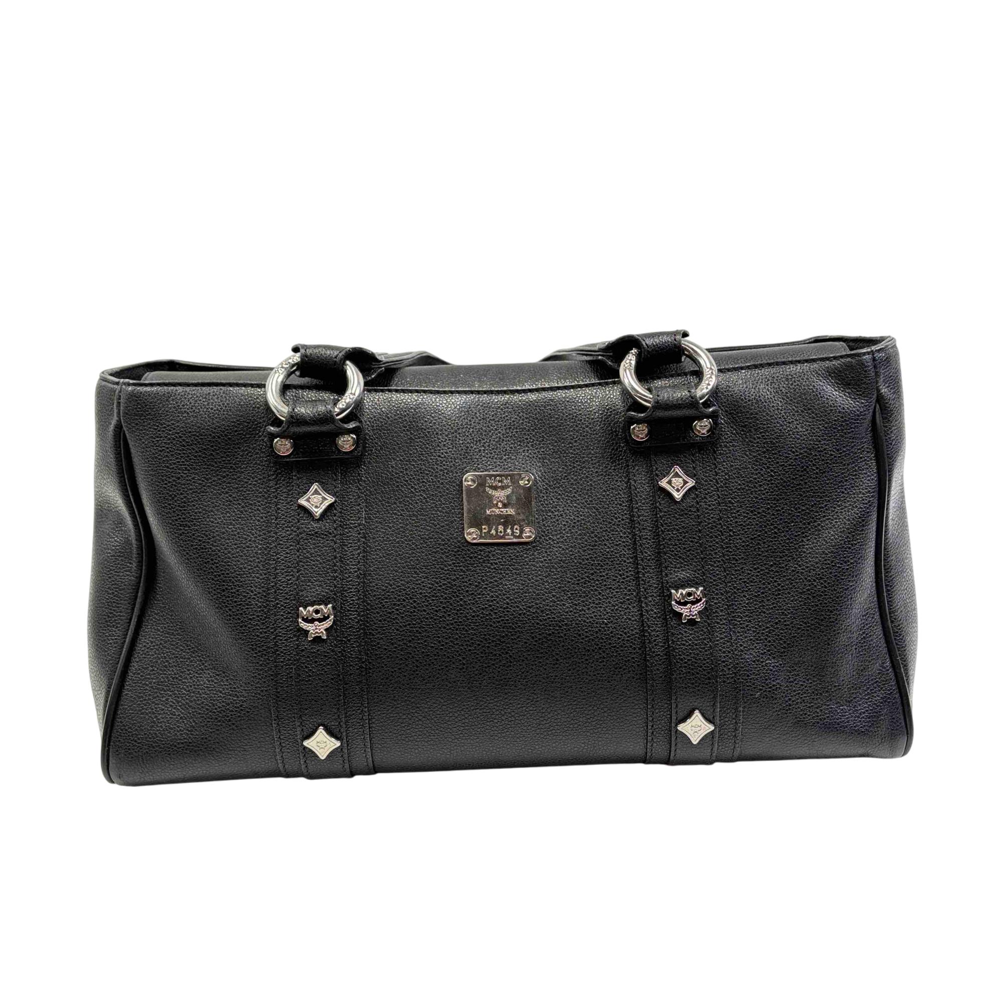Elevate your style with this exquisite MCM Bag, crafted from luxurious black leather and adorned with elegant silver accents and studded detailing. This sophisticated accessory offers the perfect blend of fashion and function, making it an ideal choice for any occasion. Carry your essentials in style and turn heads wherever you go with this stunning handbag.