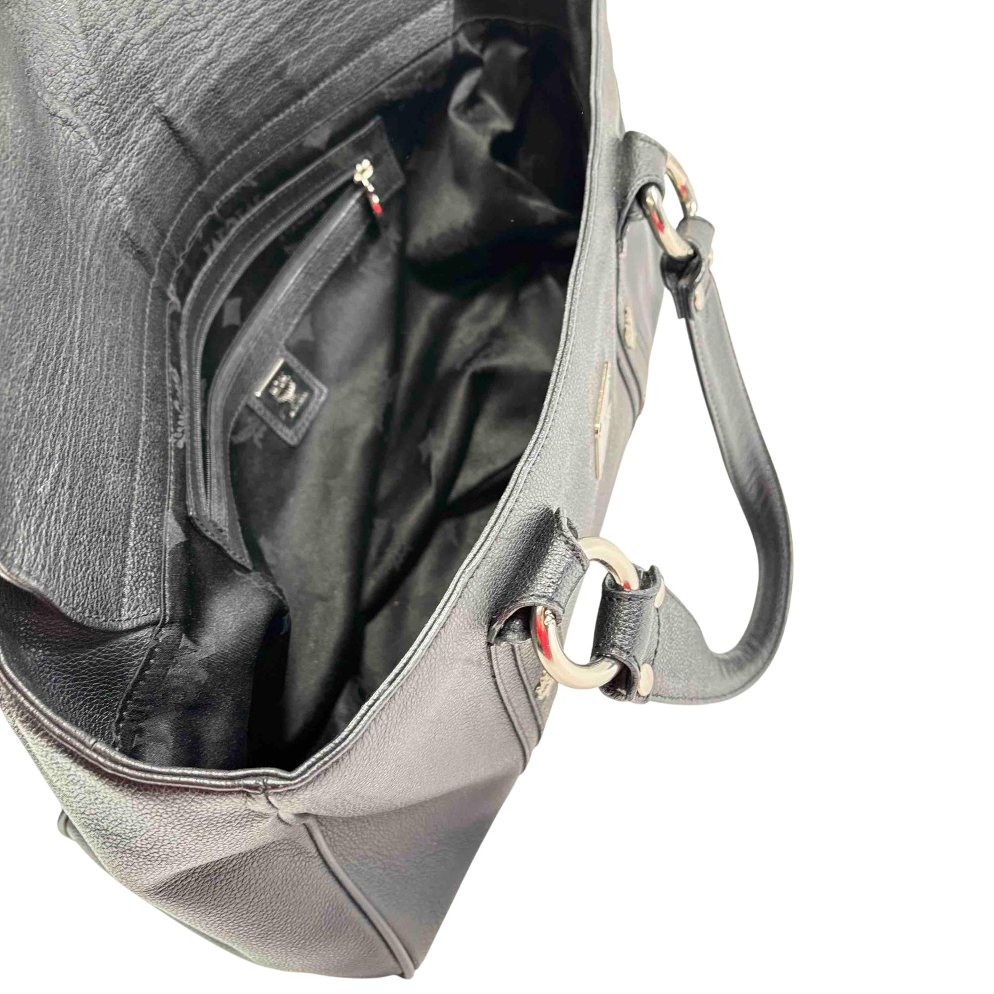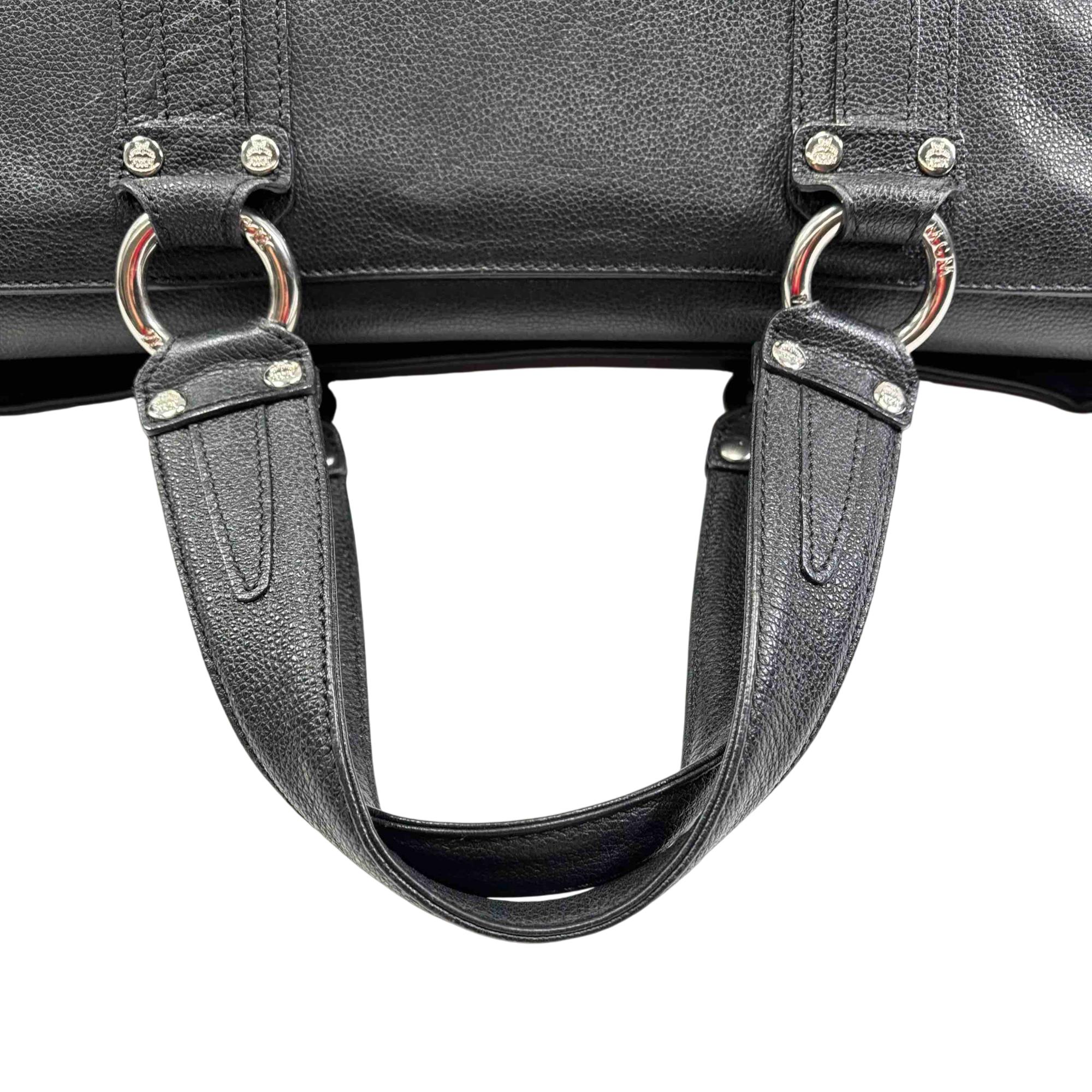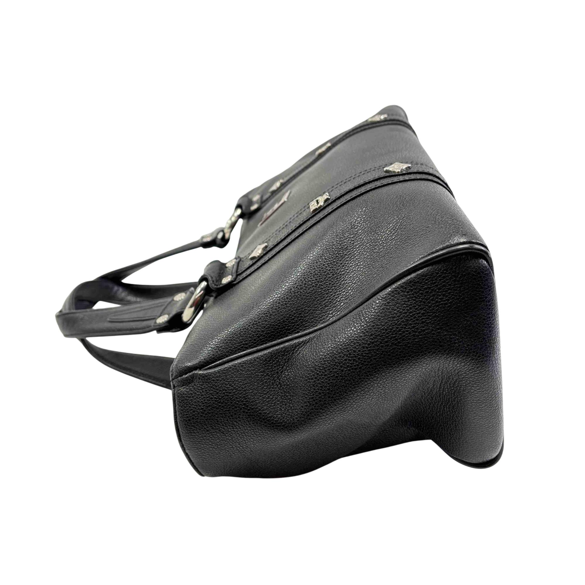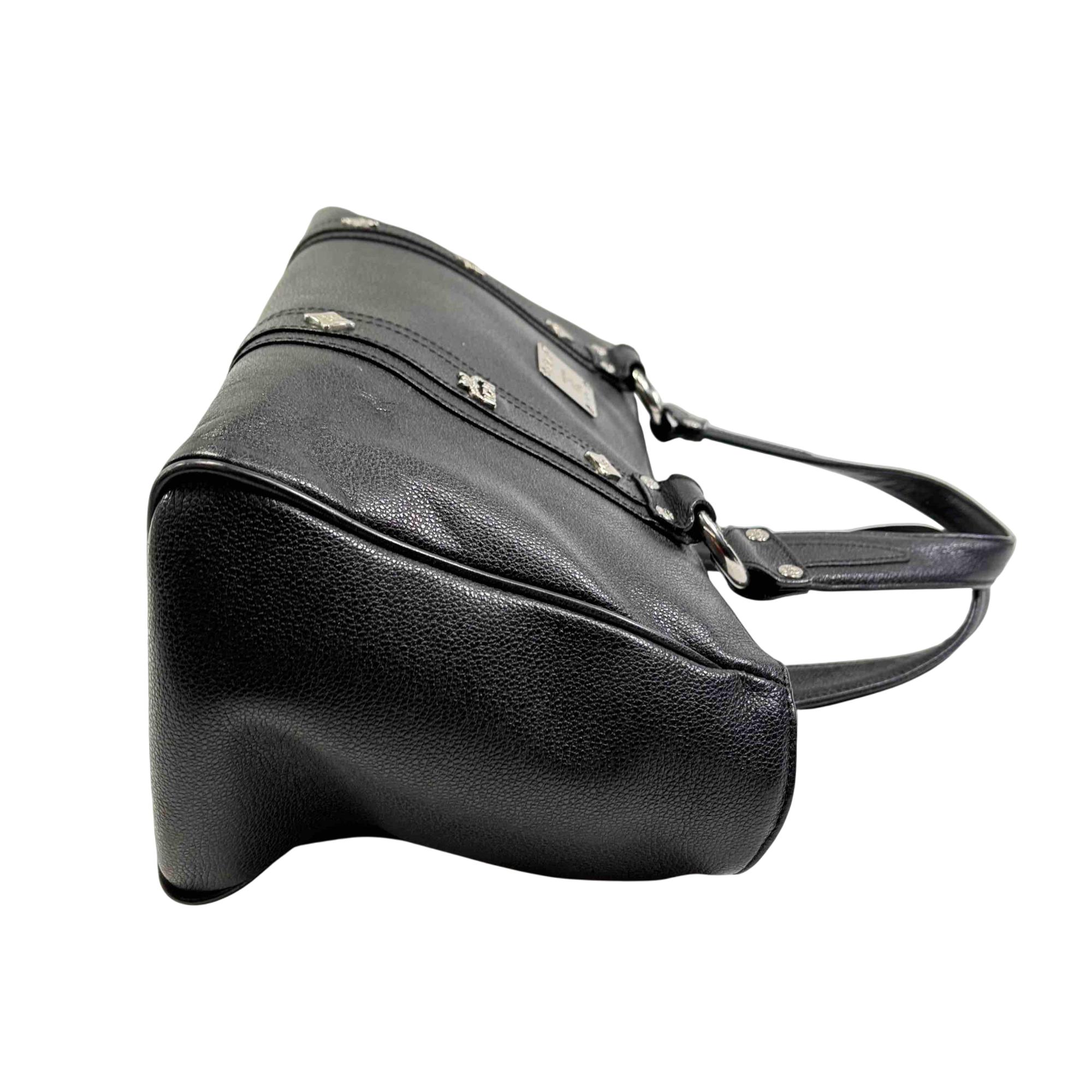 Elevate your style with this exquisite MCM Bag, crafted from luxurious black leather and adorned with elegant silver accents and studded detailing. This sophisticated accessory offers the perfect blend of fashion and function, making it an ideal choice for any occasion. Carry your essentials in style and turn heads wherever you go with this stunning handbag.