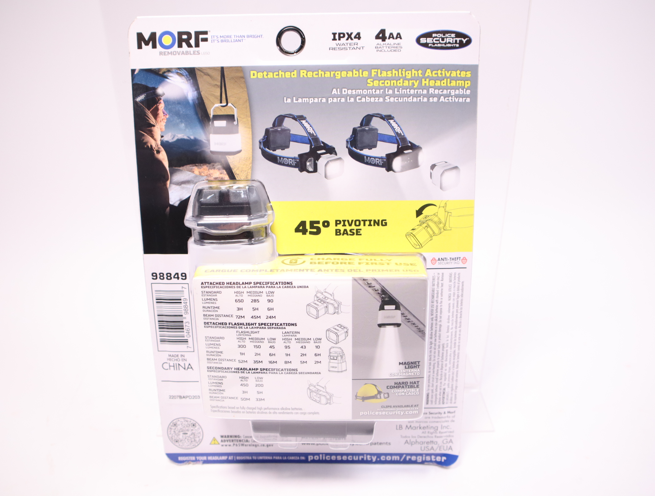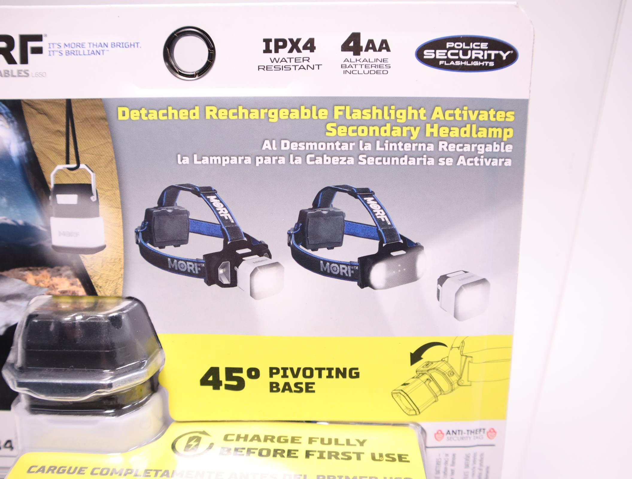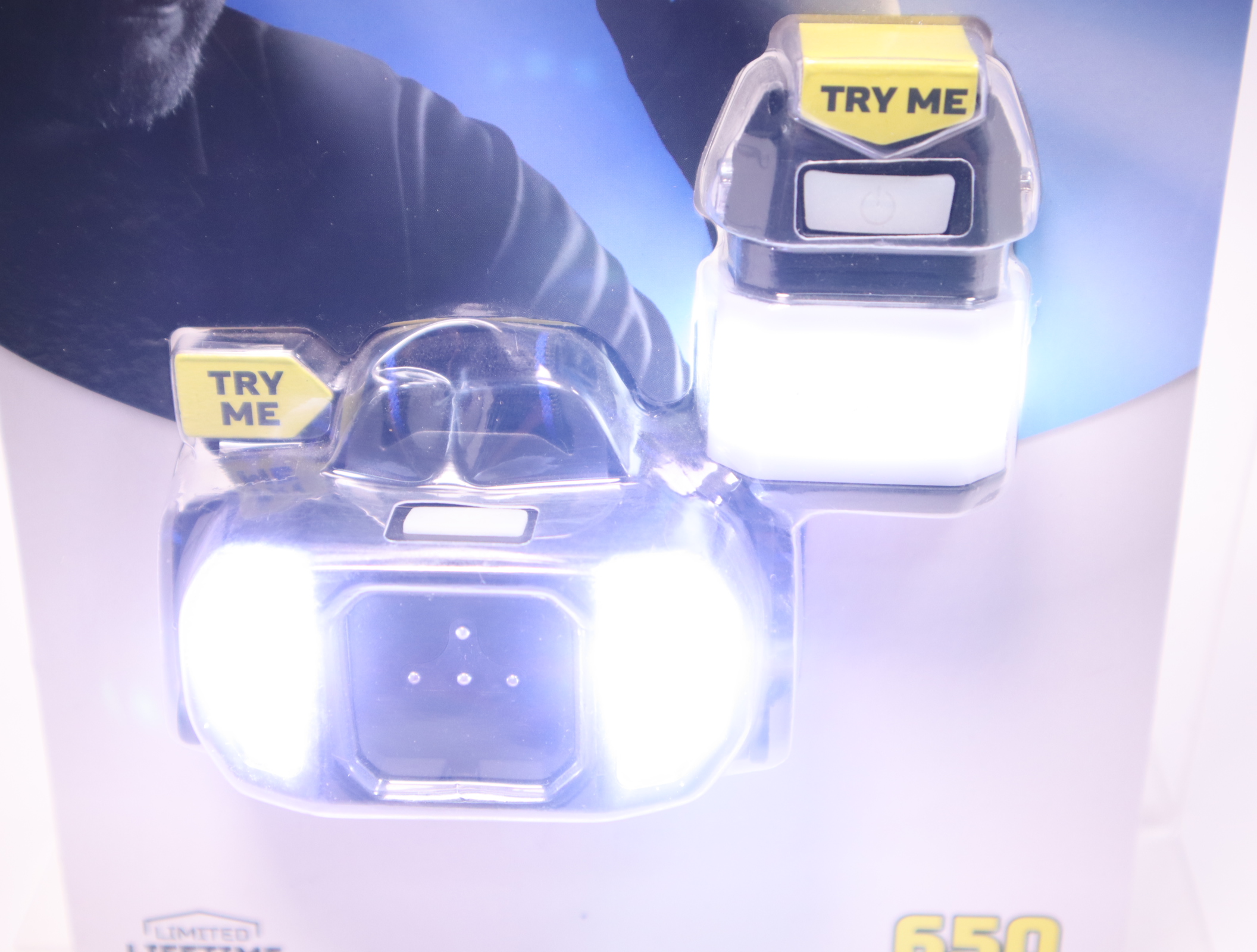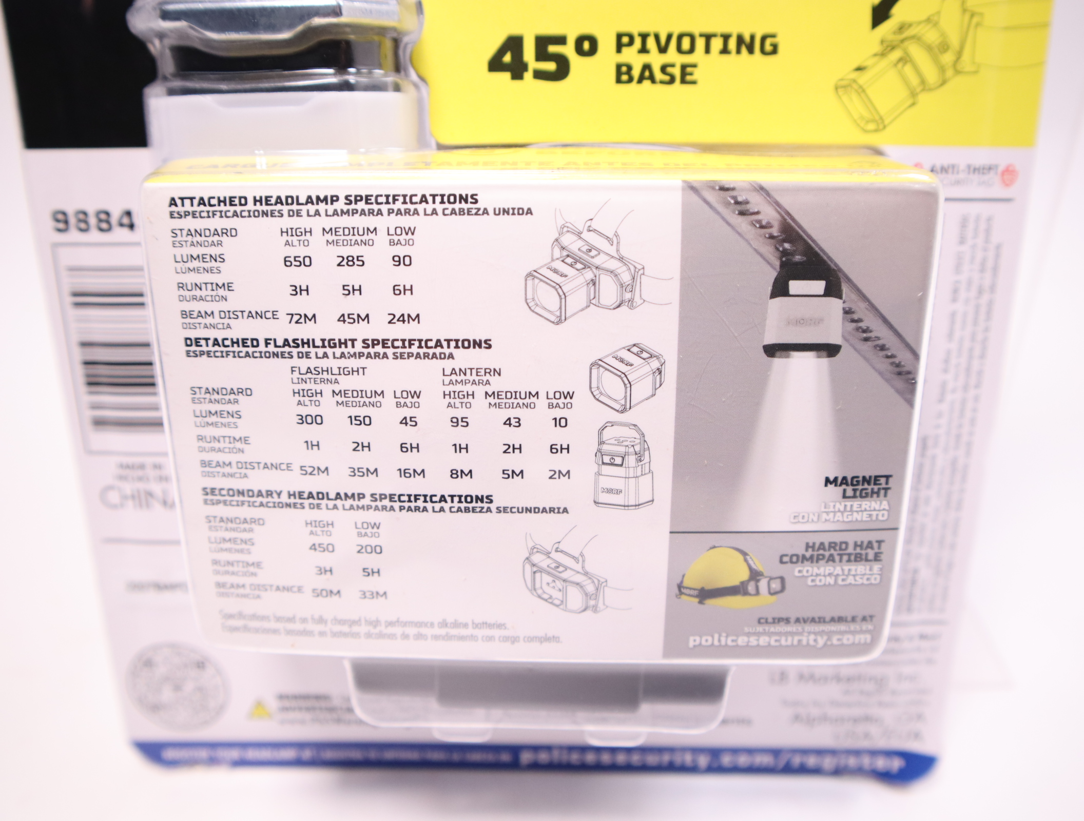 Light Output: Attached Headlamp: 300 Lumens; Detached Flashlight: 120 Lumens; Headlamp Base: 80 Lumens