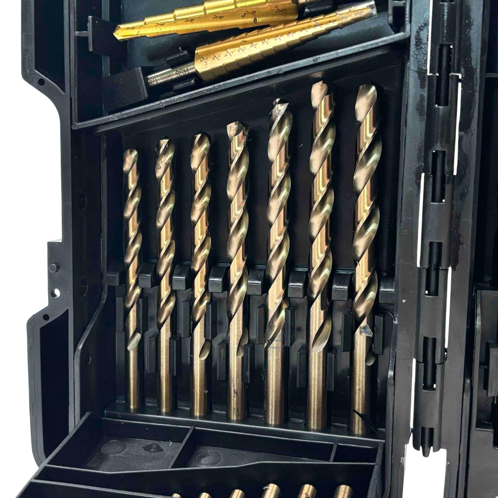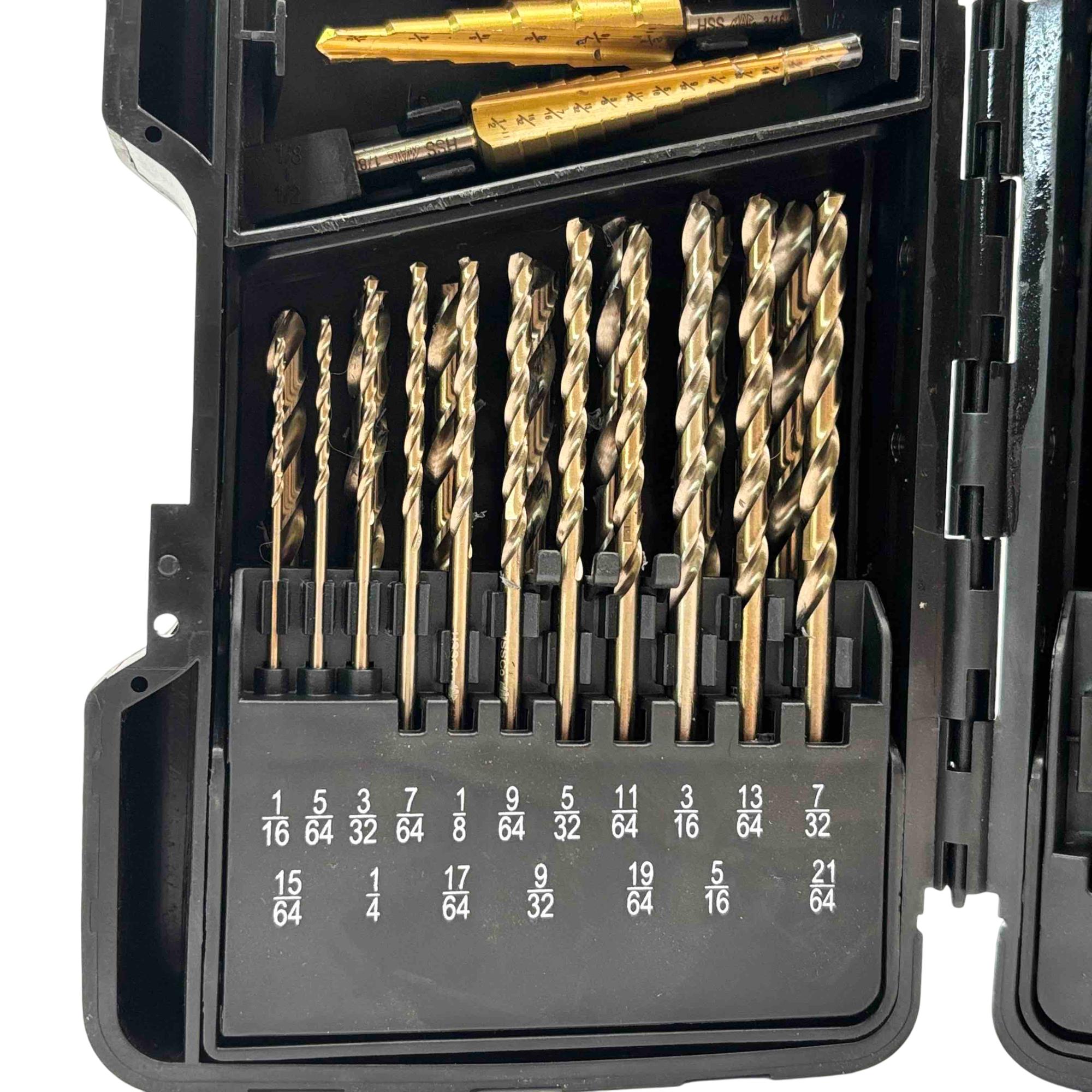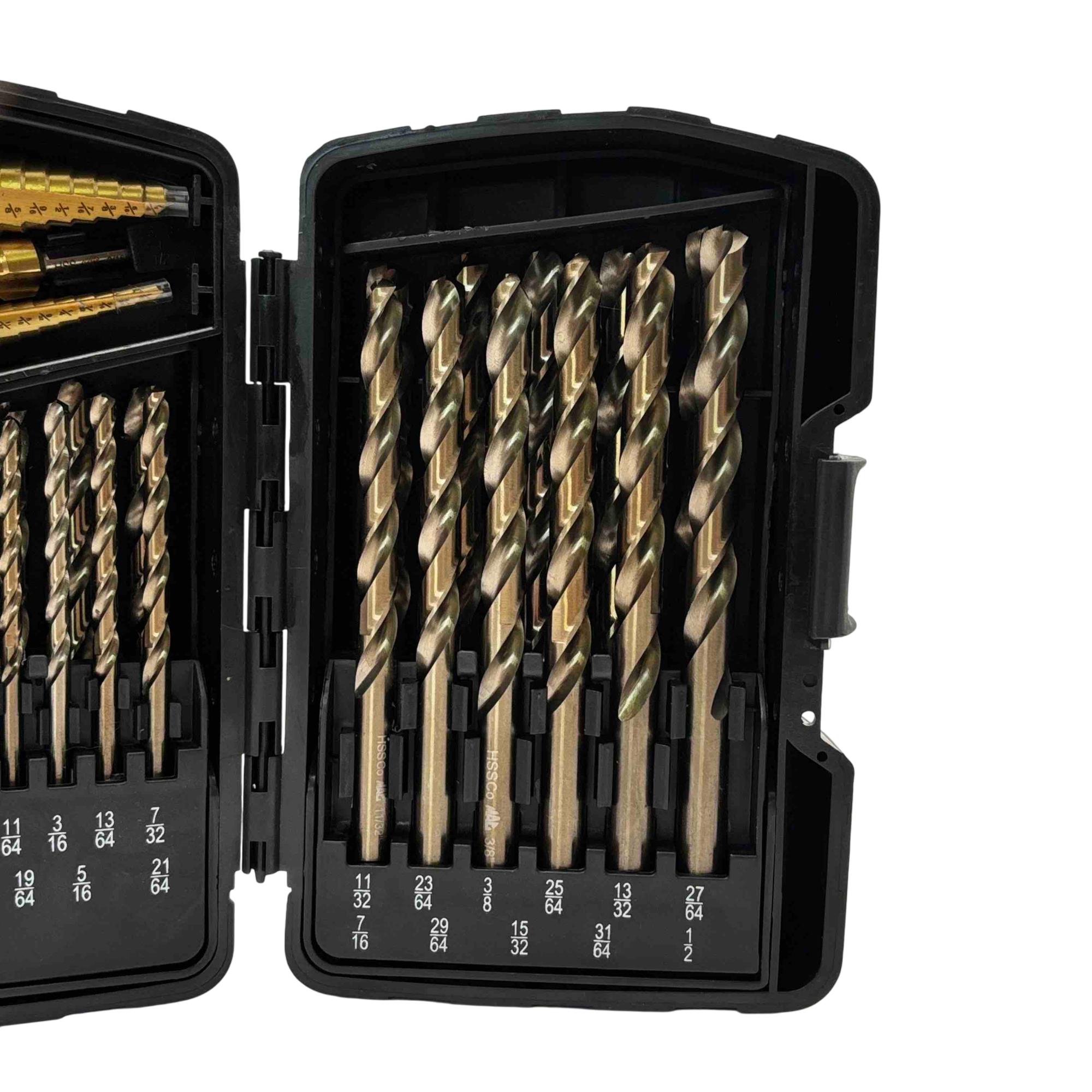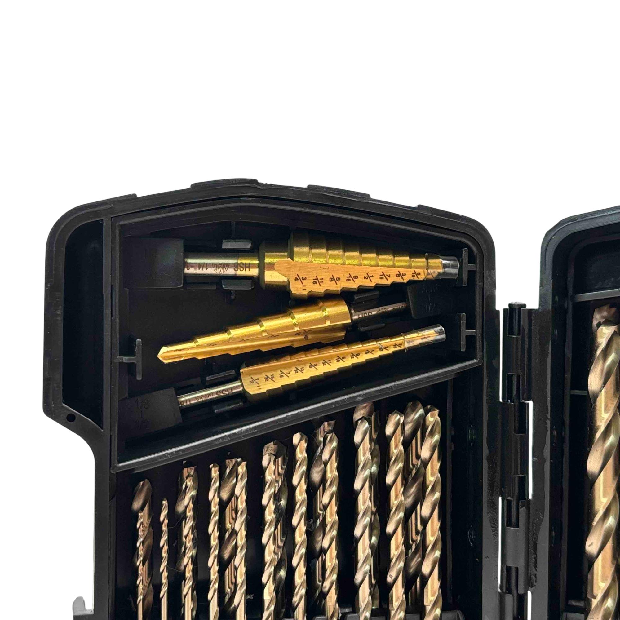 A 32-piece drill and step bit set featuring titanium-nitride coating for enhanced durability. The VA502T step bits are designed to drill twenty-eight hole sizes ranging from 1/8” to 3/4”, ideal for working with thin materials such as sheet metal, plastic, and wood. These bits are self-starting with dual radial concave flutes to ensure clean entry. The 6338DSB drill bits are jobber-length and suitable for tougher applications including stainless steel, heat-treated steel, forgings, and chilled cast iron. They feature a 135° heavy-duty split point for self-centering and reduced torque requirements. The set includes three step bits (1/8”–1/2”, 3/16”–1/2”, and 1/4”–3/4”) and a complete range of standard bits from 1/16” to 1/2”.