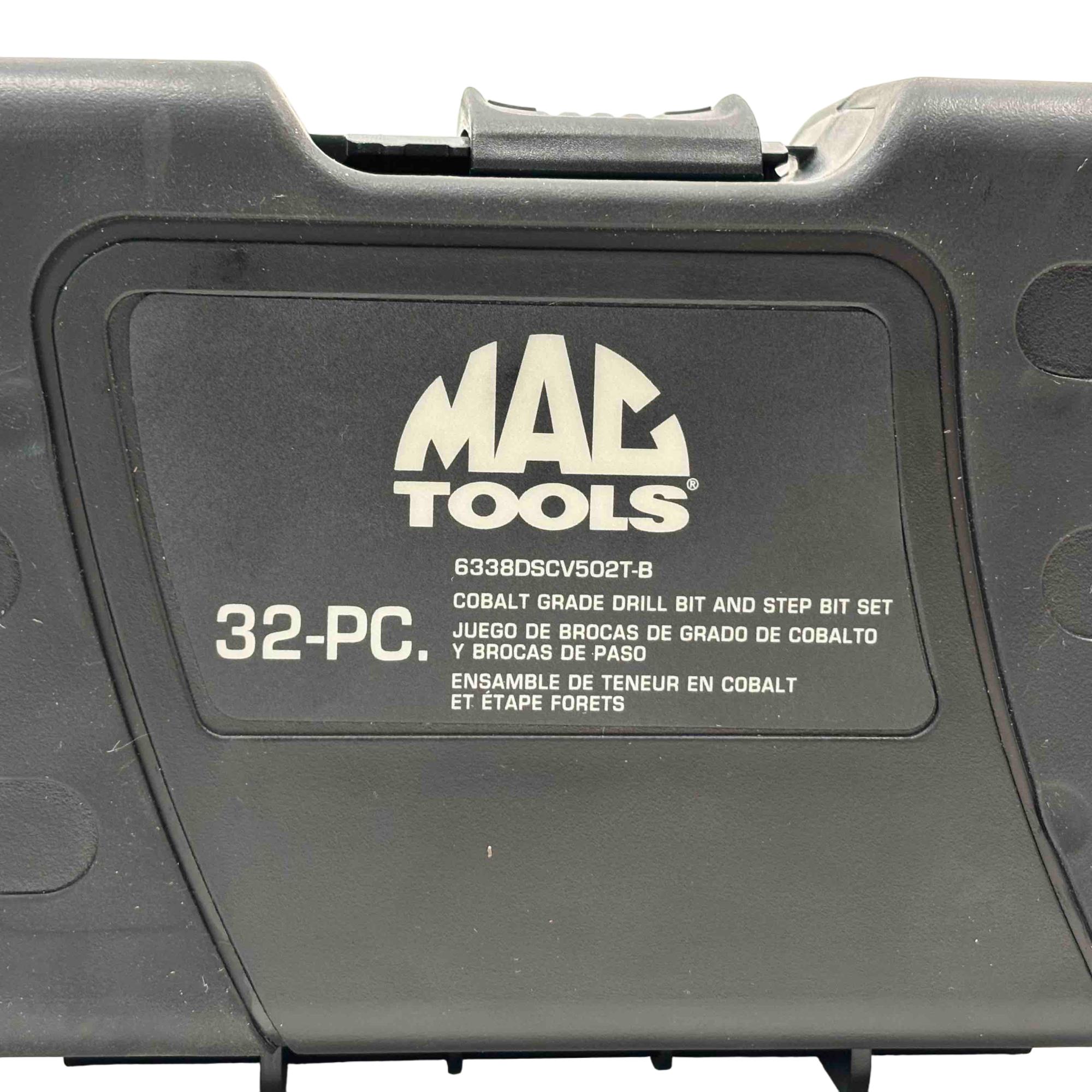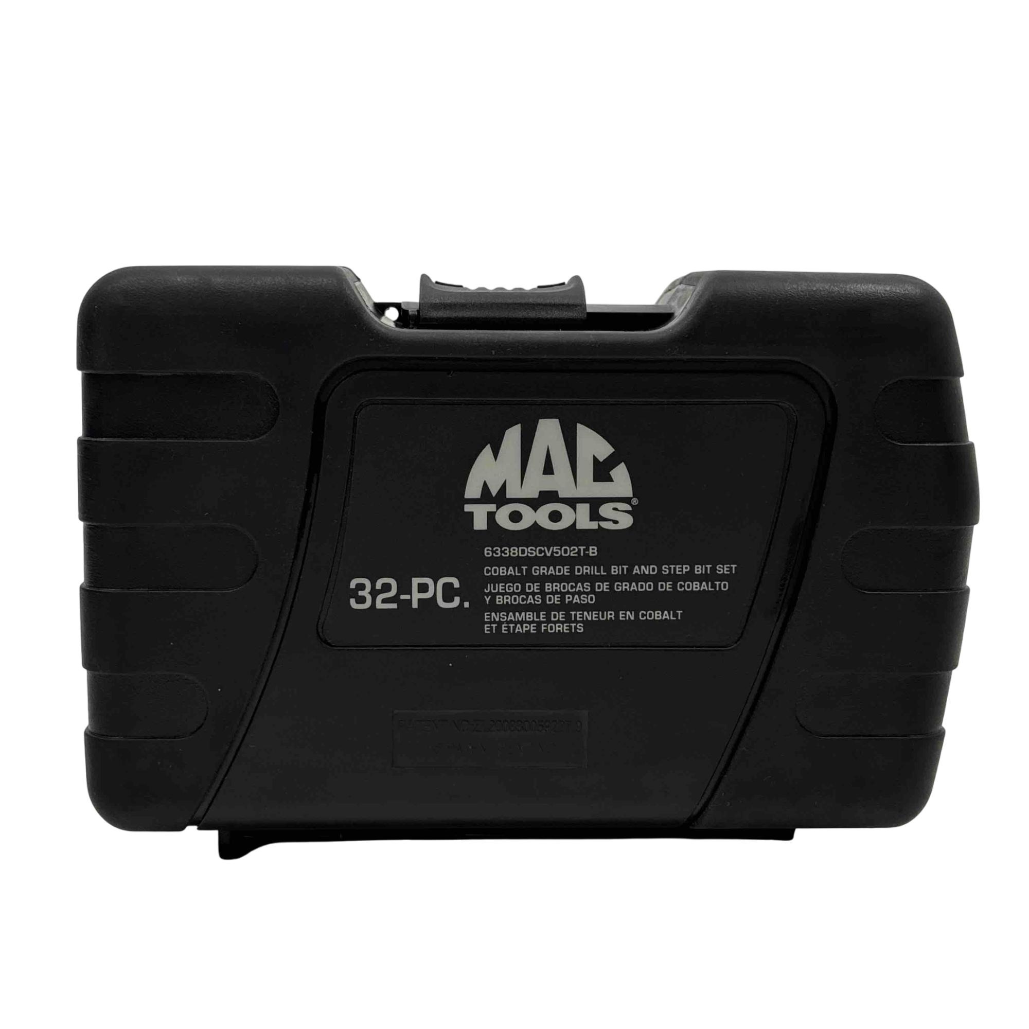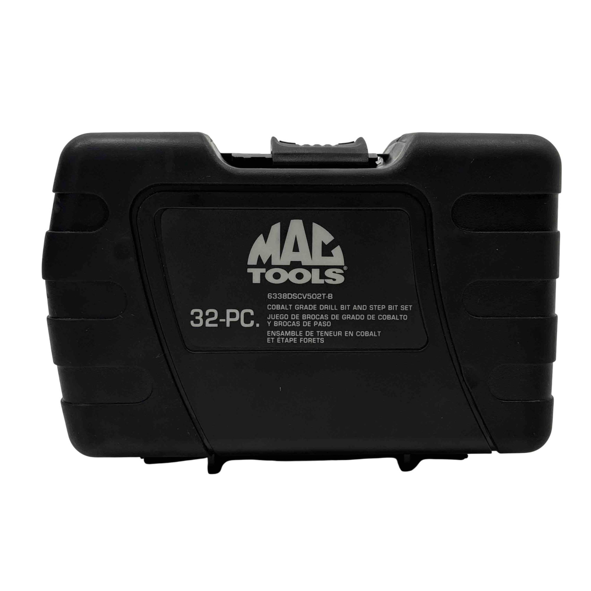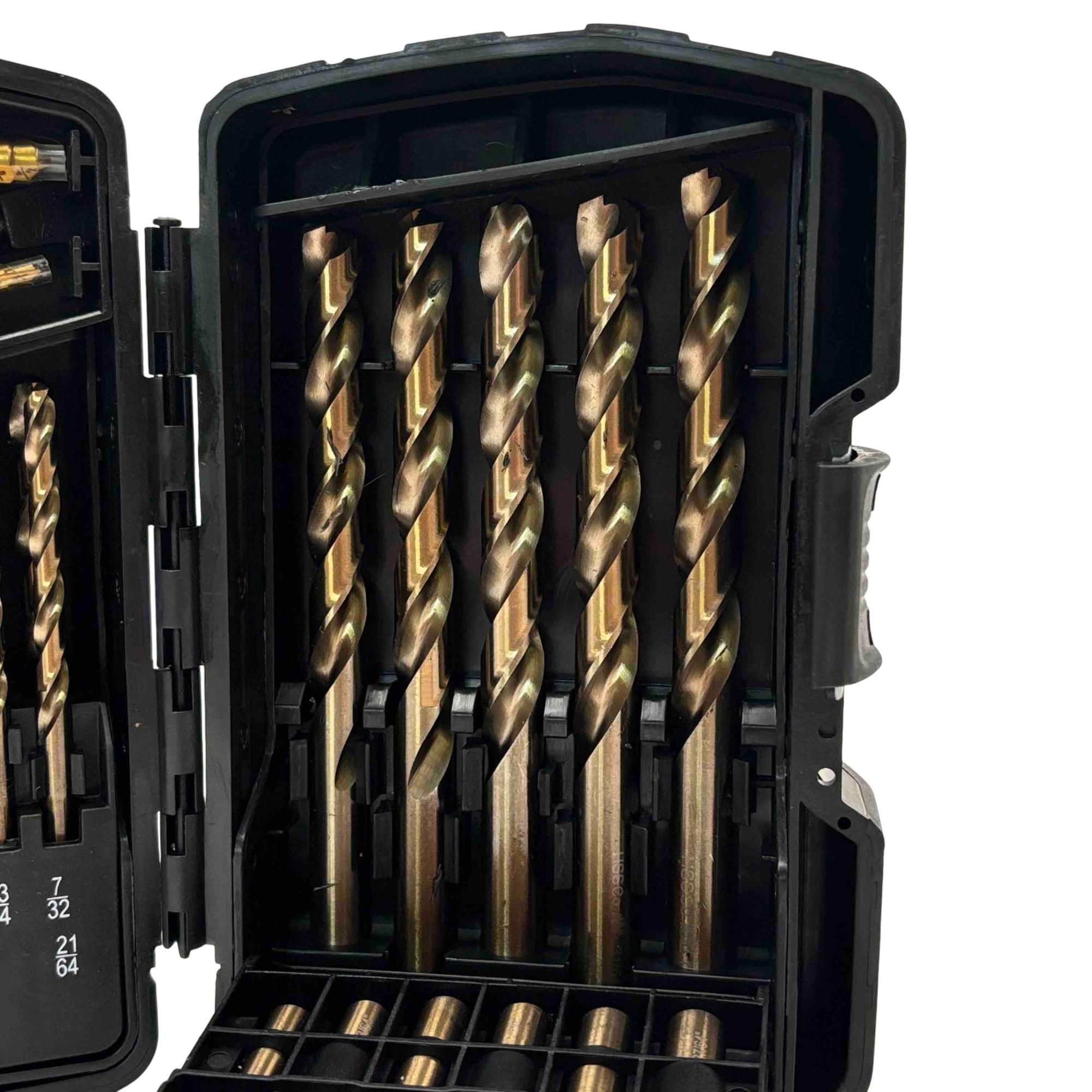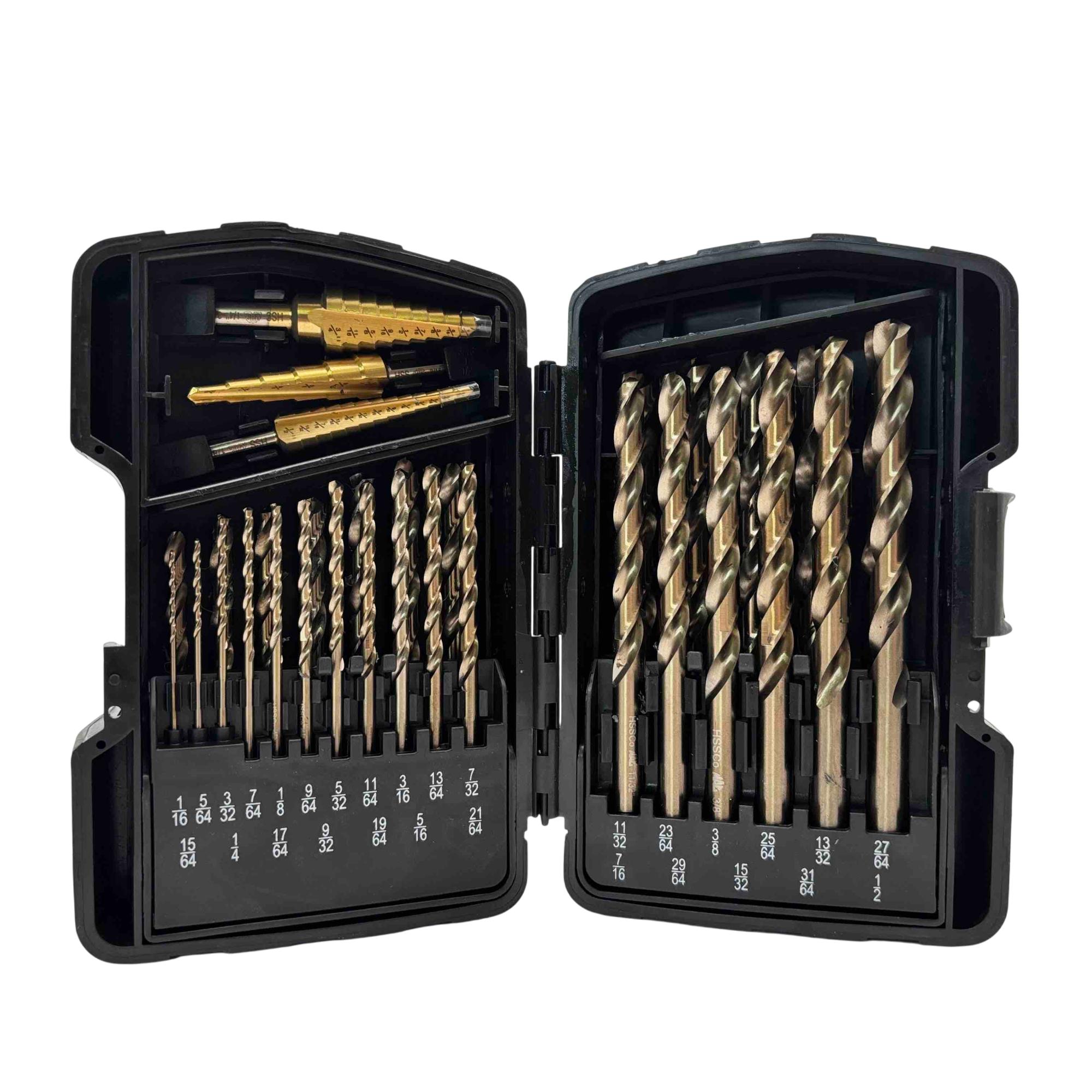 A 32-piece drill and step bit set featuring titanium-nitride coating for enhanced durability. The VA502T step bits are designed to drill twenty-eight hole sizes ranging from 1/8” to 3/4”, ideal for working with thin materials such as sheet metal, plastic, and wood. These bits are self-starting with dual radial concave flutes to ensure clean entry. The 6338DSB drill bits are jobber-length and suitable for tougher applications including stainless steel, heat-treated steel, forgings, and chilled cast iron. They feature a 135° heavy-duty split point for self-centering and reduced torque requirements. The set includes three step bits (1/8”–1/2”, 3/16”–1/2”, and 1/4”–3/4”) and a complete range of standard bits from 1/16” to 1/2”.