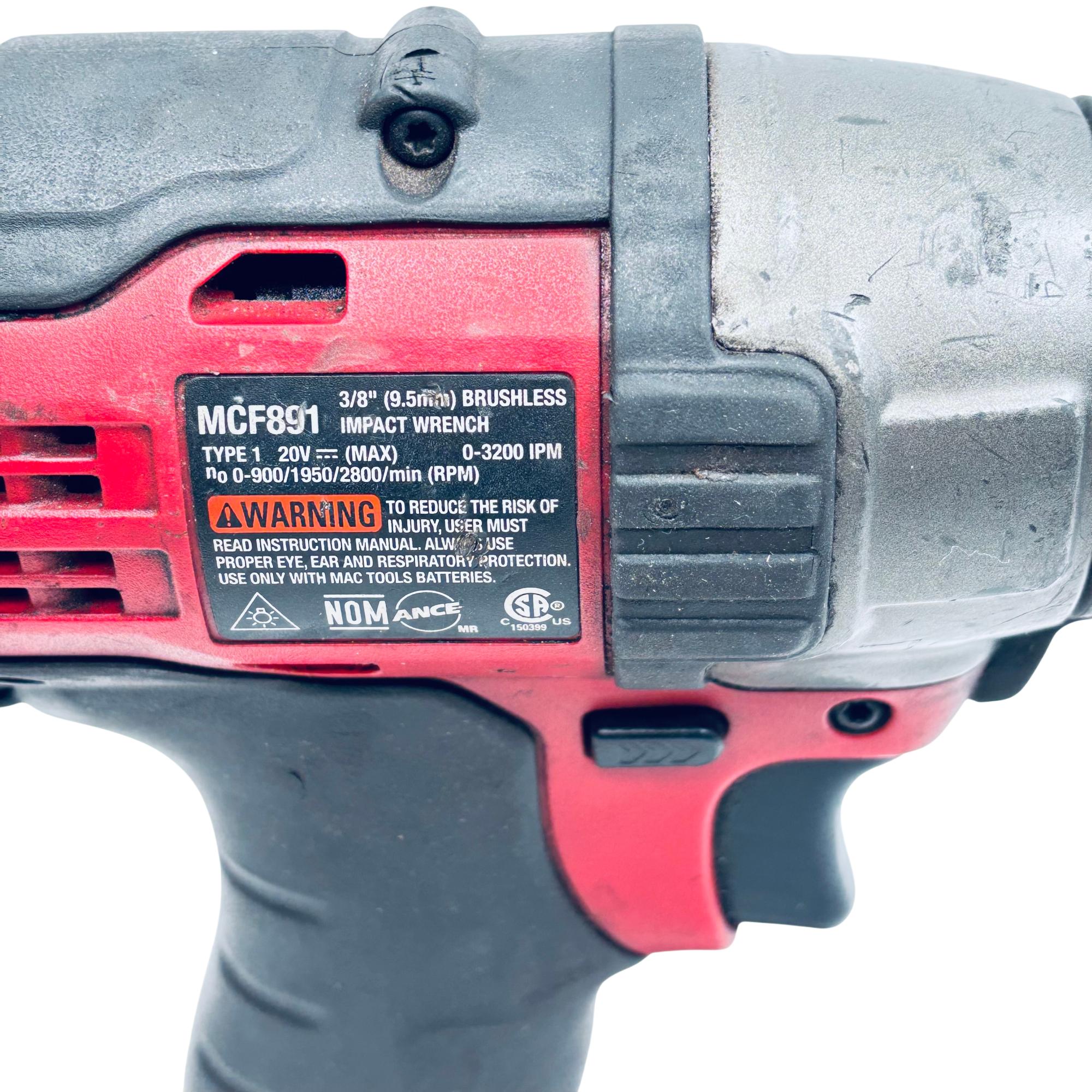 Mac Tools MCF891 20V MAX 3/8" Drive Brushless Cordless Impact Wrench combines powerful brushless motor technology with a compact, lightweight design for enhanced performance and durability. This cordless impact wrench delivers up to 3200 impacts per minute and variable speeds up to 2800 RPM, making it ideal for fastening and loosening tasks in automotive and industrial applications. Ergonomically designed with safety warnings and intended for use with compatible Mac Tools batteries, it ensures reliable and efficient operation.