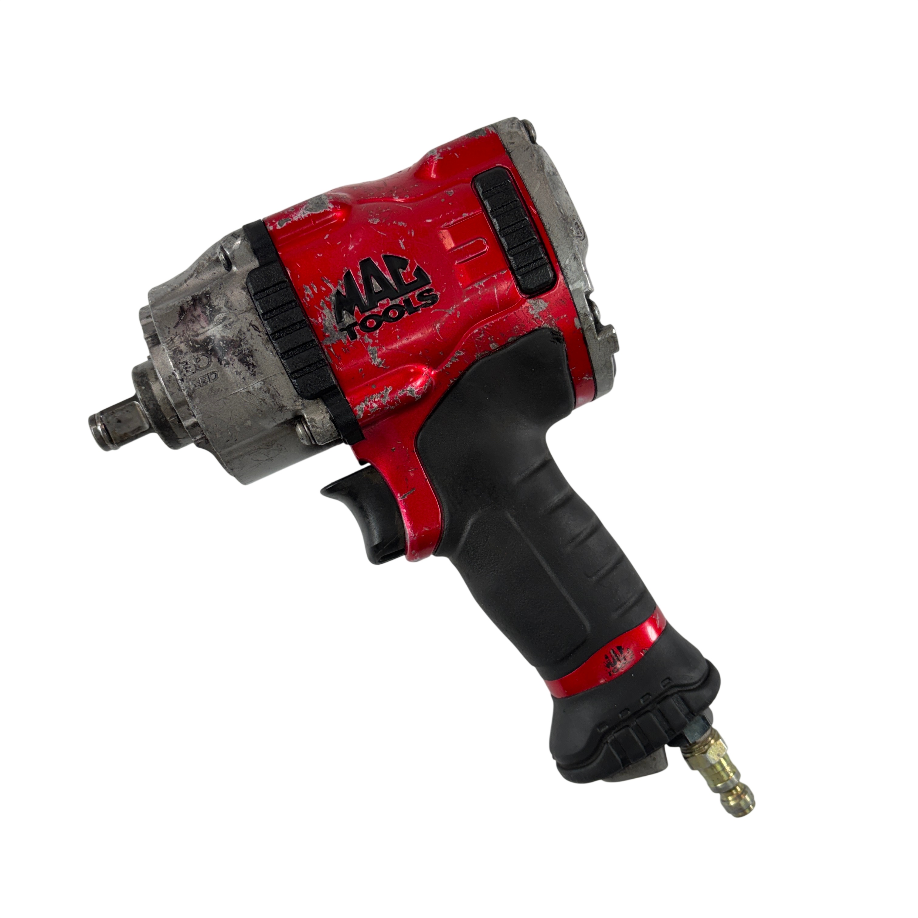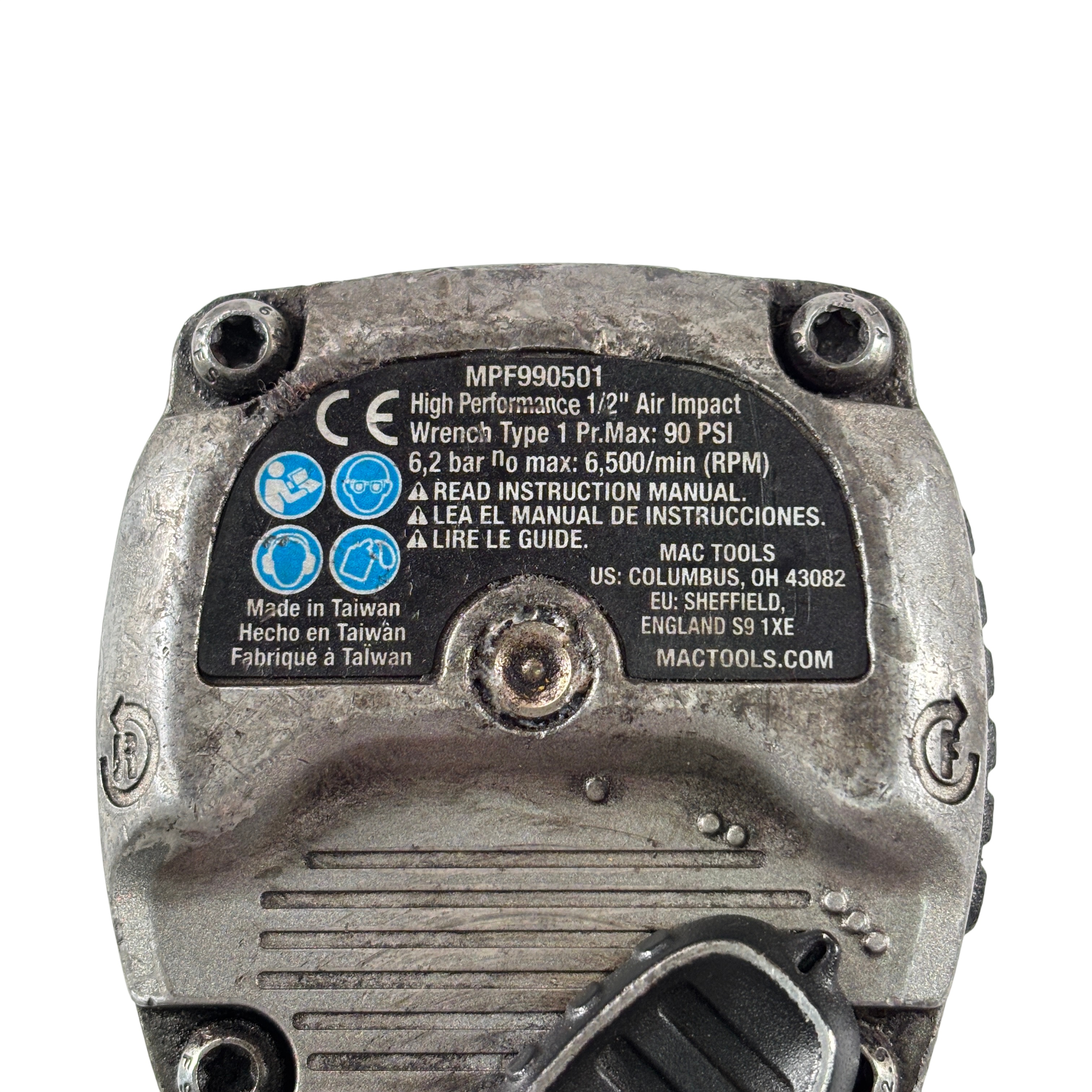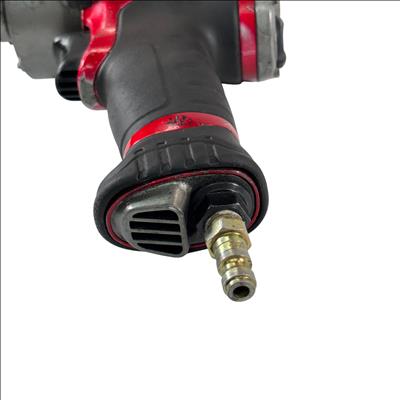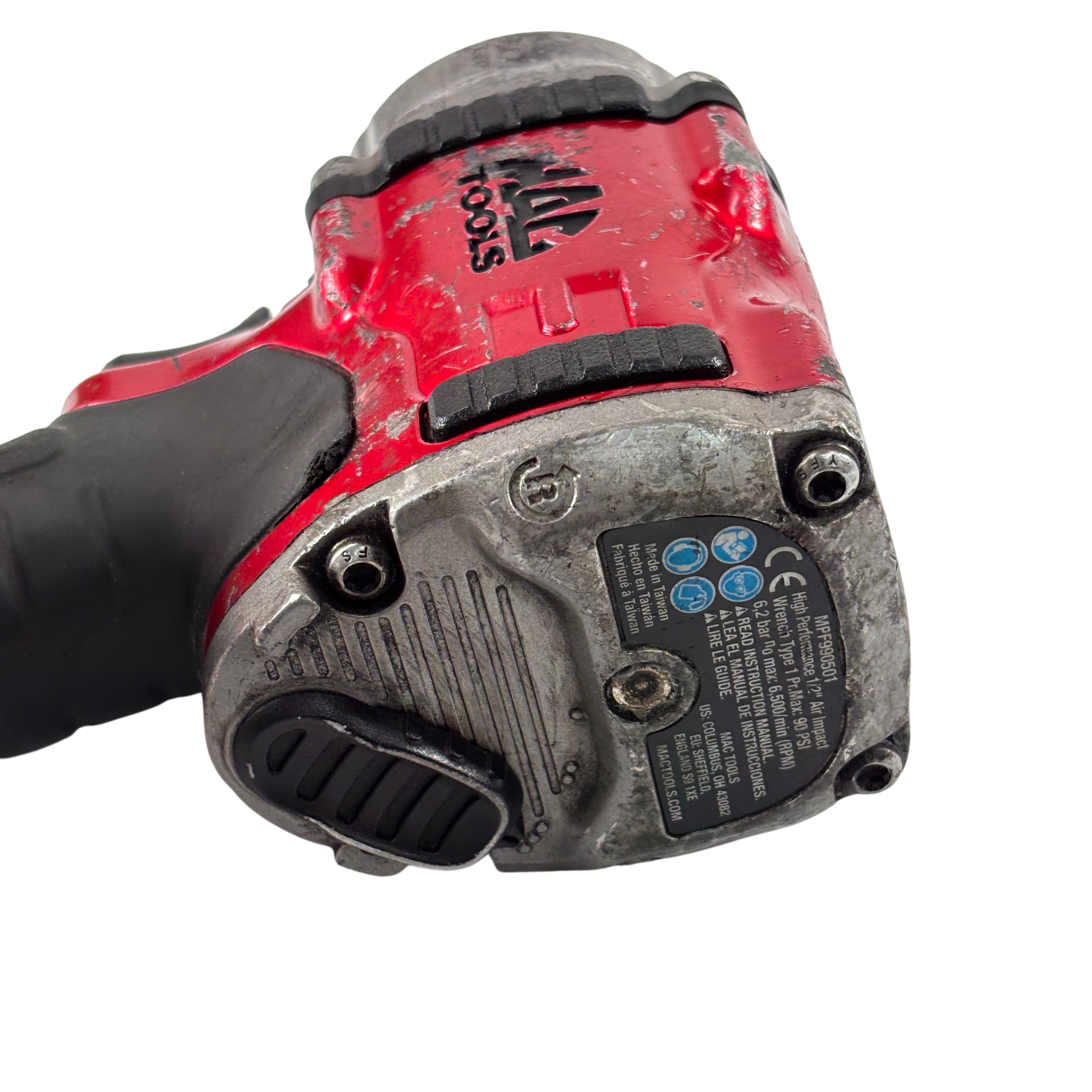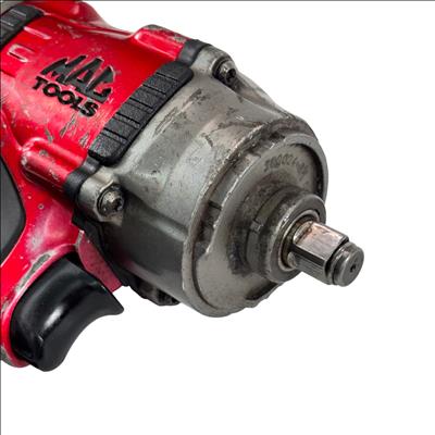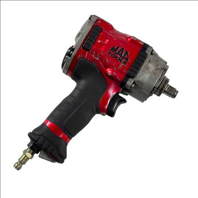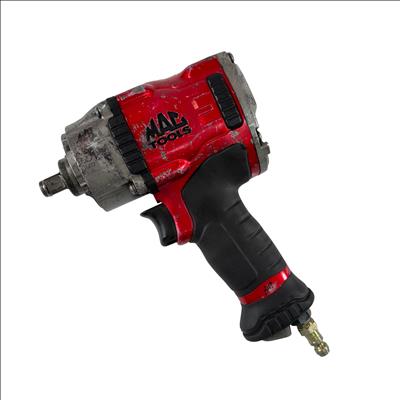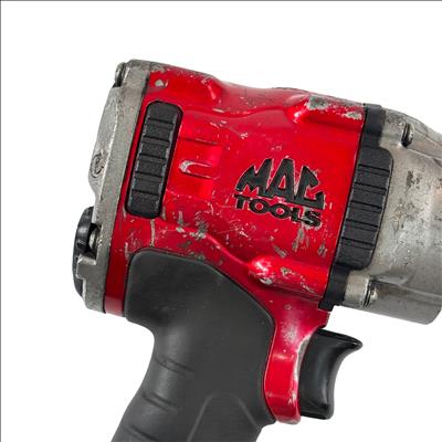 The Mac Tools MPF990501 Pneumatic Compact 1/2" Drive Heavy-Duty Air Impact Wrench is durable and lightweight with a forged anvil for long life. It includes a removable LED light and a variable-speed trigger for precise control. The magnesium housing reduces weight to 4.8 lbs., and the forward handle provides comfort and balance.