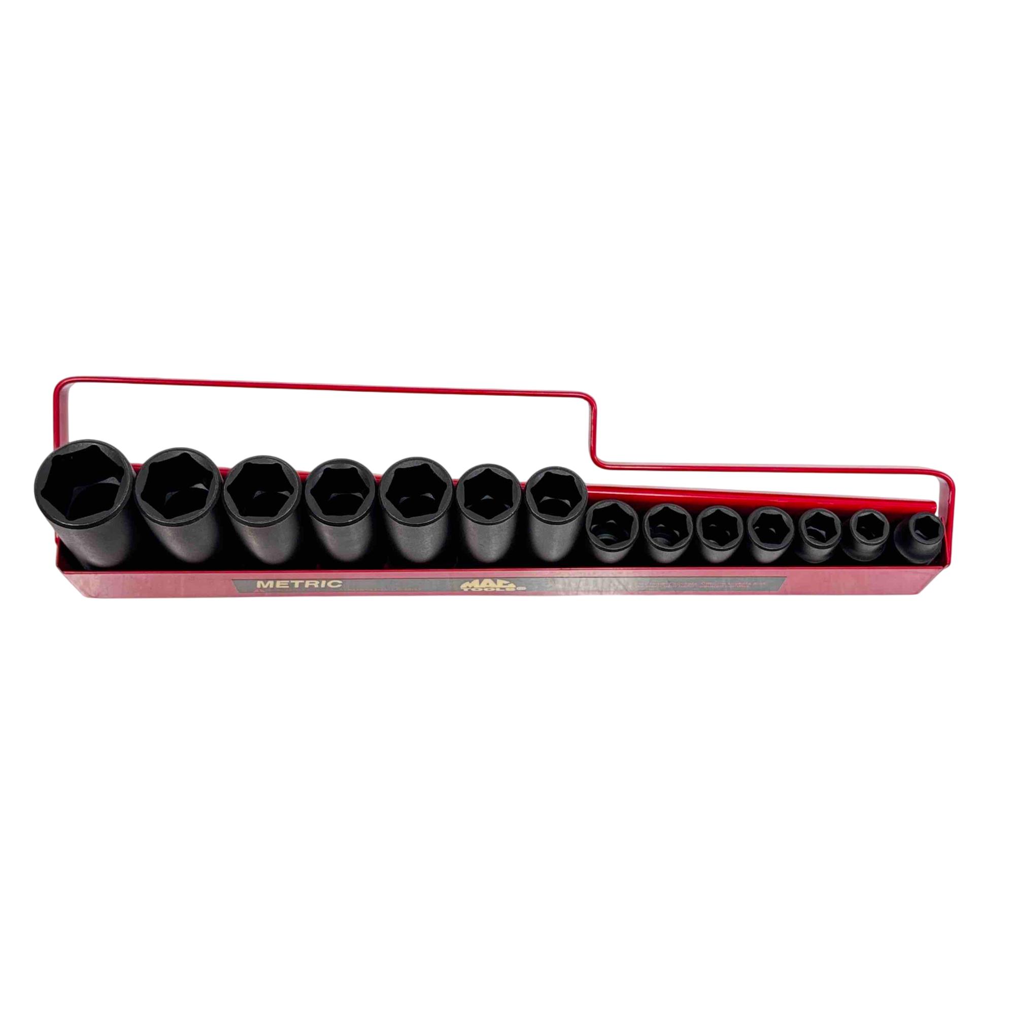 Upgrade your workshop with the Mac Tools XDP6 14-piece Metric Impact Socket Set, engineered for durability and performance. Housed in a striking red metal tray, this set features premium black impact sockets ranging from small to large sizes, perfect for professional mechanics and automotive enthusiasts alike. Experience the reliability and strength of Mac Tools for your toughest jobs.