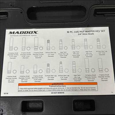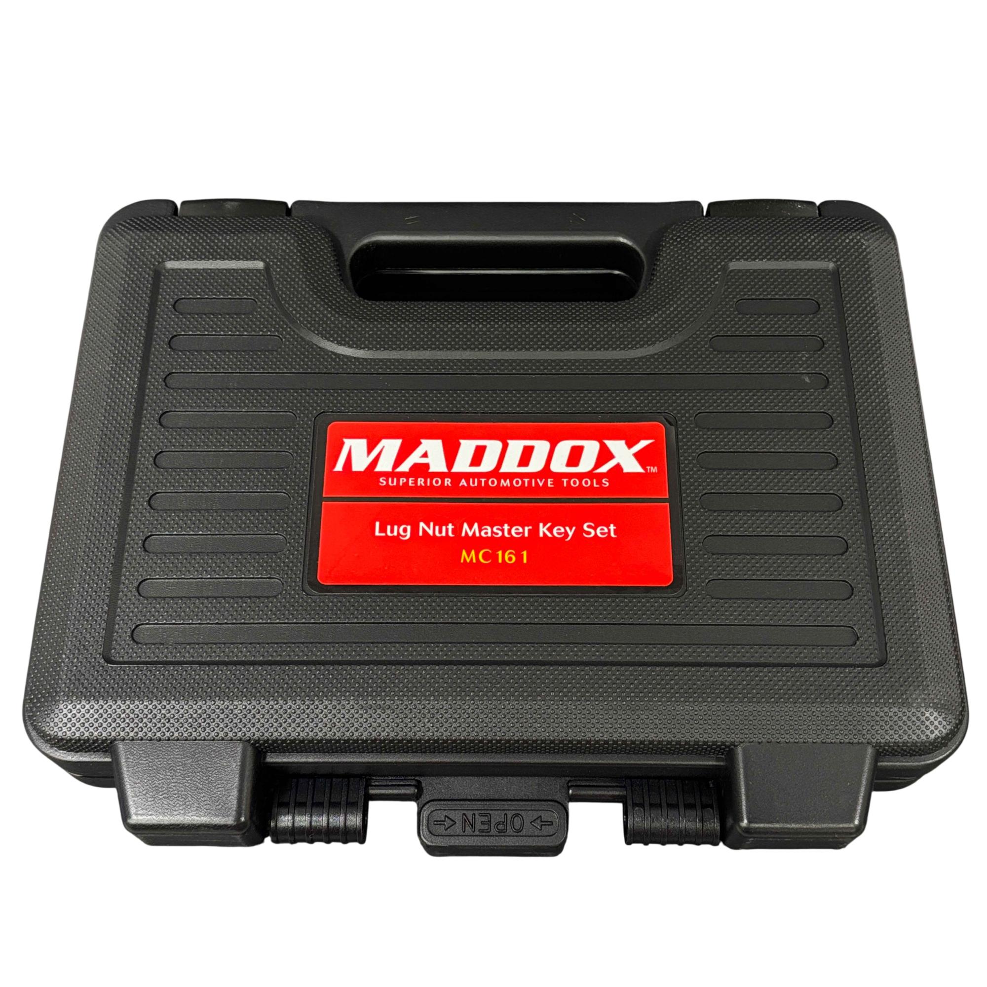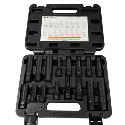 Maddox MC161 16-Piece Lug Nut Master Key Set provides a comprehensive solution for removing locking lug nuts without damaging wheels. This set features thin wall sockets with a black oxide finish and heat-treated chrome construction, designed to fit a variety of spline and star lug nut patterns. Extra-long keys help keep your wrench clear of the wheel surface, reducing the risk of nicks and scratches during automotive maintenance.