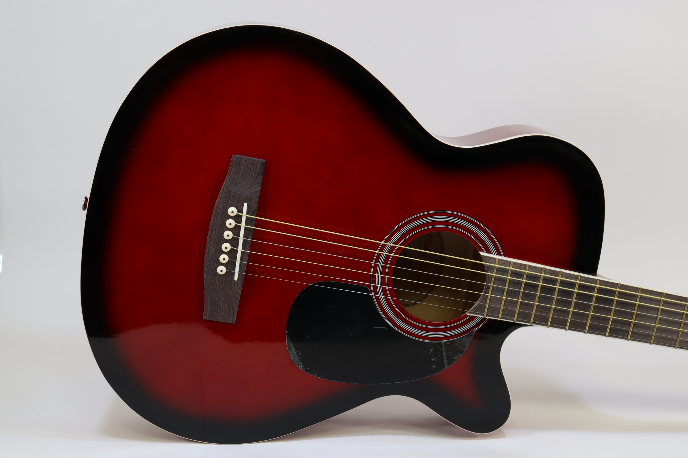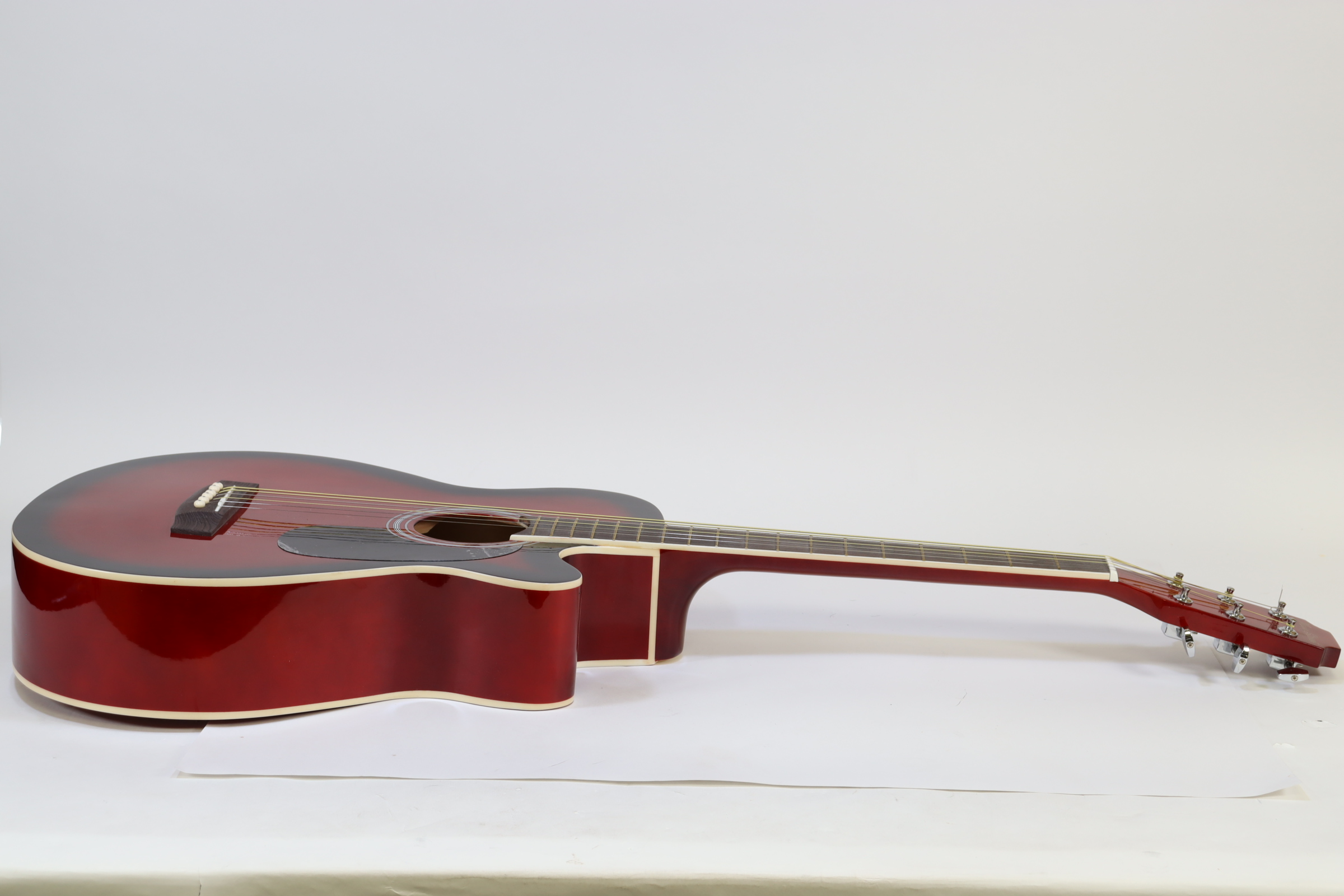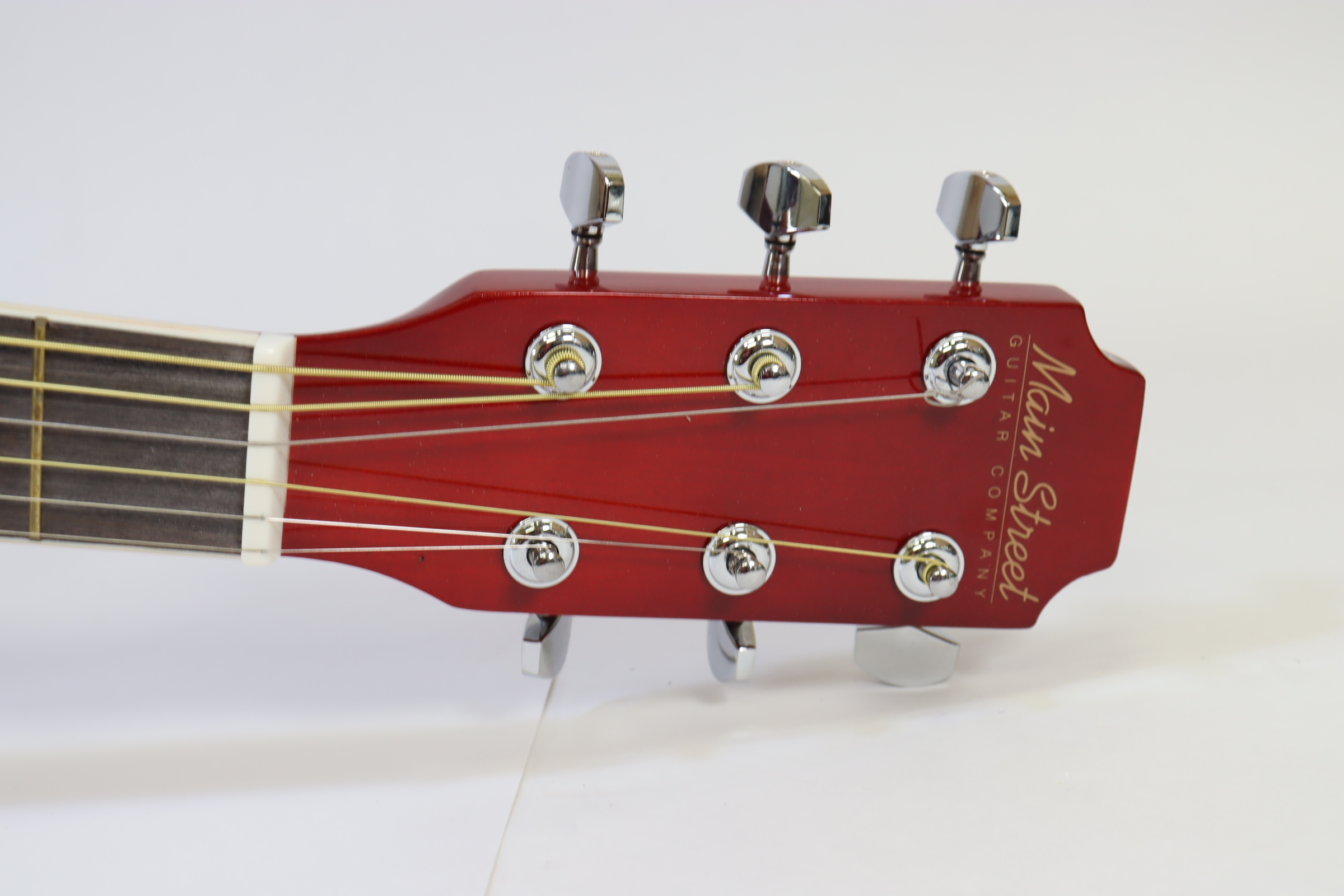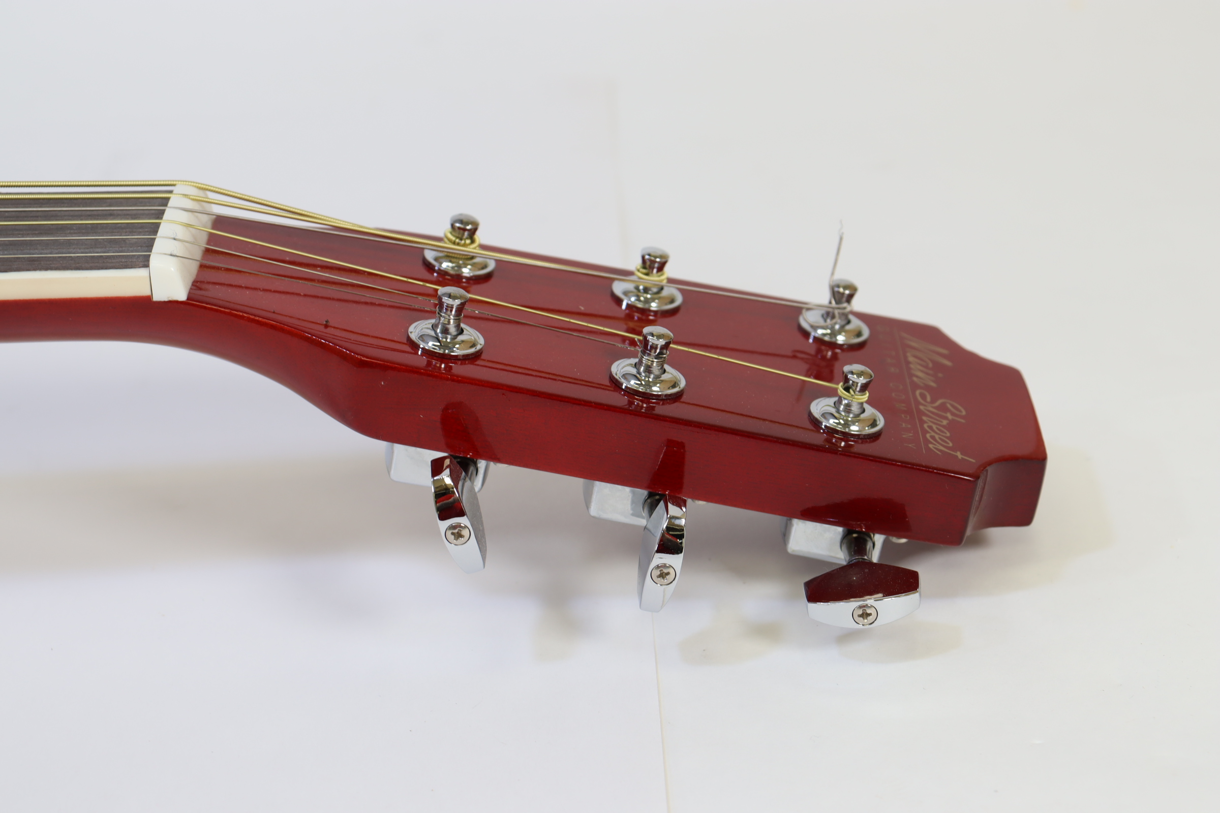The MAS38SB, from the MAS38 Series Main Street Acoustic Guitars, features a 38-Inch, standard size body with a cutaway design for easier playing. This concert size makes for a better fit with younger or smaller-framed players than the jumbo dreadnoughts. It has a transparent red finish, linden top, back, and sides, catalpa neck with non-adjustable truss rod, steel strings and a dark-stained maple fingerboard and bridge. It also features 3:1 ratio plank-style tuners with chrome tuning keys, 18 frets and cream body and fingerboard binding. The overall size measures 37.75” L x 14.13” W x 4” D with the neck joining to the body at the 12th fret.