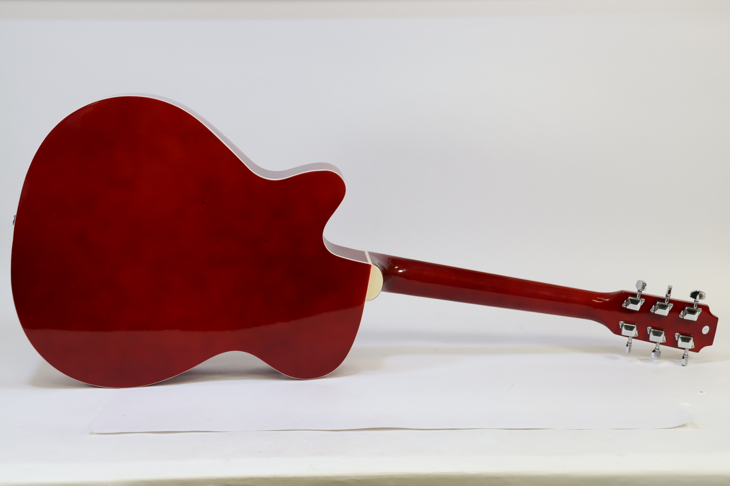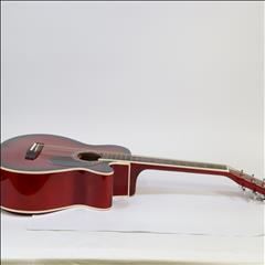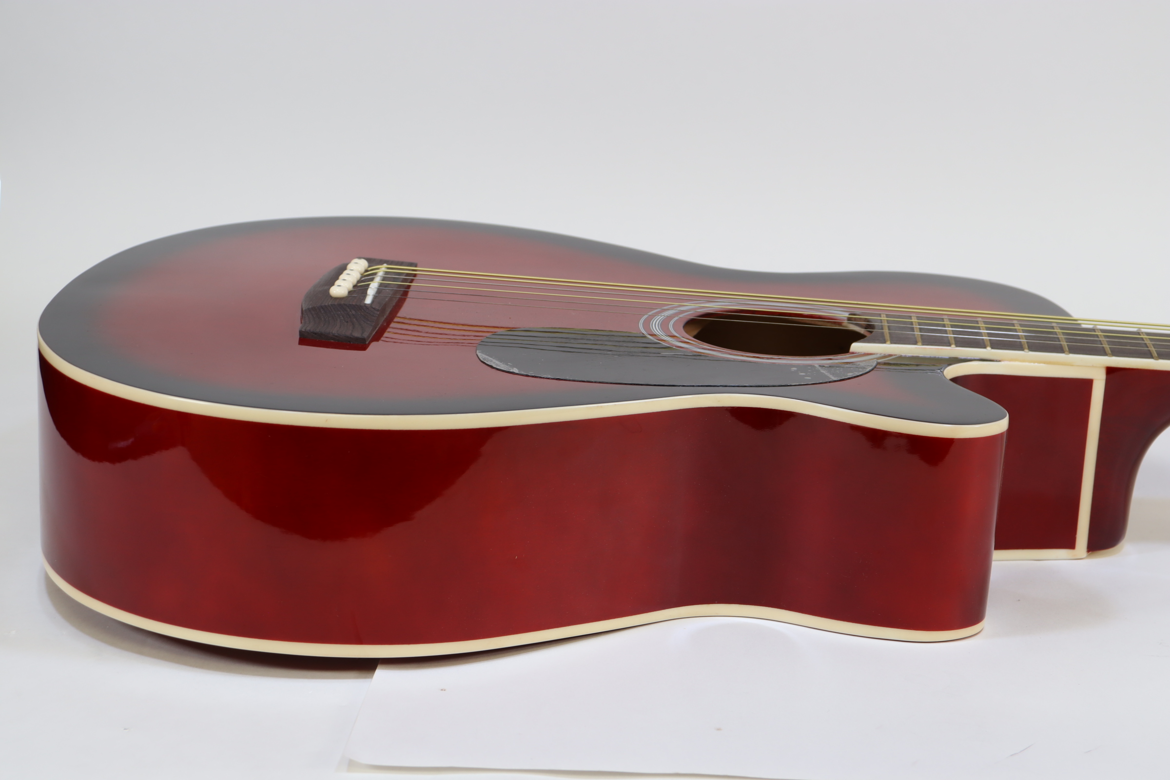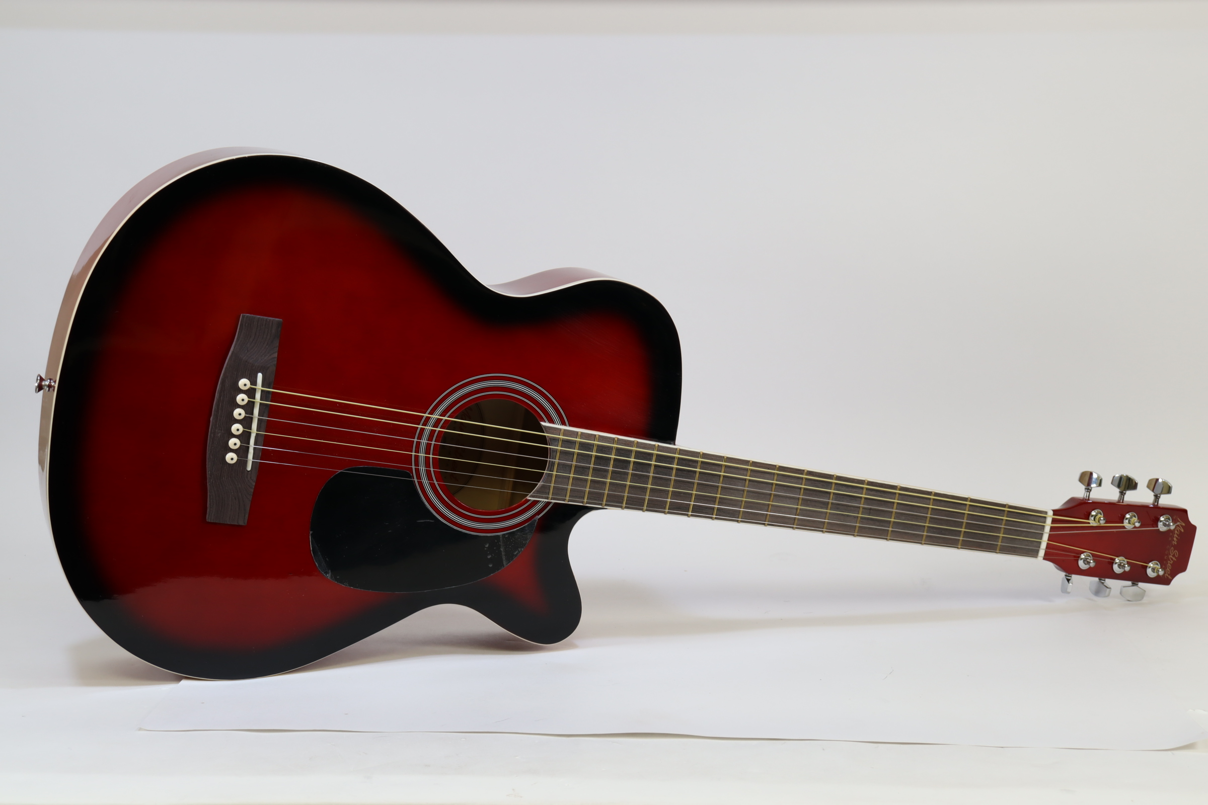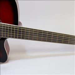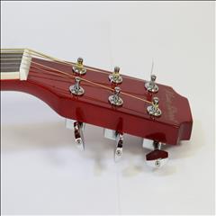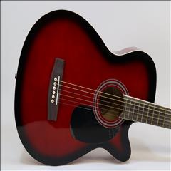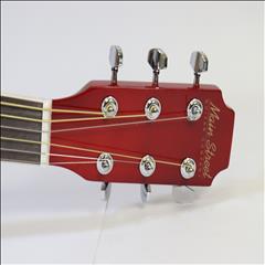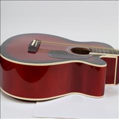 The MAS38SB, from the MAS38 Series Main Street Acoustic Guitars, features a 38-Inch, standard size body with a cutaway design for easier playing. This concert size makes for a better fit with younger or smaller-framed players than the jumbo dreadnoughts. It has a transparent red finish, linden top, back, and sides, catalpa neck with non-adjustable truss rod, steel strings and a dark-stained maple fingerboard and bridge. It also features 3:1 ratio plank-style tuners with chrome tuning keys, 18 frets and cream body and fingerboard binding. The overall size measures 37.75” L x 14.13” W x 4” D with the neck joining to the body at the 12th fret.