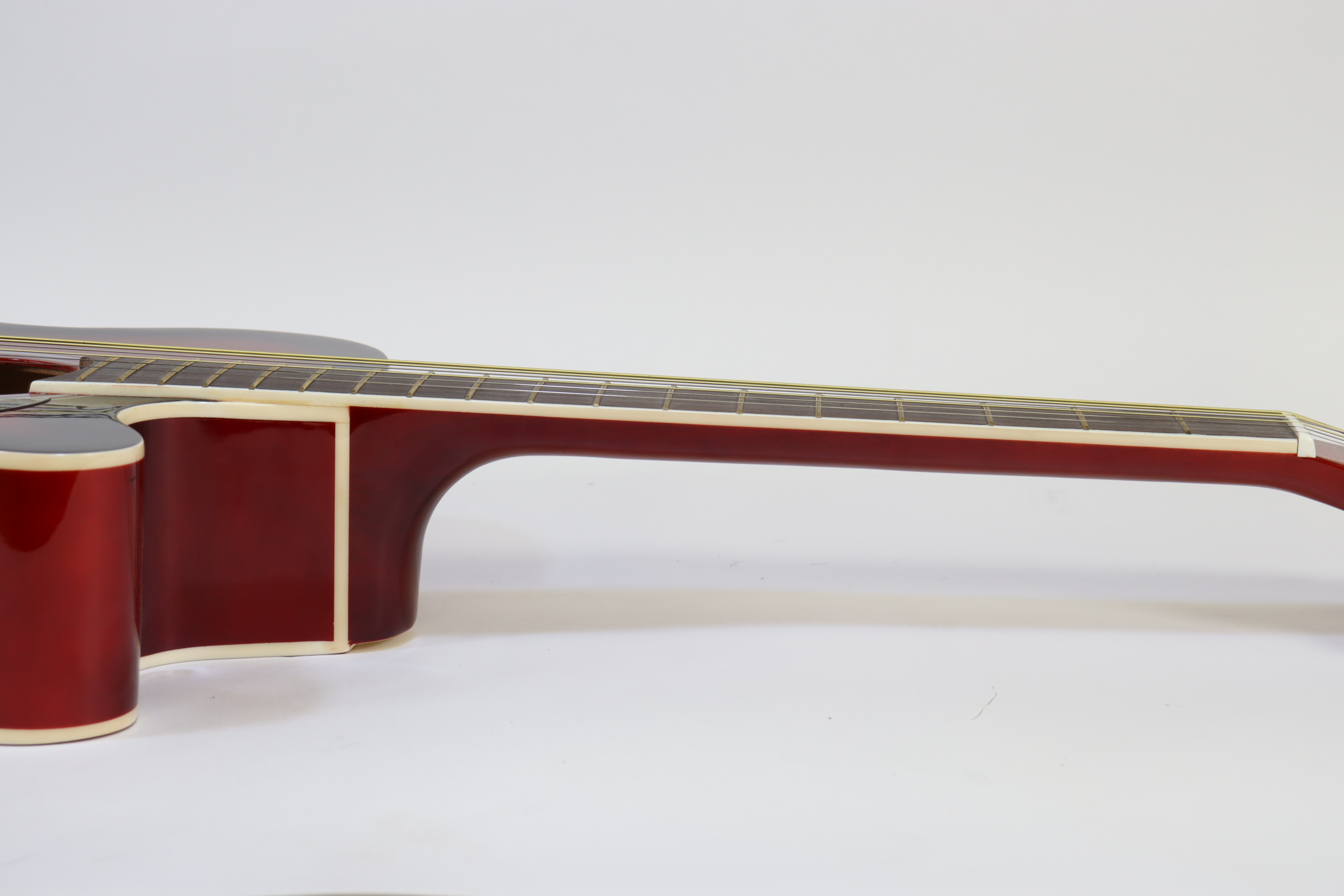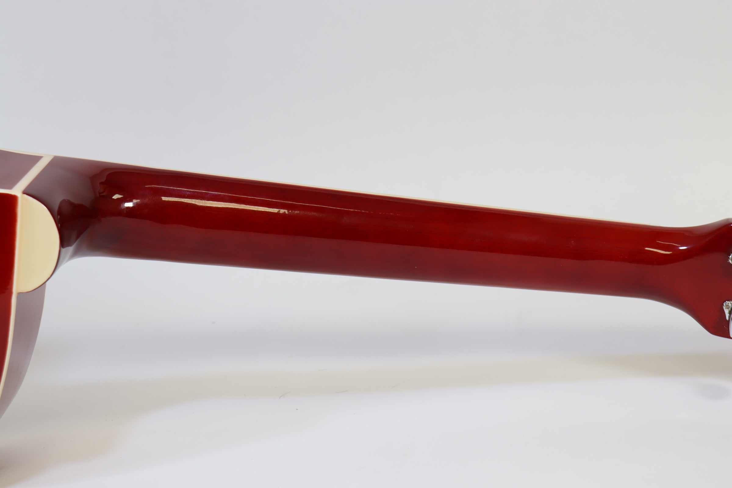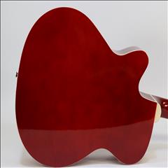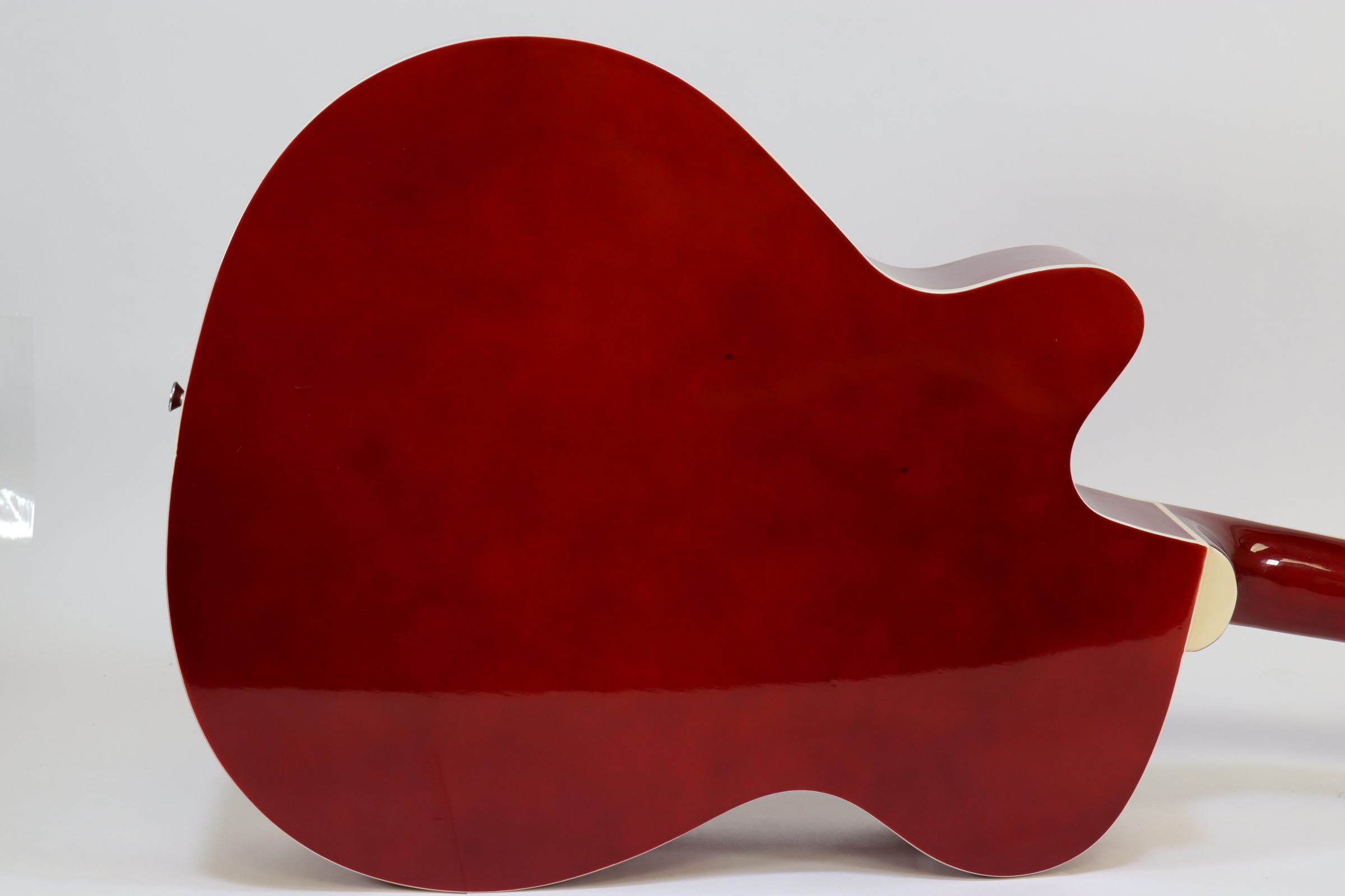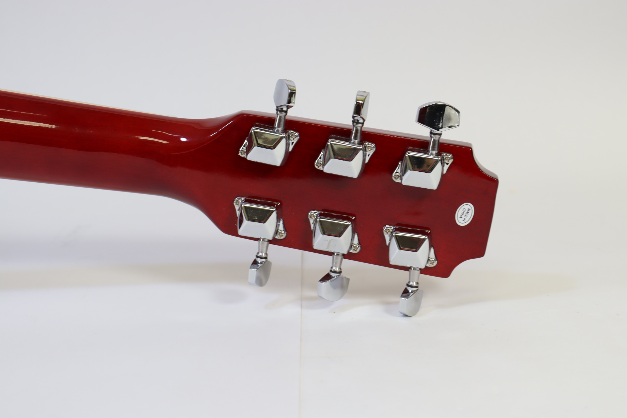 The MAS38SB, from the MAS38 Series Main Street Acoustic Guitars, features a 38-Inch, standard size body with a cutaway design for easier playing. This concert size makes for a better fit with younger or smaller-framed players than the jumbo dreadnoughts. It has a transparent red finish, linden top, back, and sides, catalpa neck with non-adjustable truss rod, steel strings and a dark-stained maple fingerboard and bridge. It also features 3:1 ratio plank-style tuners with chrome tuning keys, 18 frets and cream body and fingerboard binding. The overall size measures 37.75” L x 14.13” W x 4” D with the neck joining to the body at the 12th fret.