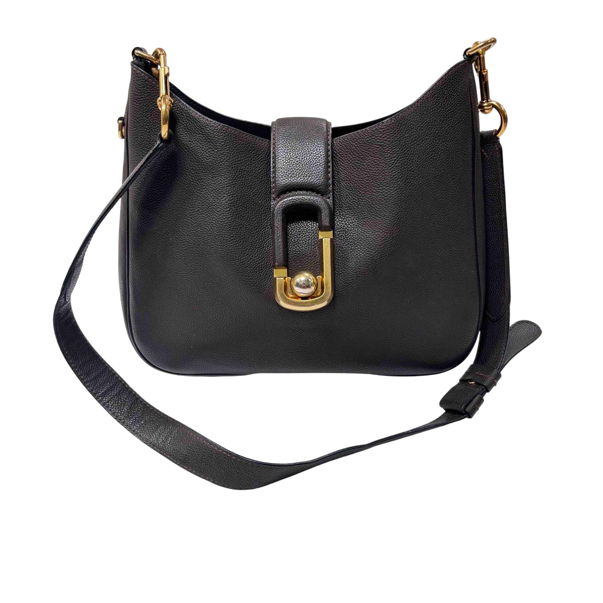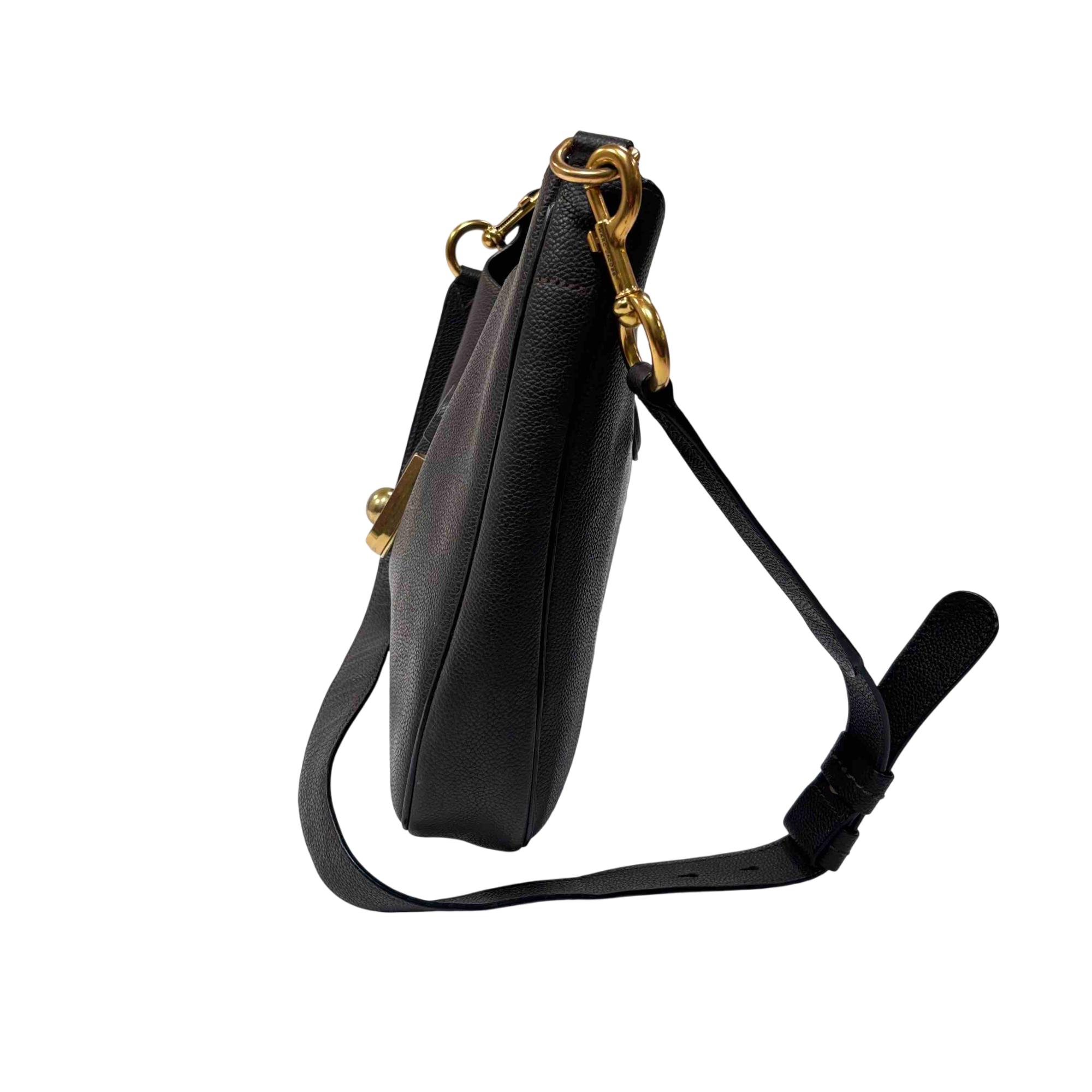 Elevate your style with the Marc Jacobs Interlock Small Leather Hobo Bag, crafted from premium black pebbled leather and finished with elegant gold-tone hardware. Its iconic interlock clasp and adjustable strap make it both chic and functional, perfect for everyday wear or a sophisticated night out. Make a statement with this luxurious and versatile accessory from Marc Jacobs.