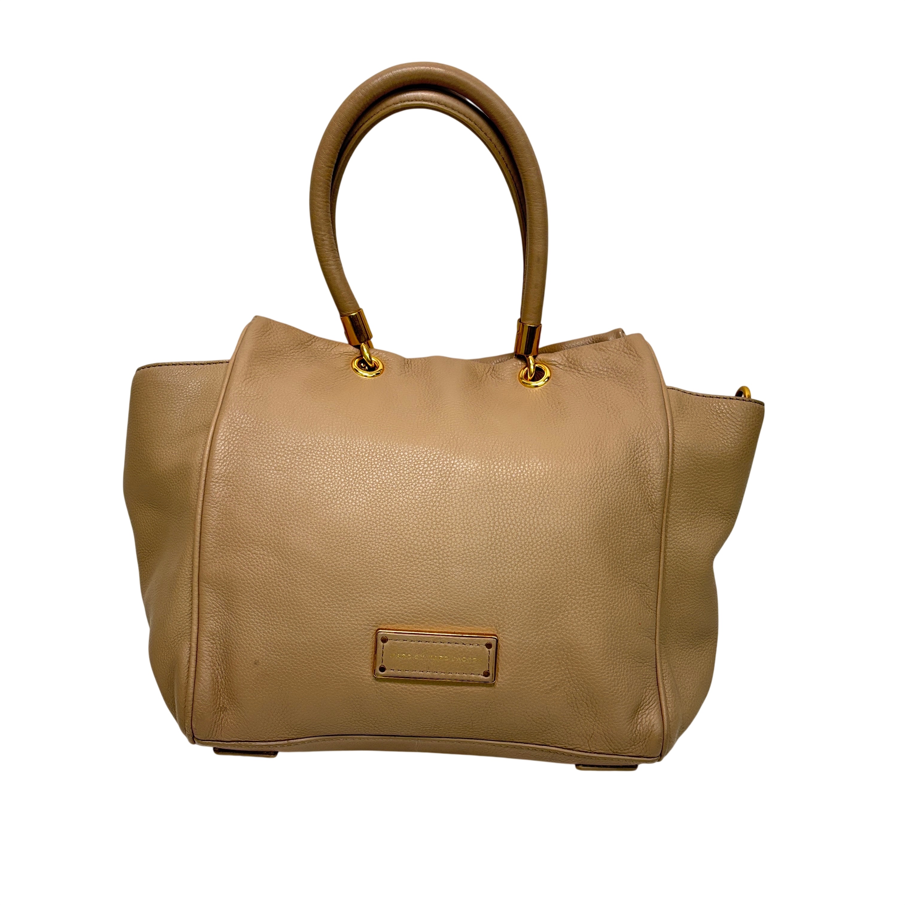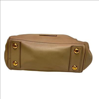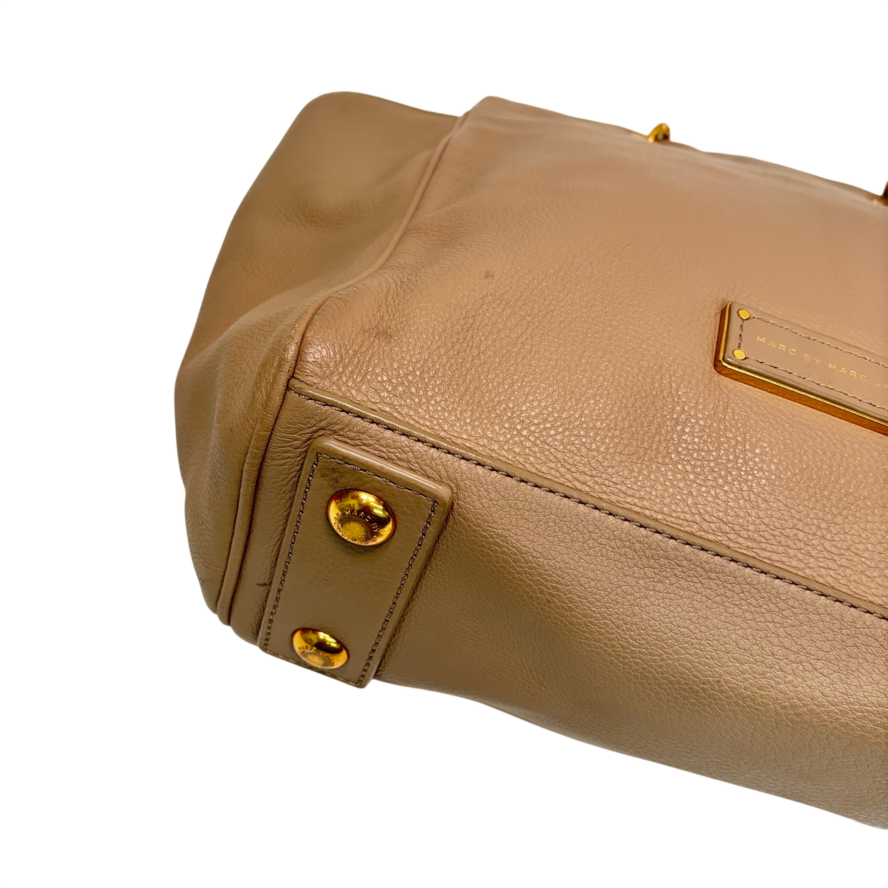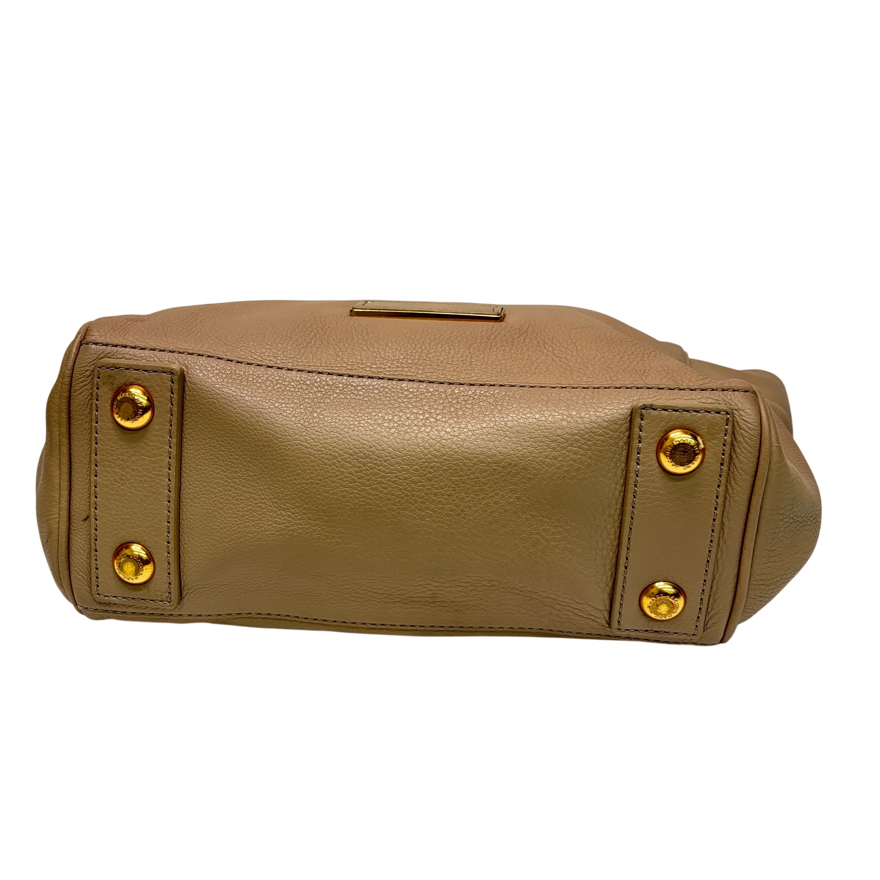 Marc Jacobs BENTLEY TOO HOT TO HANDLE Purse is crafted from high-quality beige leather with elegant gold-tone hardware accents. This stylish handbag features double rounded handles for comfortable carrying and a spacious interior perfect for organizing daily essentials.