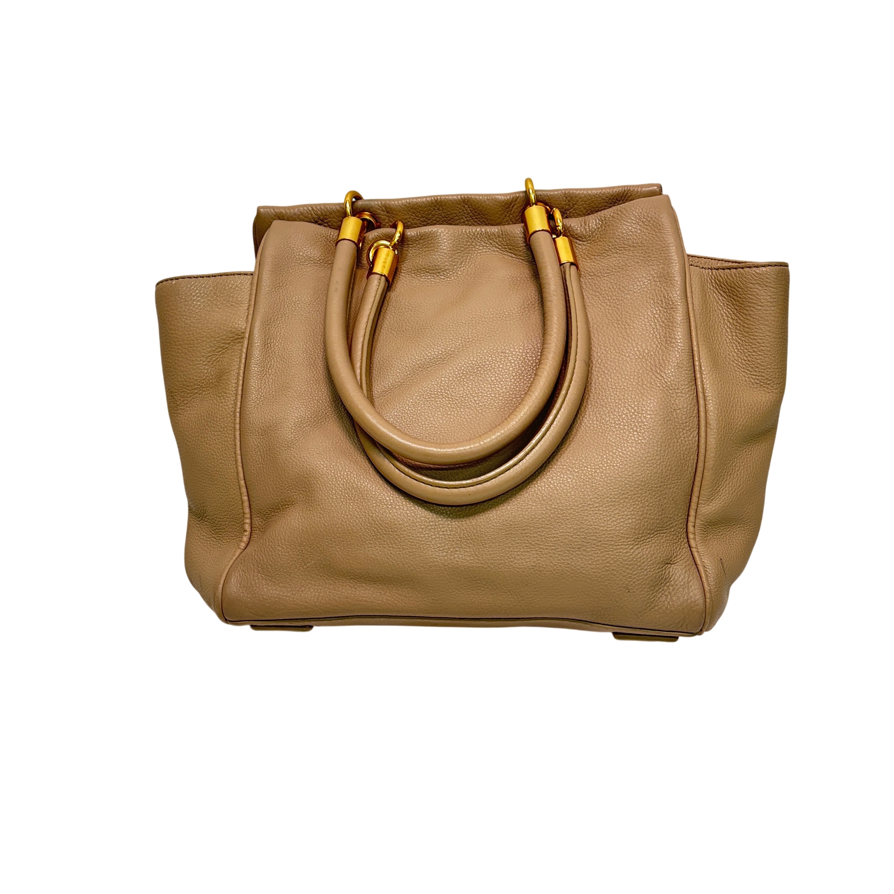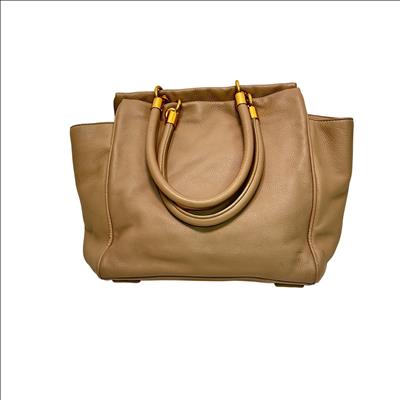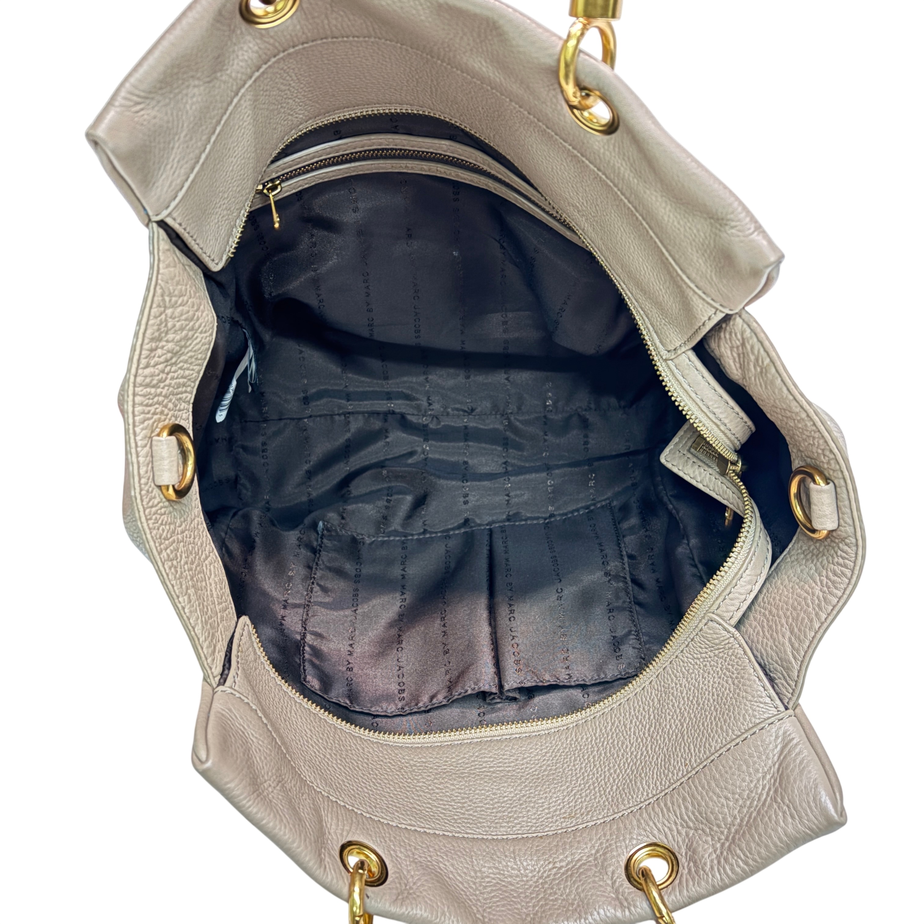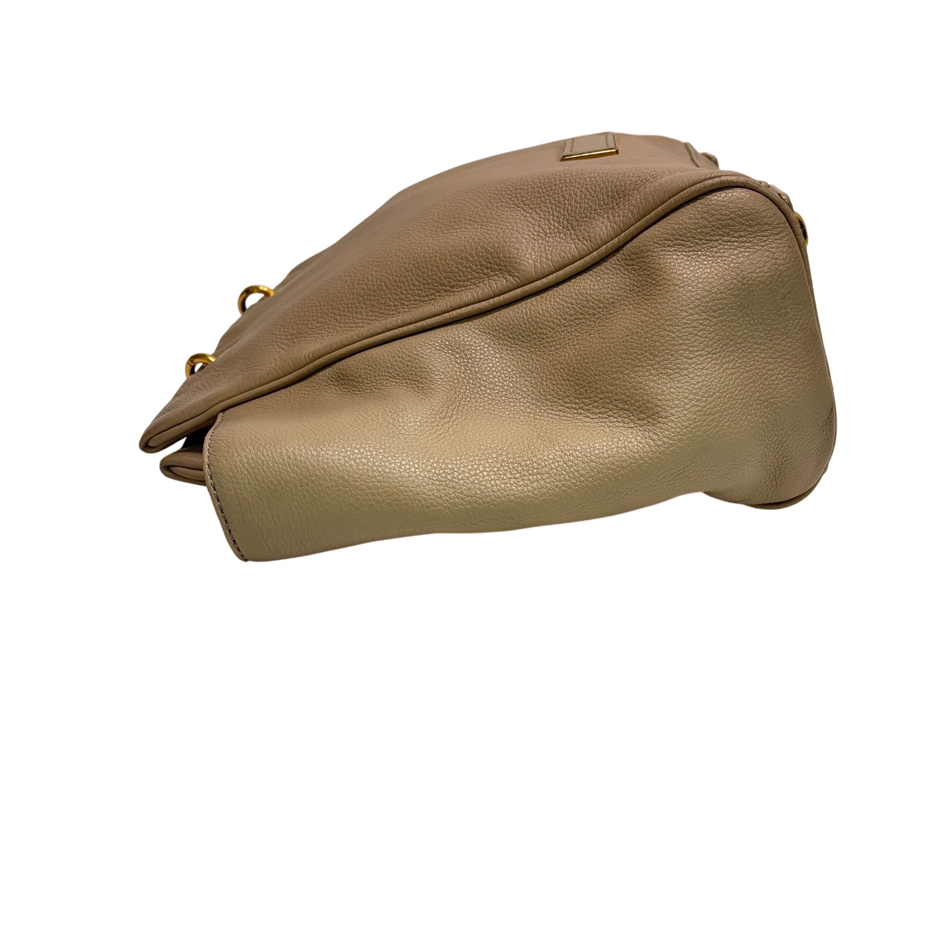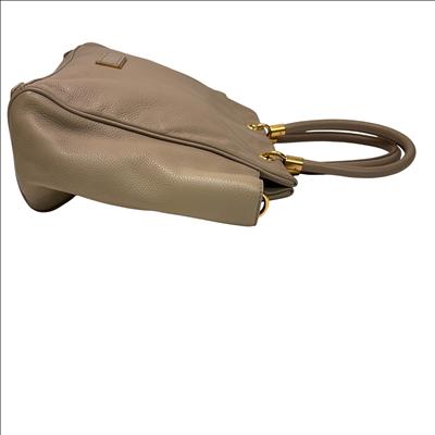 Marc Jacobs BENTLEY TOO HOT TO HANDLE Purse is crafted from high-quality beige leather with elegant gold-tone hardware accents. This stylish handbag features double rounded handles for comfortable carrying and a spacious interior perfect for organizing daily essentials.