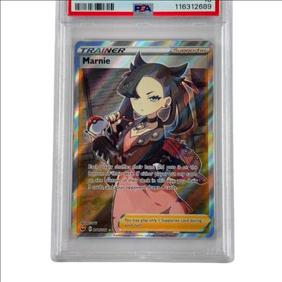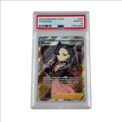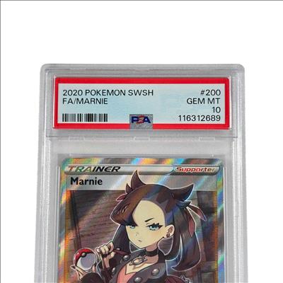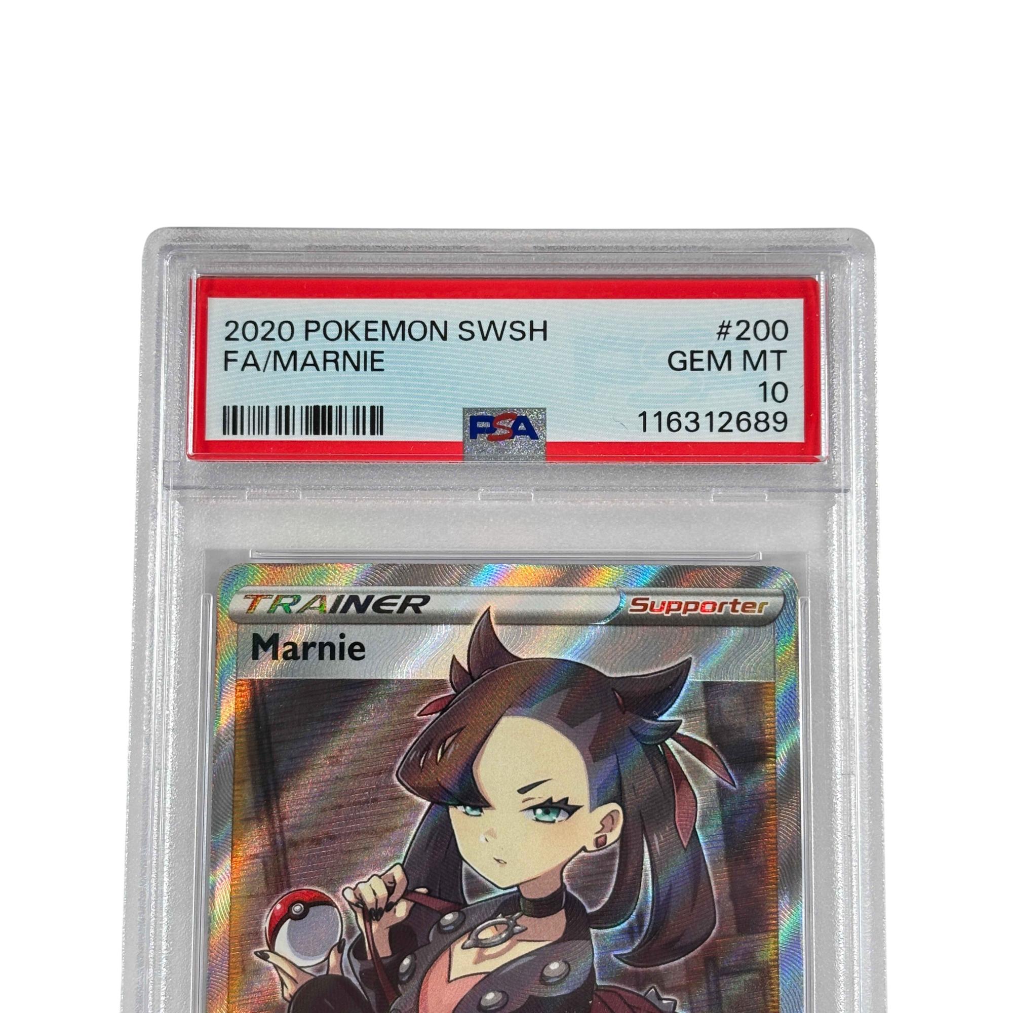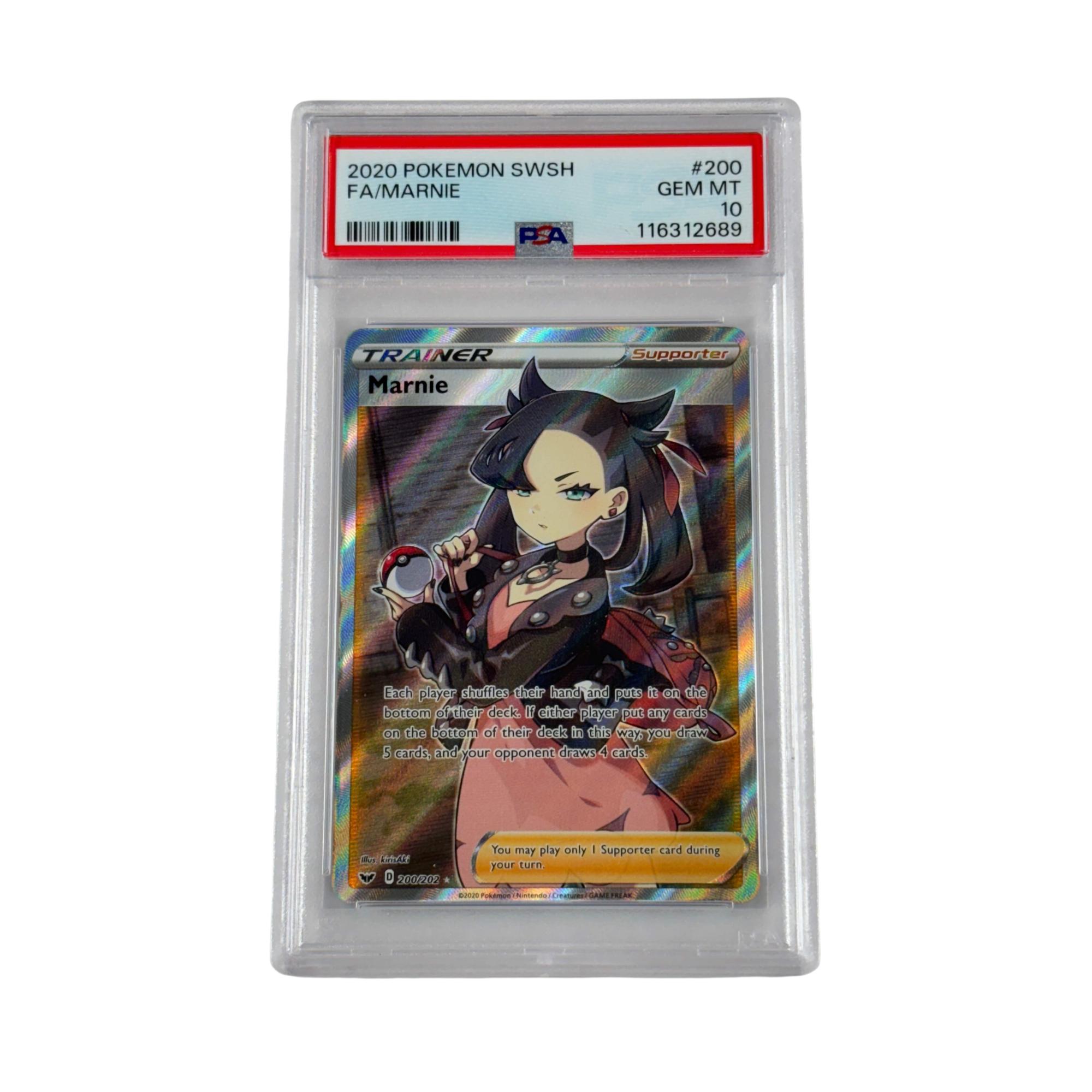 2020 Pokémon SWSH Sword & Shield Base Set Marnie Full Art Trainer #200/202 PSA 10 GEM MT features detailed artwork of the character Marnie prominently holding a ball. This rare full art supporter card is highly sought after in the Pokémon Trading Card Game community for its vibrant design and playability in competitive decks. It showcases unique holographic effects and is part of the Sword & Shield Base Set released in 2020.
