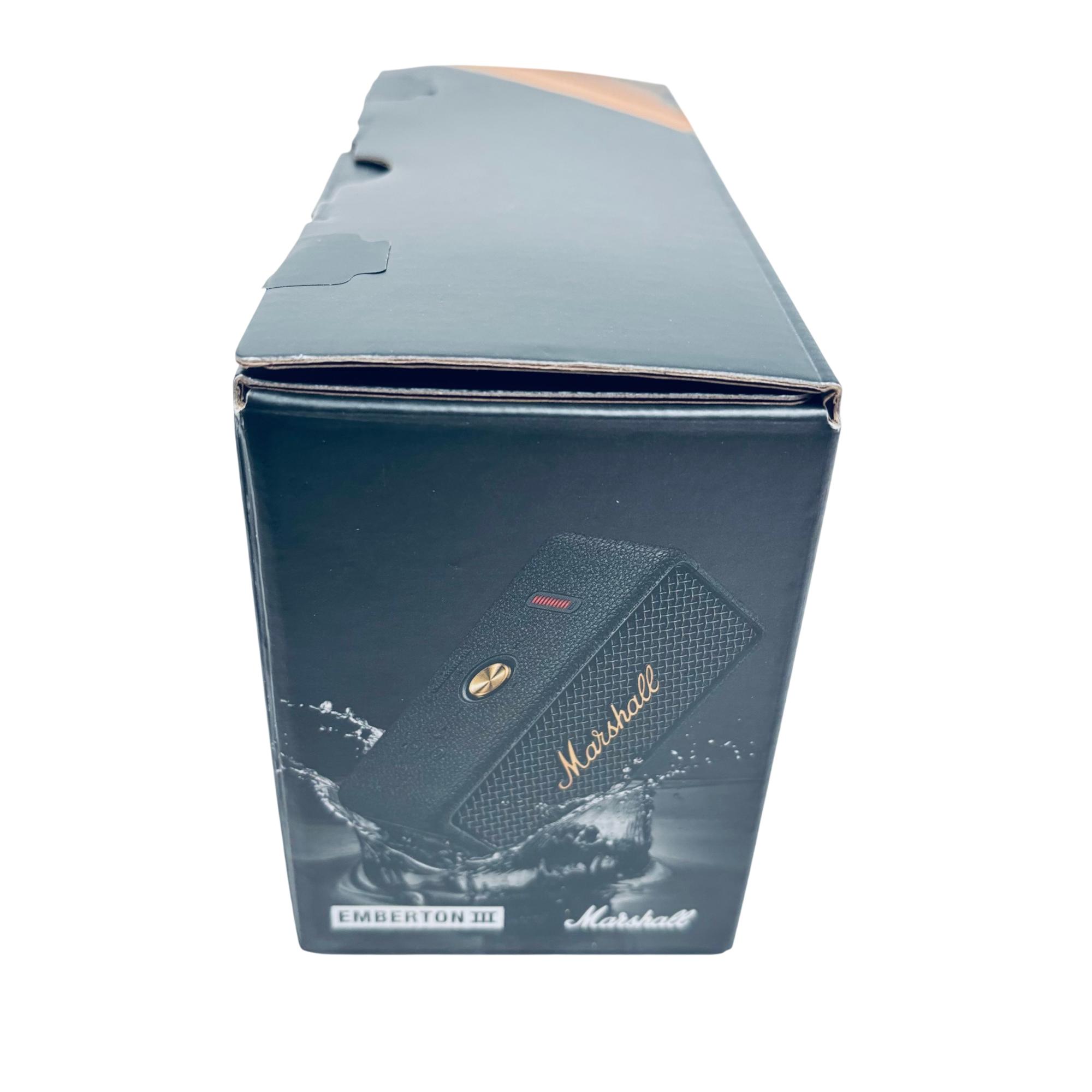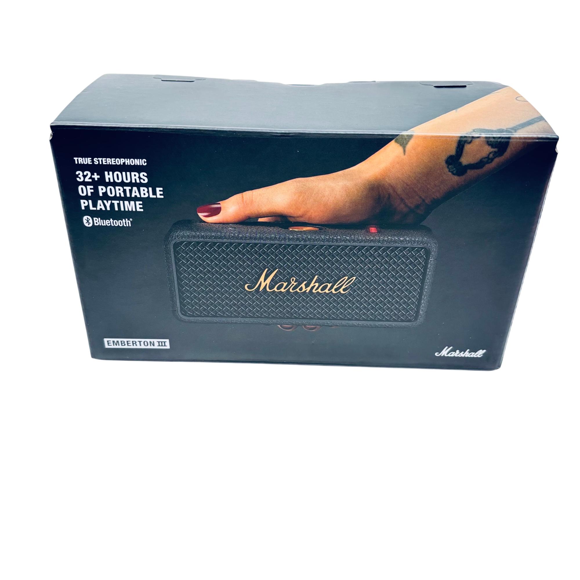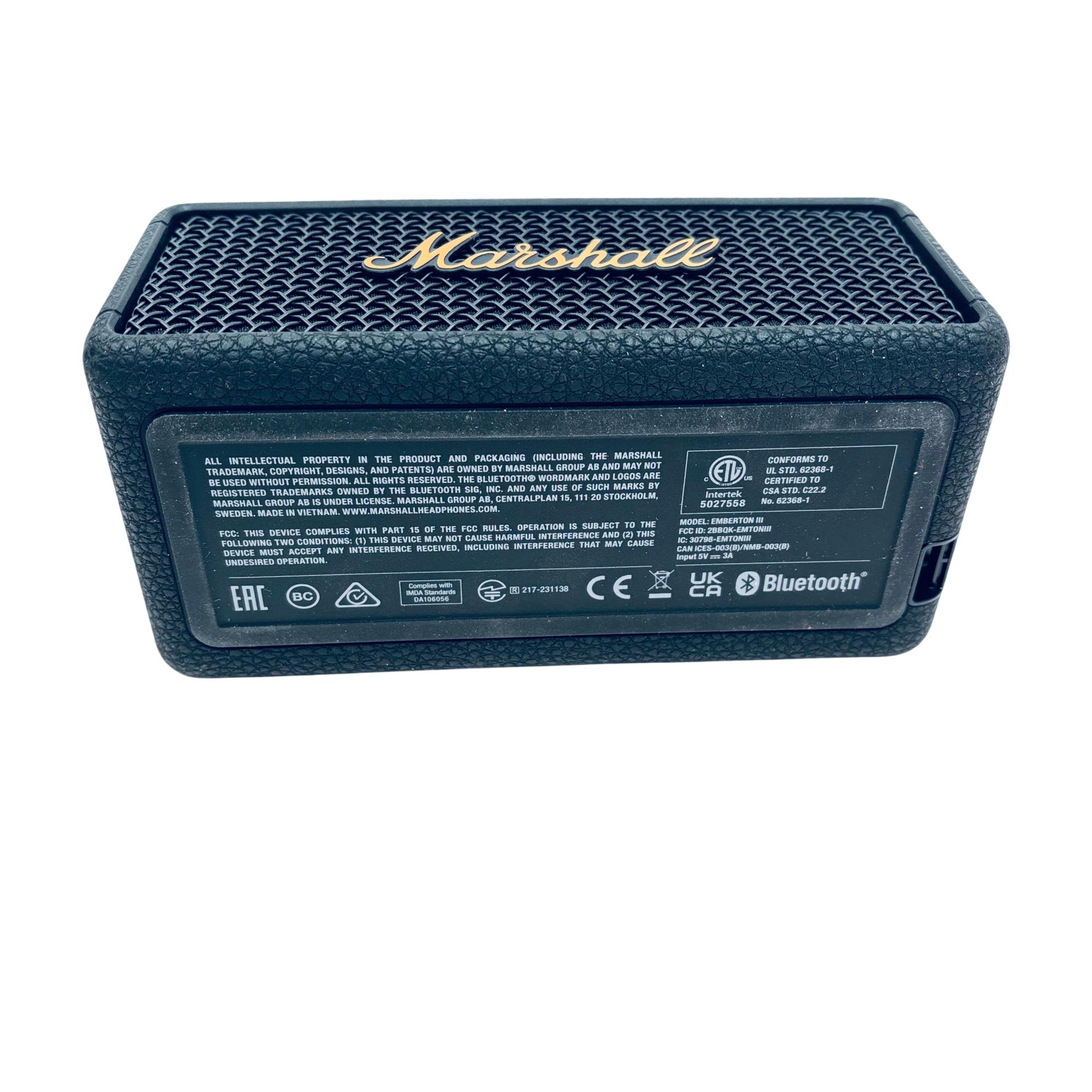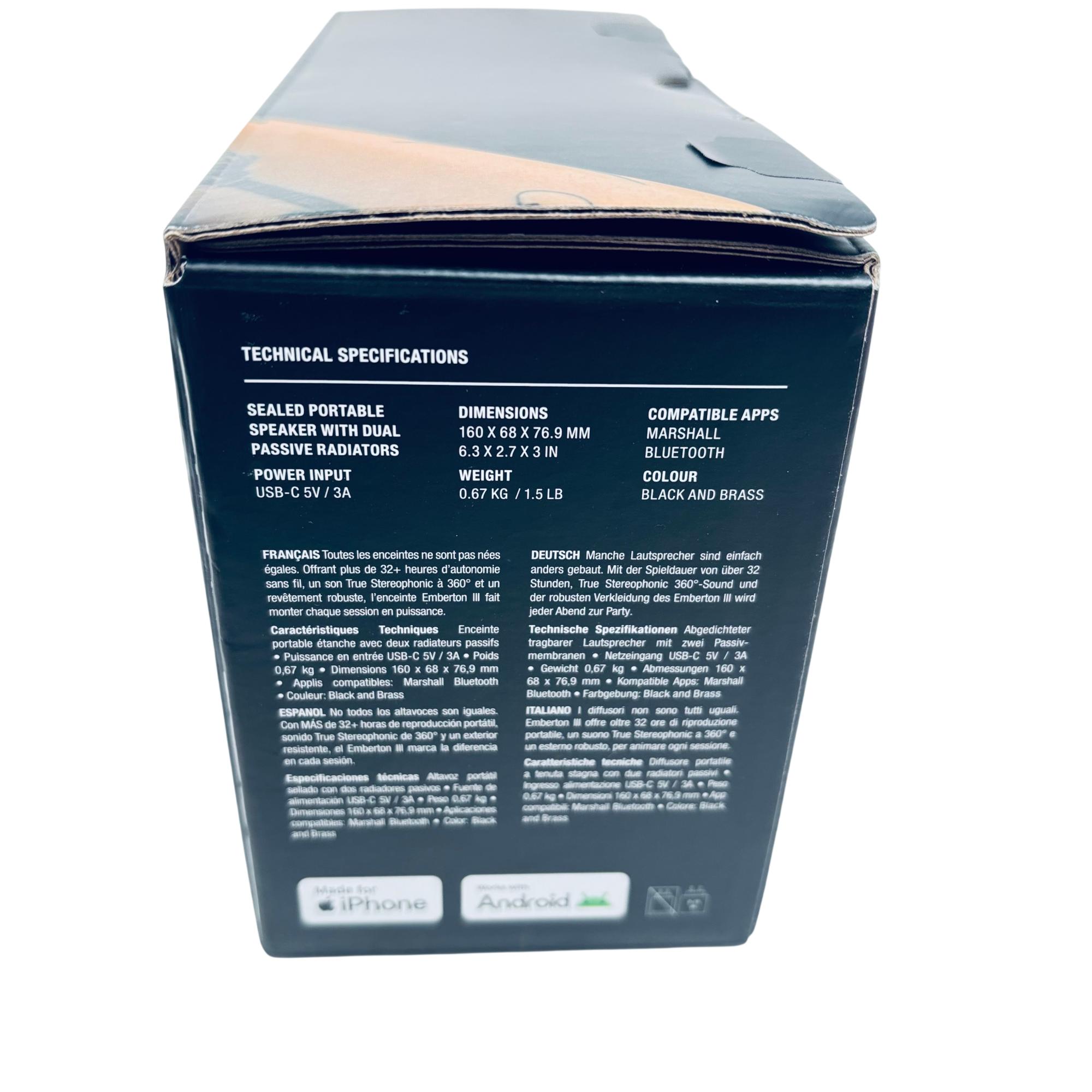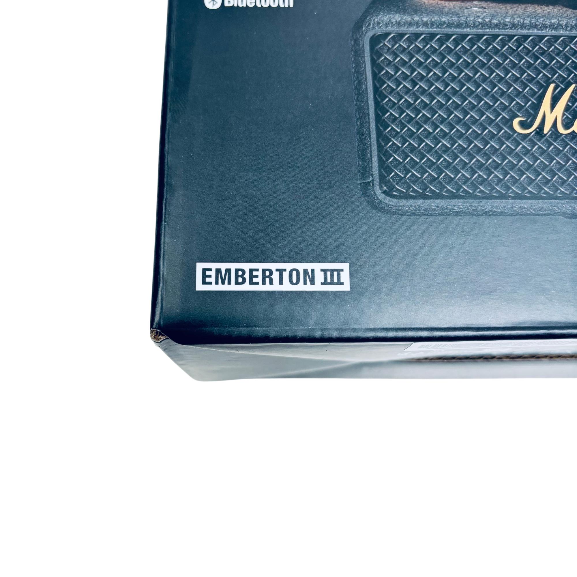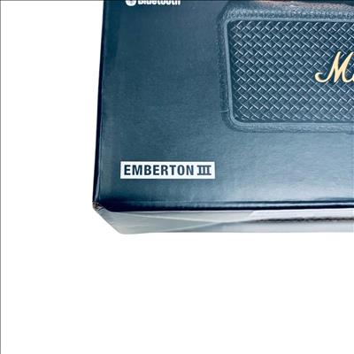 Marshall Emberton III Portable Bluetooth Speaker (Black, Model: Emberton III) delivers robust, true stereophonic sound through its compact, rectangular design featuring a distinctive black mesh cover and gold-accented control knob. This portable speaker offers versatile wireless connectivity optimized for seamless Bluetooth audio streaming, combining durable construction with stylish aesthetics for on-the-go music enjoyment.