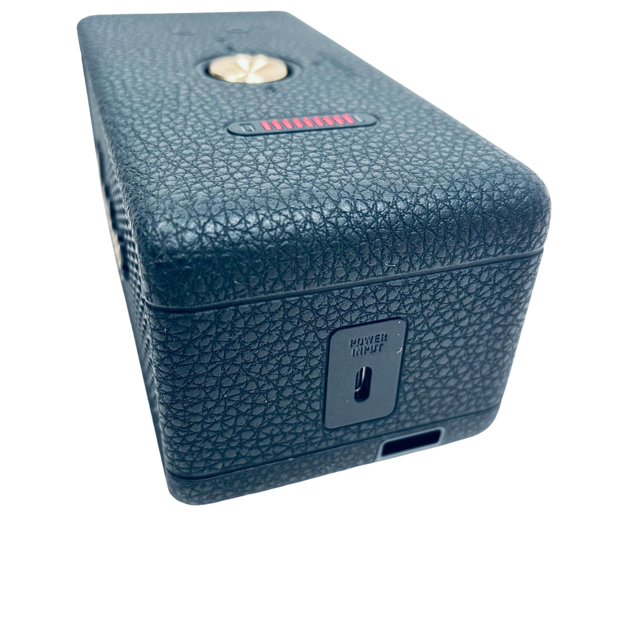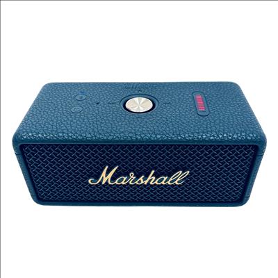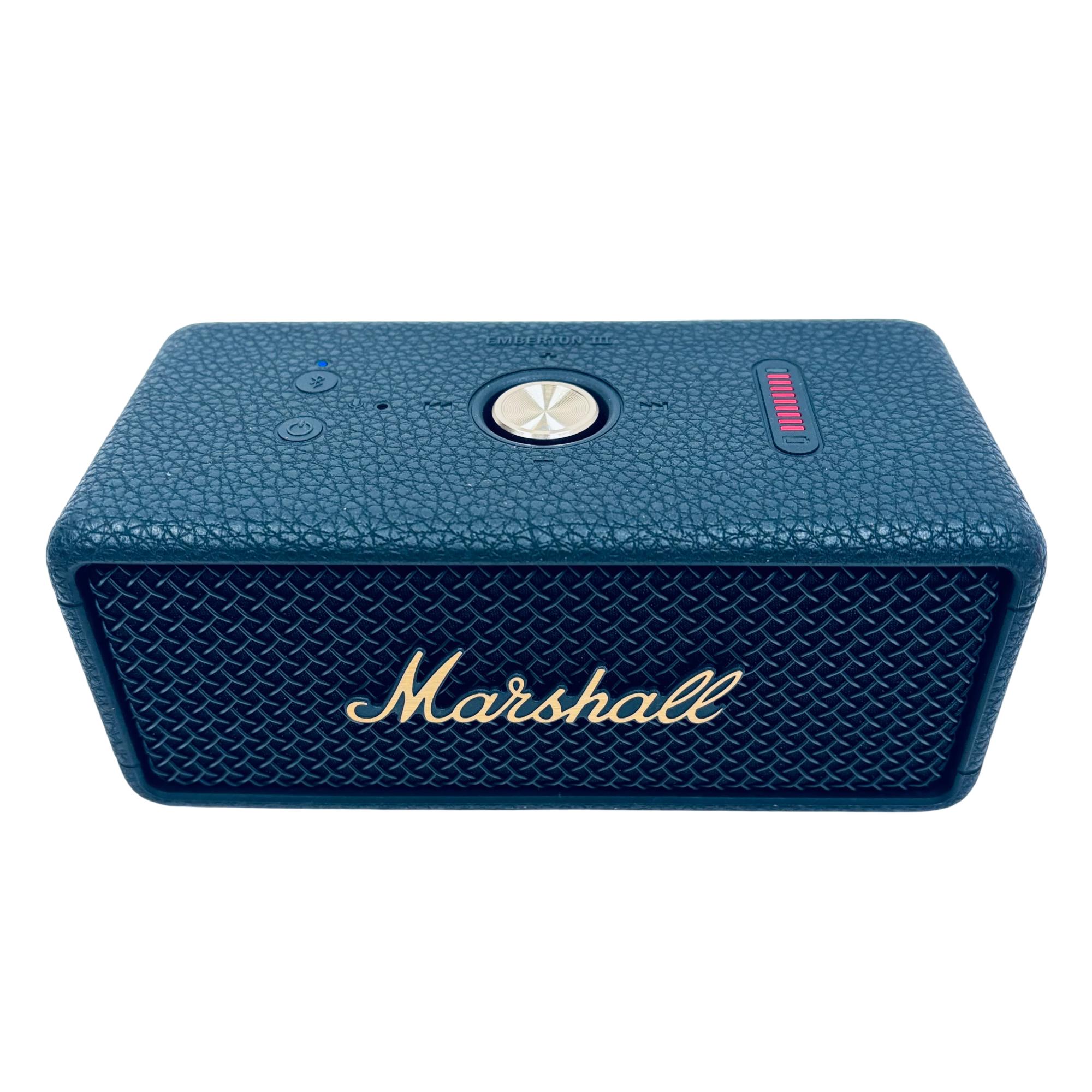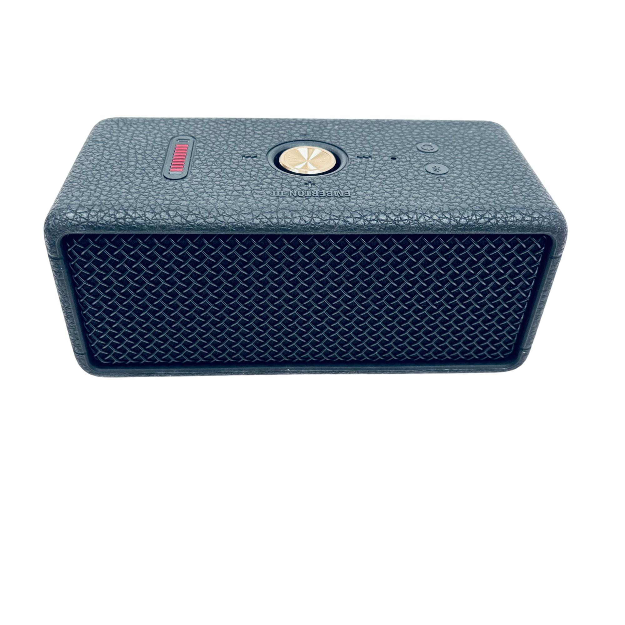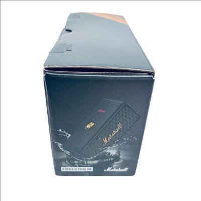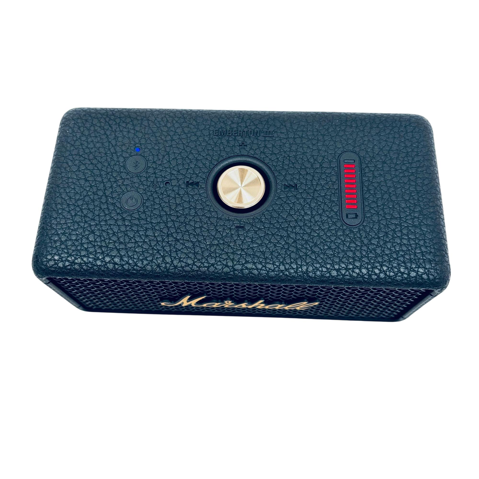 Marshall Emberton III Portable Bluetooth Speaker (Black, Model: Emberton III) delivers robust, true stereophonic sound through its compact, rectangular design featuring a distinctive black mesh cover and gold-accented control knob. This portable speaker offers versatile wireless connectivity optimized for seamless Bluetooth audio streaming, combining durable construction with stylish aesthetics for on-the-go music enjoyment.