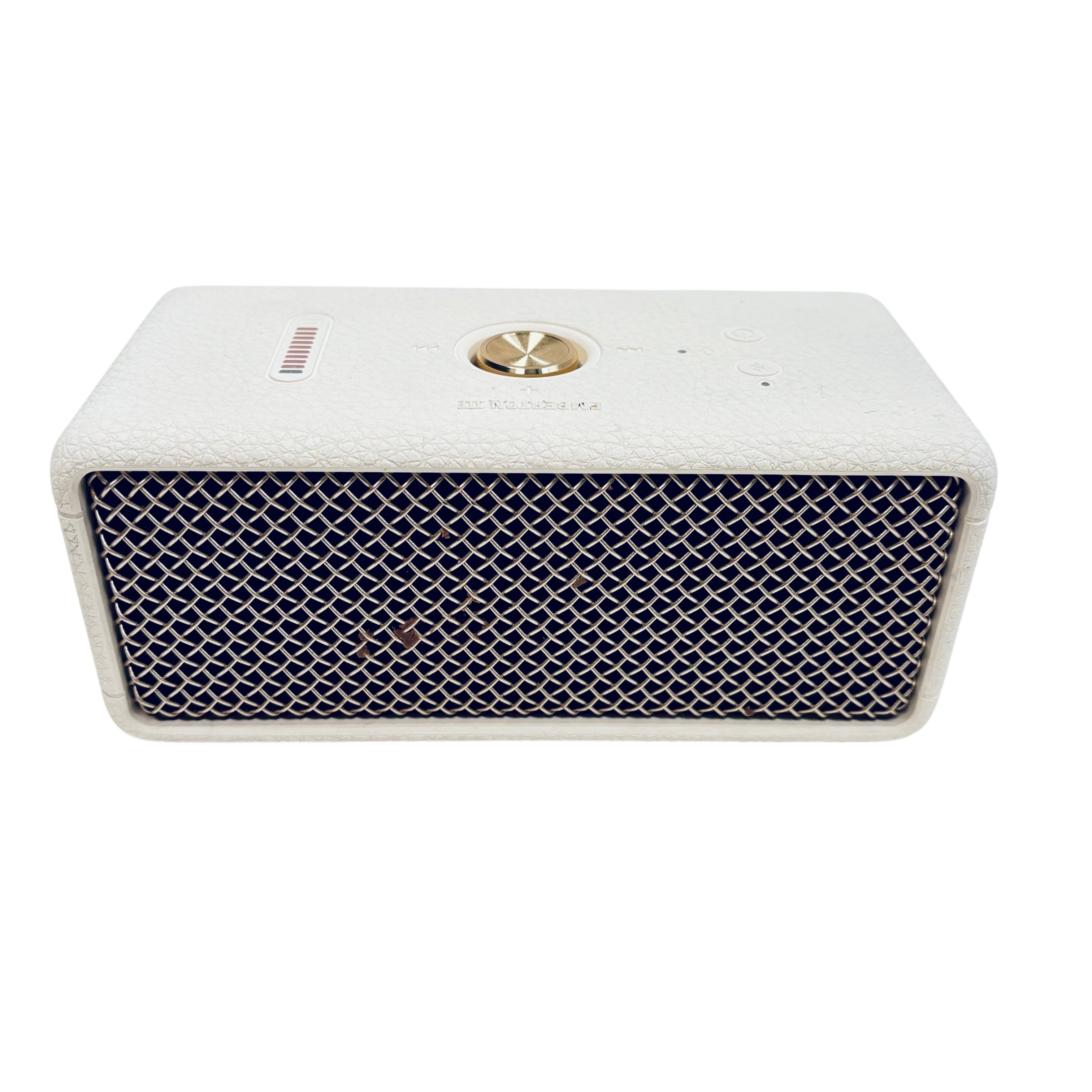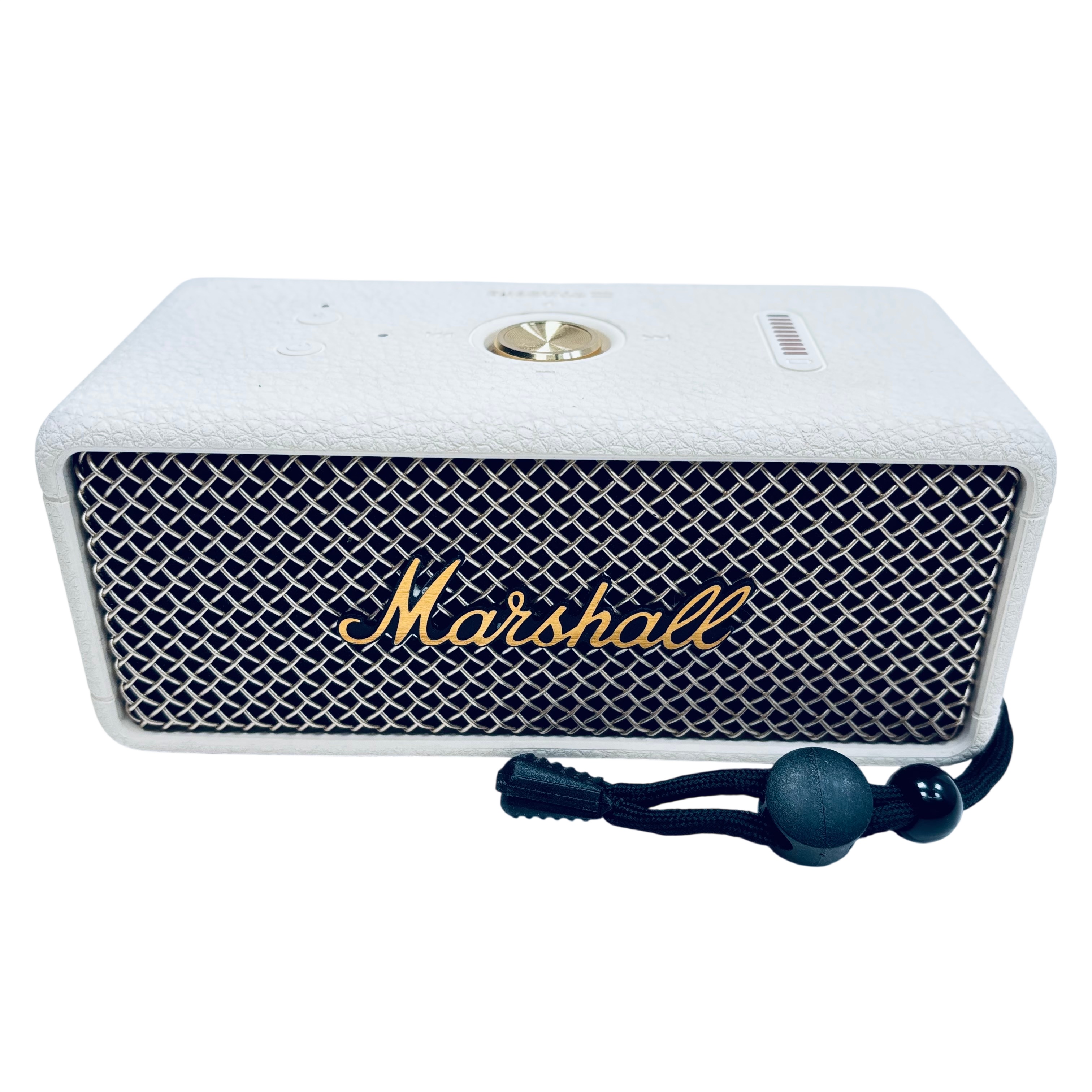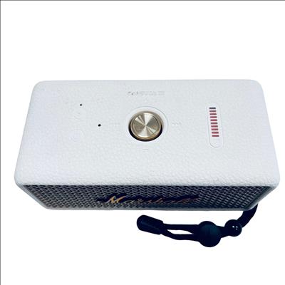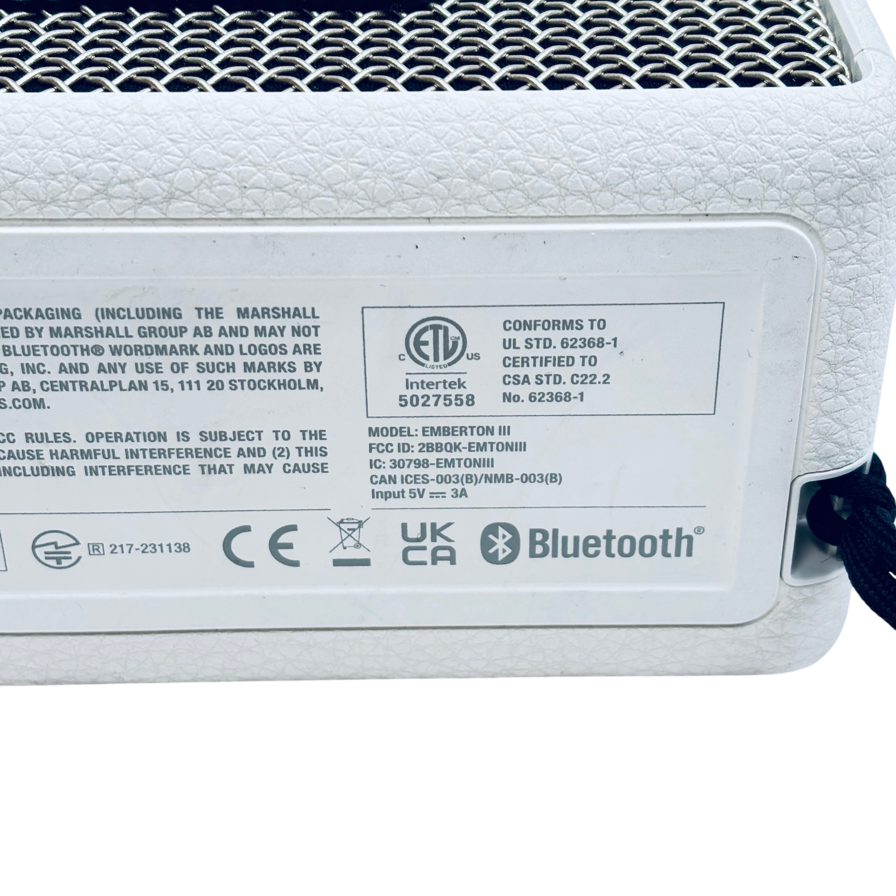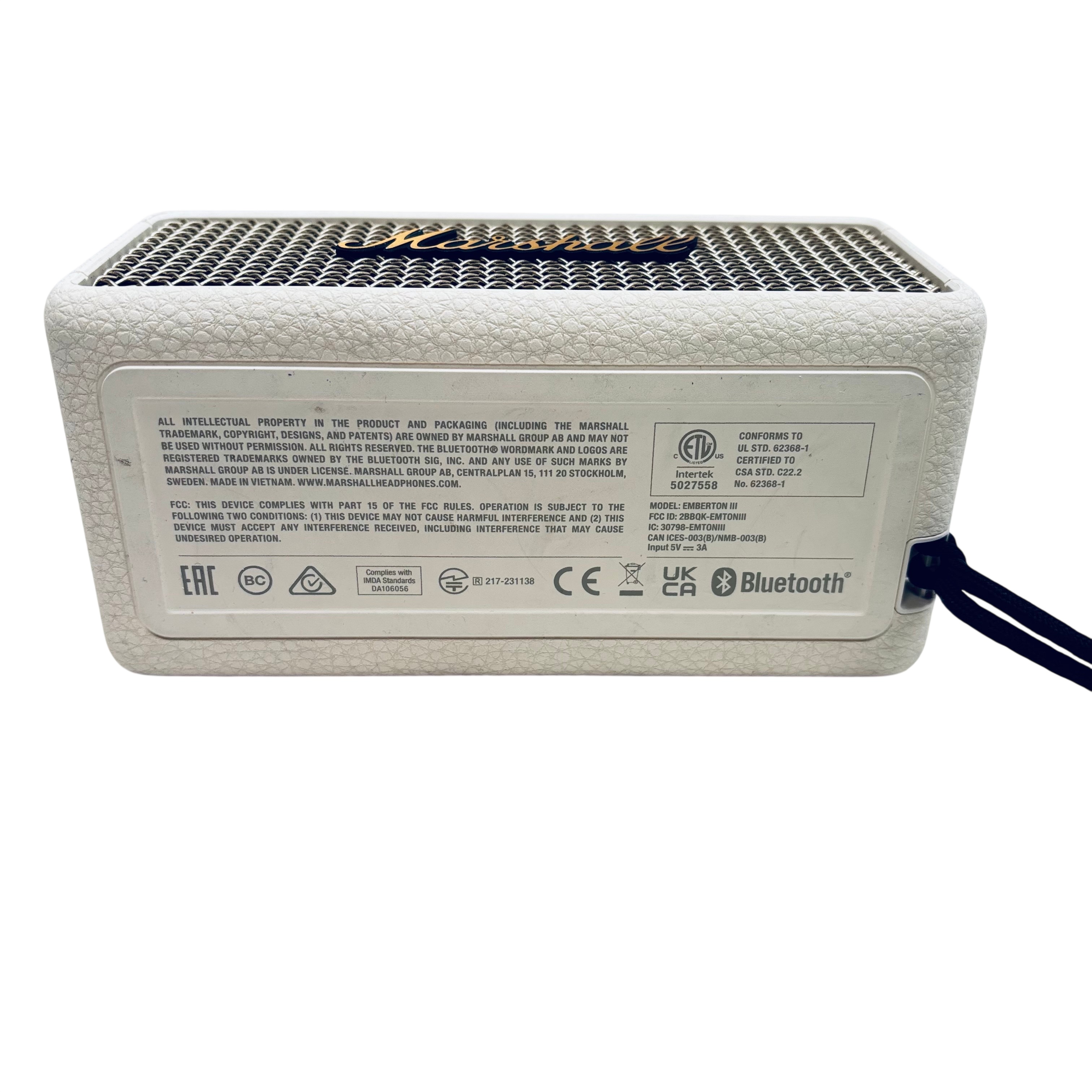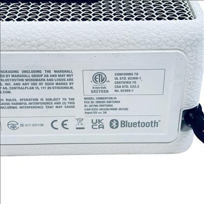 Marshall Emberton III Portable Bluetooth Speaker delivers rich, multi-directional sound in a compact and stylish design. Featuring Bluetooth connectivity with a 5V/3A charging input, this speaker offers waterproof IPX7 protection and durable construction with a textured white plastic casing and metal grille. The speaker includes physical controls for volume and playback, making it ideal for on-the-go music listening. Lightweight and portable, the Emberton III is perfect for outdoor adventures and everyday use.