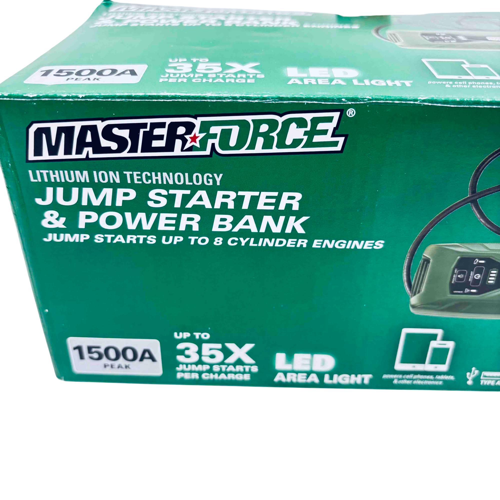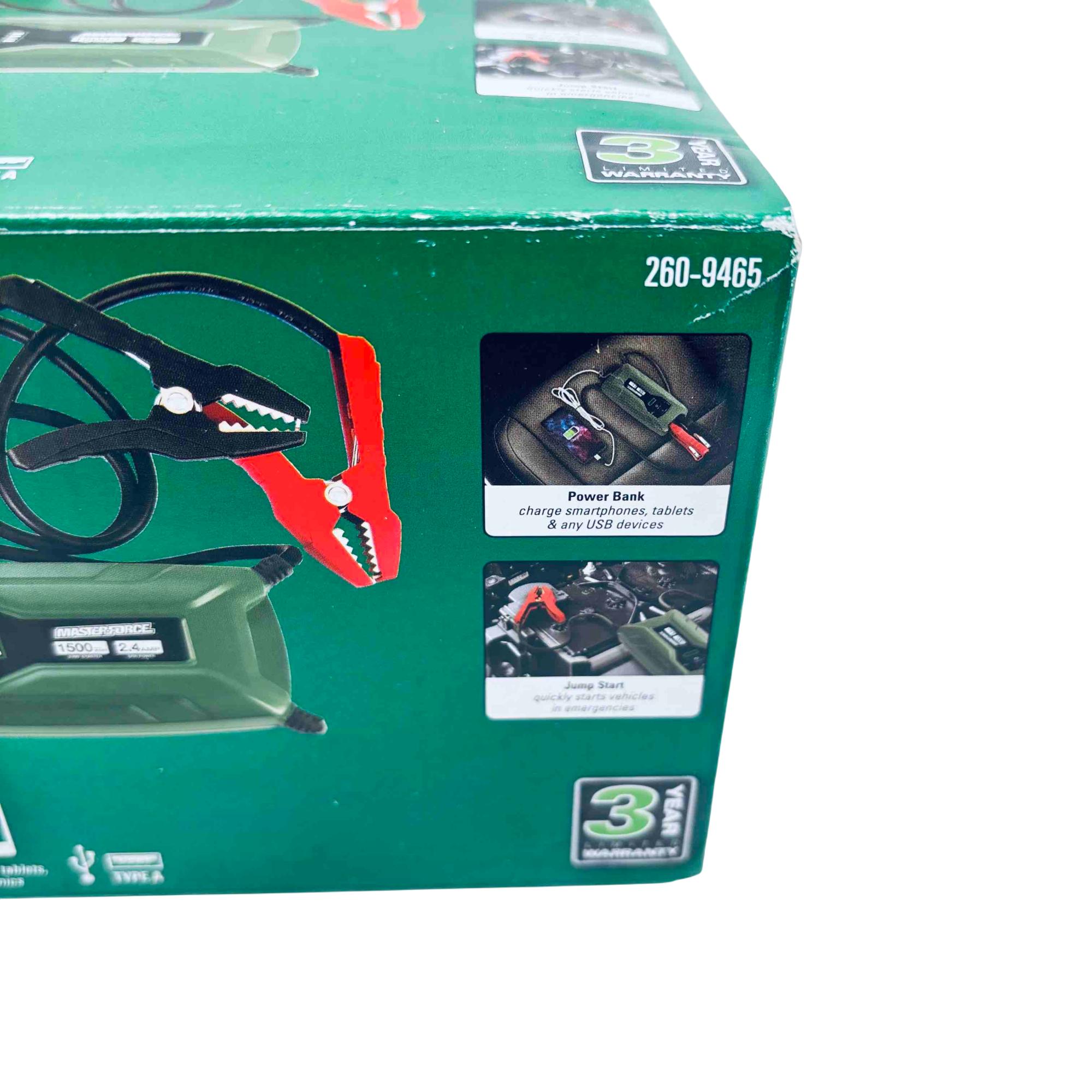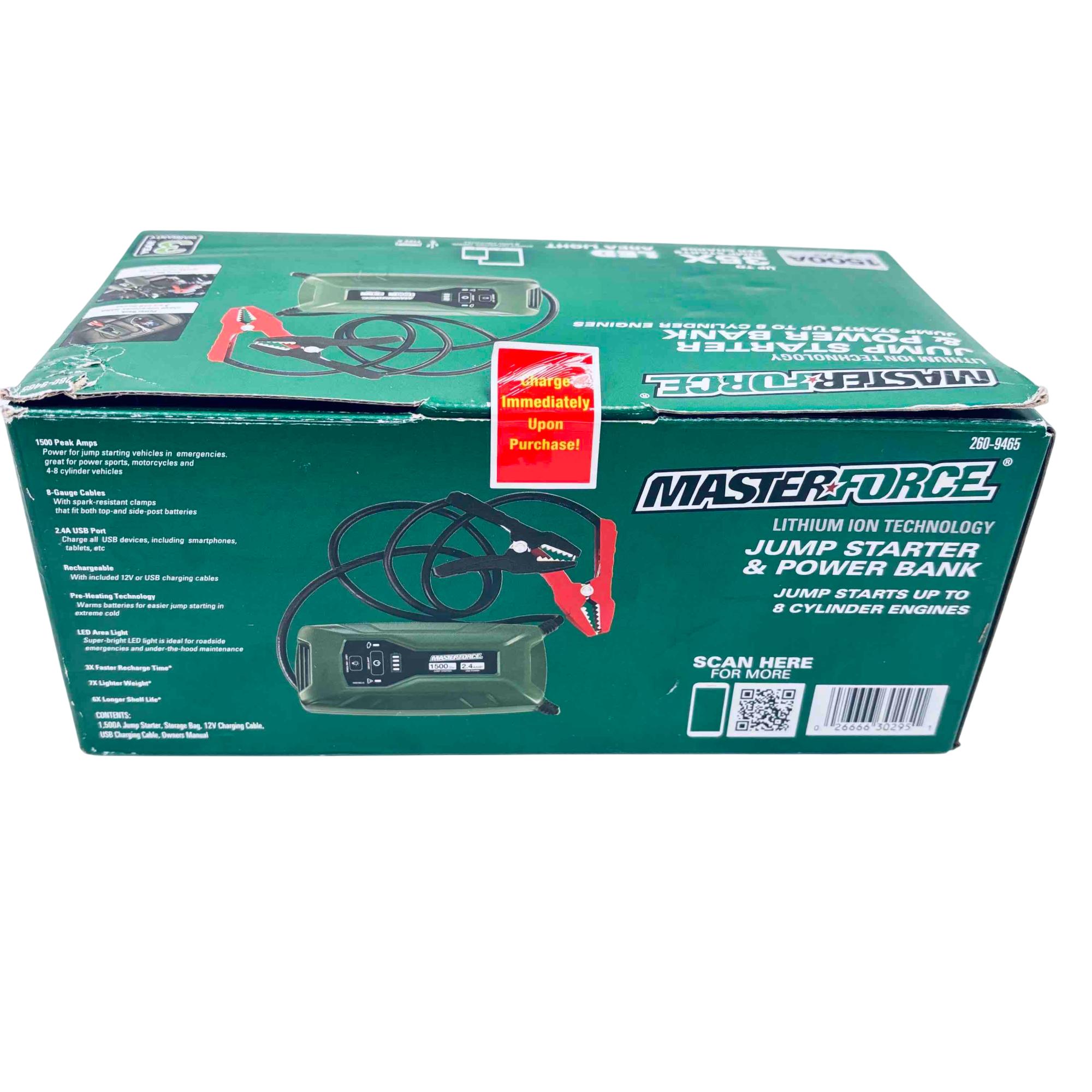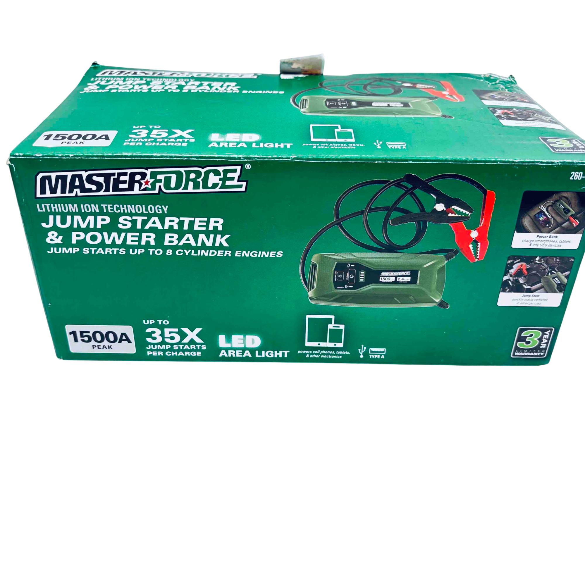 Rev up your engine and stay powered on-the-go with the Masterforce 260-9465 Lithium Ion Jump Starter & Power Bank. This compact powerhouse offers up to 1500 peak amps, capable of jump-starting vehicles with up to 8-cylinder engines effortlessly. Featuring an LED area light and USB charging ports, its perfect for roadside emergencies and charging your electronic devices with ease. The spark-resistant clamps ensure safety, making it a reliable companion for your adventures.