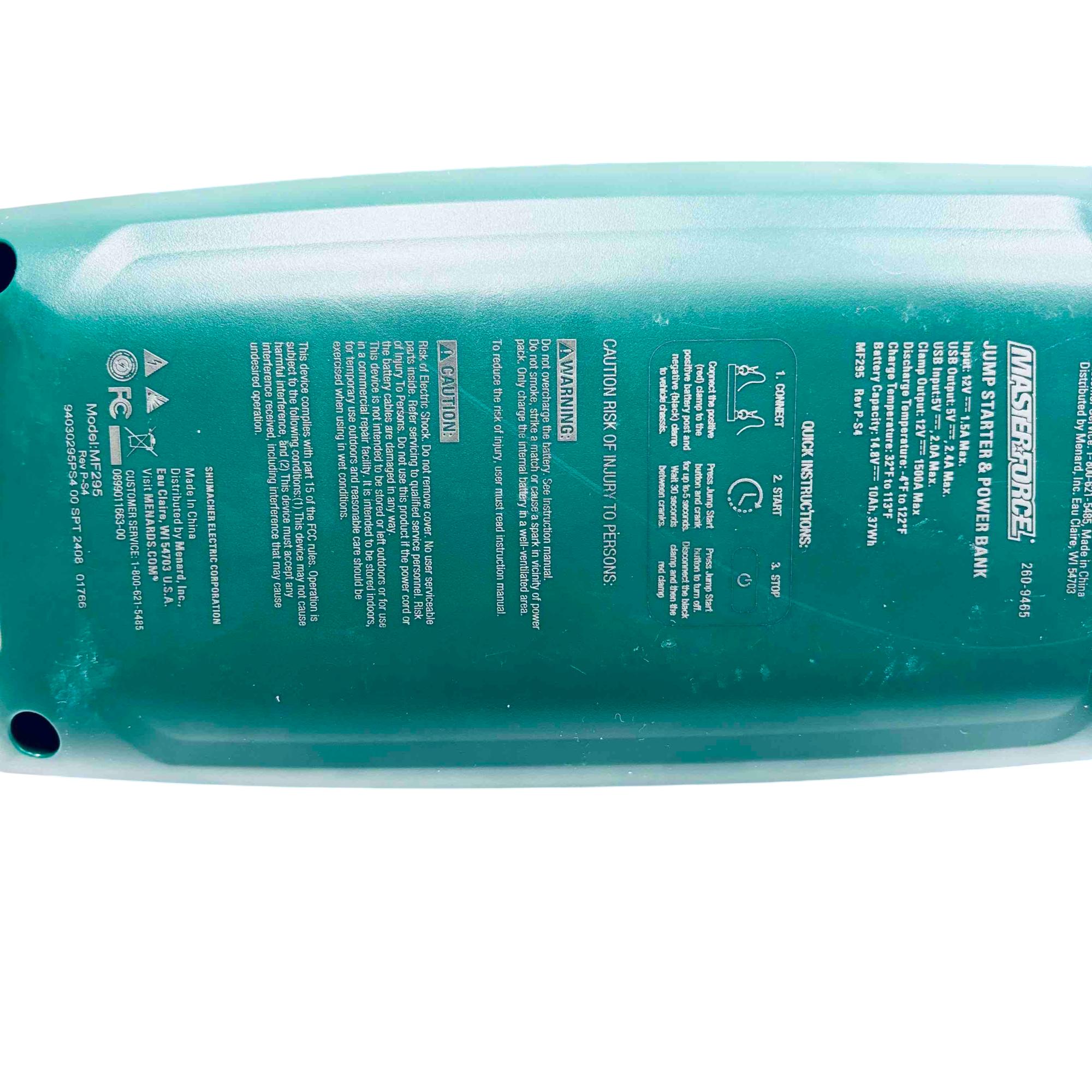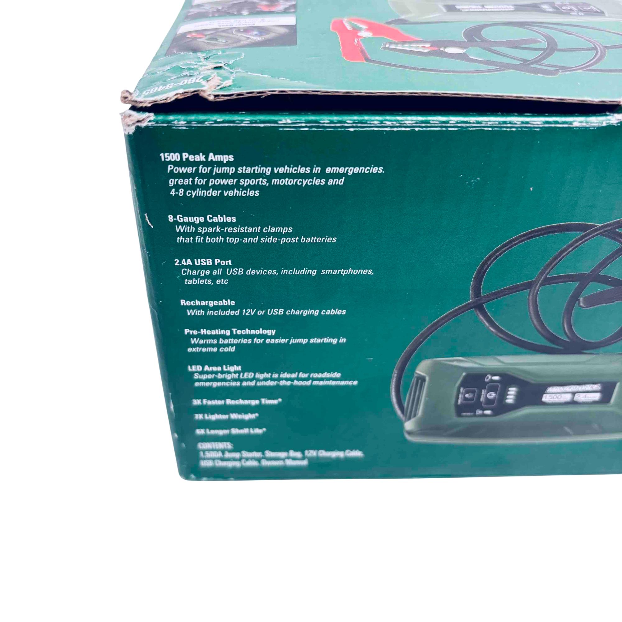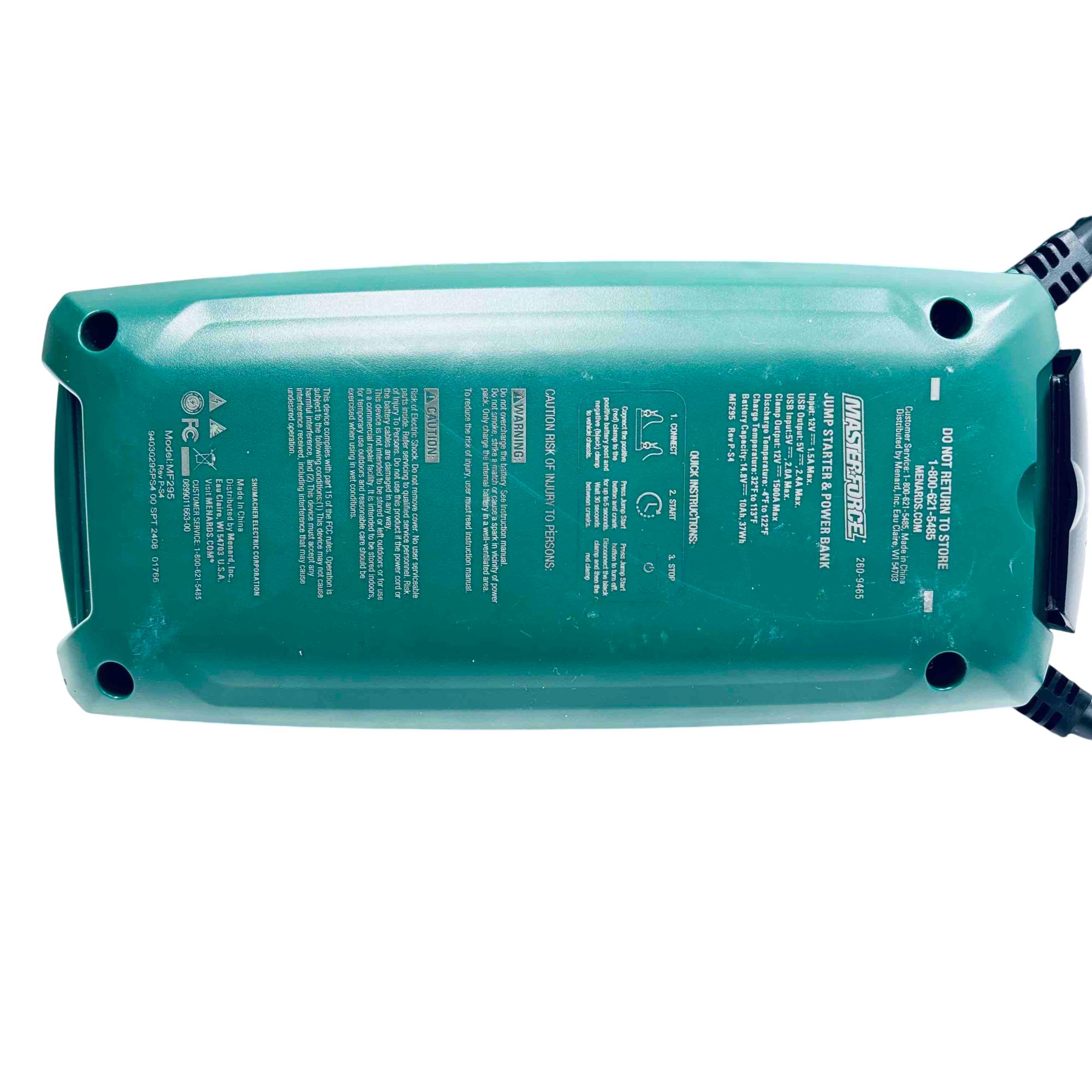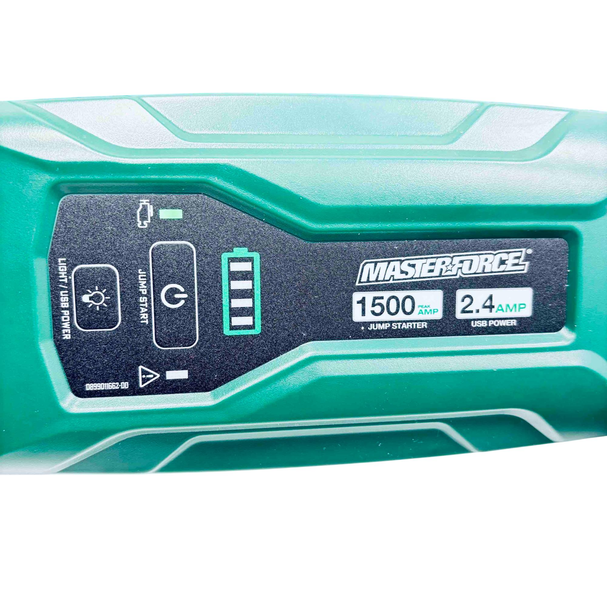 Rev up your engine and stay powered on-the-go with the Masterforce 260-9465 Lithium Ion Jump Starter & Power Bank. This compact powerhouse offers up to 1500 peak amps, capable of jump-starting vehicles with up to 8-cylinder engines effortlessly. Featuring an LED area light and USB charging ports, its perfect for roadside emergencies and charging your electronic devices with ease. The spark-resistant clamps ensure safety, making it a reliable companion for your adventures.