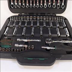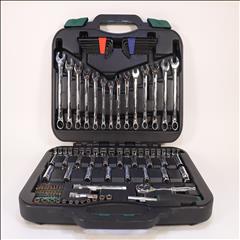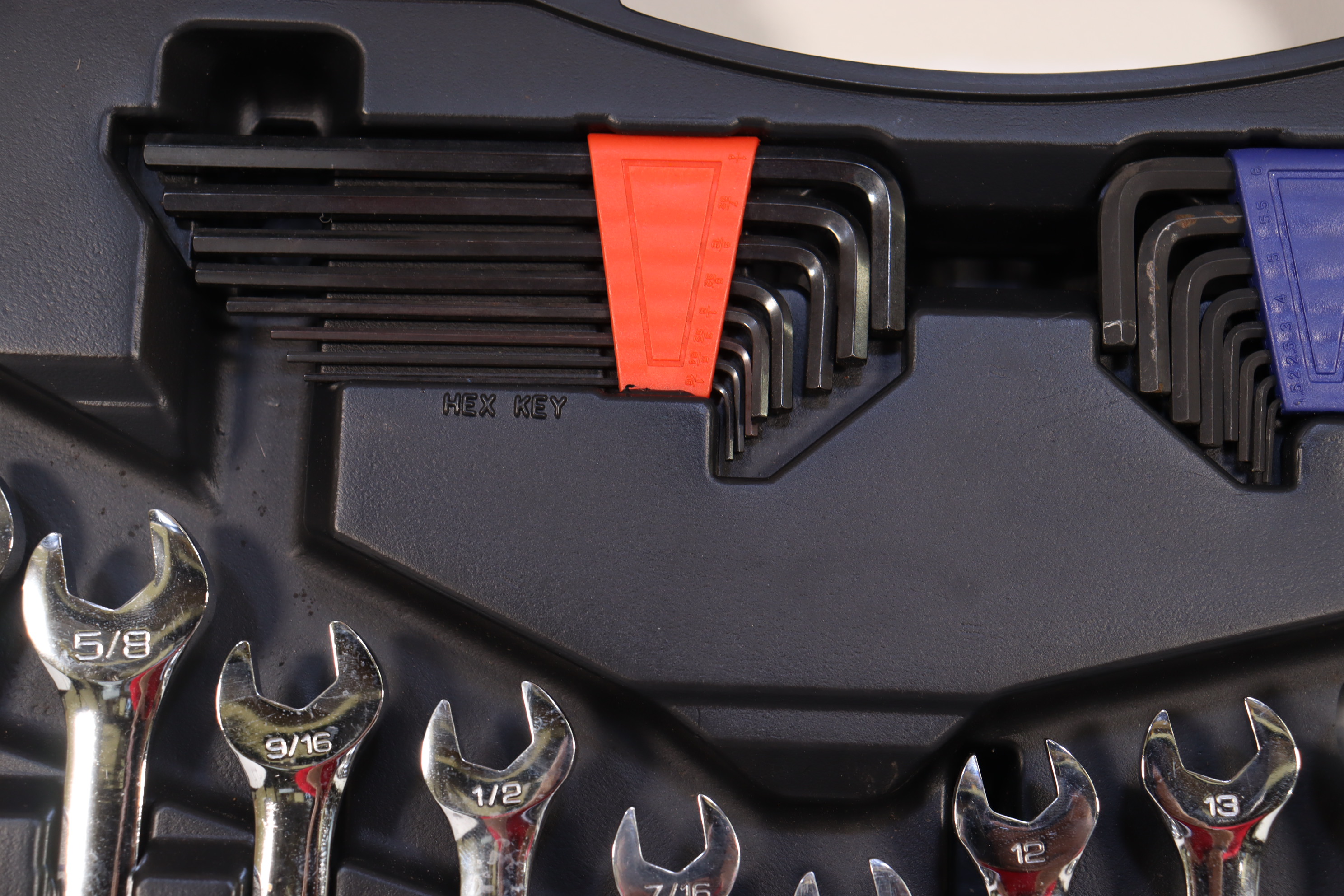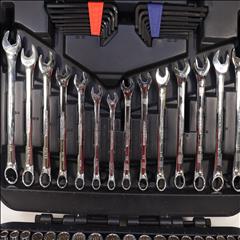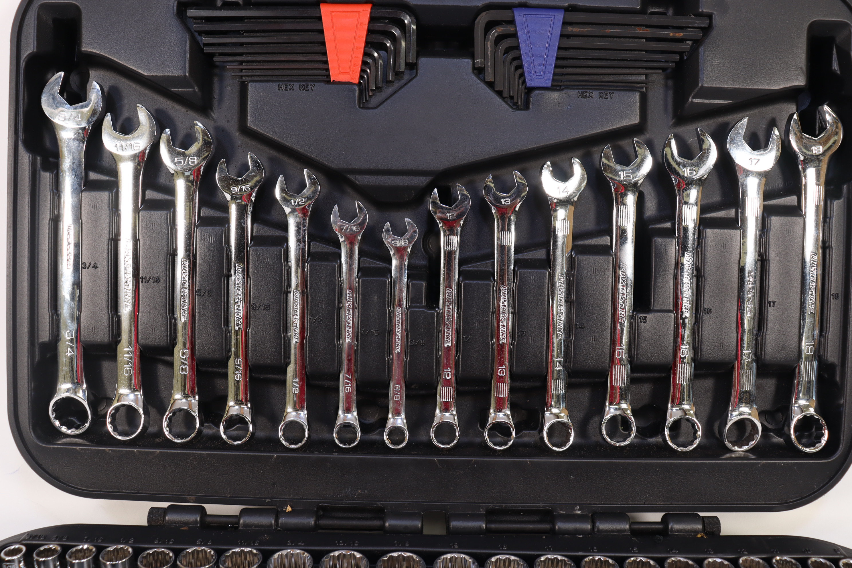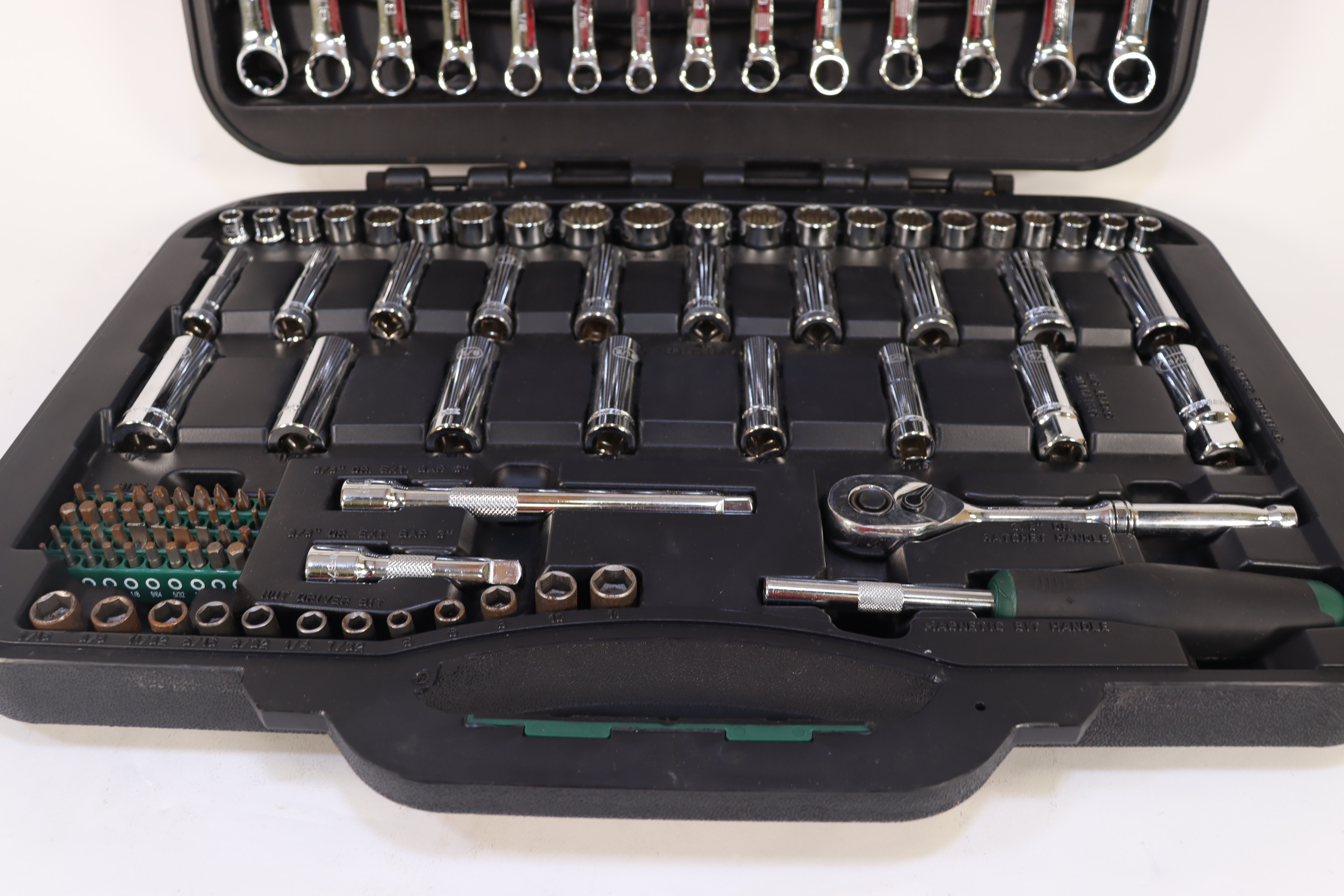 Set includes a 3/8" drive 72-tooth ratchet, 21 essential SAE and metric shallow sockets, 16 deep metric and SAE sockets, 14 standard combination wrenches, 2 spark plug sockets, 2 extensions, 16 hex keys and a magnetic bit driver with 52 screwdriver and nutdriver bits