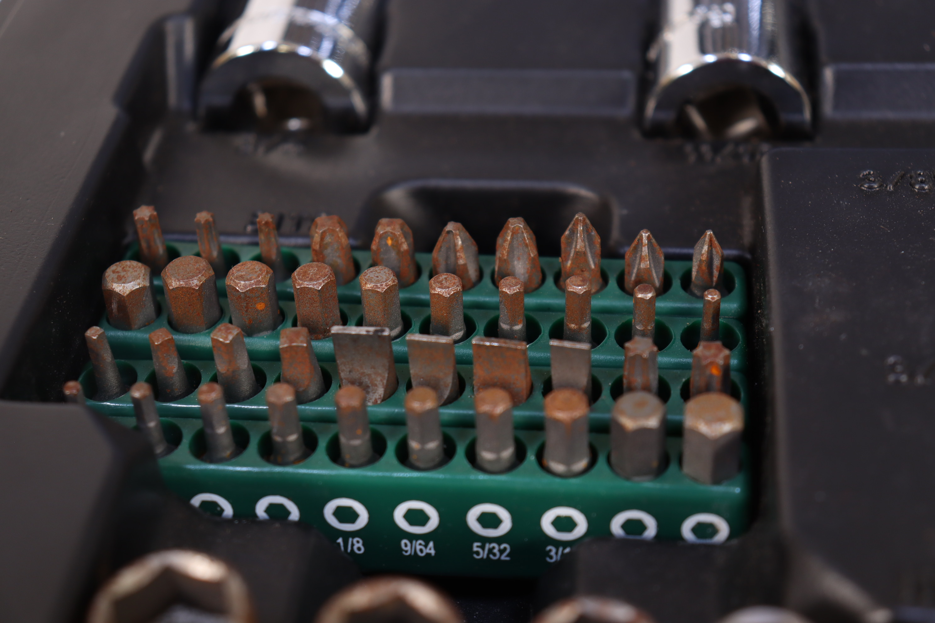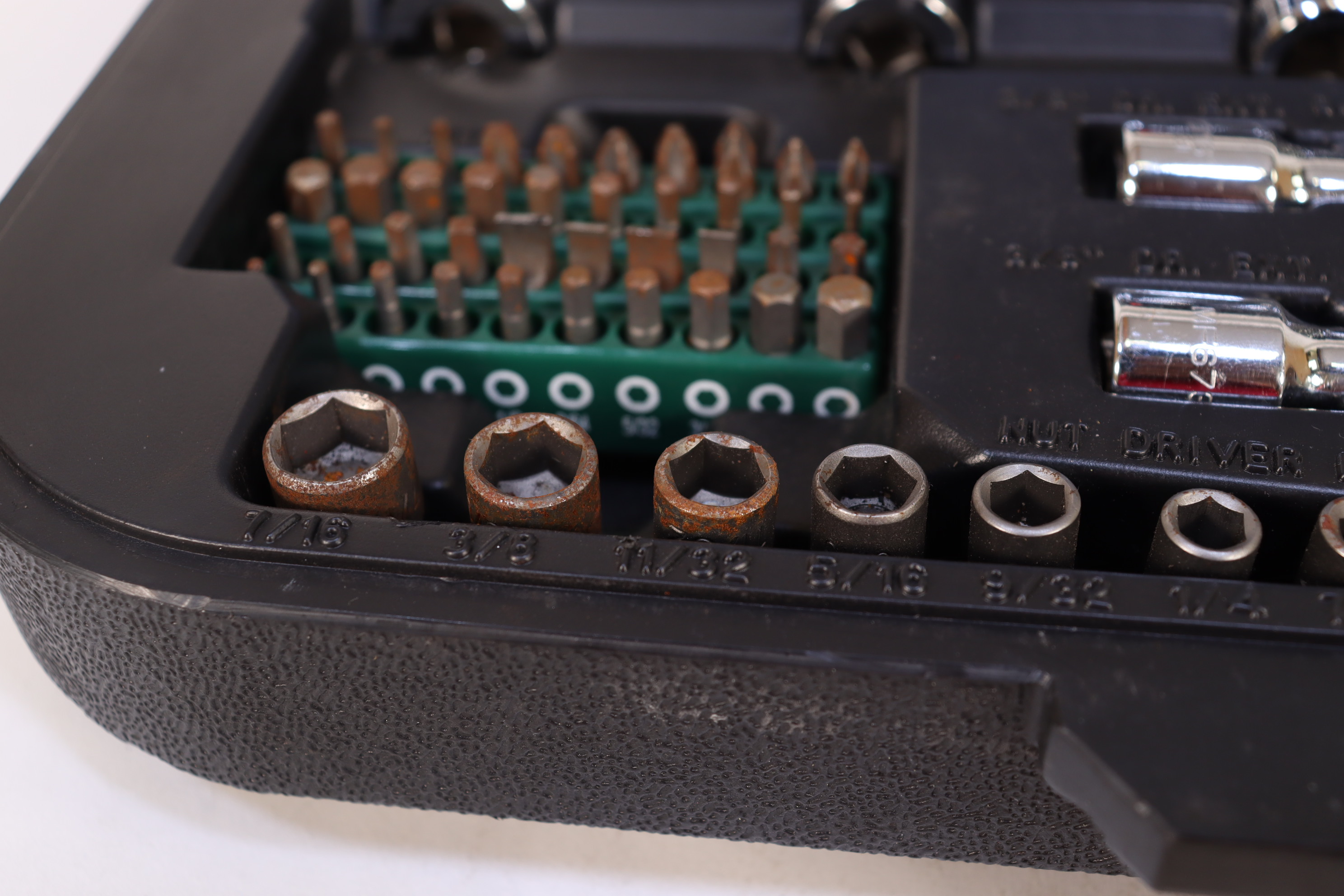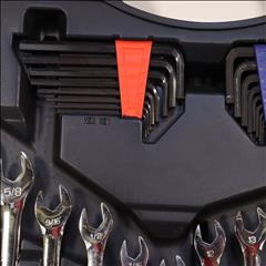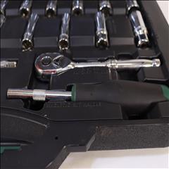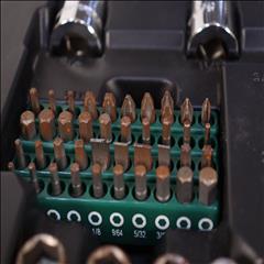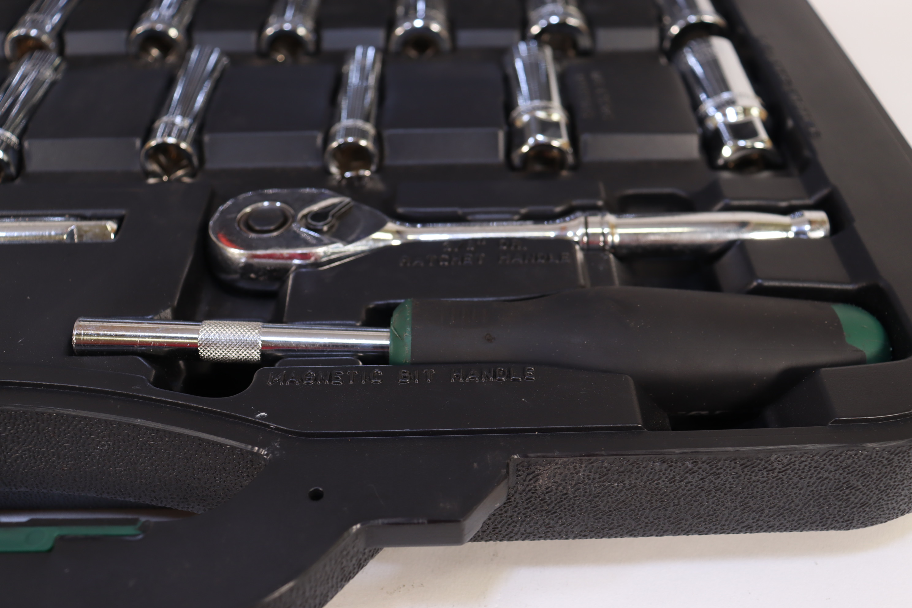 Set includes a 3/8" drive 72-tooth ratchet, 21 essential SAE and metric shallow sockets, 16 deep metric and SAE sockets, 14 standard combination wrenches, 2 spark plug sockets, 2 extensions, 16 hex keys and a magnetic bit driver with 52 screwdriver and nutdriver bits